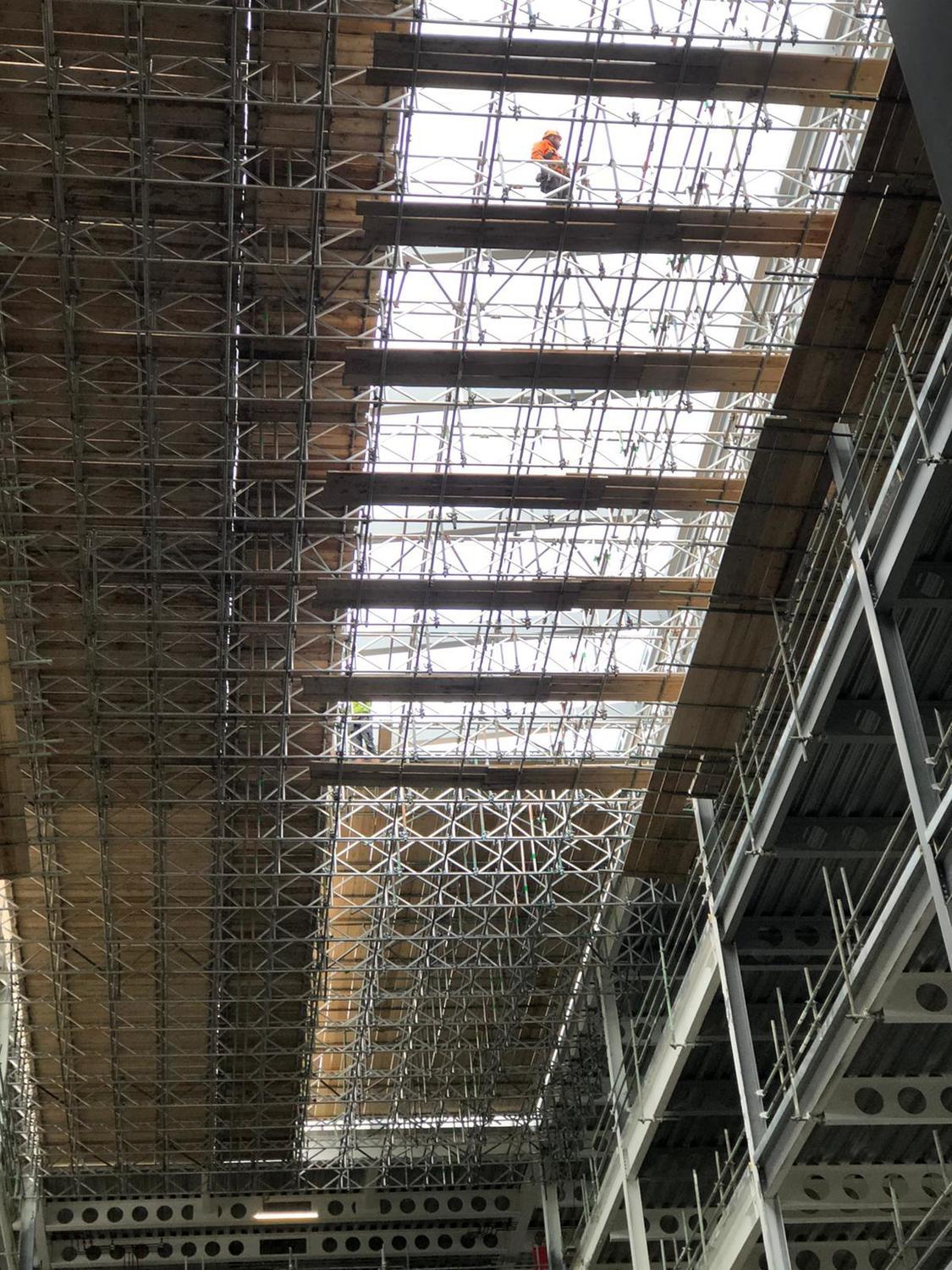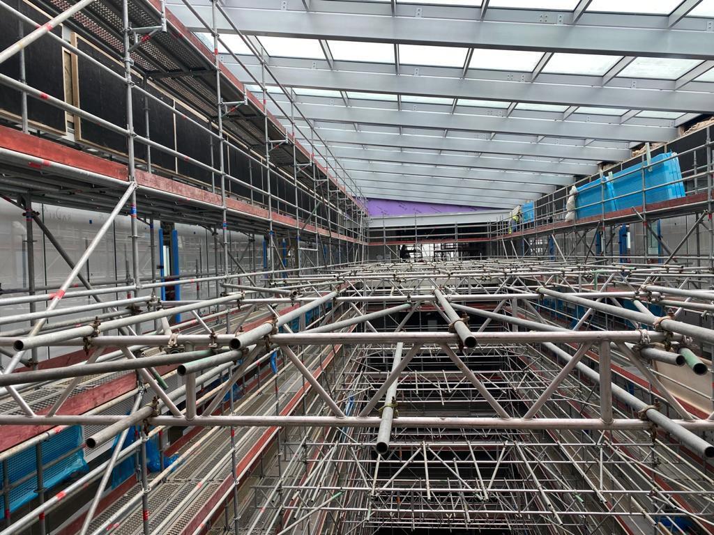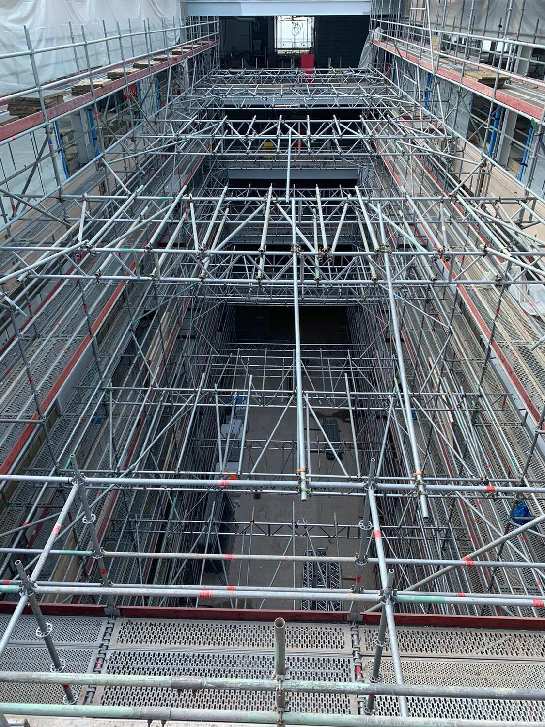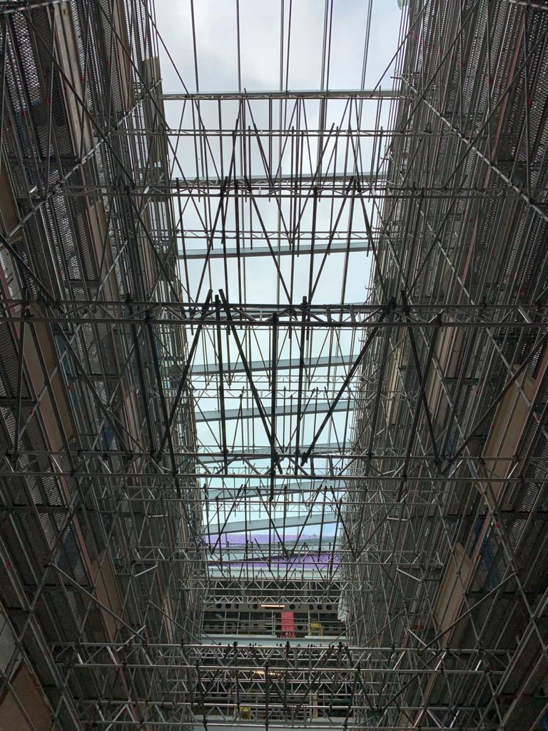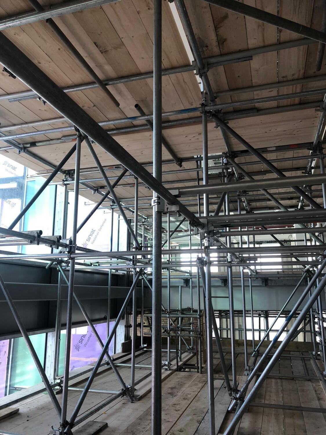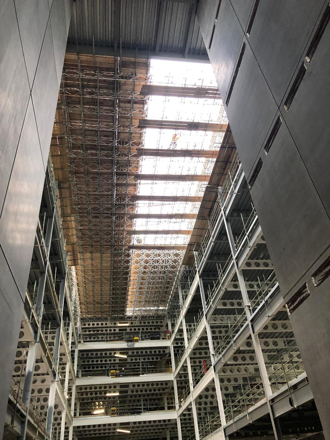 Portway Scaffolding has been tasked to provide a high level access platform to the underside of an atrium on a new prestigious head office building. The design is complicated due to the differing depths of ring beam steel, so in one area the 750mm beams are connected directly to the underside of the steel frame, in other area they are connected to scaffold tube, hung from the underside of the steel frame. The design has had to take into account the reduced capacity of the steel frame. Temporary access scaffold has been erected to the perimeter of the atrium one level below the roof with a 5 board wide cantilever, so that our scaffolders can walk the beams through and connect them to their final fixing point. Due to the reduced loadings of the ground slab, we are using a JLG x25 to act as