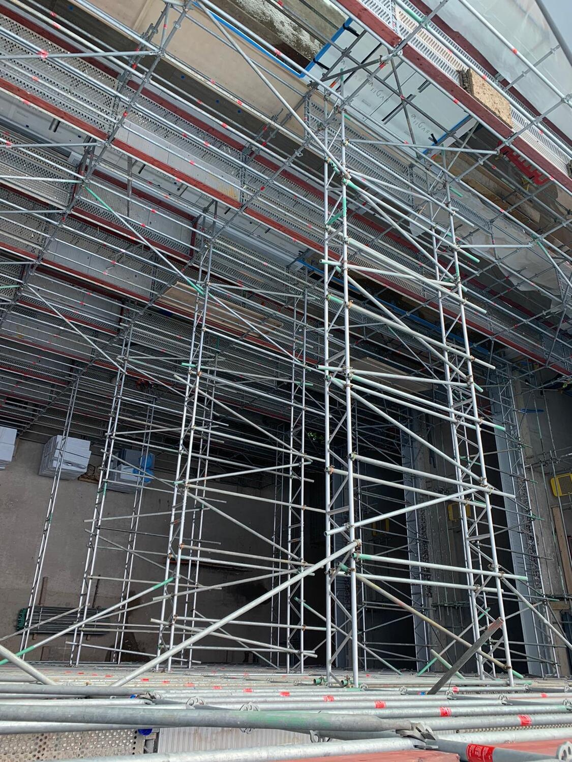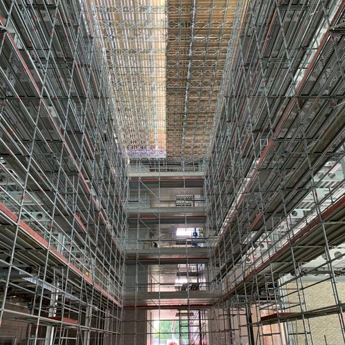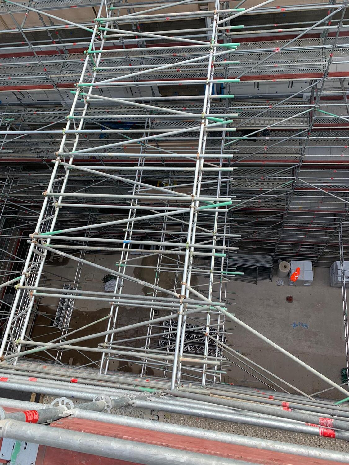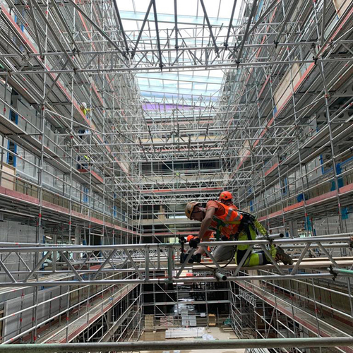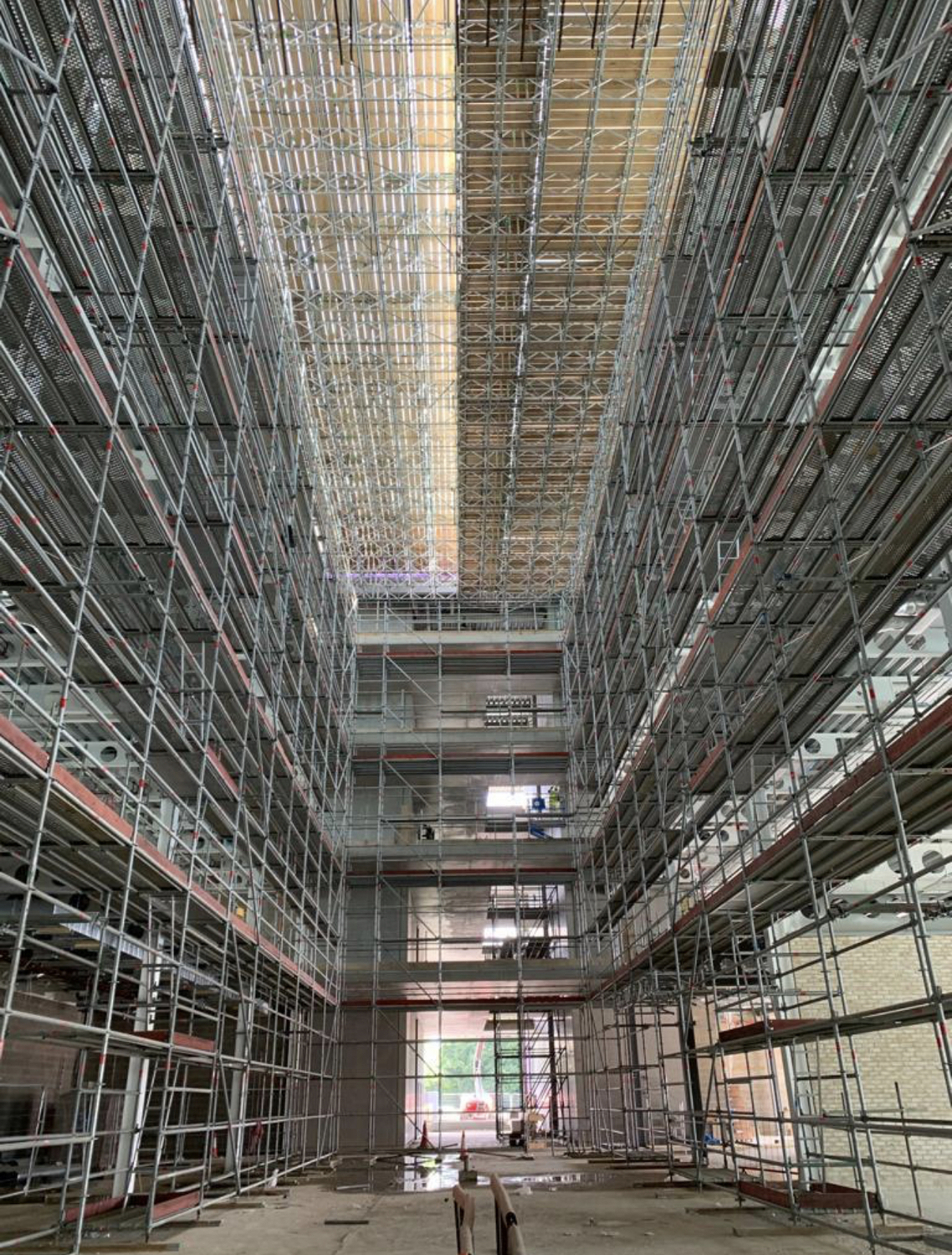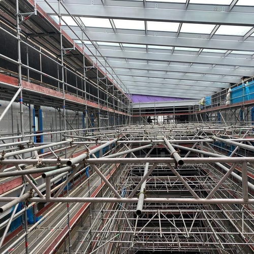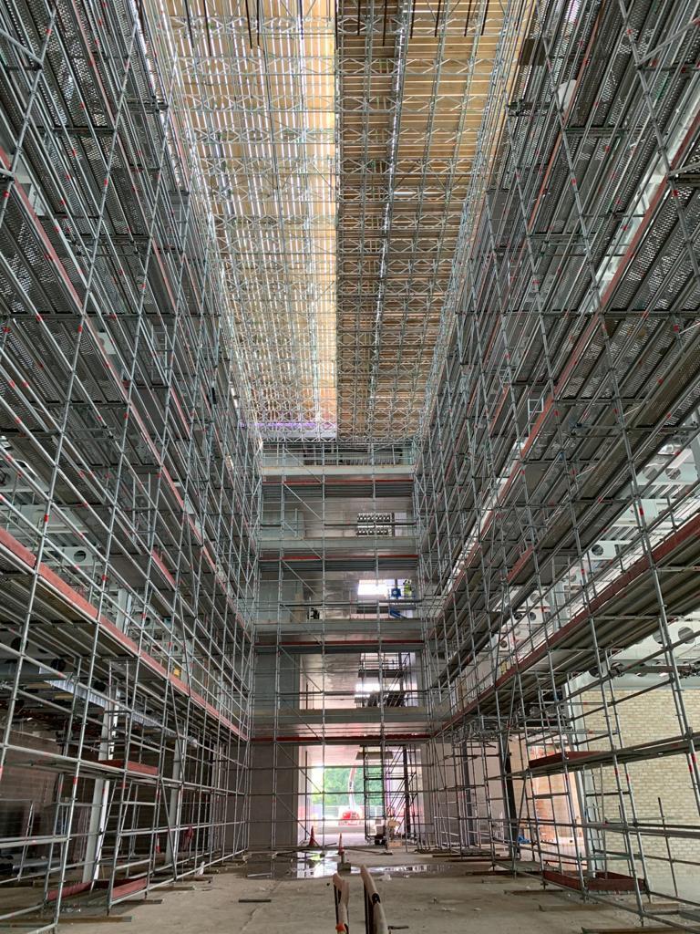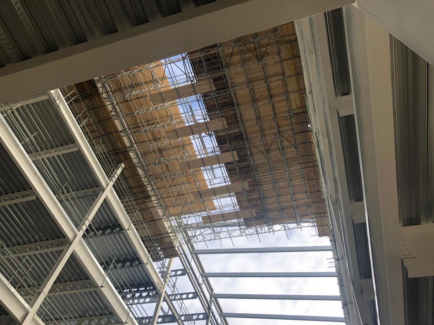 Portway Scaffolding has been tasked to provide a high level access platform to the underside of an atrium on a new prestigious head office building. The design is complicated due to the differing depths of ring beam steel, so in one area the 750mm beams are connected directly to the underside of the steel frame, in other area they are connected to scaffold tube, hung from the underside of the steel frame. The design has had to take into account the reduced capacity of the steel frame. Temporary access scaffold has been erected to the perimeter of the atrium one level below the roof with a 5 board wide cantilever, so that our scaffolders can walk the beams through and connect them to their final fixing point. Due to the reduced loadings of the ground slab, we are using a JLG x25 to act as