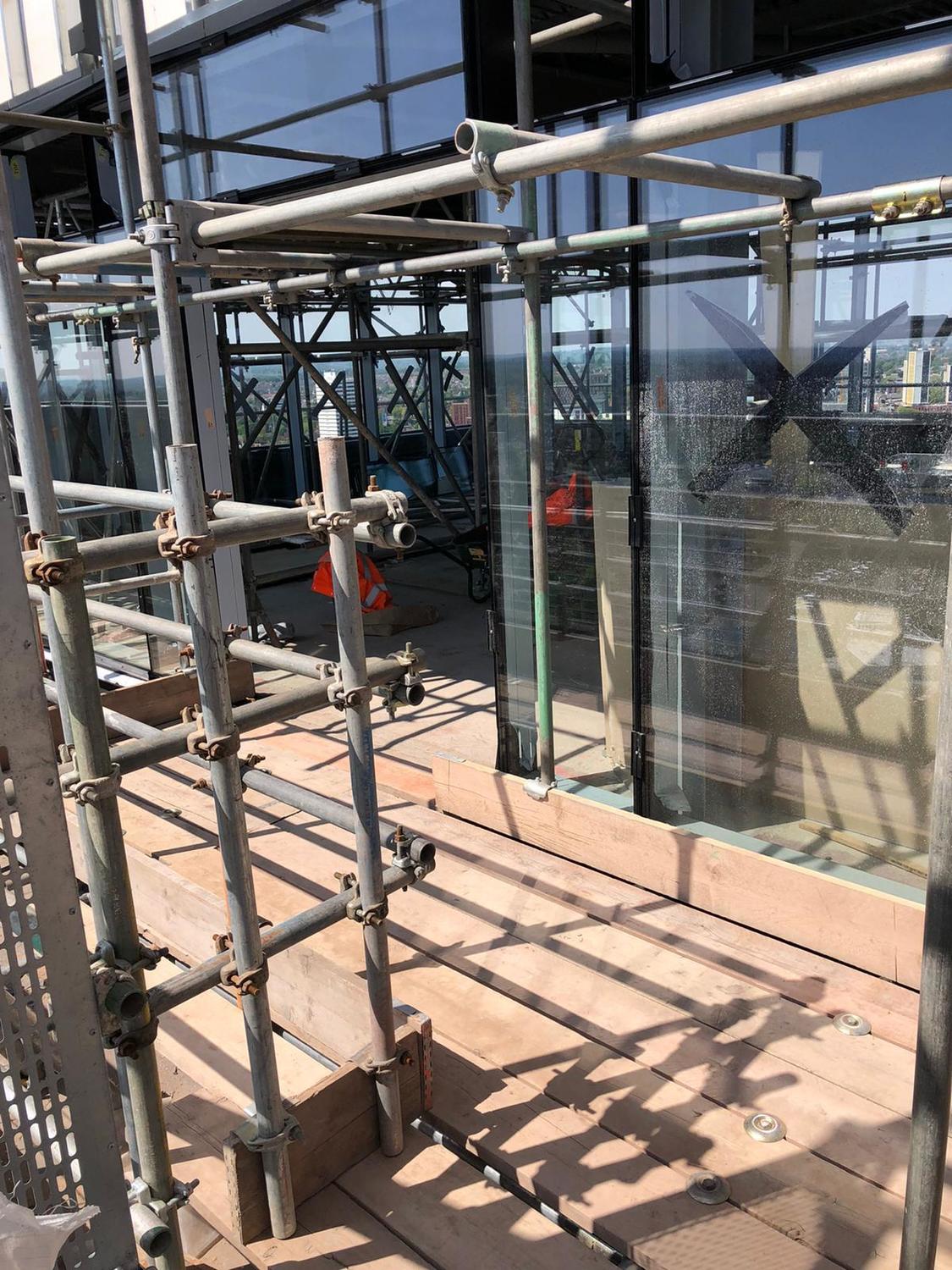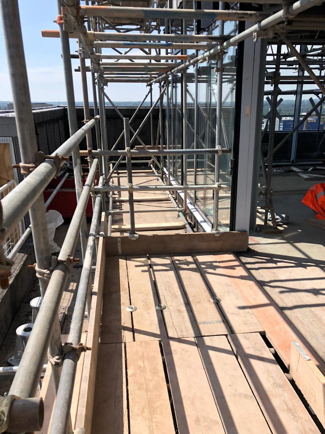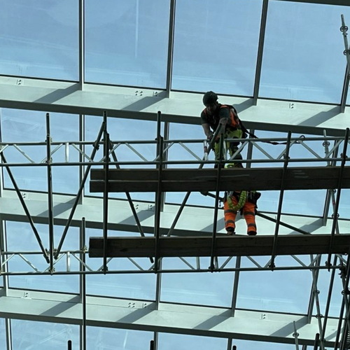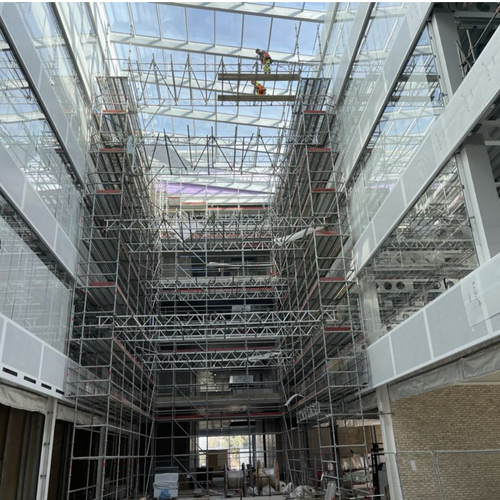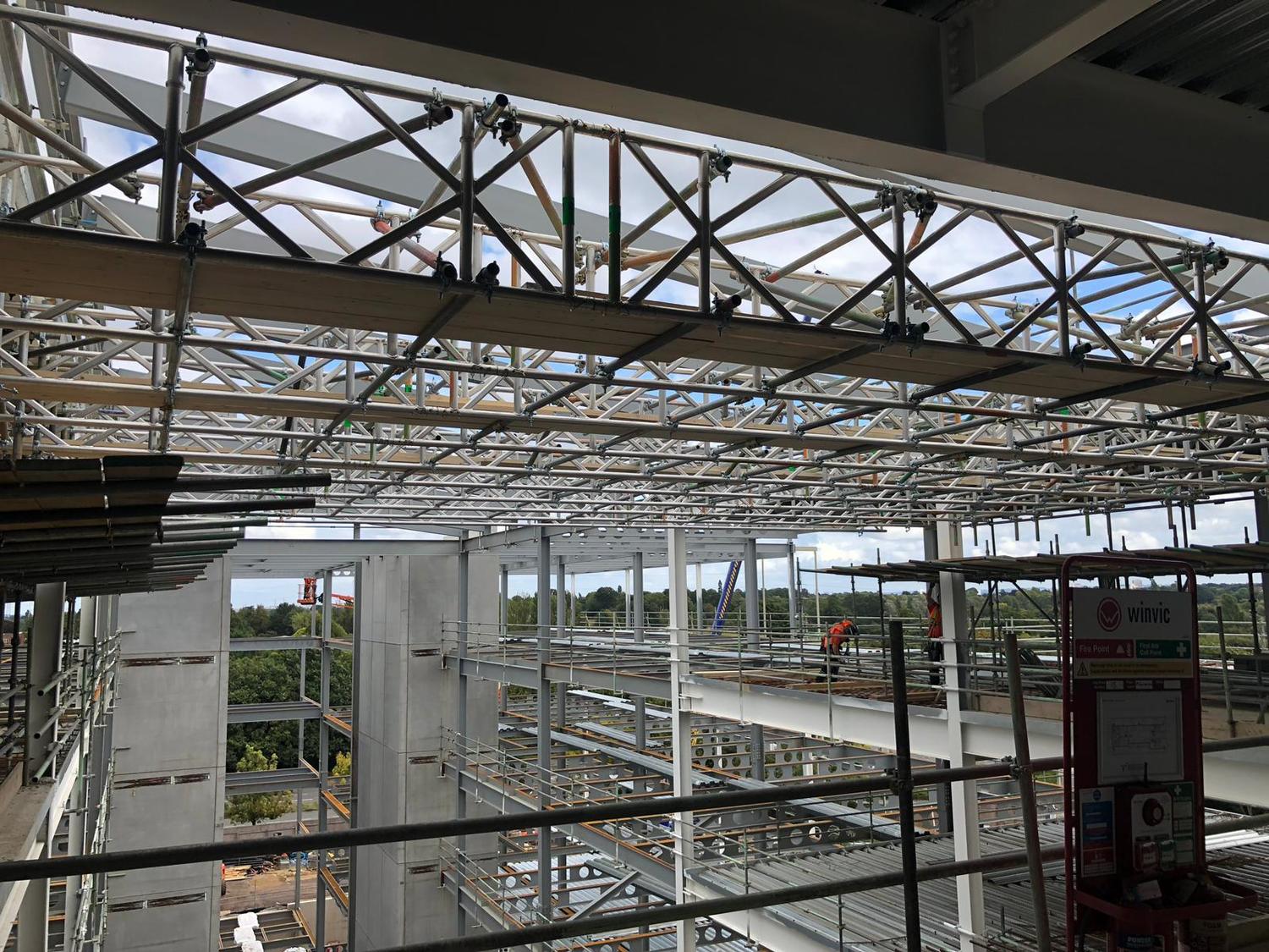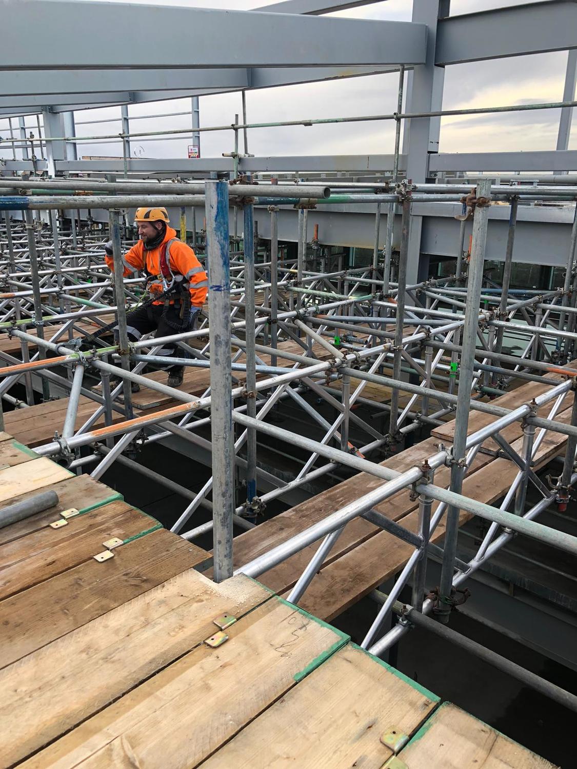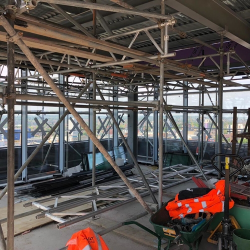 Portway Scaffolding has been tasked to provide a high level access platform to the underside of an atrium on a new prestigious head office building. The design is complicated due to the differing depths of ring beam steel, so in one area the 750mm beams are connected directly to the underside of the steel frame, in other area they are connected to scaffold tube, hung from the underside of the steel frame. The design has had to take into account the reduced capacity of the steel frame. Temporary access scaffold has been erected to the perimeter of the atrium one level below the roof with a 5 board wide cantilever, so that our scaffolders can walk the beams through and connect them to their final fixing point. Due to the reduced loadings of the ground slab, we are using a JLG x25 to act as