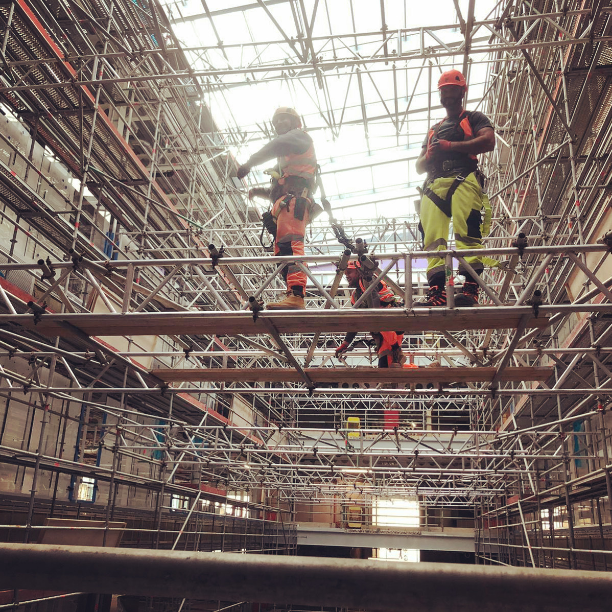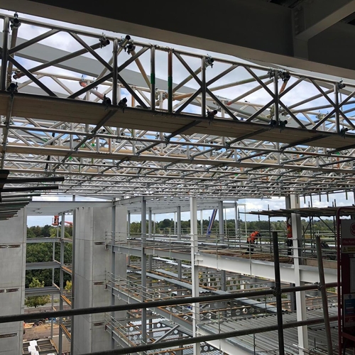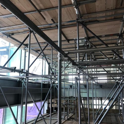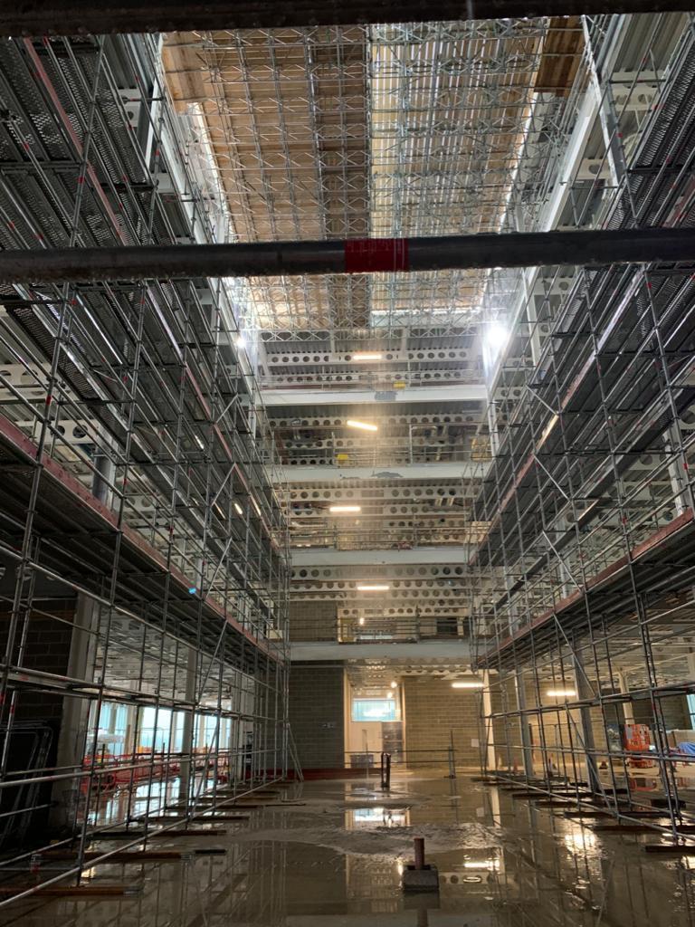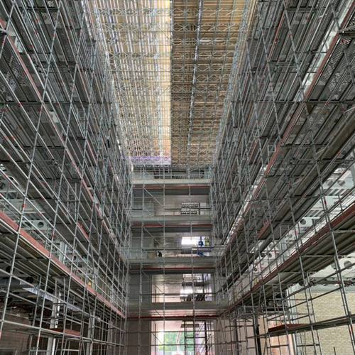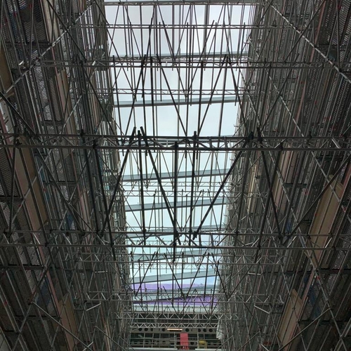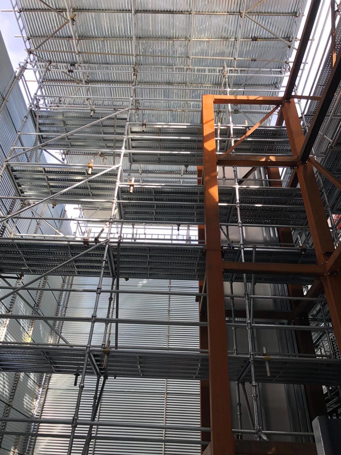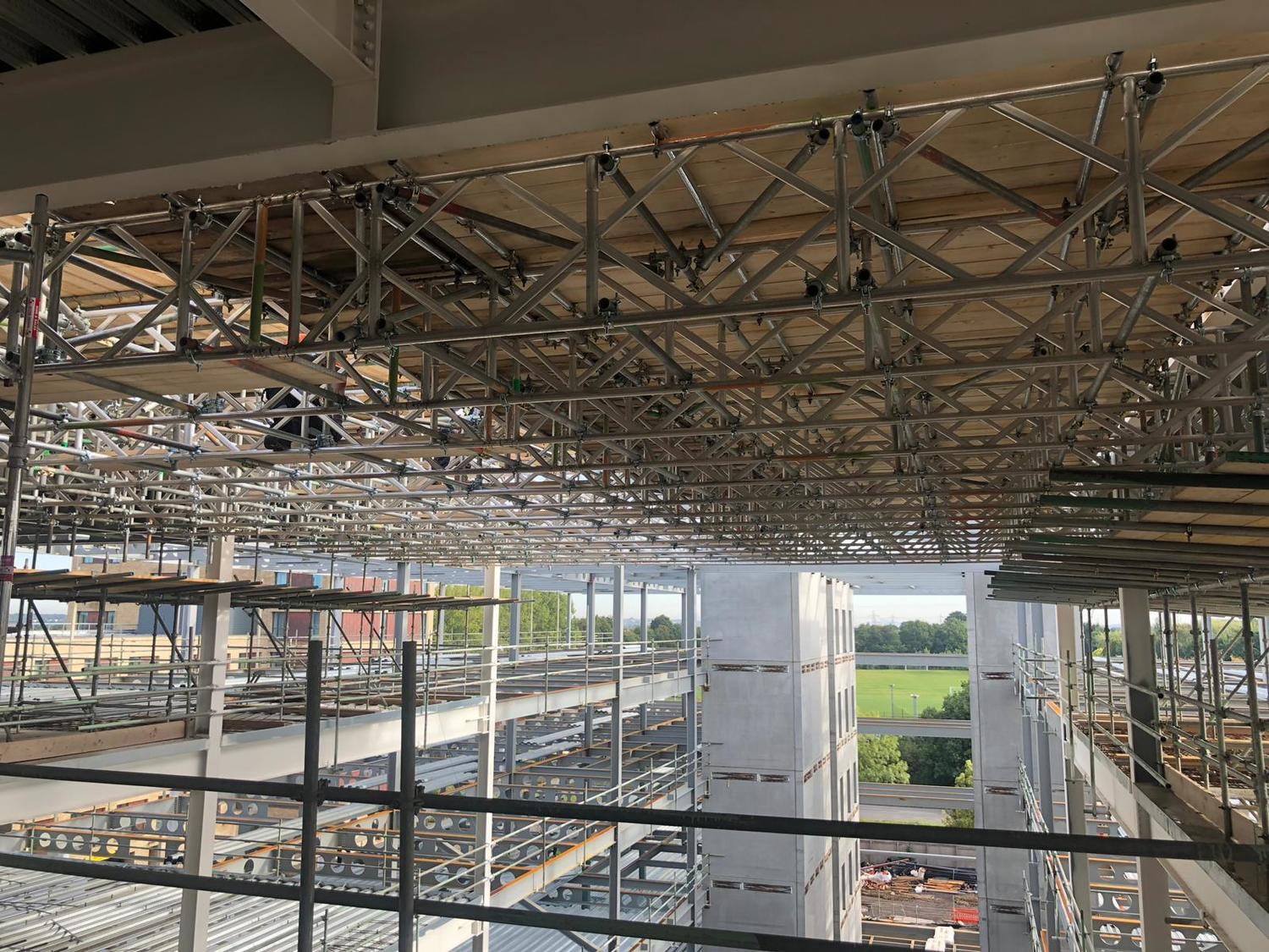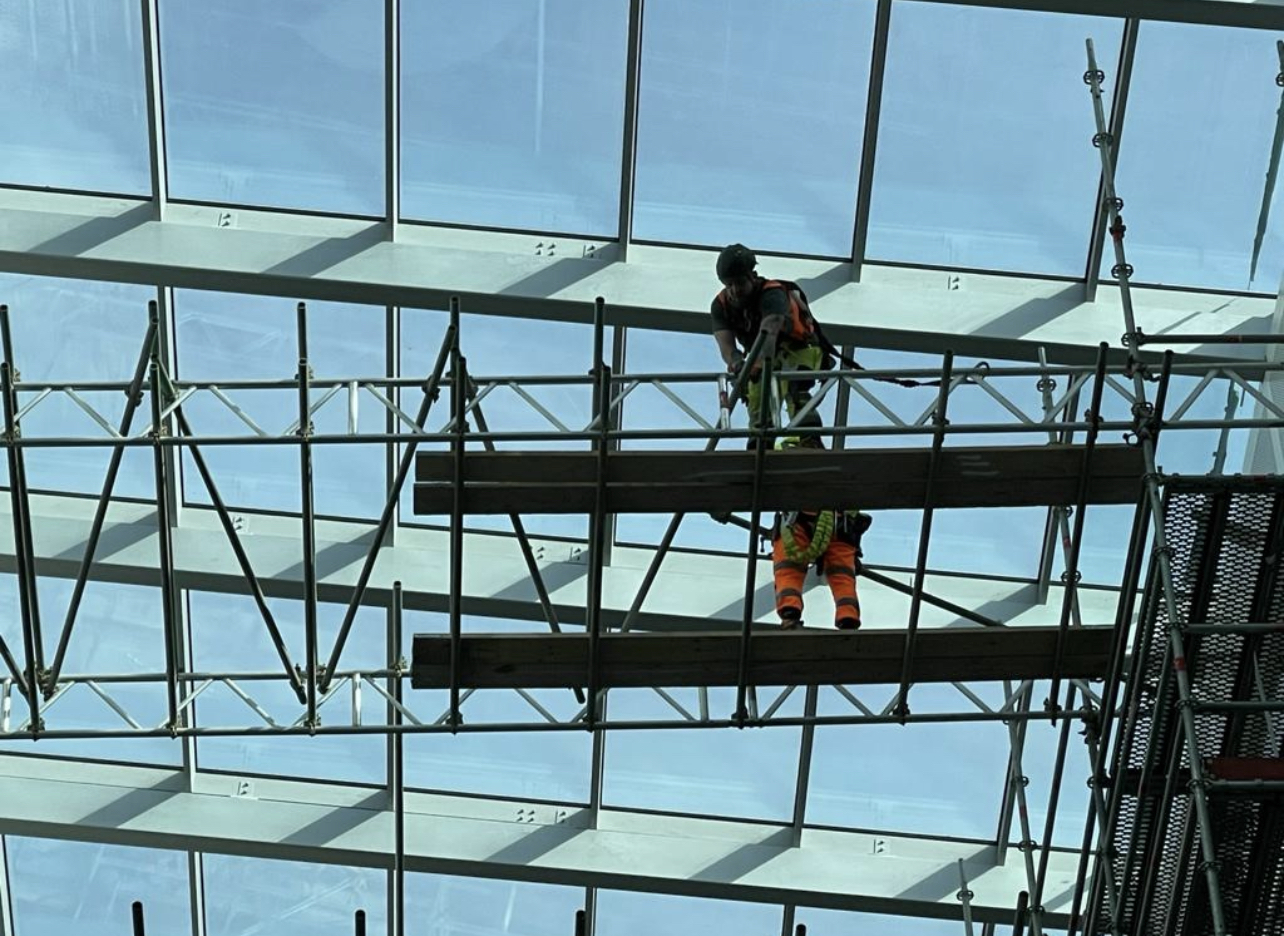 Portway Scaffolding has been tasked to provide a high level access platform to the underside of an atrium on a new prestigious head office building. The design is complicated due to the differing depths of ring beam steel, so in one area the 750mm beams are connected directly to the underside of the steel frame, in other area they are connected to scaffold tube, hung from the underside of the steel frame. The design has had to take into account the reduced capacity of the steel frame. Temporary access scaffold has been erected to the perimeter of the atrium one level below the roof with a 5 board wide cantilever, so that our scaffolders can walk the beams through and connect them to their final fixing point. Due to the reduced loadings of the ground slab, we are using a JLG x25 to act as