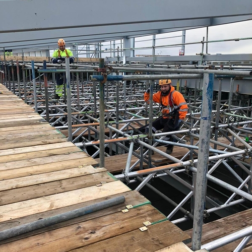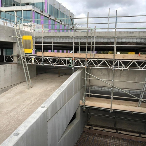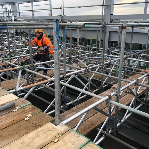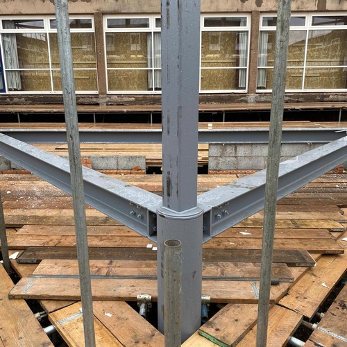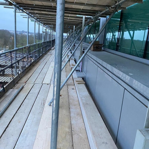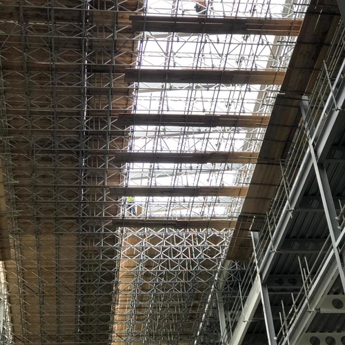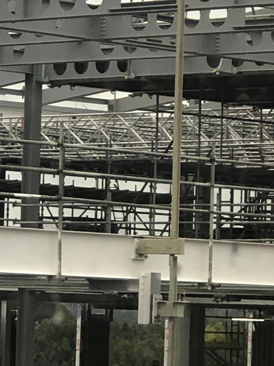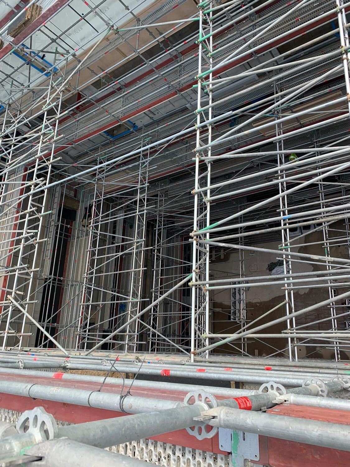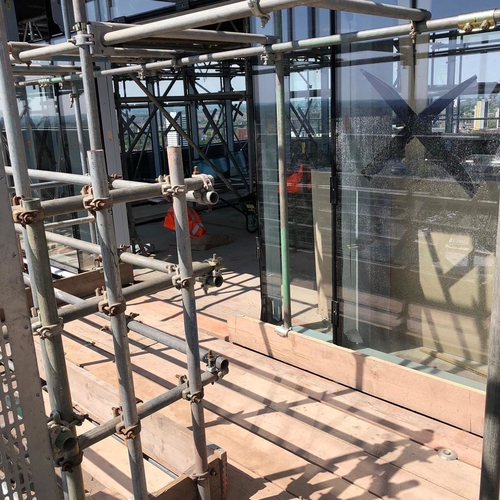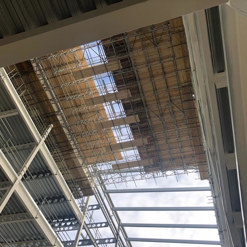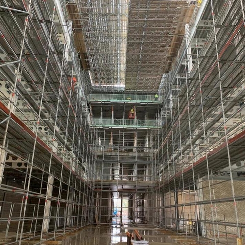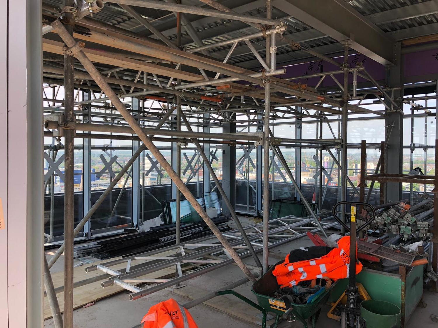 Portway Scaffolding has been tasked to provide a high level access platform to the underside of an atrium on a new prestigious head office building. The design is complicated due to the differing depths of ring beam steel, so in one area the 750mm beams are connected directly to the underside of the steel frame, in other area they are connected to scaffold tube, hung from the underside of the steel frame. The design has had to take into account the reduced capacity of the steel frame. Temporary access scaffold has been erected to the perimeter of the atrium one level below the roof with a 5 board wide cantilever, so that our scaffolders can walk the beams through and connect them to their final fixing point. Due to the reduced loadings of the ground slab, we are using a JLG x25 to act as