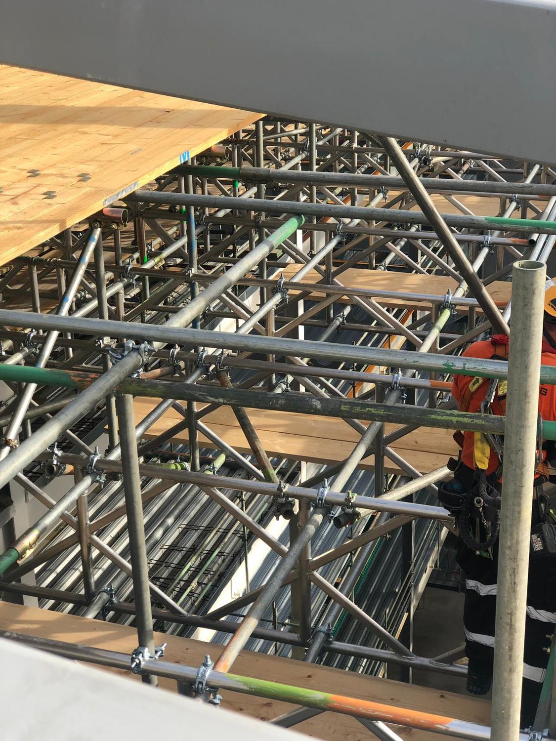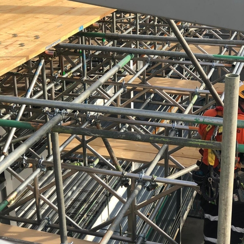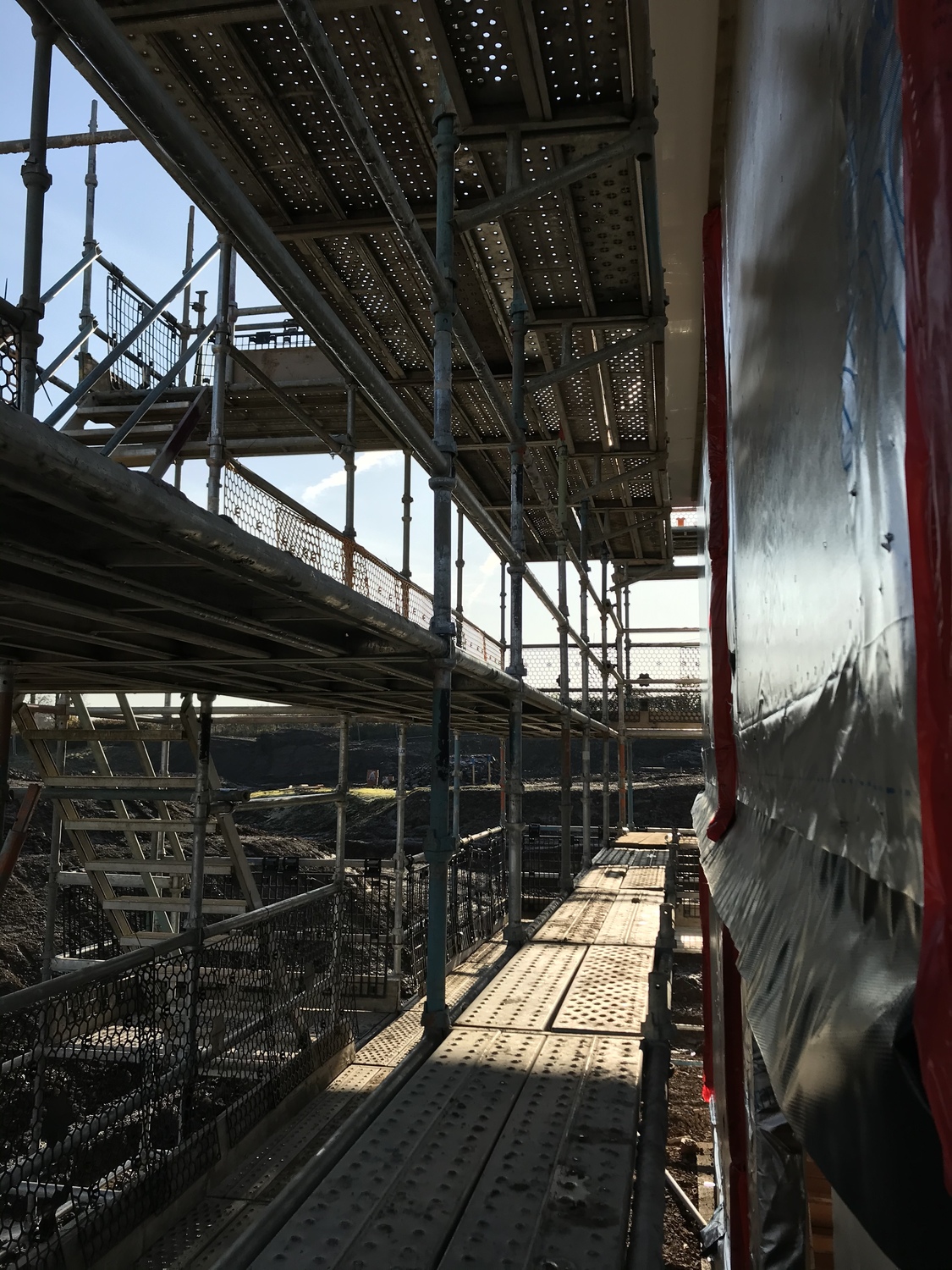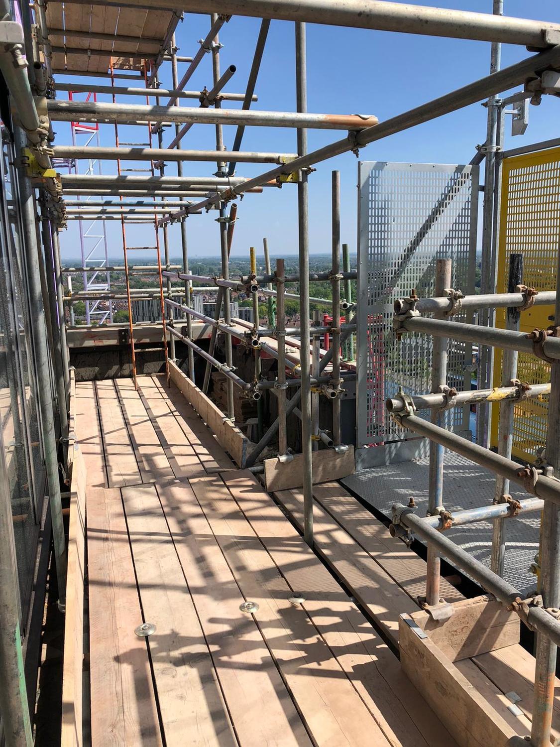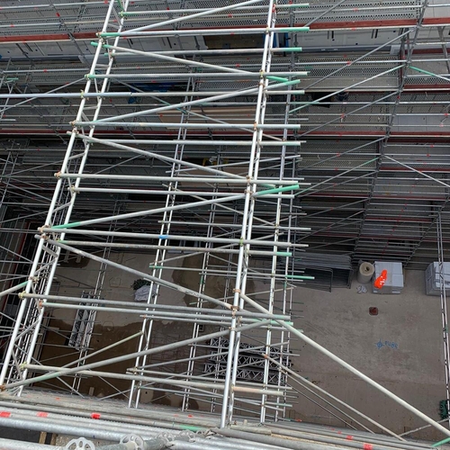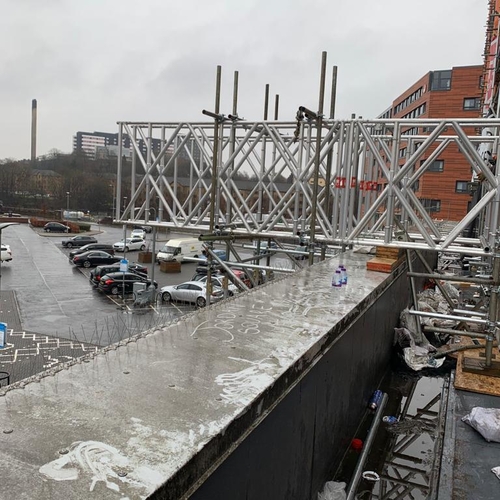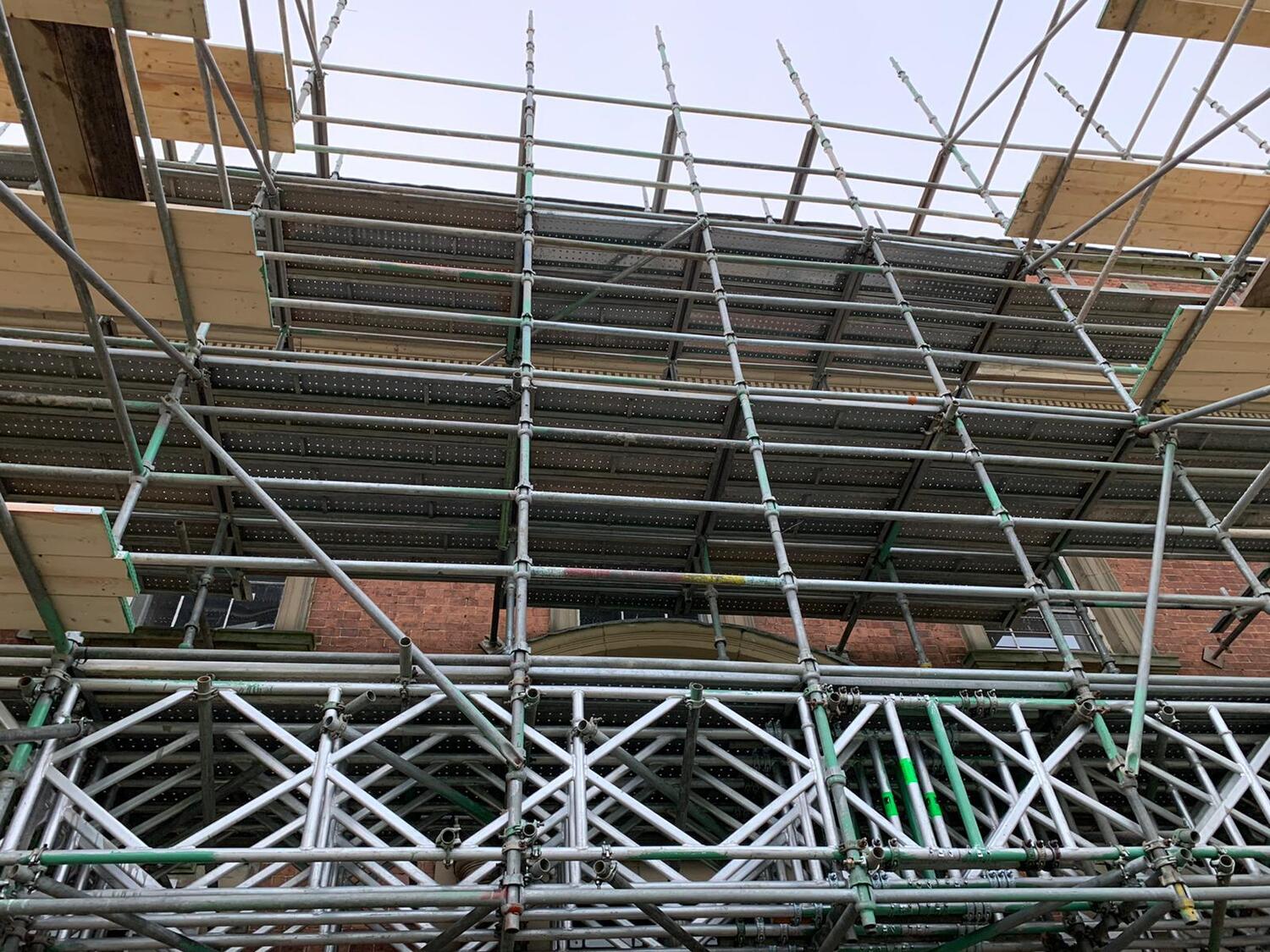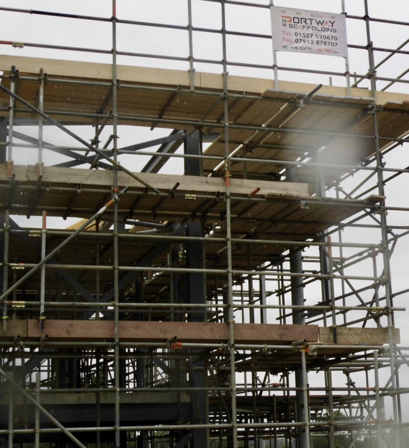 Portway Scaffolding has been tasked to provide a high level access platform to the underside of an atrium on a new prestigious head office building. The design is complicated due to the differing depths of ring beam steel, so in one area the 750mm beams are connected directly to the underside of the steel frame, in other area they are connected to scaffold tube, hung from the underside of the steel frame. The design has had to take into account the reduced capacity of the steel frame. Temporary access scaffold has been erected to the perimeter of the atrium one level below the roof with a 5 board wide cantilever, so that our scaffolders can walk the beams through and connect them to their final fixing point. Due to the reduced loadings of the ground slab, we are using a JLG x25 to act as