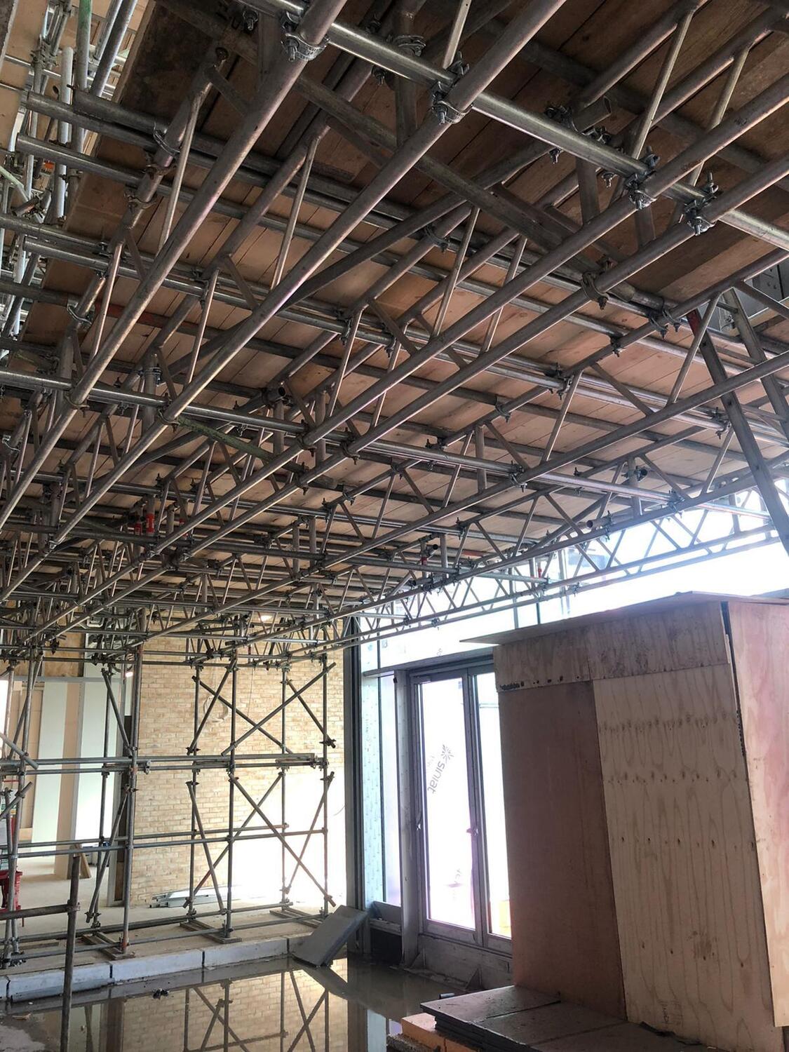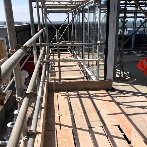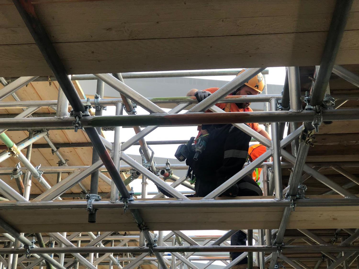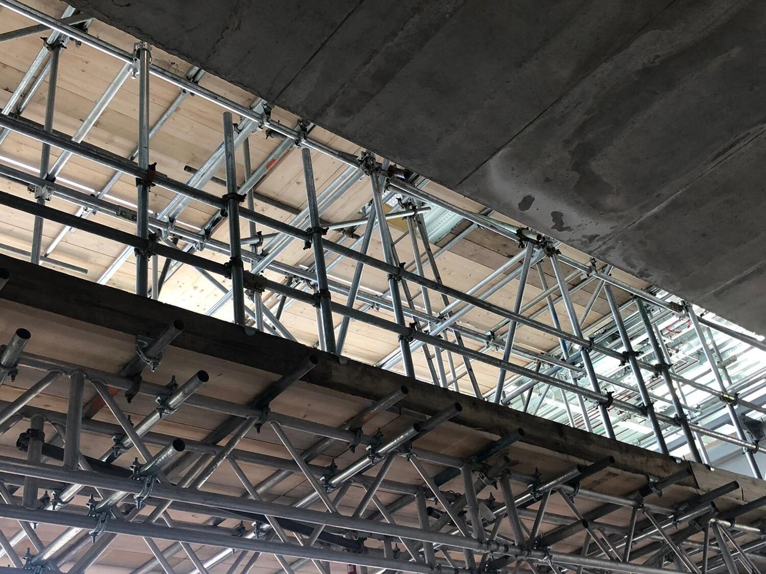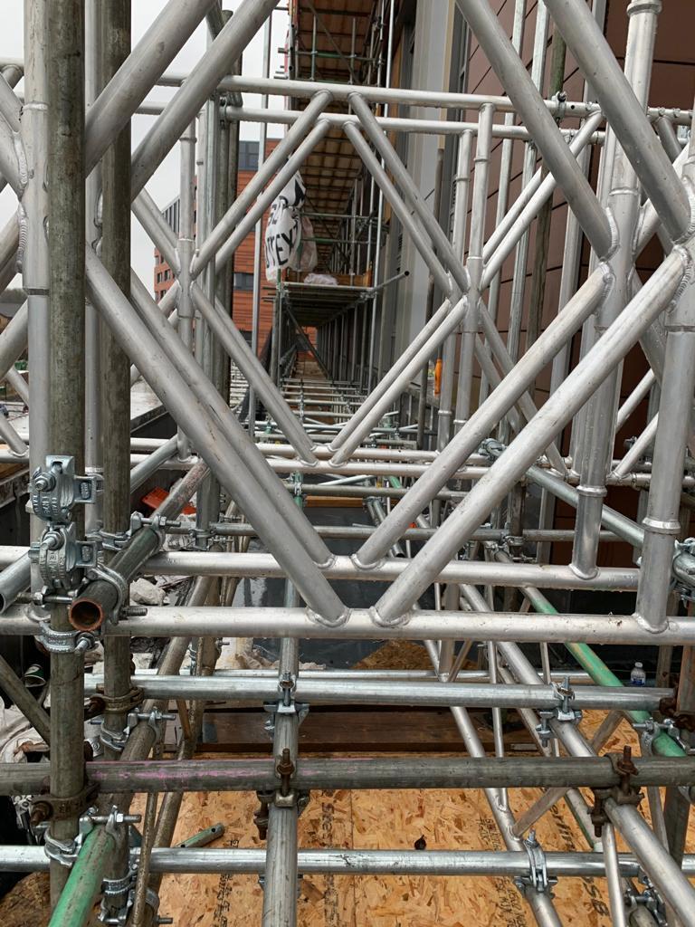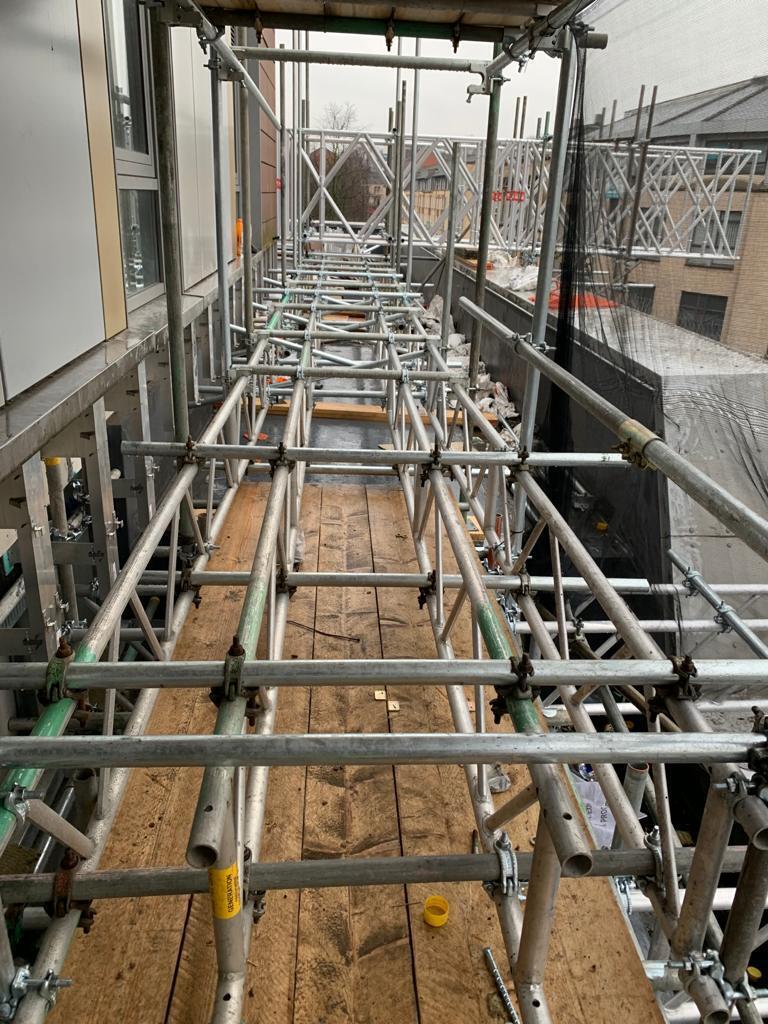 Portway Scaffolding has been tasked to provide a high level access platform to the underside of an atrium on a new prestigious head office building. The design is complicated due to the differing depths of ring beam steel, so in one area the 750mm beams are connected directly to the underside of the steel frame, in other area they are connected to scaffold tube, hung from the underside of the steel frame. The design has had to take into account the reduced capacity of the steel frame. Temporary access scaffold has been erected to the perimeter of the atrium one level below the roof with a 5 board wide cantilever, so that our scaffolders can walk the beams through and connect them to their final fixing point. Due to the reduced loadings of the ground slab, we are using a JLG x25 to act as