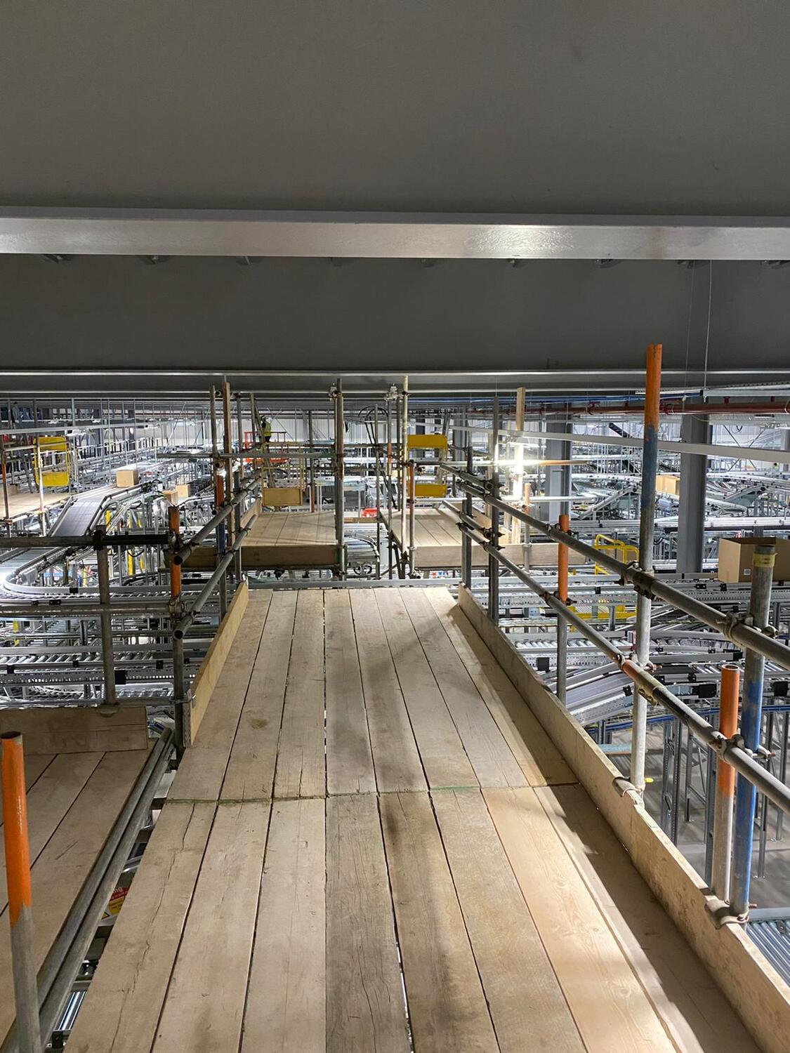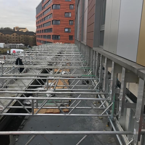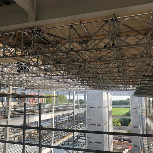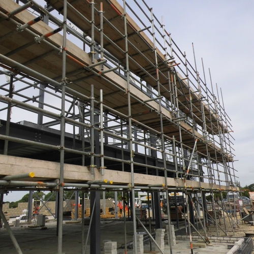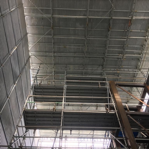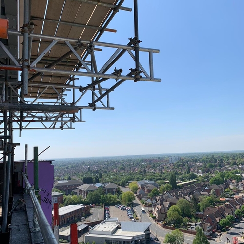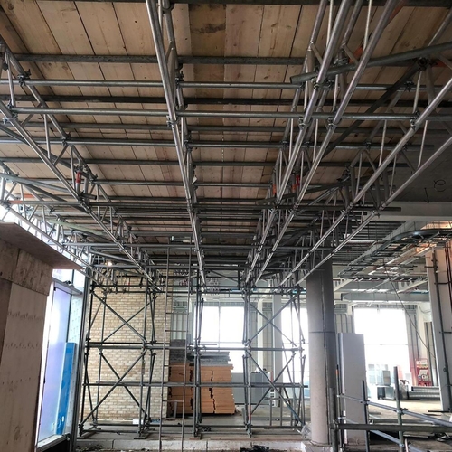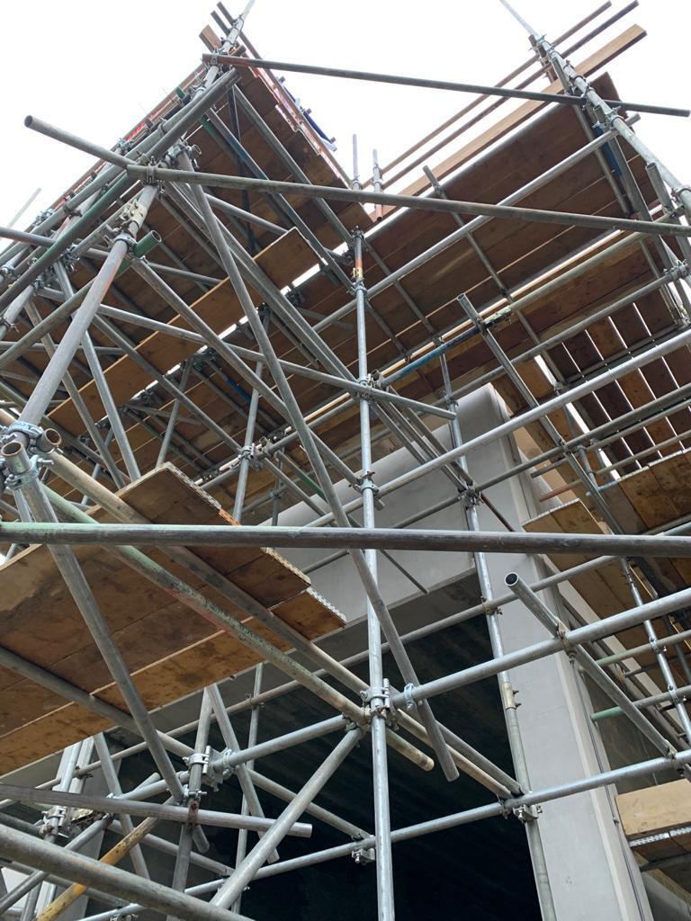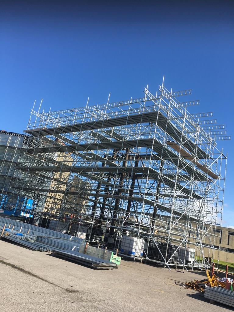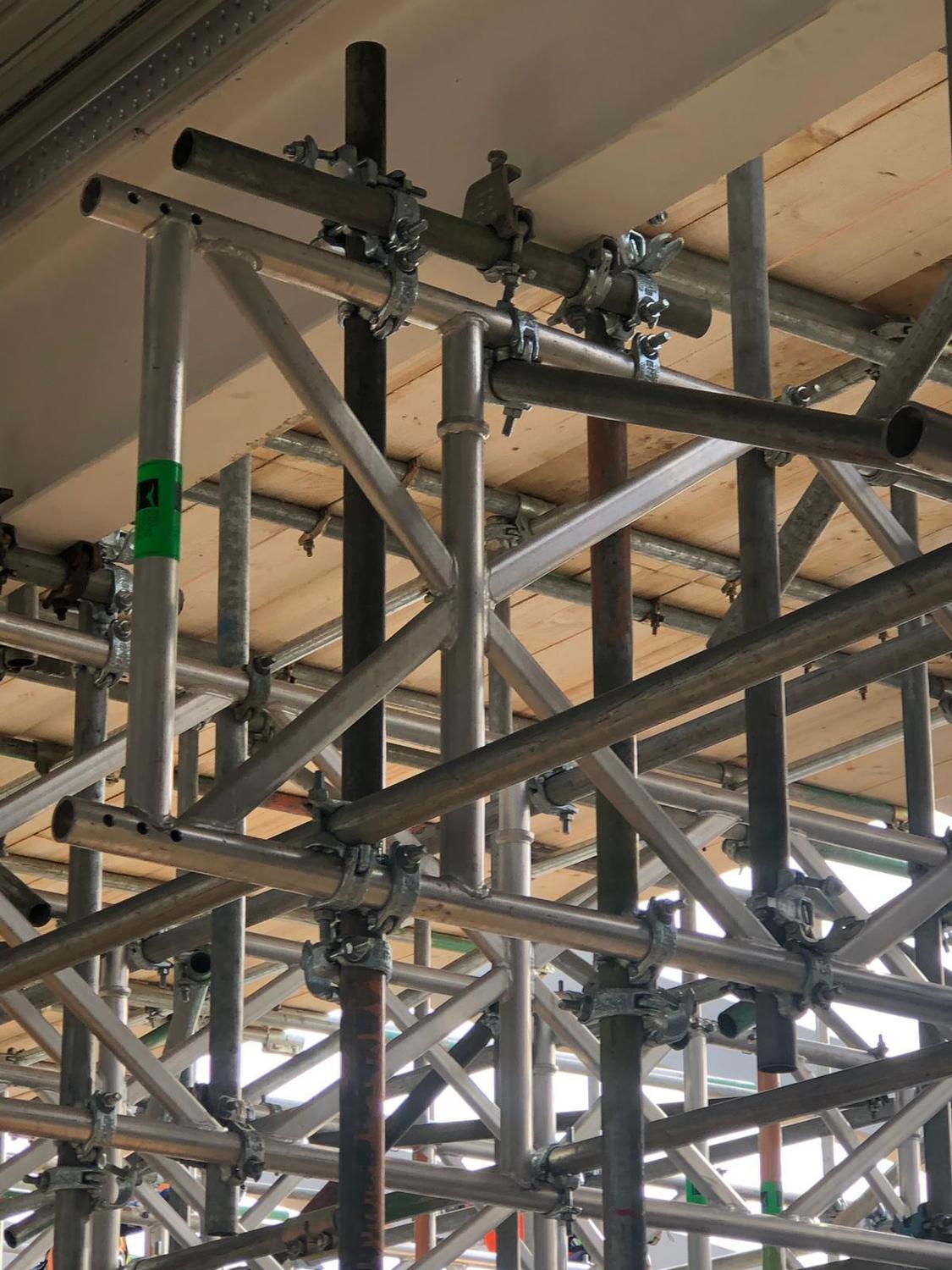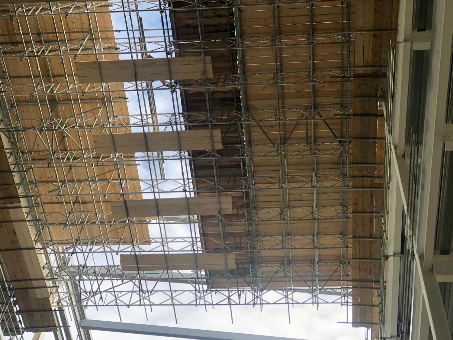 Portway Scaffolding has been tasked to provide a high level access platform to the underside of an atrium on a new prestigious head office building. The design is complicated due to the differing depths of ring beam steel, so in one area the 750mm beams are connected directly to the underside of the steel frame, in other area they are connected to scaffold tube, hung from the underside of the steel frame. The design has had to take into account the reduced capacity of the steel frame. Temporary access scaffold has been erected to the perimeter of the atrium one level below the roof with a 5 board wide cantilever, so that our scaffolders can walk the beams through and connect them to their final fixing point. Due to the reduced loadings of the ground slab, we are using a JLG x25 to act as
