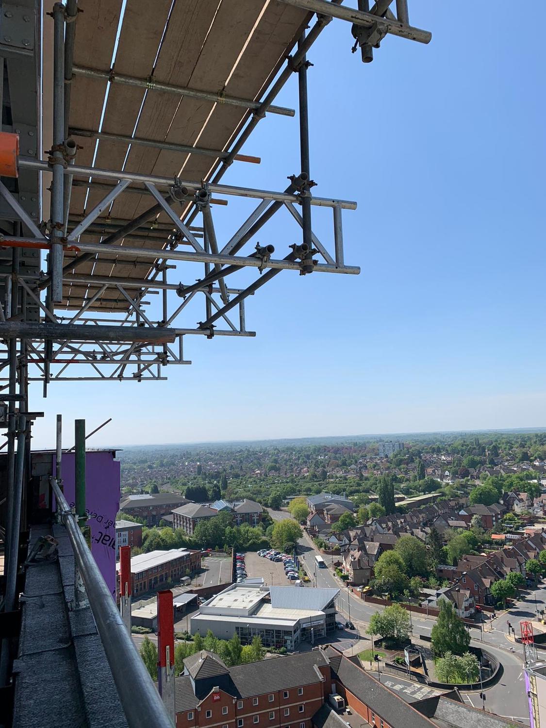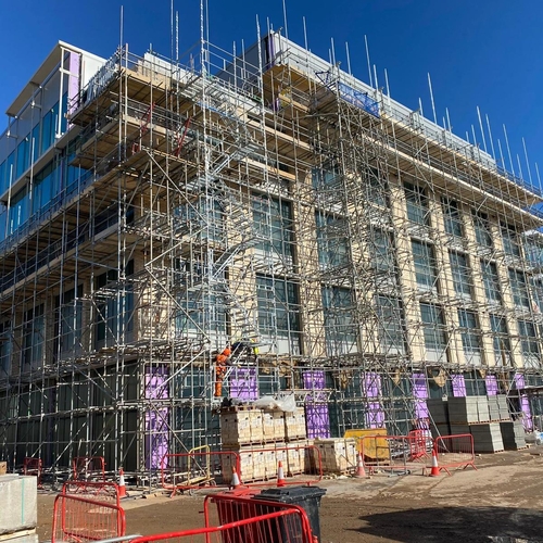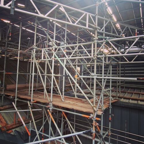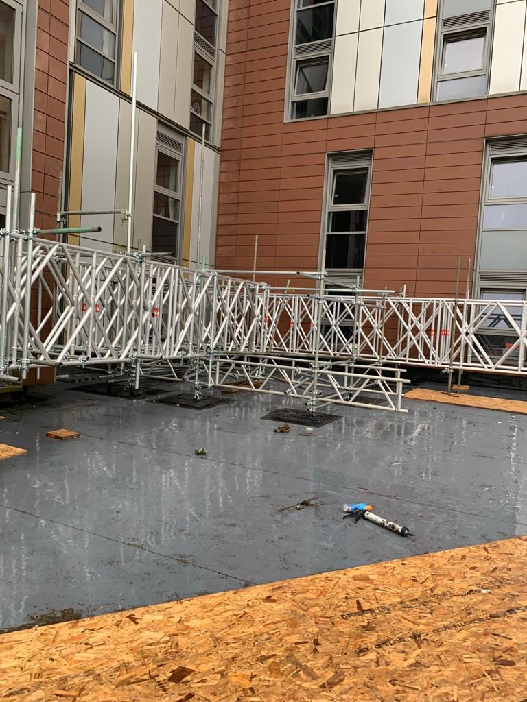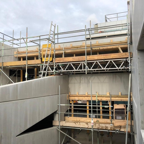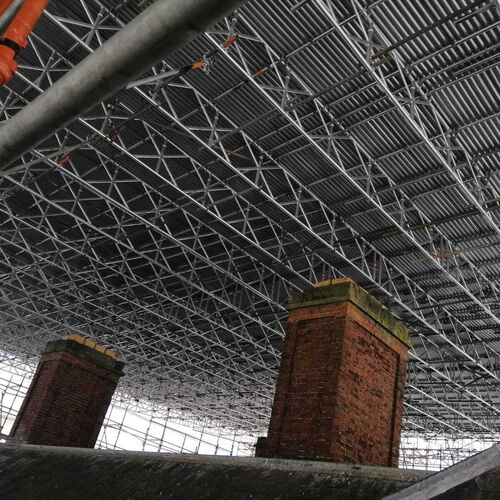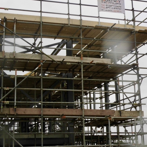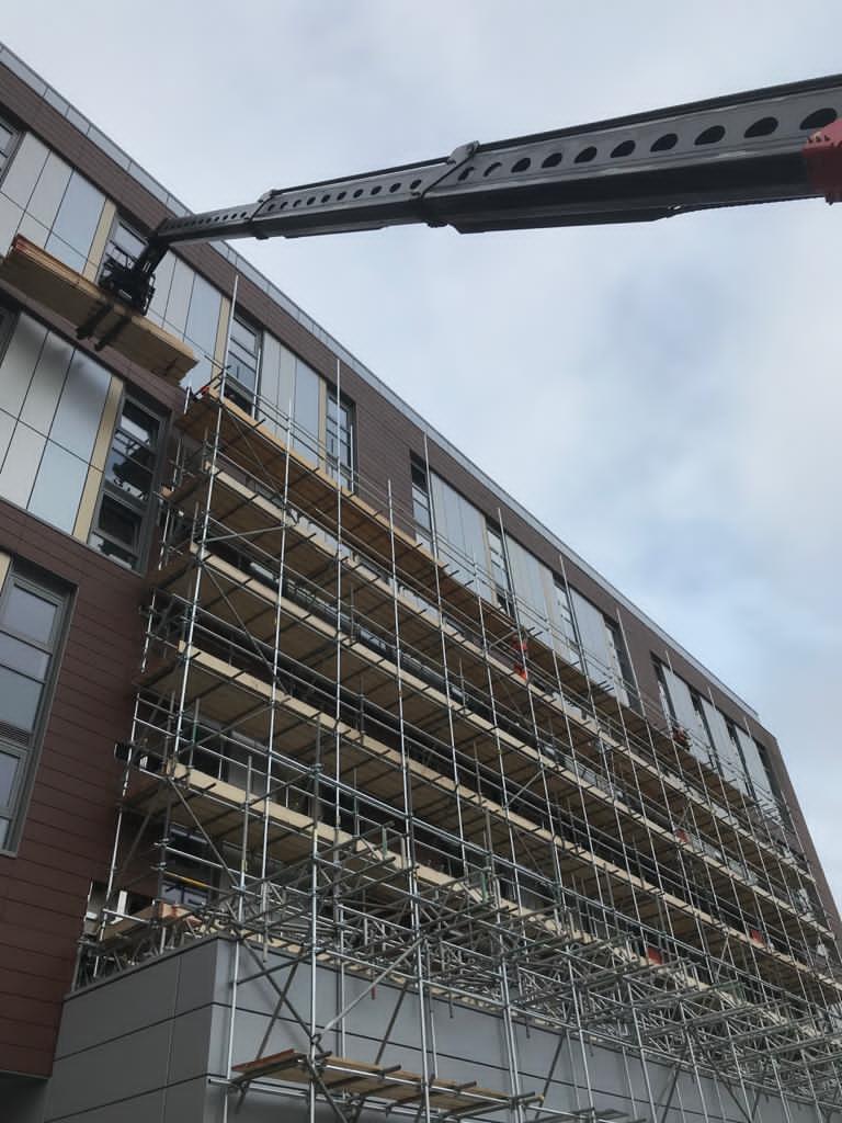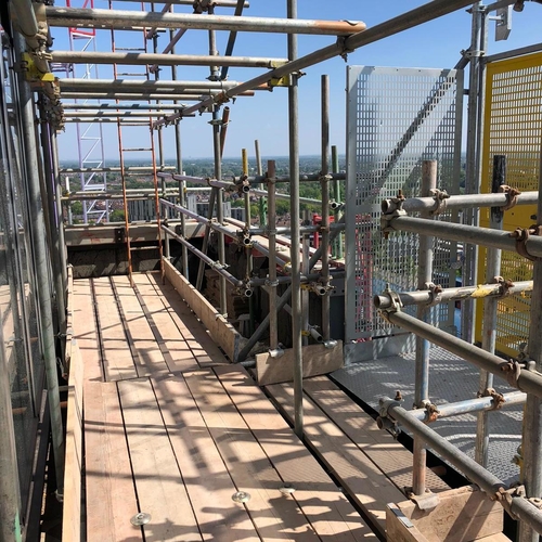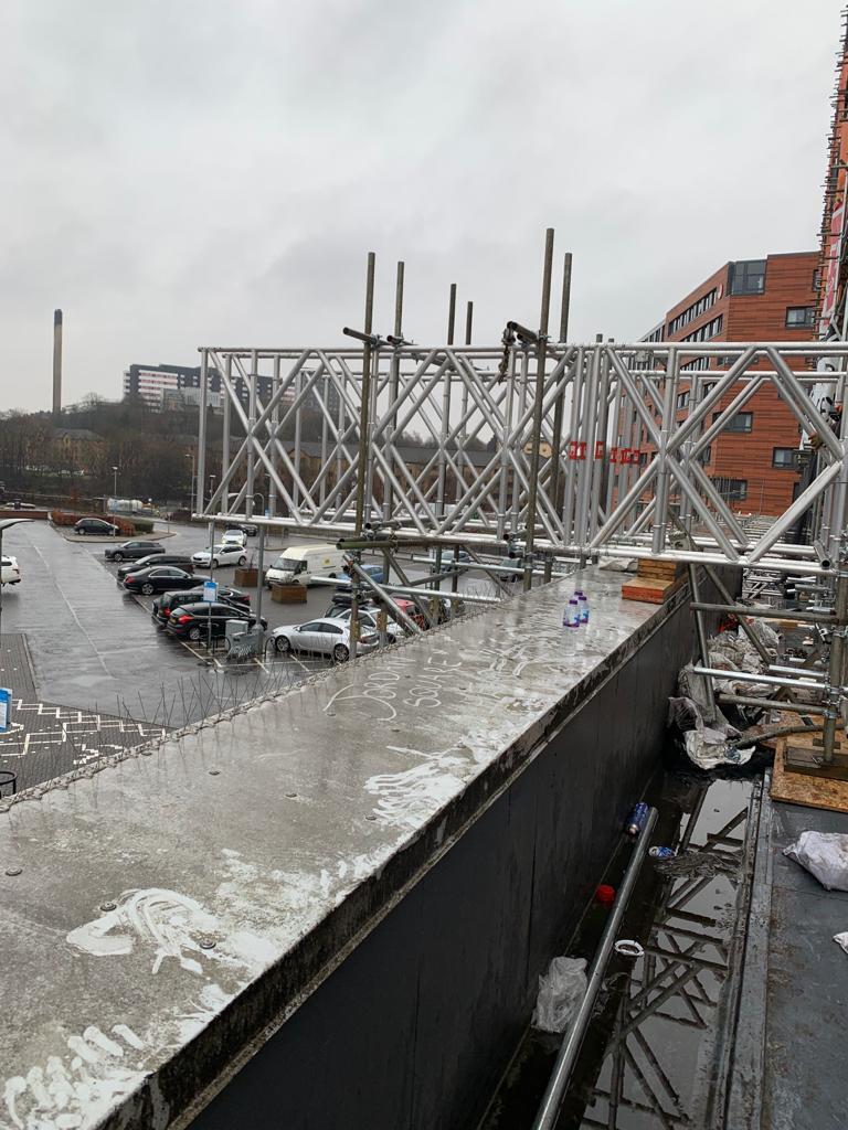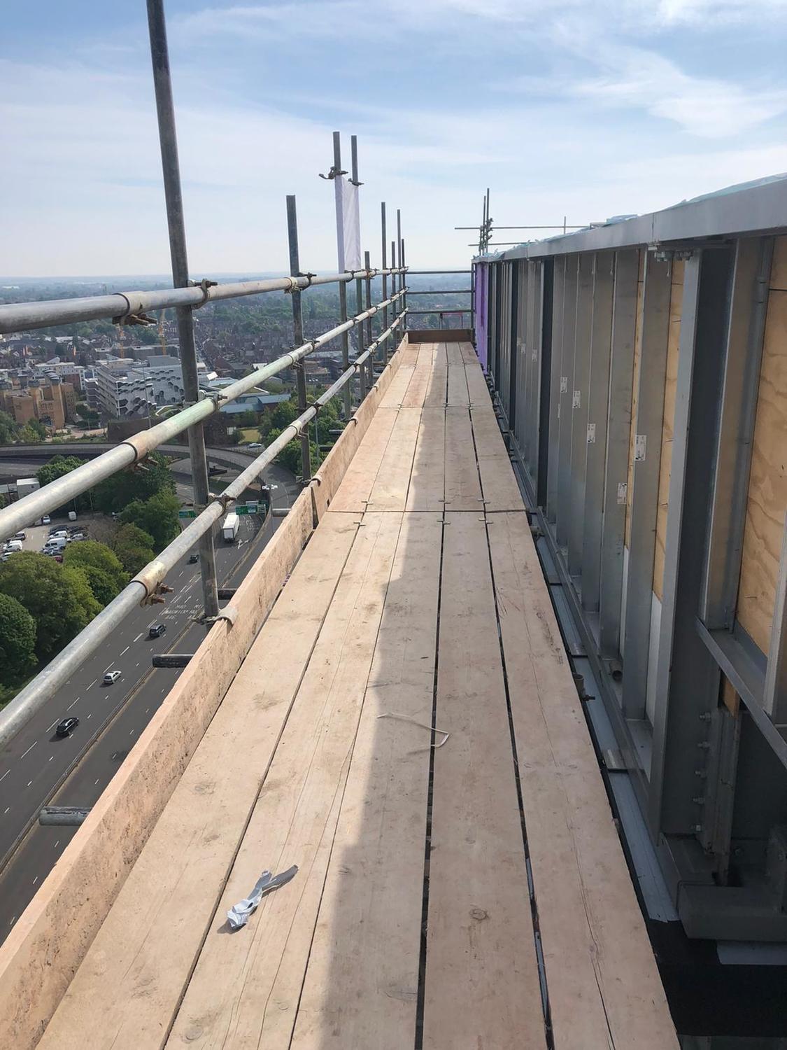 Portway Scaffolding has been tasked to provide a high level access platform to the underside of an atrium on a new prestigious head office building. The design is complicated due to the differing depths of ring beam steel, so in one area the 750mm beams are connected directly to the underside of the steel frame, in other area they are connected to scaffold tube, hung from the underside of the steel frame. The design has had to take into account the reduced capacity of the steel frame. Temporary access scaffold has been erected to the perimeter of the atrium one level below the roof with a 5 board wide cantilever, so that our scaffolders can walk the beams through and connect them to their final fixing point. Due to the reduced loadings of the ground slab, we are using a JLG x25 to act as