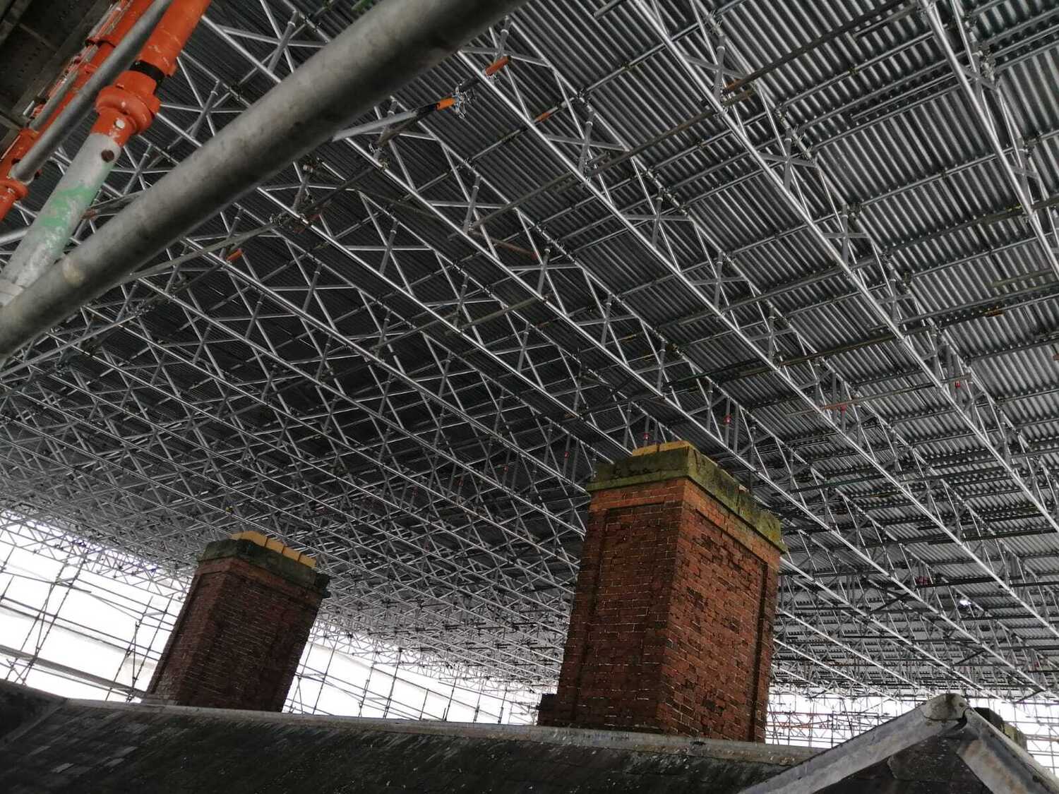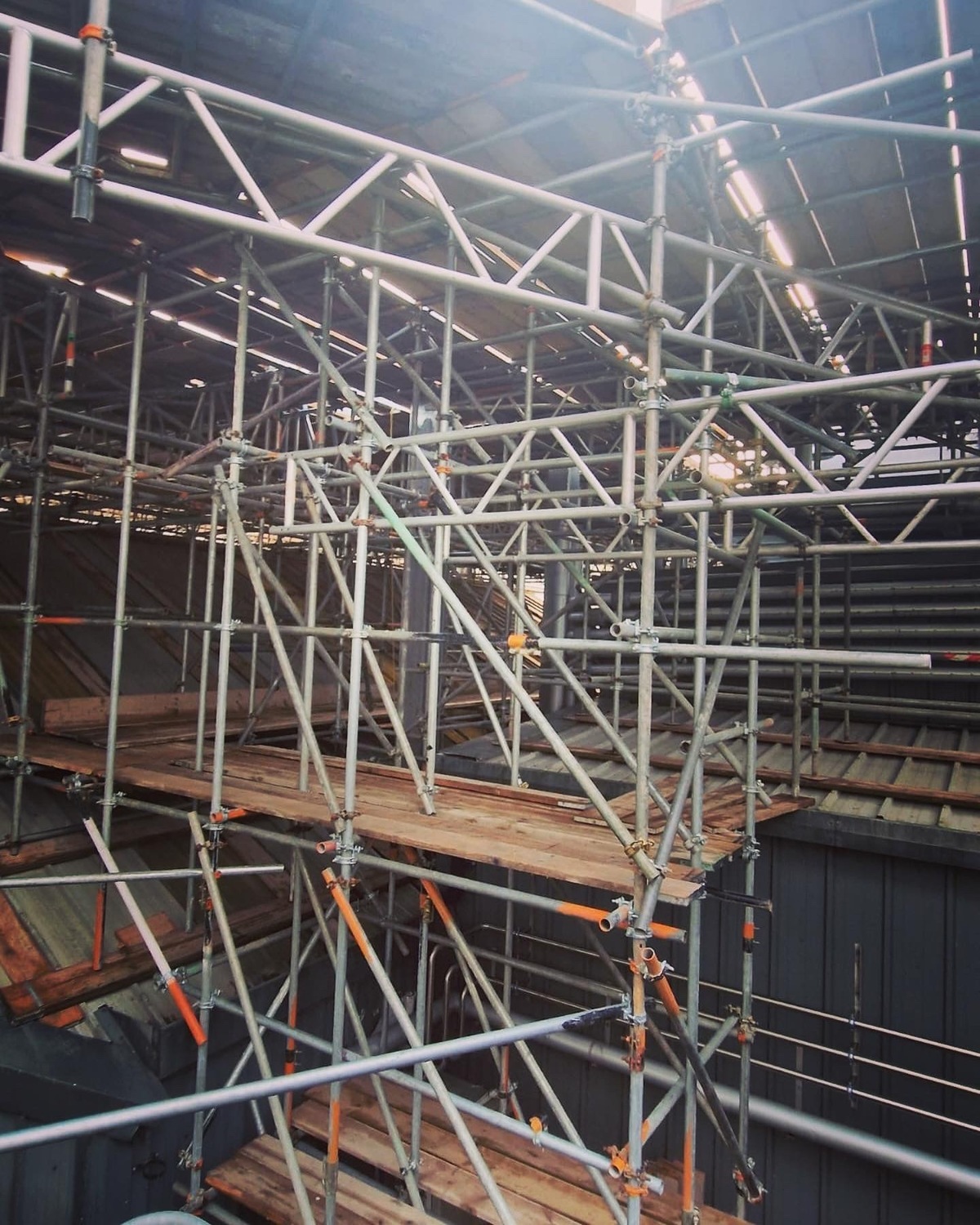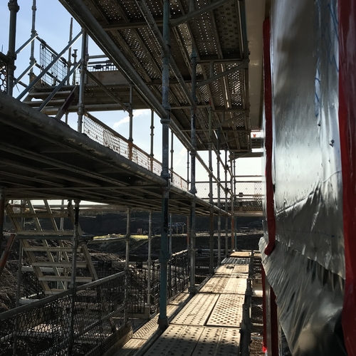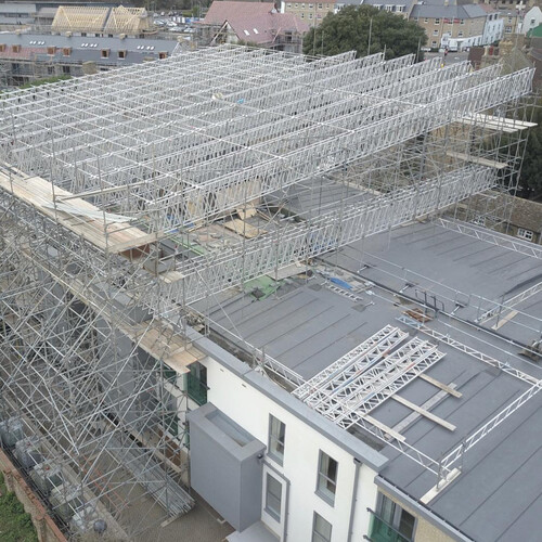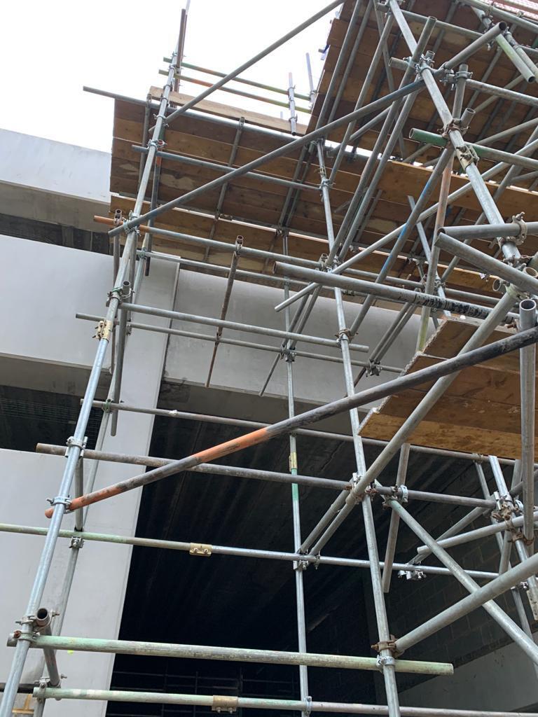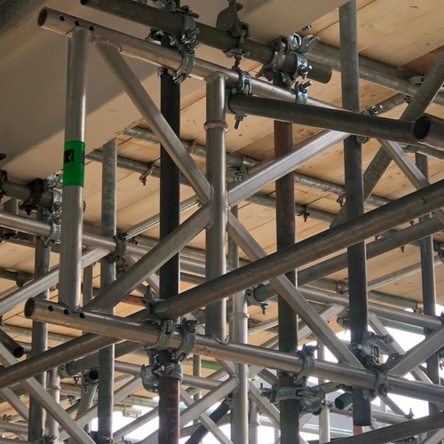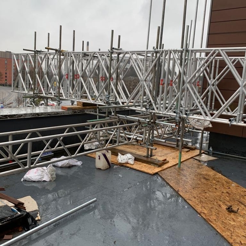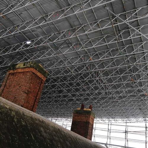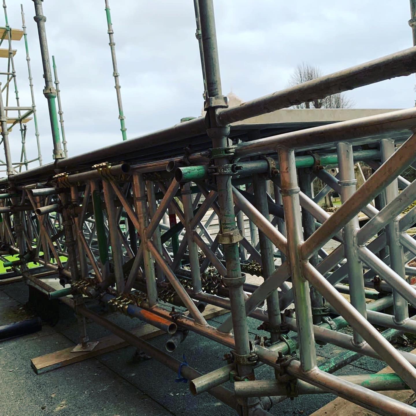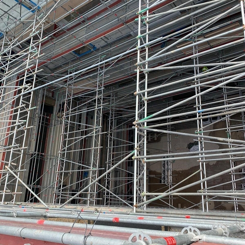 Portway Scaffolding has been tasked to provide a high level access platform to the underside of an atrium on a new prestigious head office building. The design is complicated due to the differing depths of ring beam steel, so in one area the 750mm beams are connected directly to the underside of the steel frame, in other area they are connected to scaffold tube, hung from the underside of the steel frame. The design has had to take into account the reduced capacity of the steel frame. Temporary access scaffold has been erected to the perimeter of the atrium one level below the roof with a 5 board wide cantilever, so that our scaffolders can walk the beams through and connect them to their final fixing point. Due to the reduced loadings of the ground slab, we are using a JLG x25 to act as