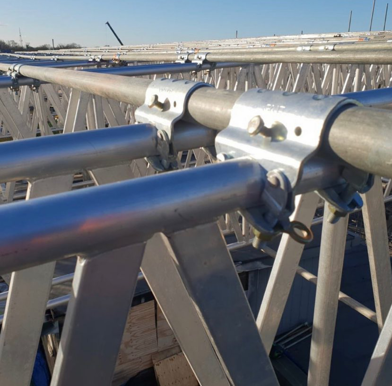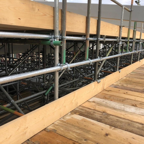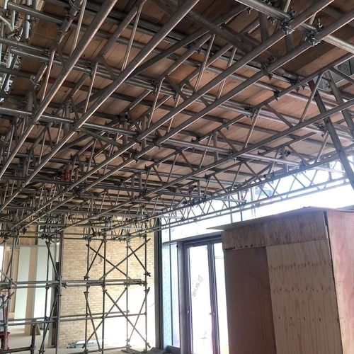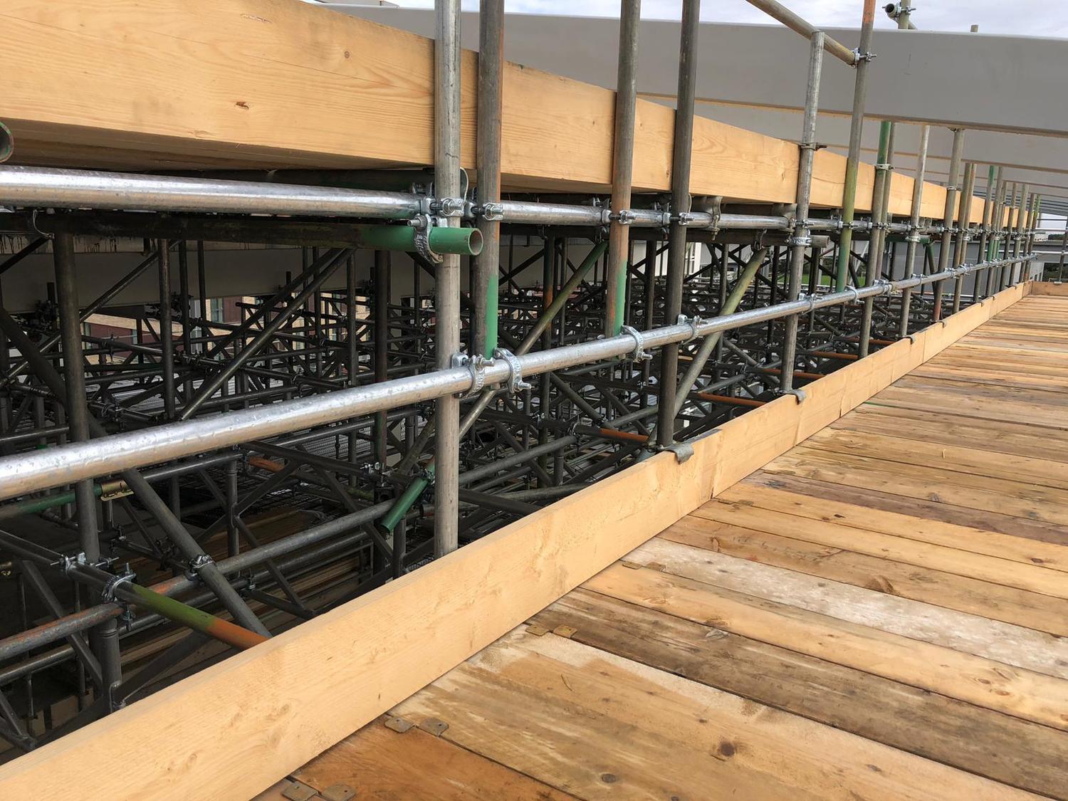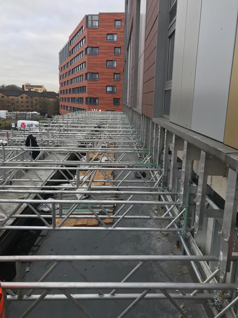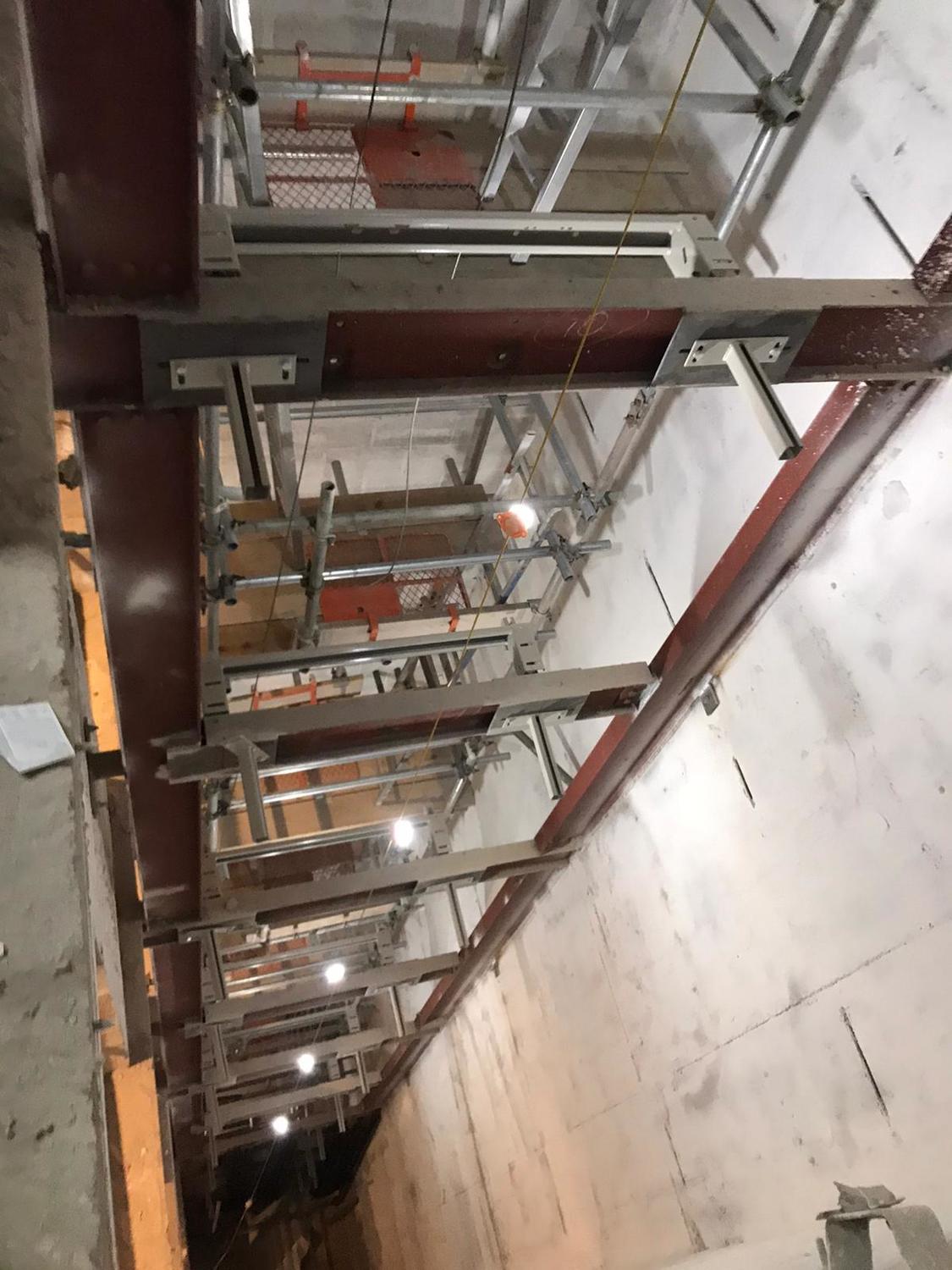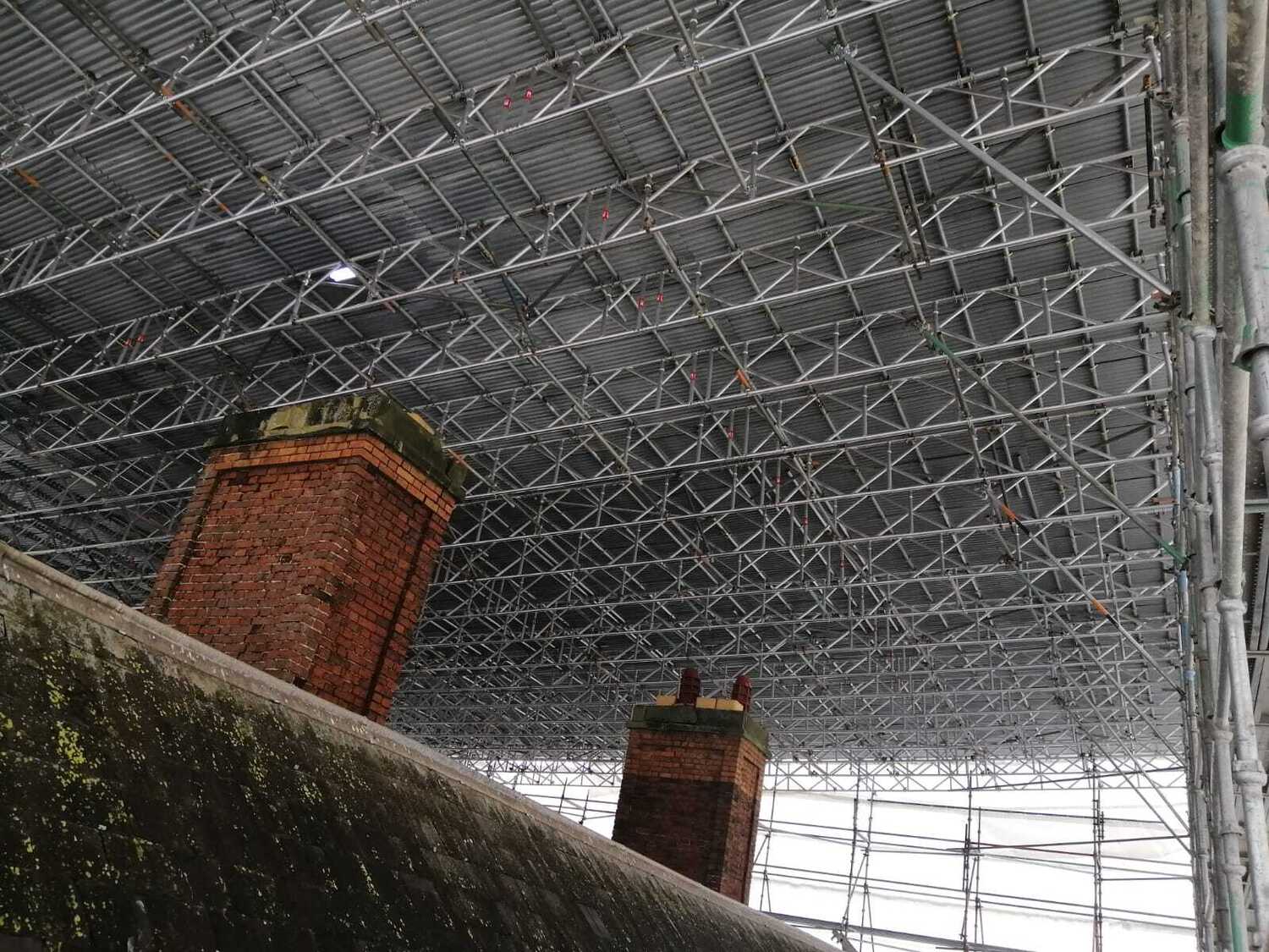 Portway Scaffolding has been tasked to provide a high level access platform to the underside of an atrium on a new prestigious head office building. The design is complicated due to the differing depths of ring beam steel, so in one area the 750mm beams are connected directly to the underside of the steel frame, in other area they are connected to scaffold tube, hung from the underside of the steel frame. The design has had to take into account the reduced capacity of the steel frame. Temporary access scaffold has been erected to the perimeter of the atrium one level below the roof with a 5 board wide cantilever, so that our scaffolders can walk the beams through and connect them to their final fixing point. Due to the reduced loadings of the ground slab, we are using a JLG x25 to act as
