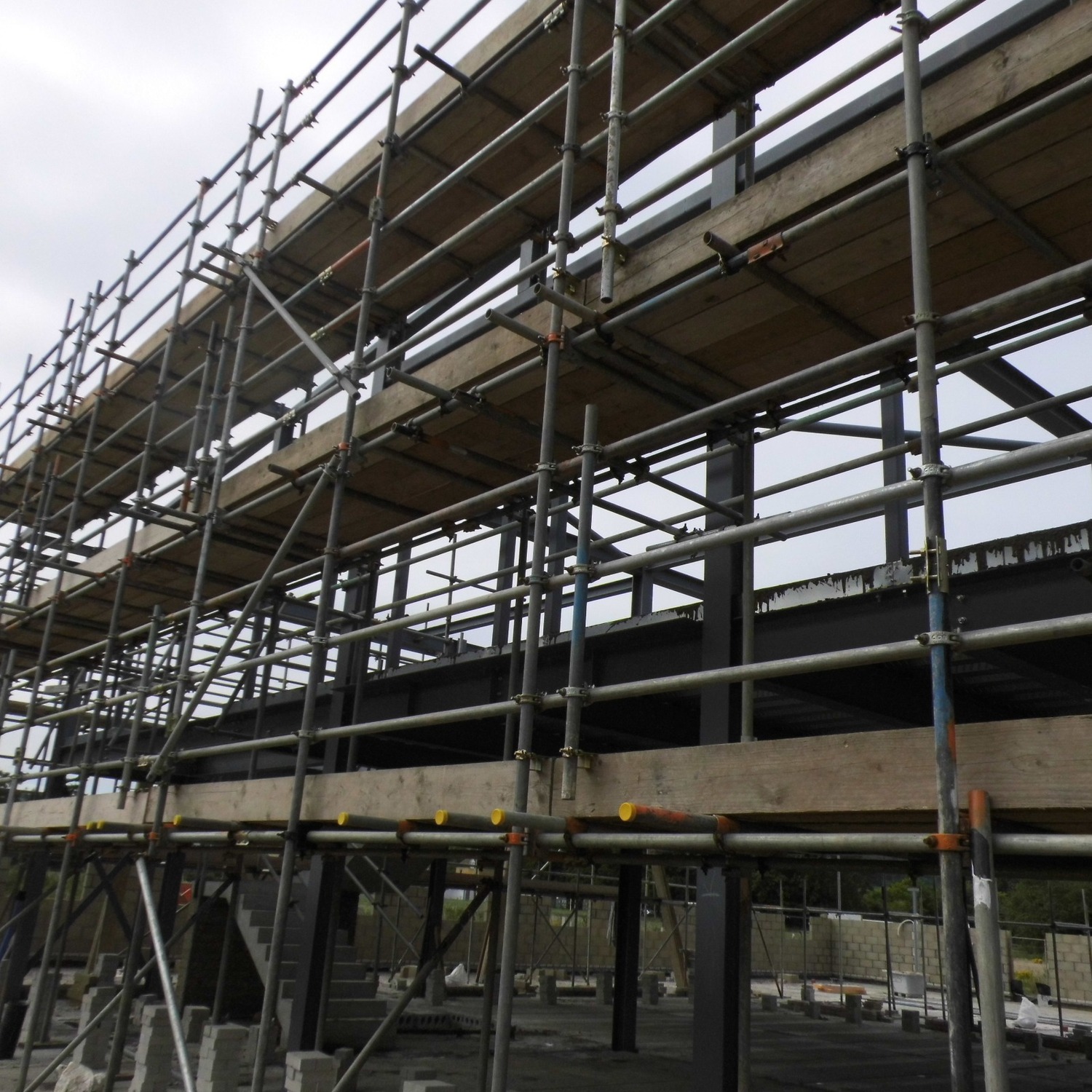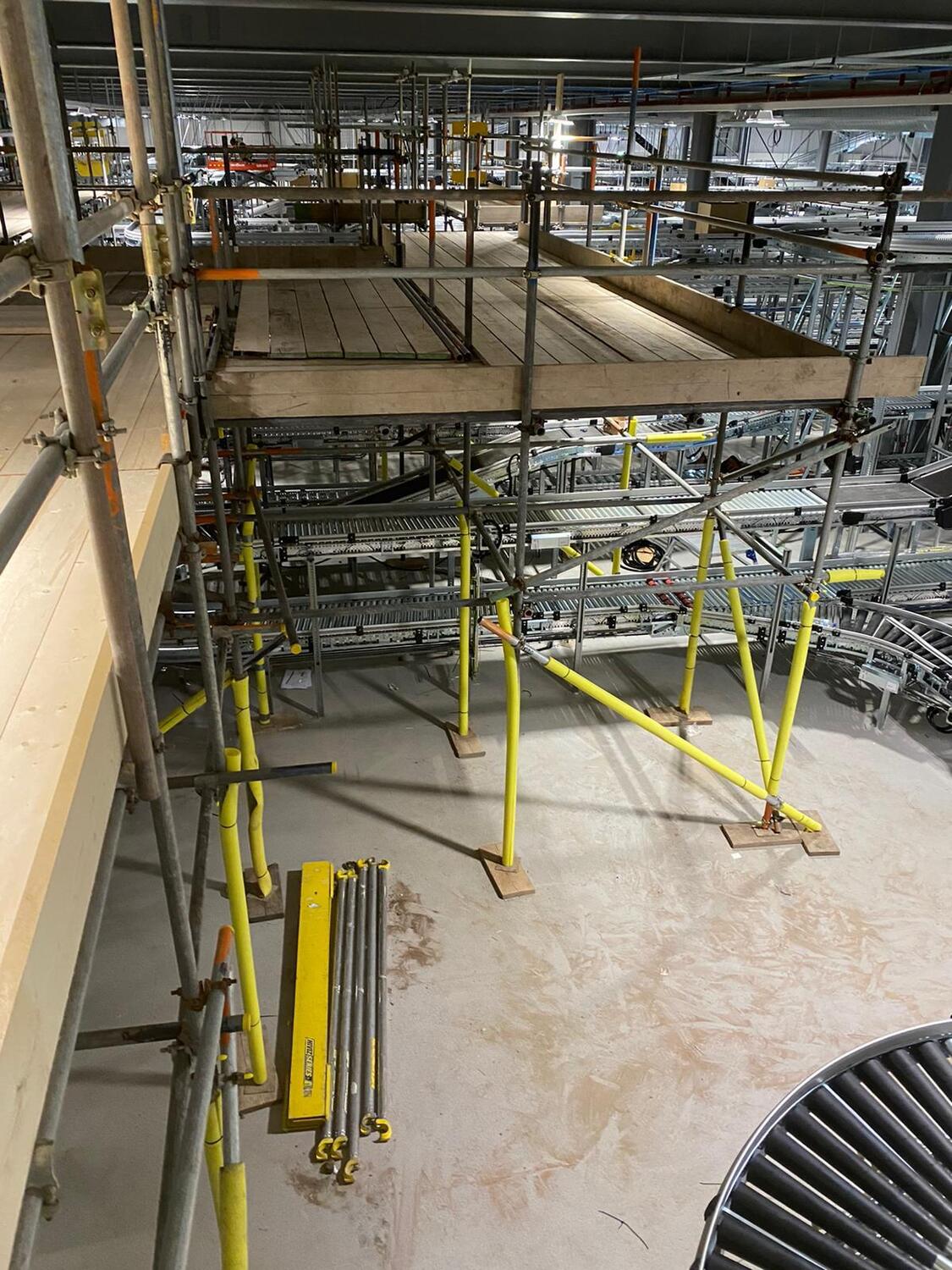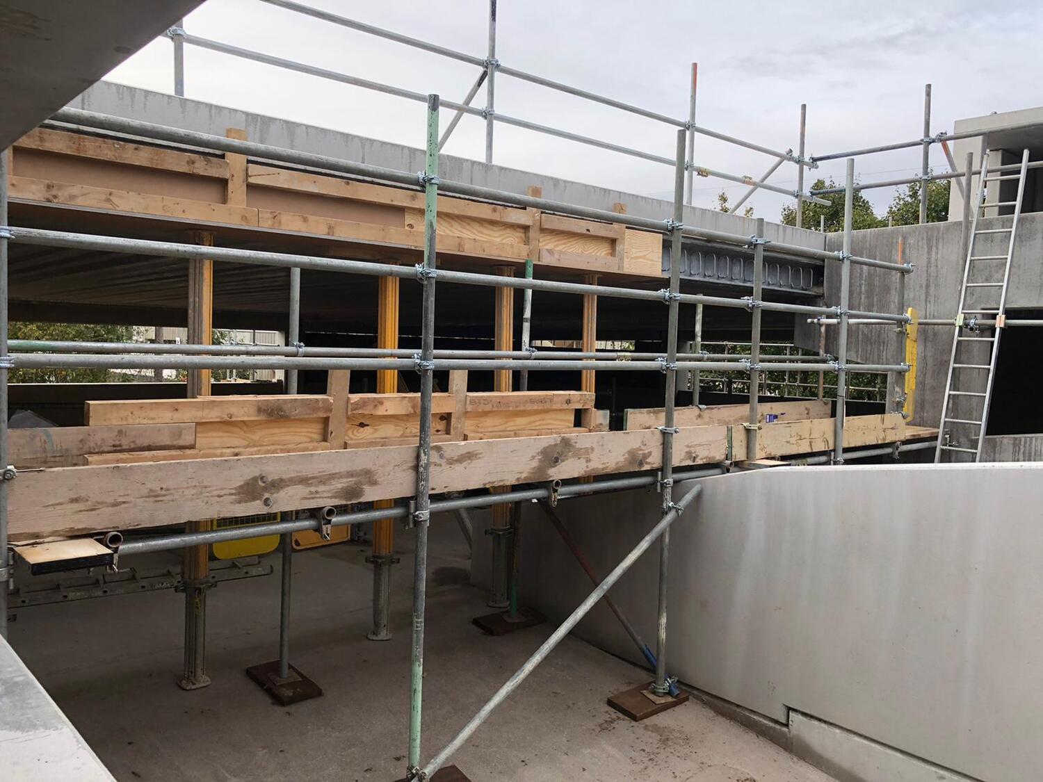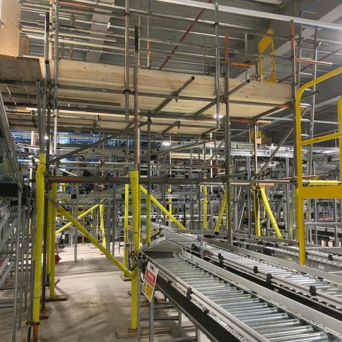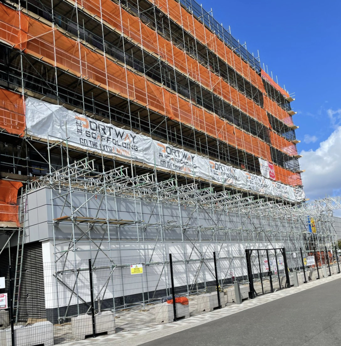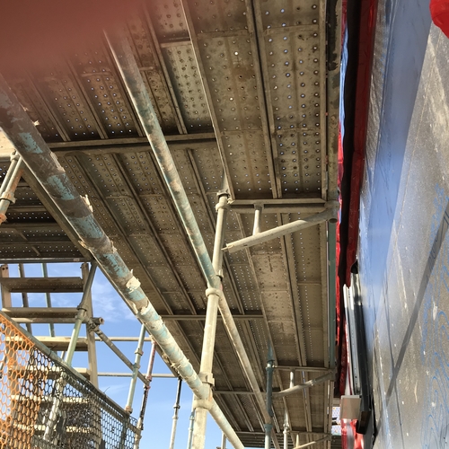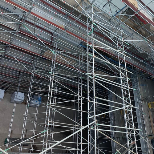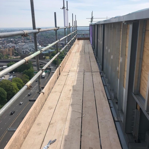 Portway Scaffolding has been tasked to provide a high level access platform to the underside of an atrium on a new prestigious head office building. The design is complicated due to the differing depths of ring beam steel, so in one area the 750mm beams are connected directly to the underside of the steel frame, in other area they are connected to scaffold tube, hung from the underside of the steel frame. The design has had to take into account the reduced capacity of the steel frame. Temporary access scaffold has been erected to the perimeter of the atrium one level below the roof with a 5 board wide cantilever, so that our scaffolders can walk the beams through and connect them to their final fixing point. Due to the reduced loadings of the ground slab, we are using a JLG x25 to act as