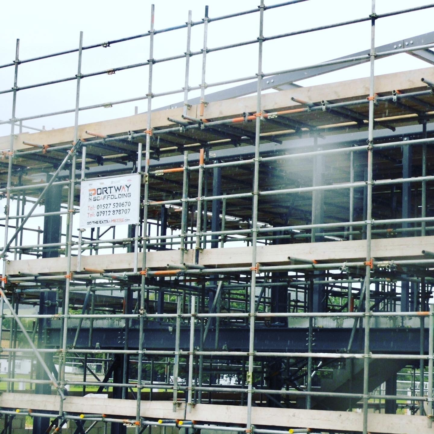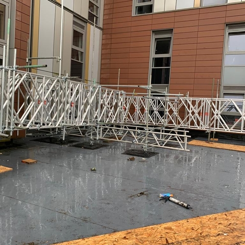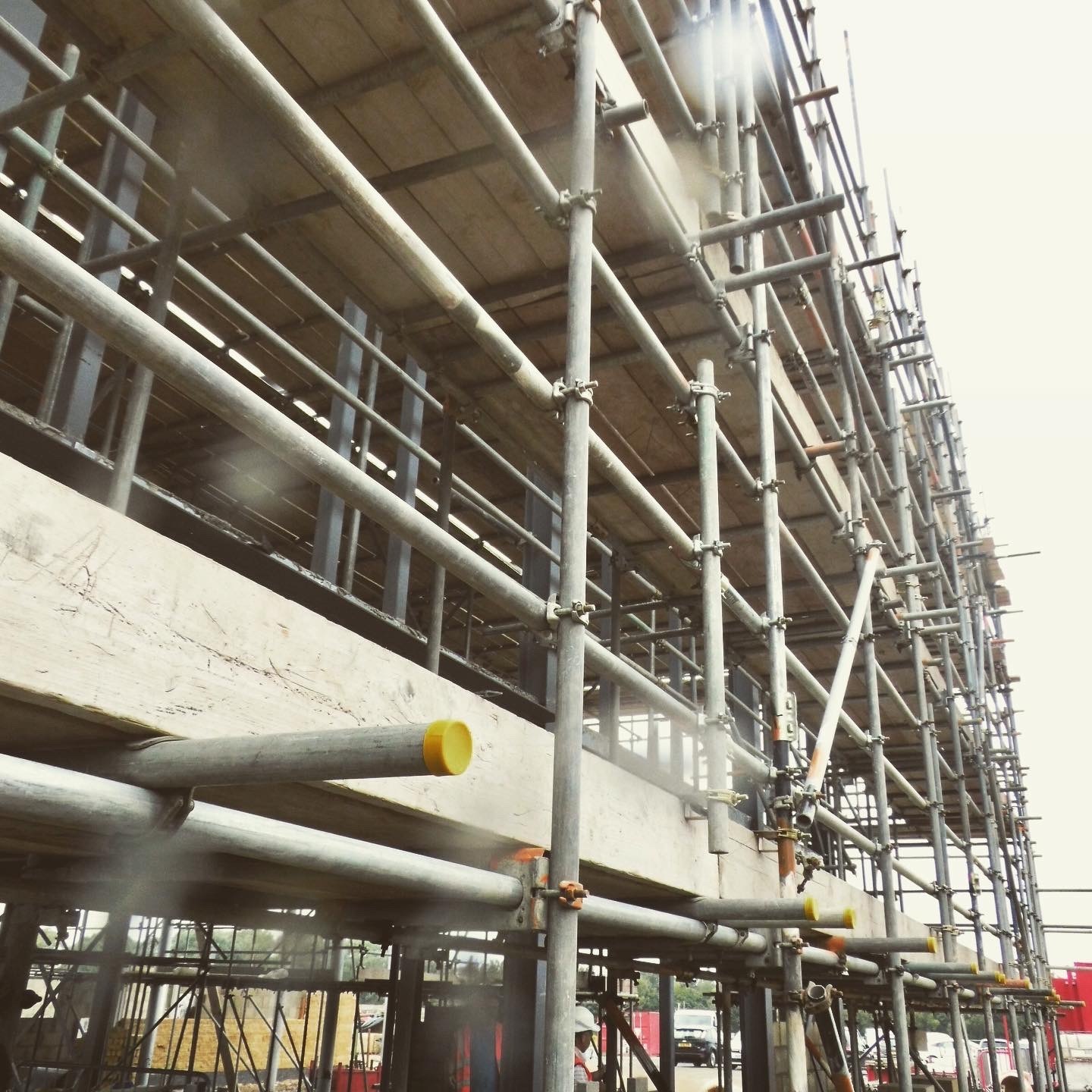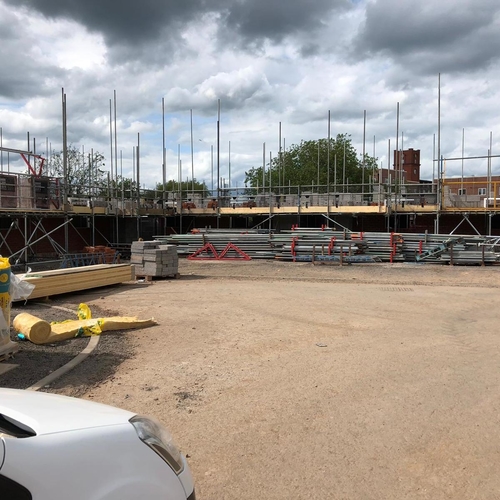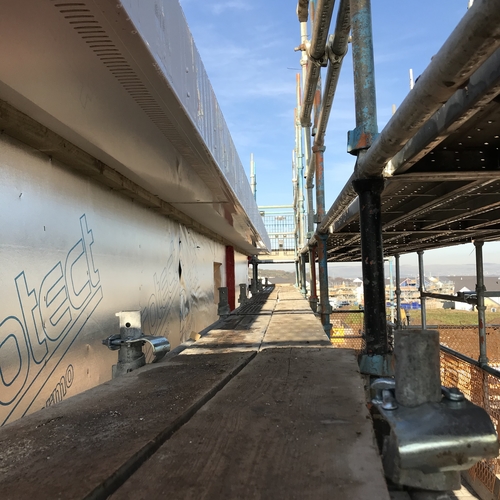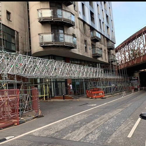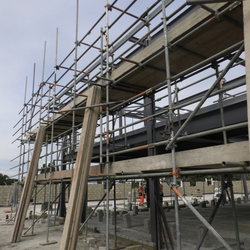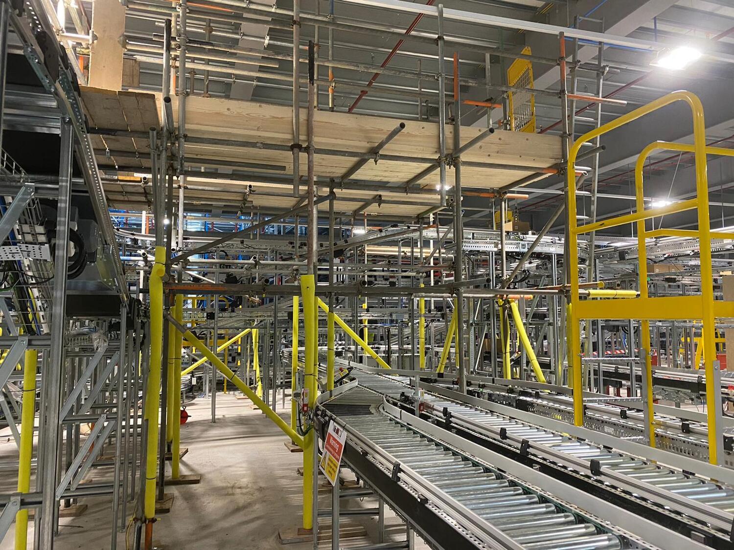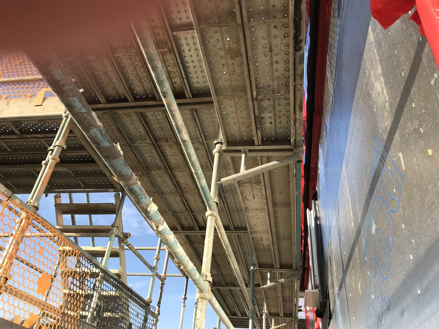 Portway Scaffolding has been tasked to provide a high level access platform to the underside of an atrium on a new prestigious head office building. The design is complicated due to the differing depths of ring beam steel, so in one area the 750mm beams are connected directly to the underside of the steel frame, in other area they are connected to scaffold tube, hung from the underside of the steel frame. The design has had to take into account the reduced capacity of the steel frame. Temporary access scaffold has been erected to the perimeter of the atrium one level below the roof with a 5 board wide cantilever, so that our scaffolders can walk the beams through and connect them to their final fixing point. Due to the reduced loadings of the ground slab, we are using a JLG x25 to act as