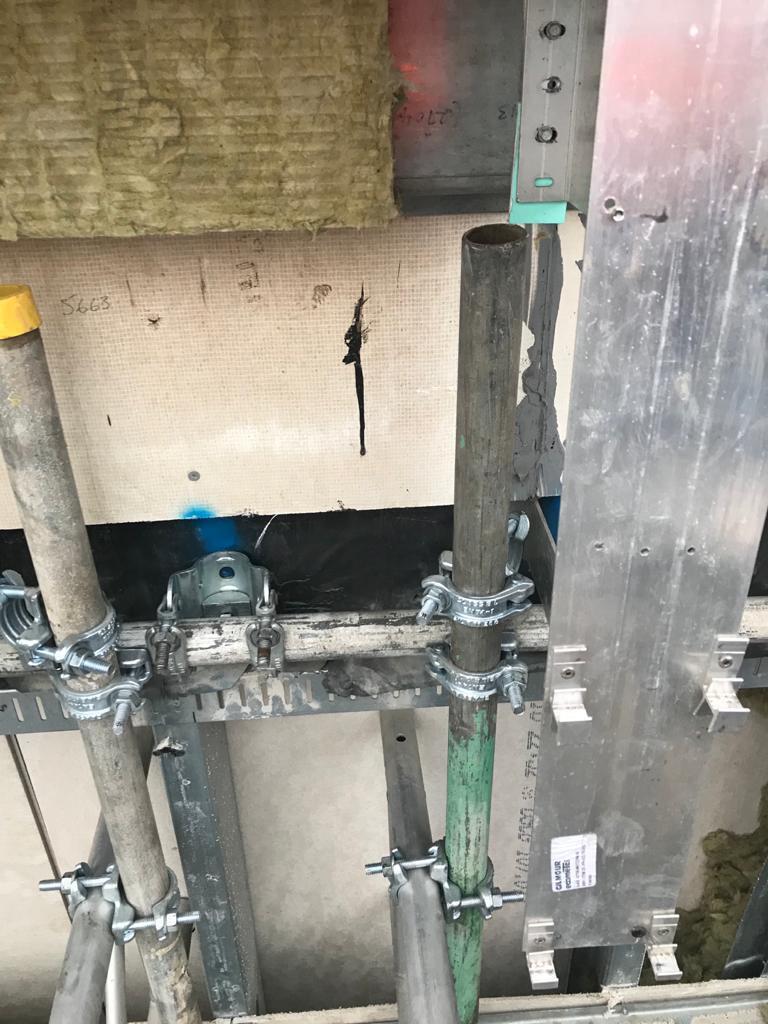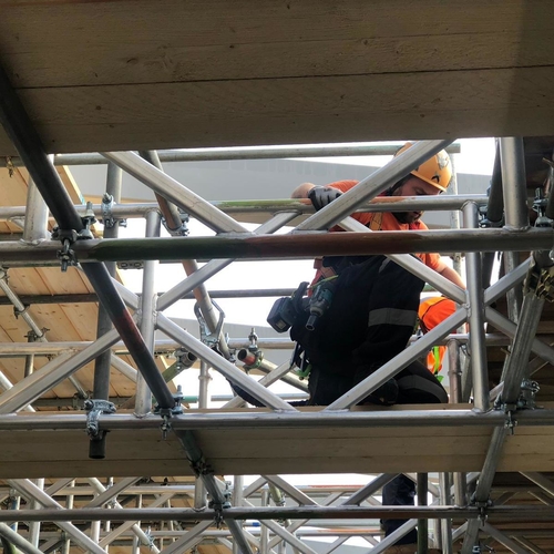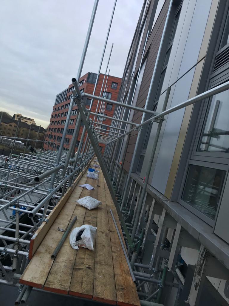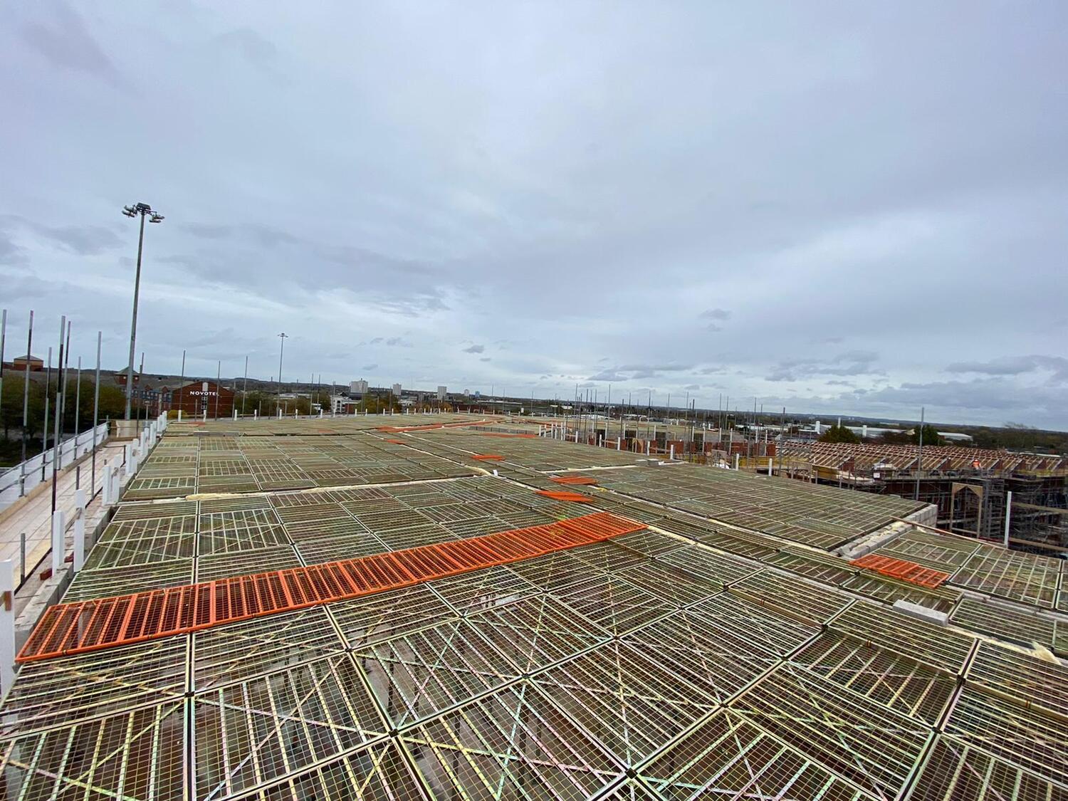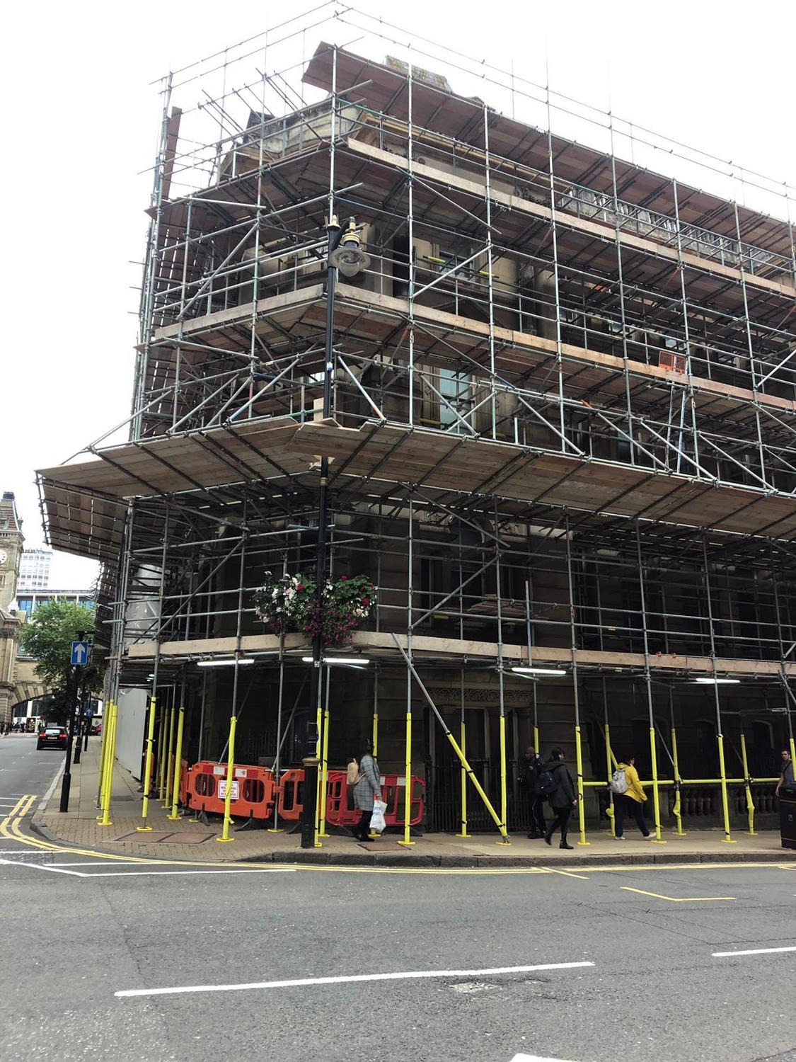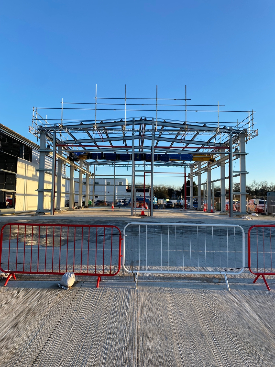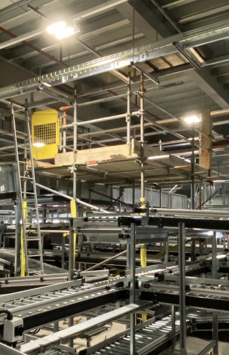 Portway Scaffolding has been tasked to provide a high level access platform to the underside of an atrium on a new prestigious head office building. The design is complicated due to the differing depths of ring beam steel, so in one area the 750mm beams are connected directly to the underside of the steel frame, in other area they are connected to scaffold tube, hung from the underside of the steel frame. The design has had to take into account the reduced capacity of the steel frame. Temporary access scaffold has been erected to the perimeter of the atrium one level below the roof with a 5 board wide cantilever, so that our scaffolders can walk the beams through and connect them to their final fixing point. Due to the reduced loadings of the ground slab, we are using a JLG x25 to act as