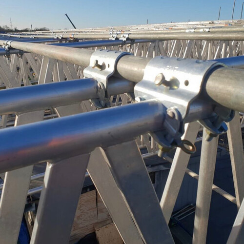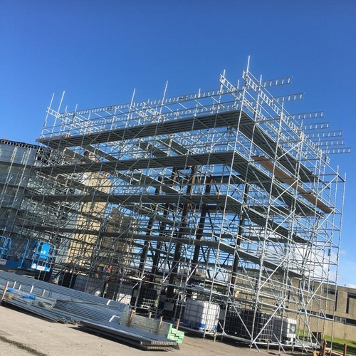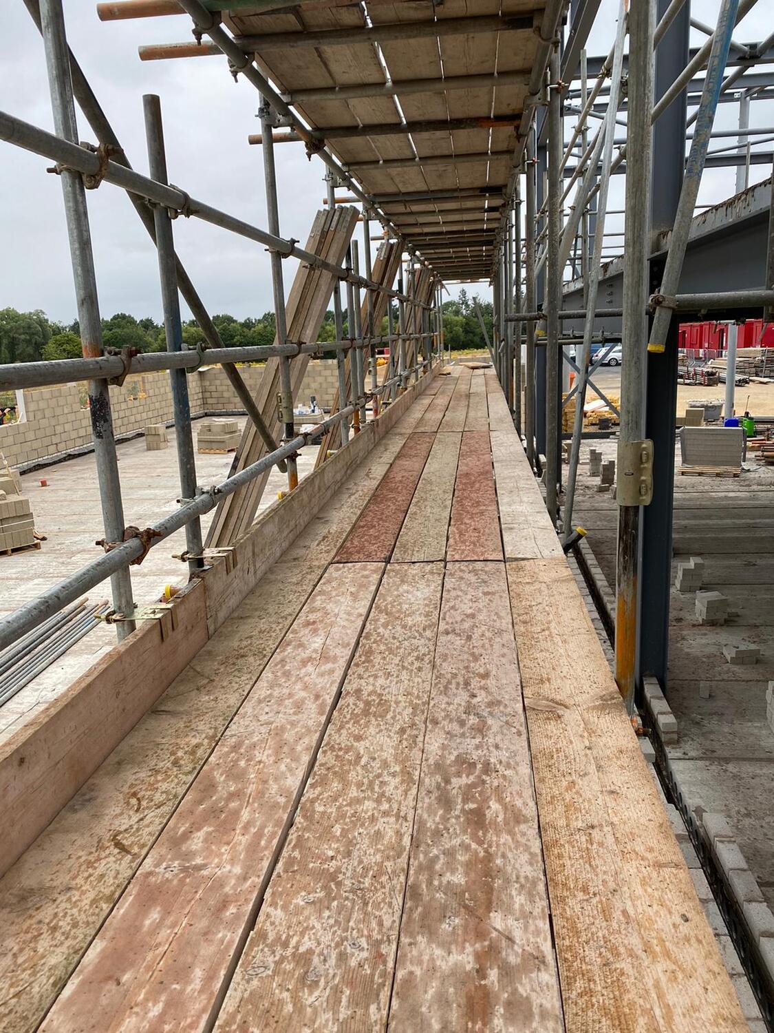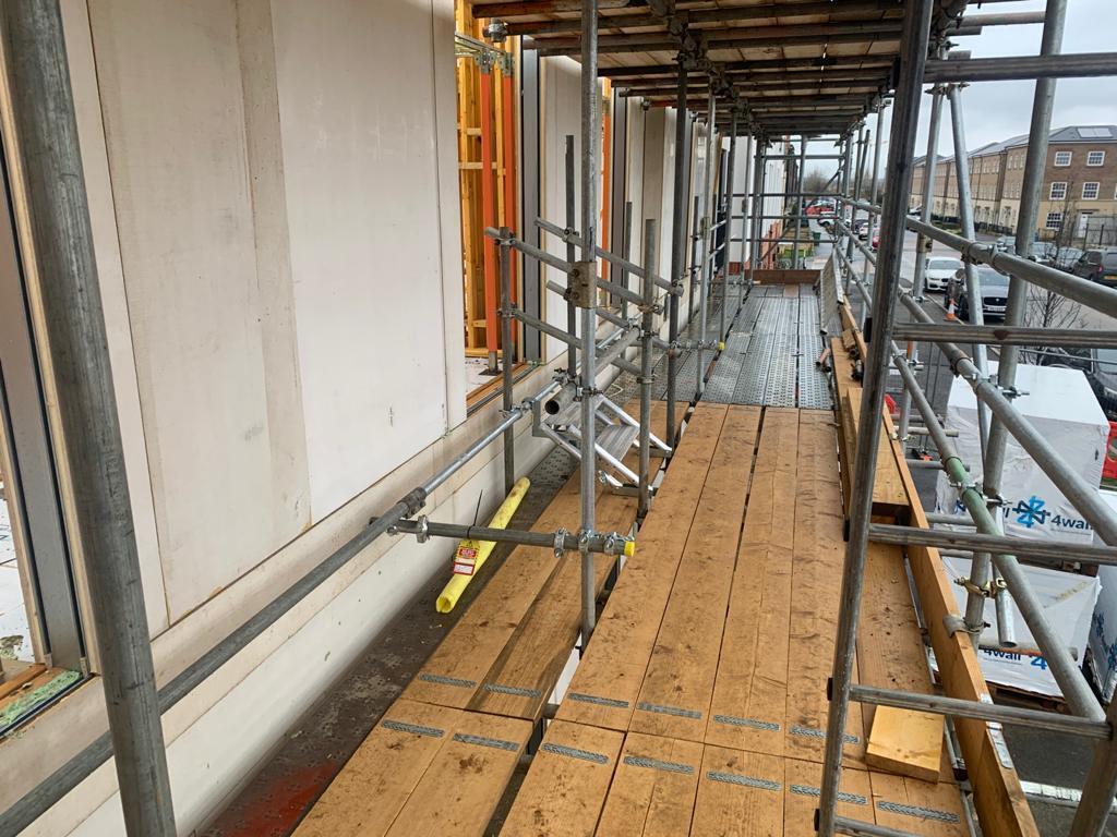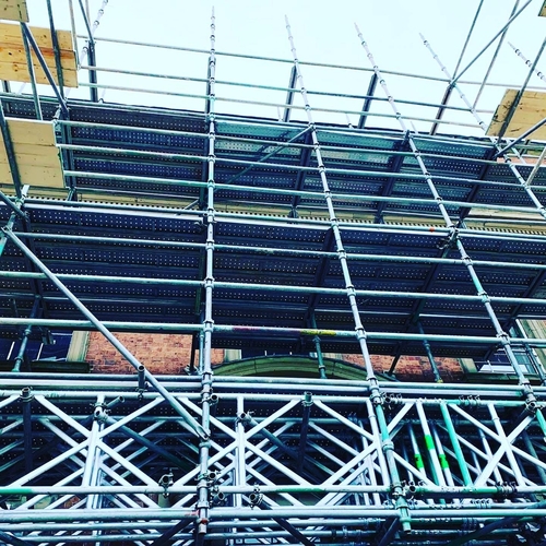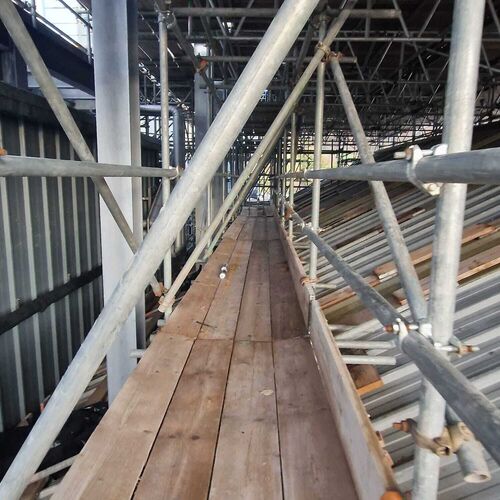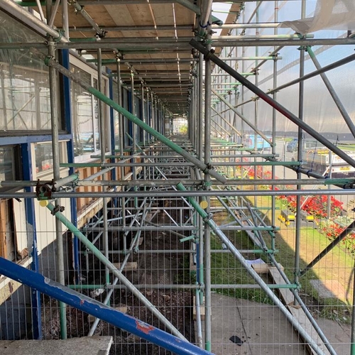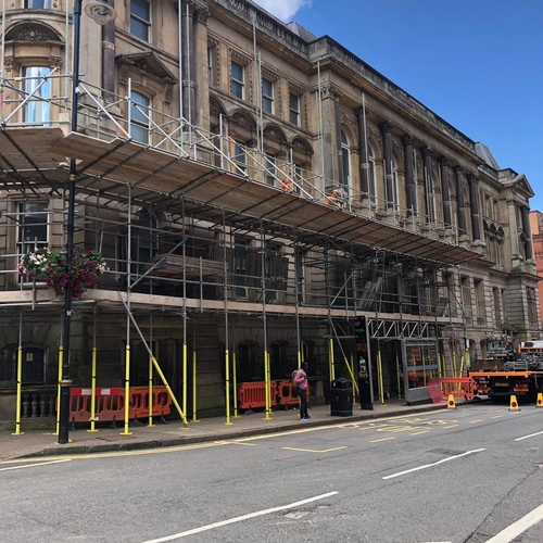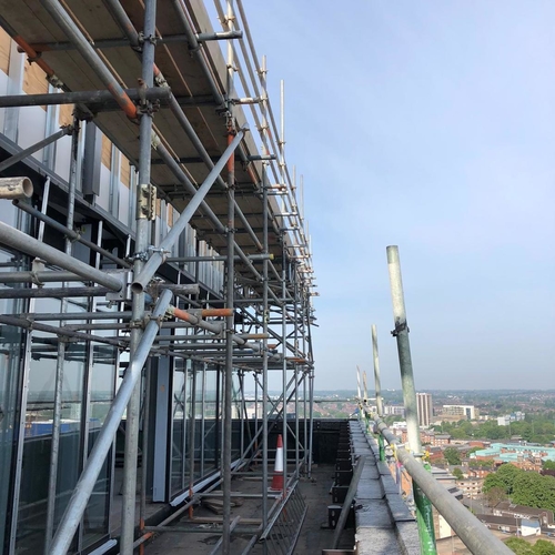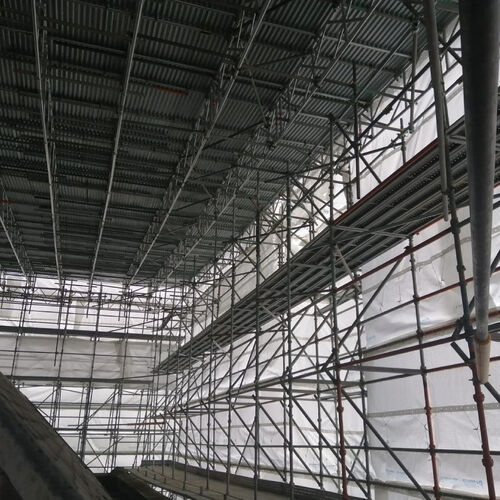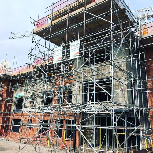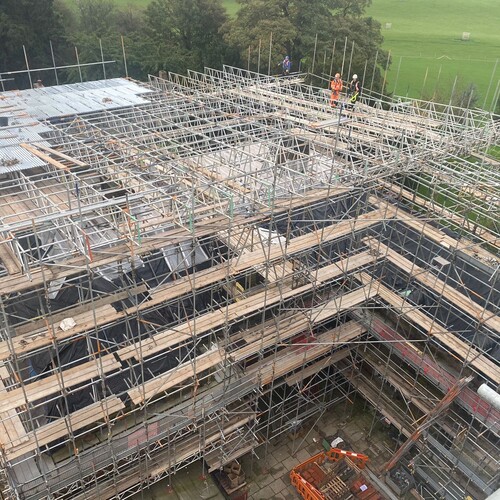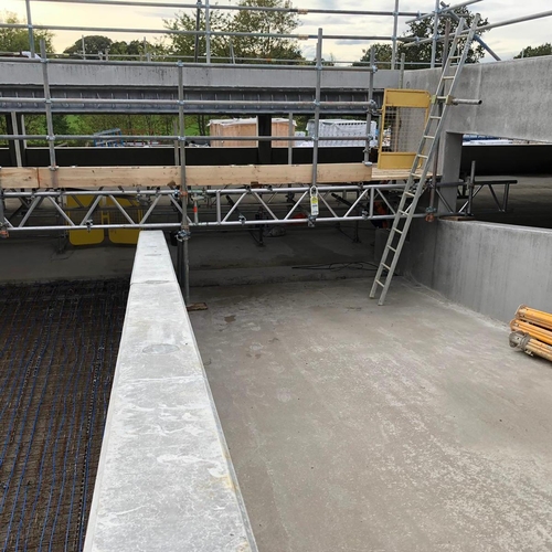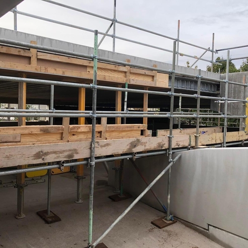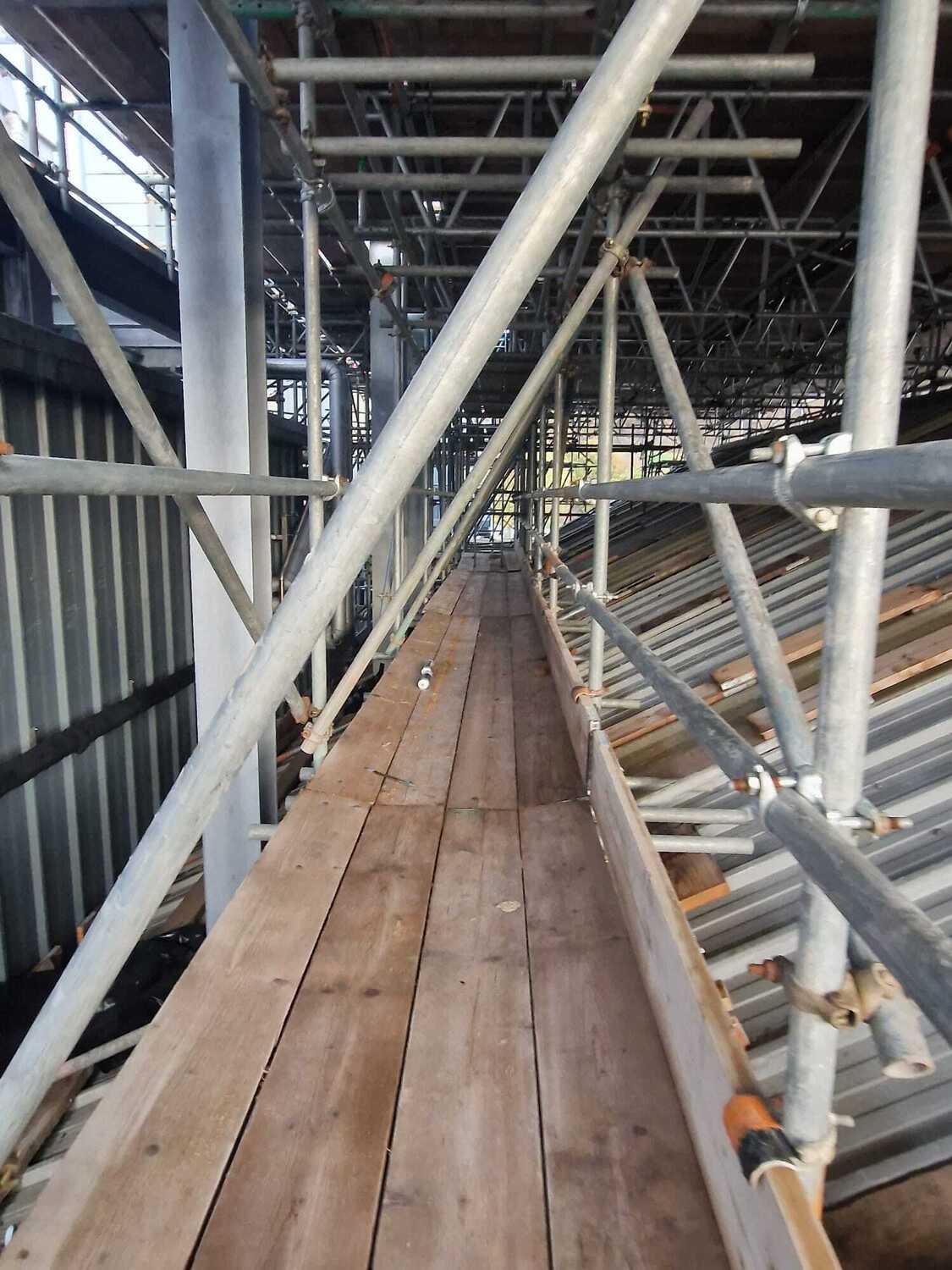 Portway Scaffolding has been tasked to provide a high level access platform to the underside of an atrium on a new prestigious head office building. The design is complicated due to the differing depths of ring beam steel, so in one area the 750mm beams are connected directly to the underside of the steel frame, in other area they are connected to scaffold tube, hung from the underside of the steel frame. The design has had to take into account the reduced capacity of the steel frame. Temporary access scaffold has been erected to the perimeter of the atrium one level below the roof with a 5 board wide cantilever, so that our scaffolders can walk the beams through and connect them to their final fixing point. Due to the reduced loadings of the ground slab, we are using a JLG x25 to act as