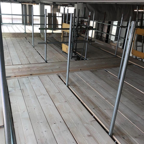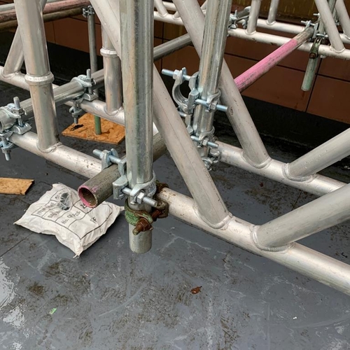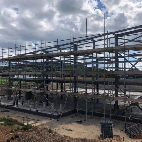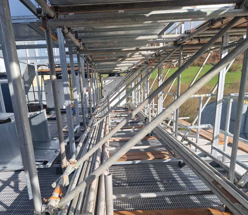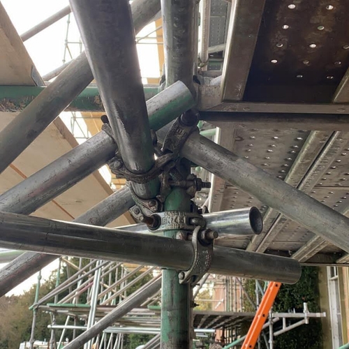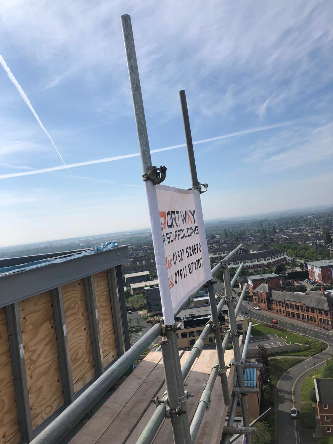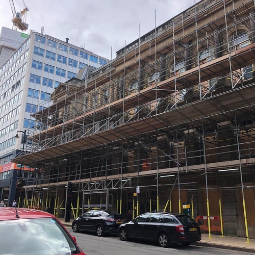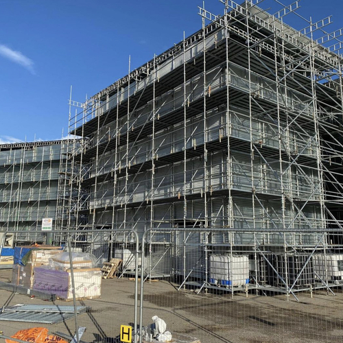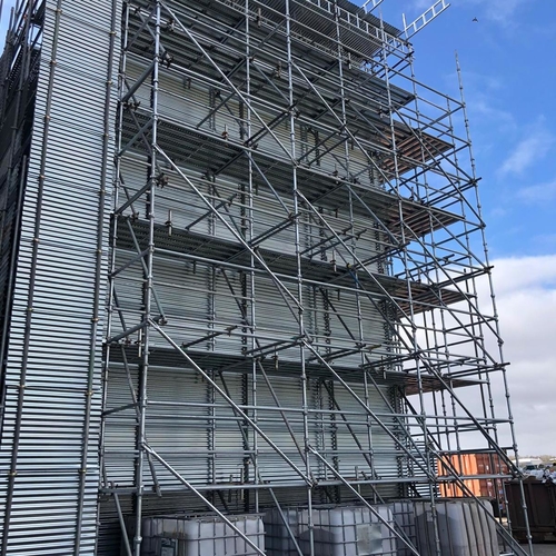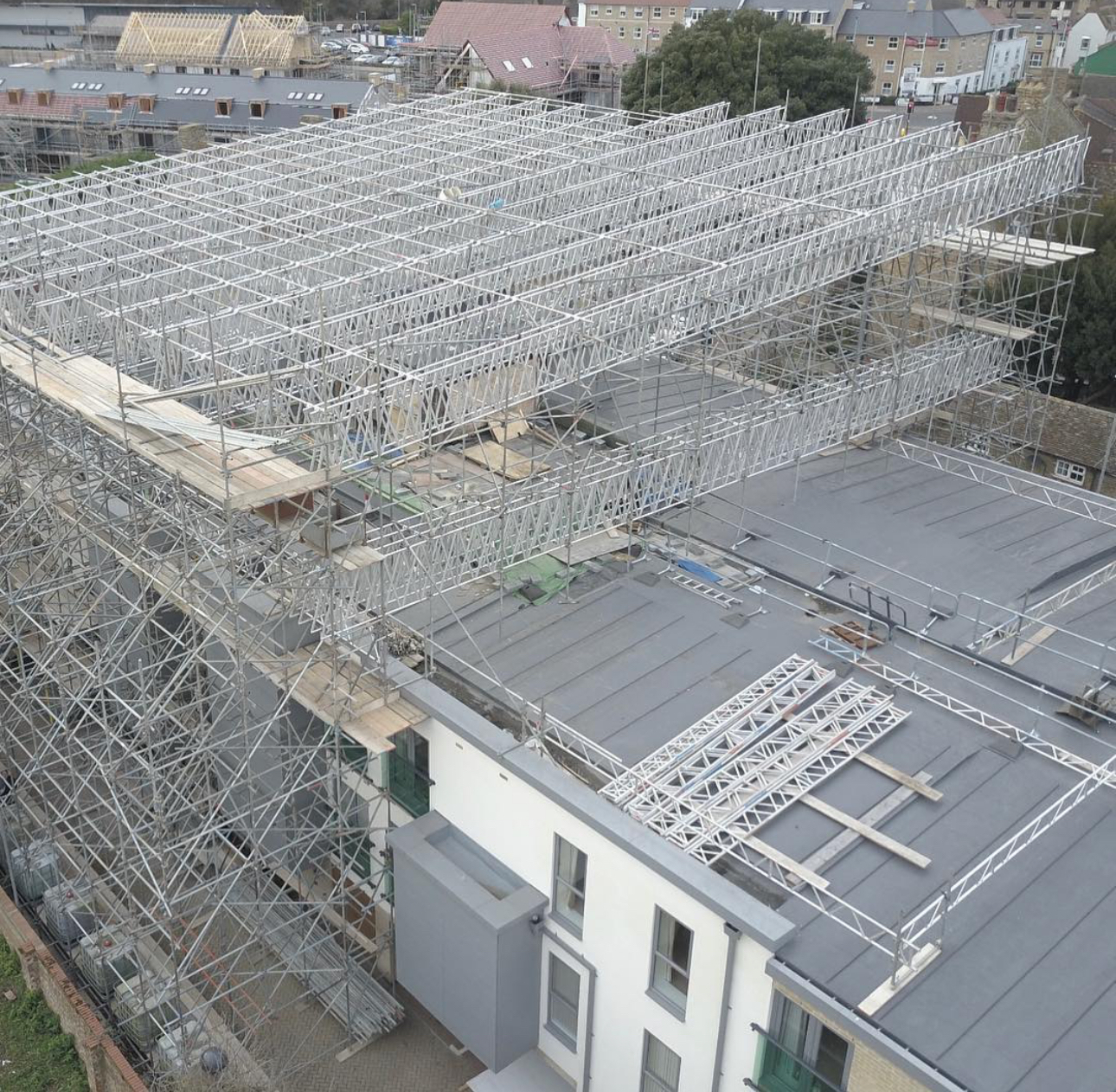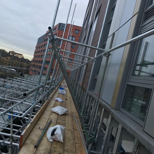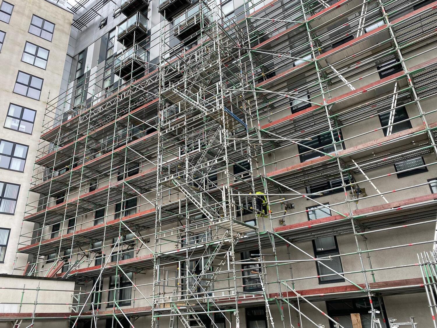 Portway Scaffolding has been tasked to provide a high level access platform to the underside of an atrium on a new prestigious head office building. The design is complicated due to the differing depths of ring beam steel, so in one area the 750mm beams are connected directly to the underside of the steel frame, in other area they are connected to scaffold tube, hung from the underside of the steel frame. The design has had to take into account the reduced capacity of the steel frame. Temporary access scaffold has been erected to the perimeter of the atrium one level below the roof with a 5 board wide cantilever, so that our scaffolders can walk the beams through and connect them to their final fixing point. Due to the reduced loadings of the ground slab, we are using a JLG x25 to act as
