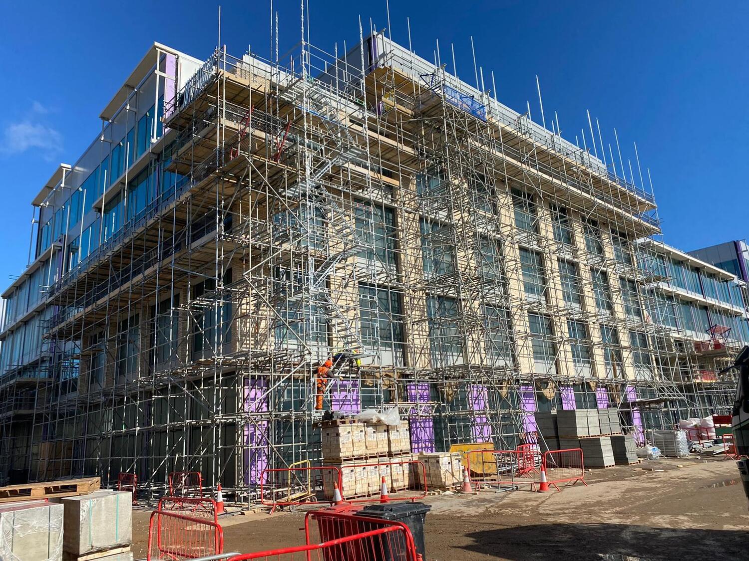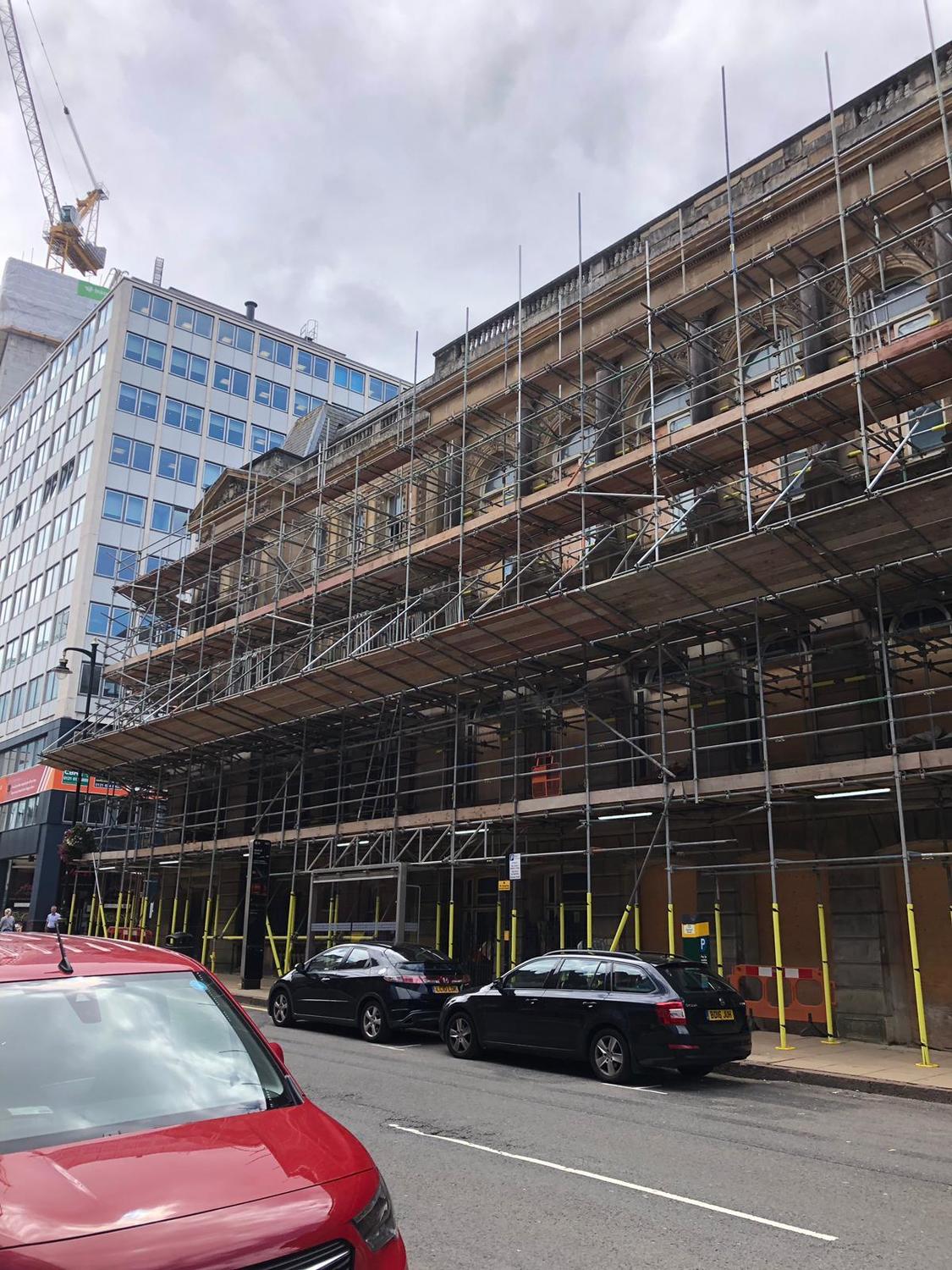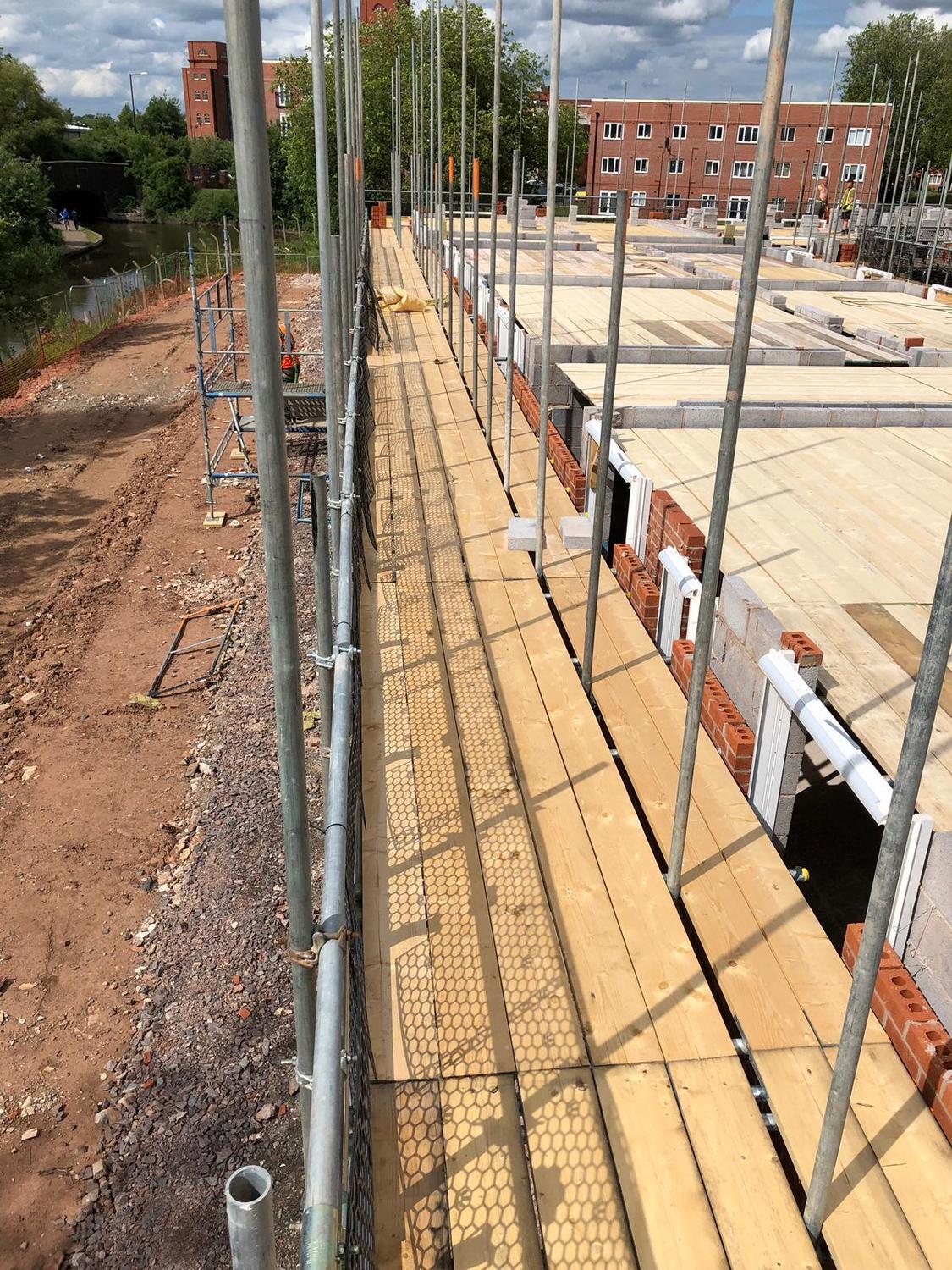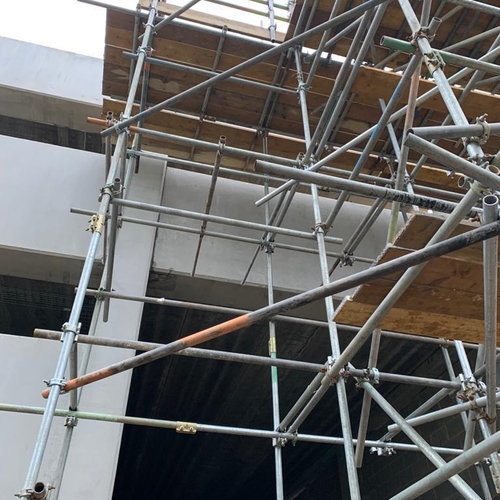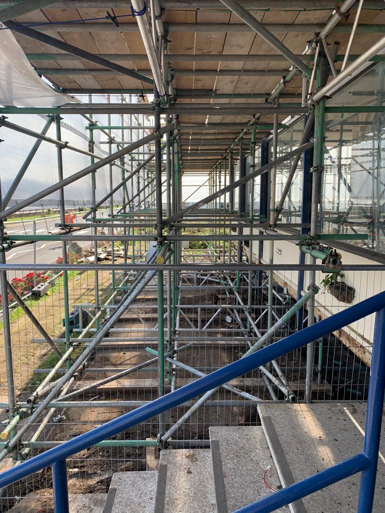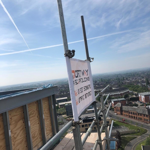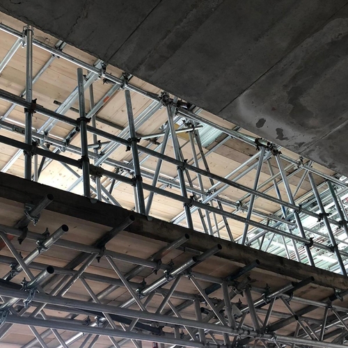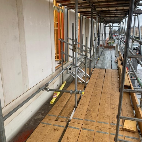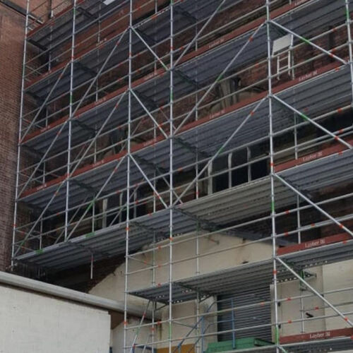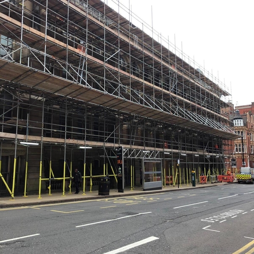Portway Scaffolding has been tasked to provide a high level access platform to the underside of an atrium on a new prestigious head office building. The design is complicated due to the differing depths of ring beam steel, so in one area the 750mm beams are connected directly to the underside of the steel frame, in other area they are connected to scaffold tube, hung from the underside of the steel frame. The design has had to take into account the reduced capacity of the steel frame. Temporary access scaffold has been erected to the perimeter of the atrium one level below the roof with a 5 board wide cantilever, so that our scaffolders can walk the beams through and connect them to their final fixing point. Due to the reduced loadings of the ground slab, we are using a JLG x25 to act as