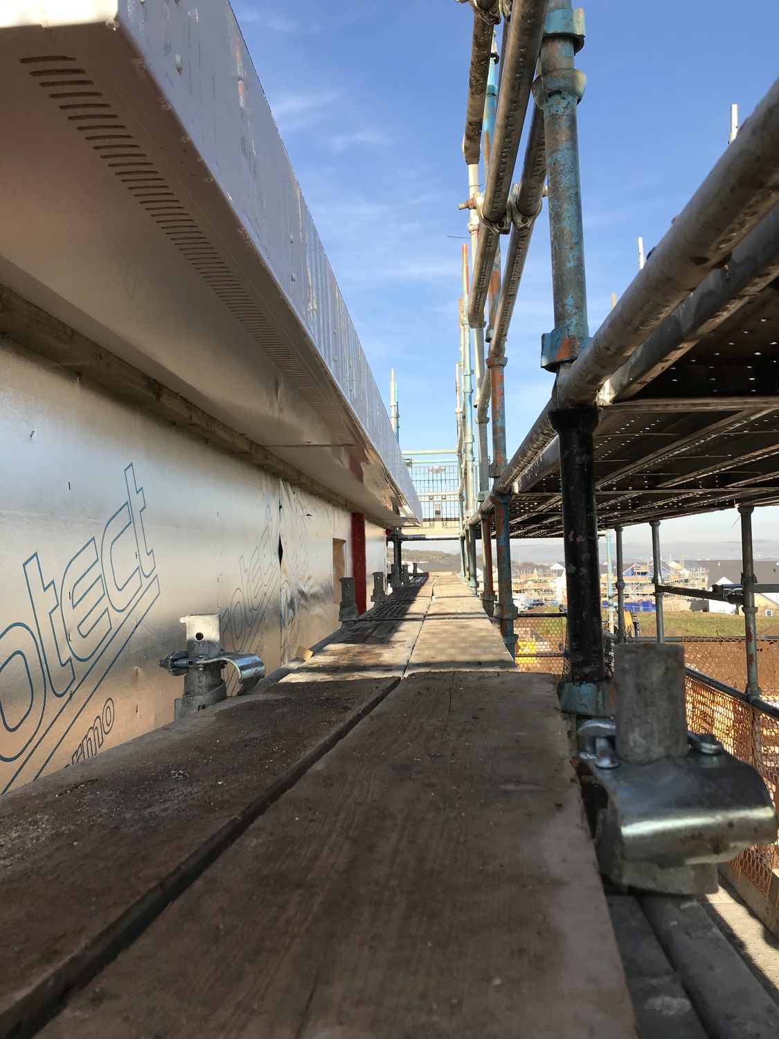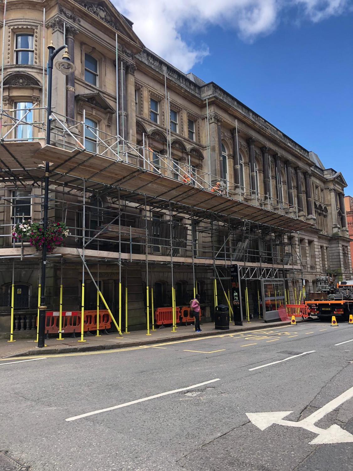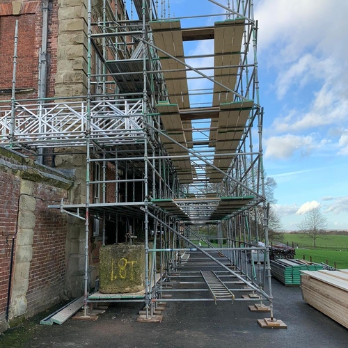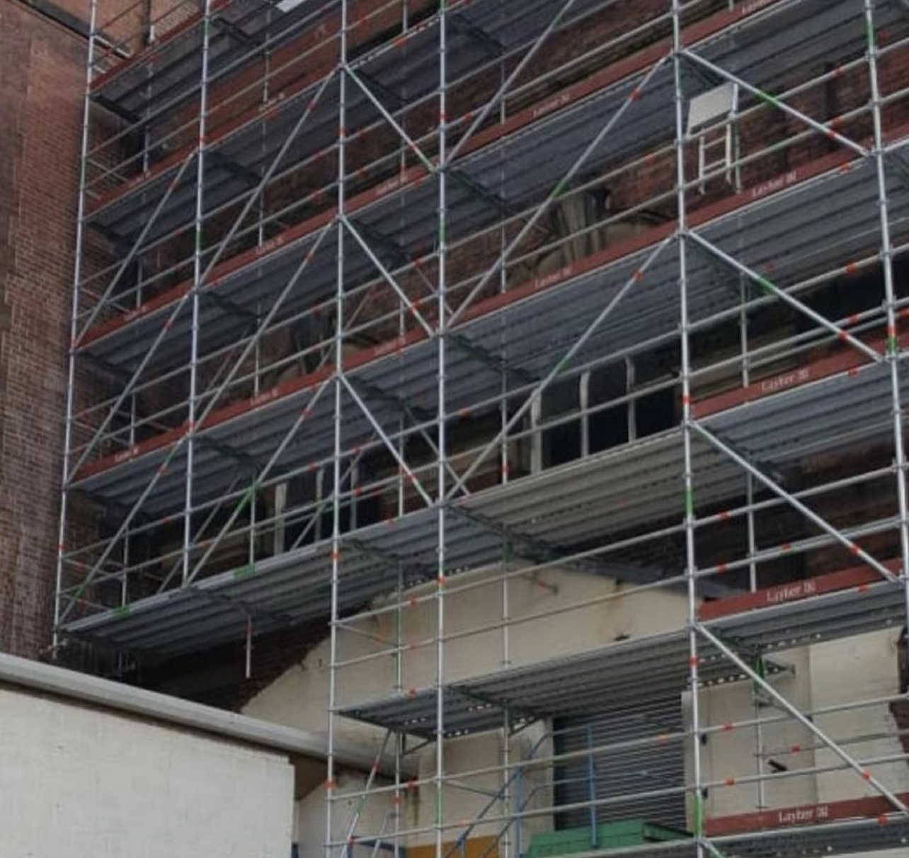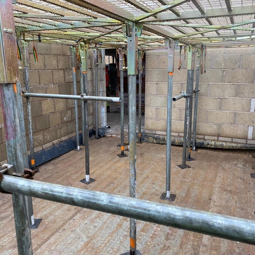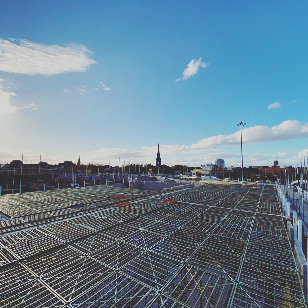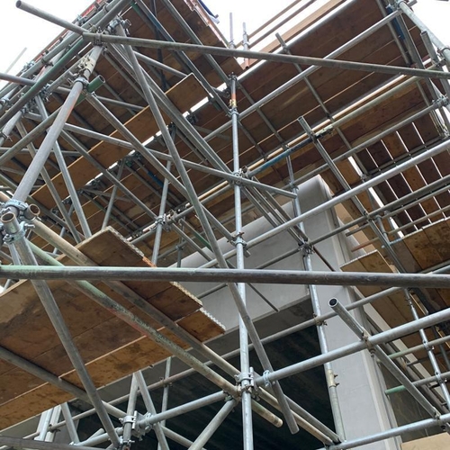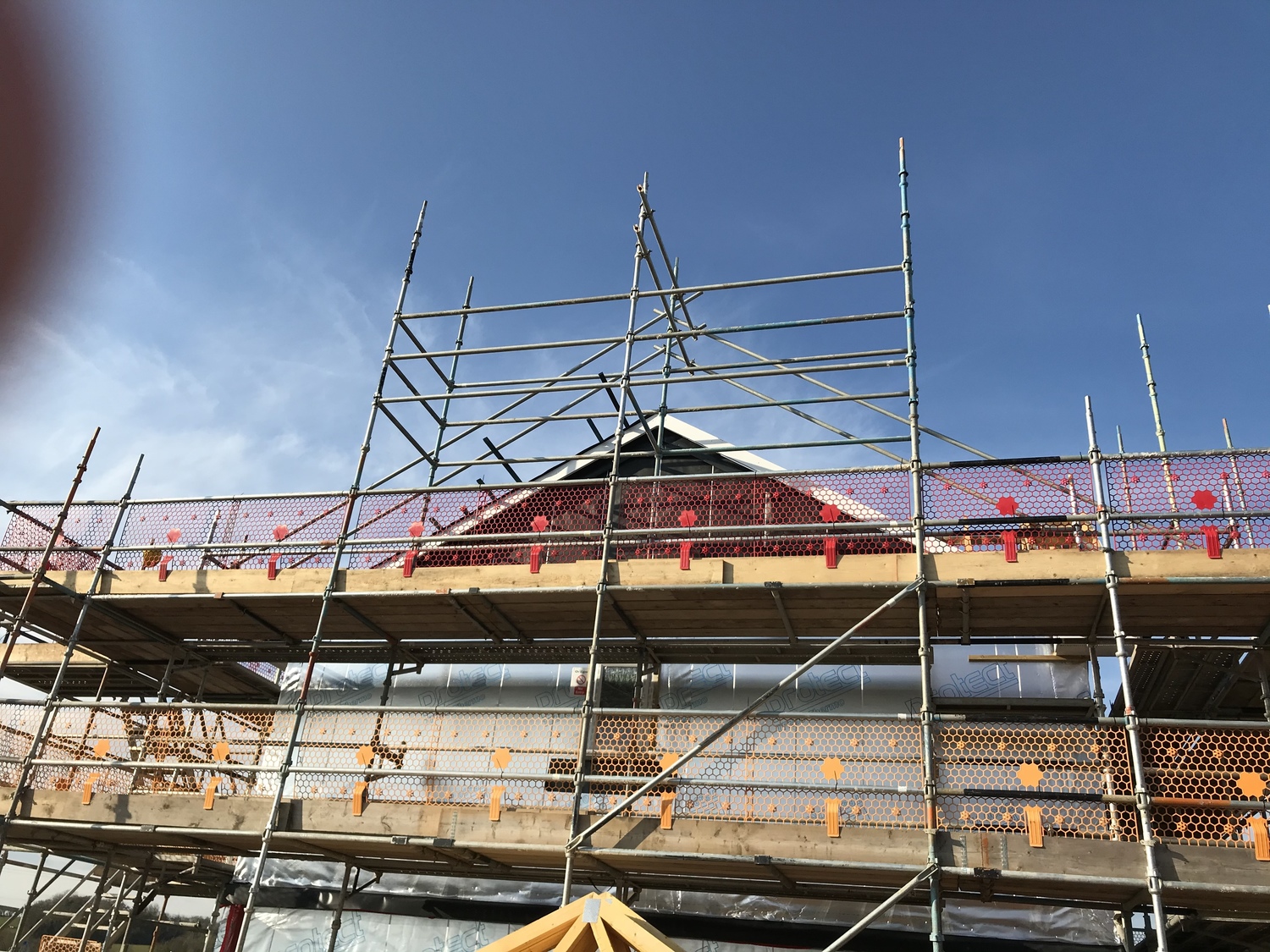 Portway Scaffolding has been tasked to provide a high level access platform to the underside of an atrium on a new prestigious head office building. The design is complicated due to the differing depths of ring beam steel, so in one area the 750mm beams are connected directly to the underside of the steel frame, in other area they are connected to scaffold tube, hung from the underside of the steel frame. The design has had to take into account the reduced capacity of the steel frame. Temporary access scaffold has been erected to the perimeter of the atrium one level below the roof with a 5 board wide cantilever, so that our scaffolders can walk the beams through and connect them to their final fixing point. Due to the reduced loadings of the ground slab, we are using a JLG x25 to act as