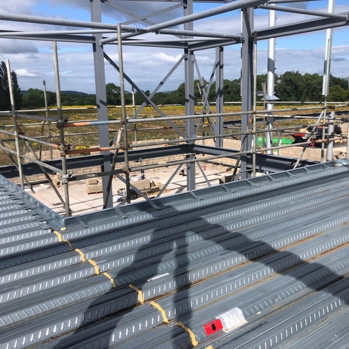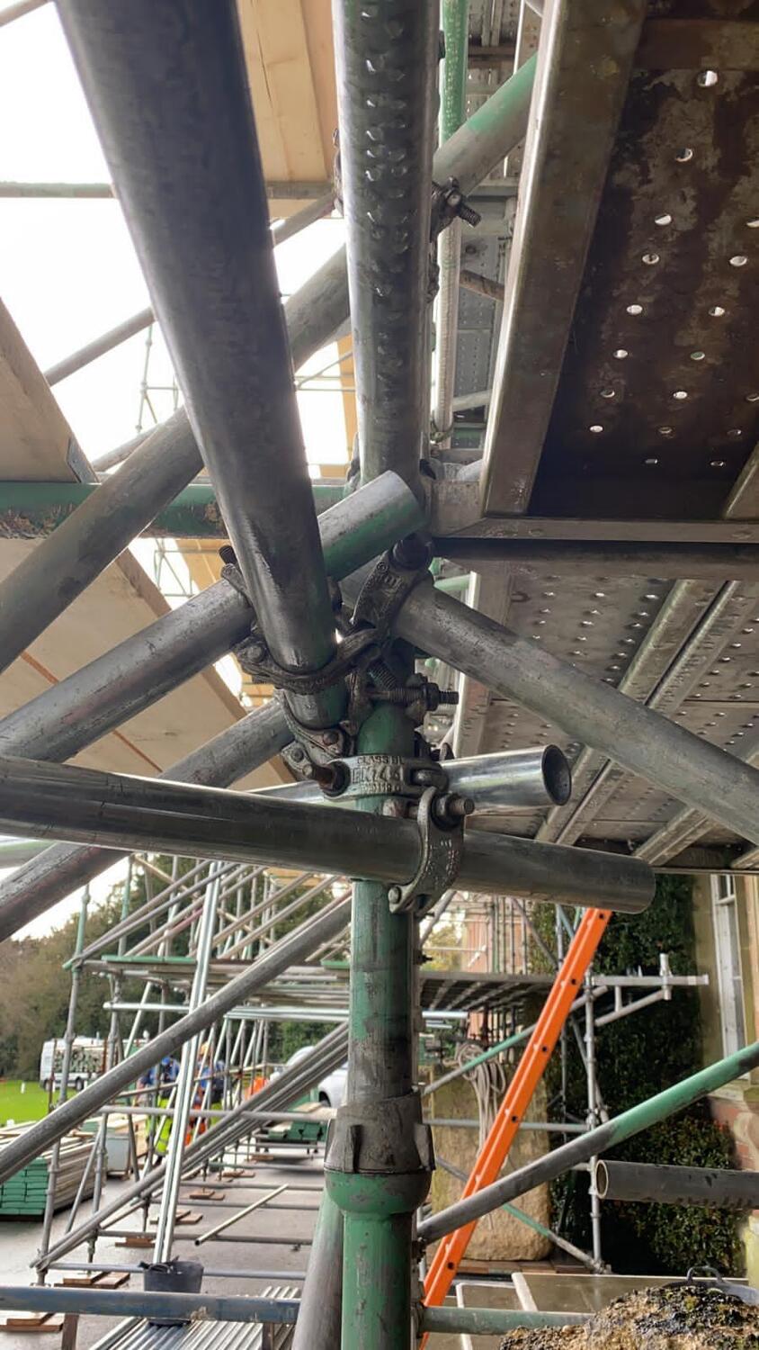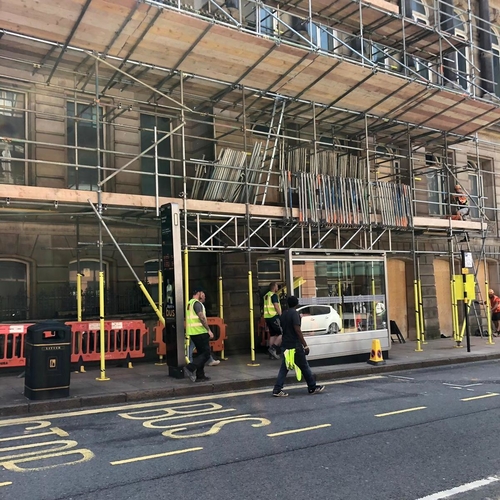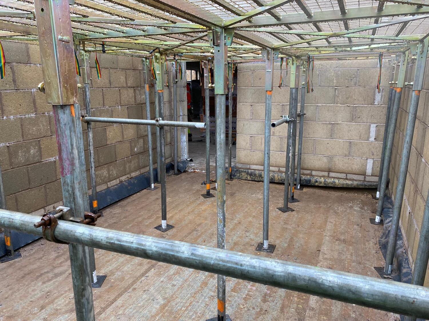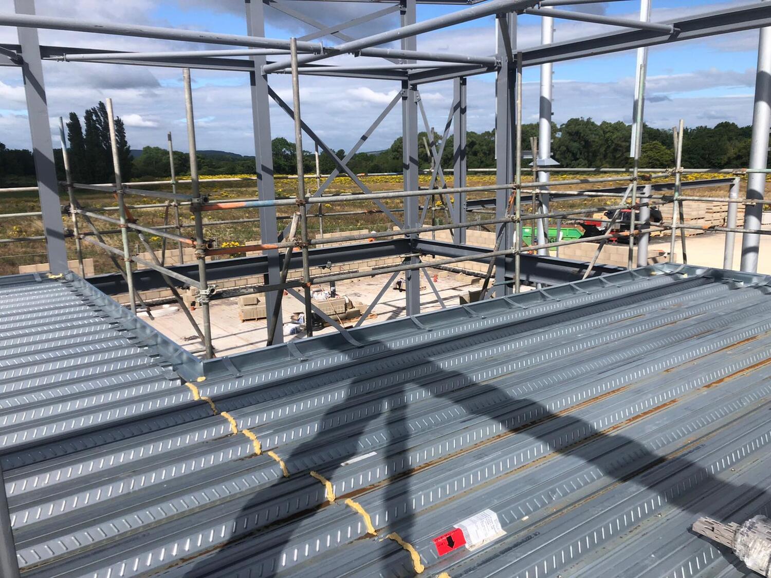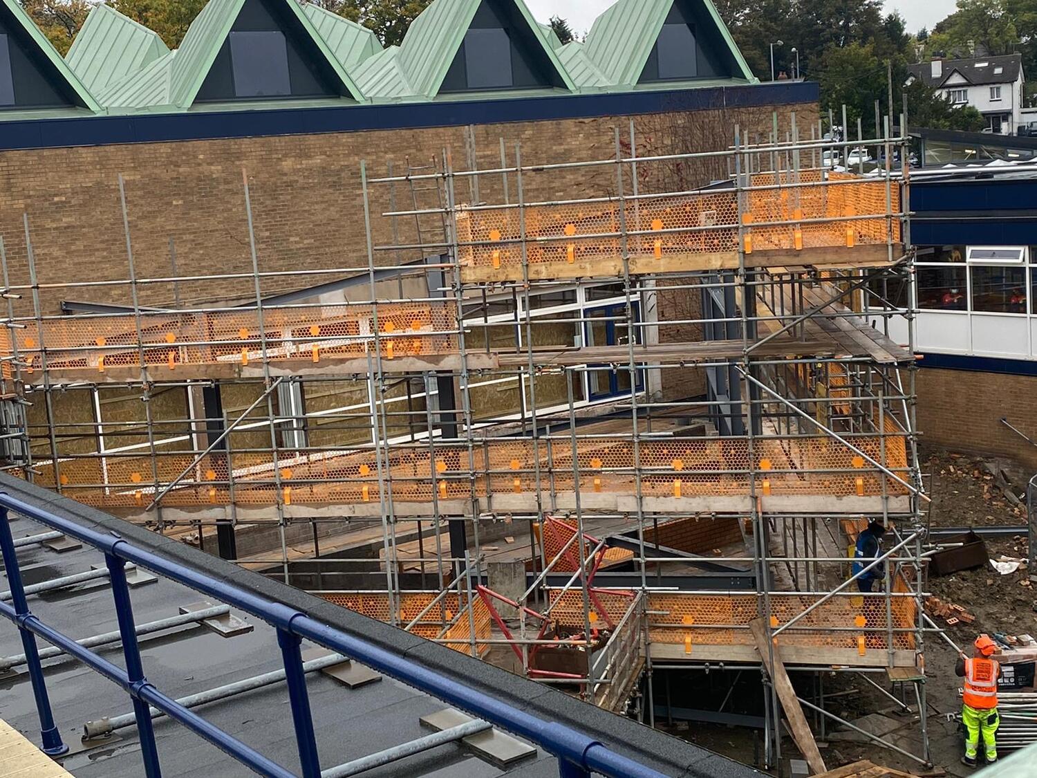 Portway Scaffolding has been tasked to provide a high level access platform to the underside of an atrium on a new prestigious head office building. The design is complicated due to the differing depths of ring beam steel, so in one area the 750mm beams are connected directly to the underside of the steel frame, in other area they are connected to scaffold tube, hung from the underside of the steel frame. The design has had to take into account the reduced capacity of the steel frame. Temporary access scaffold has been erected to the perimeter of the atrium one level below the roof with a 5 board wide cantilever, so that our scaffolders can walk the beams through and connect them to their final fixing point. Due to the reduced loadings of the ground slab, we are using a JLG x25 to act as