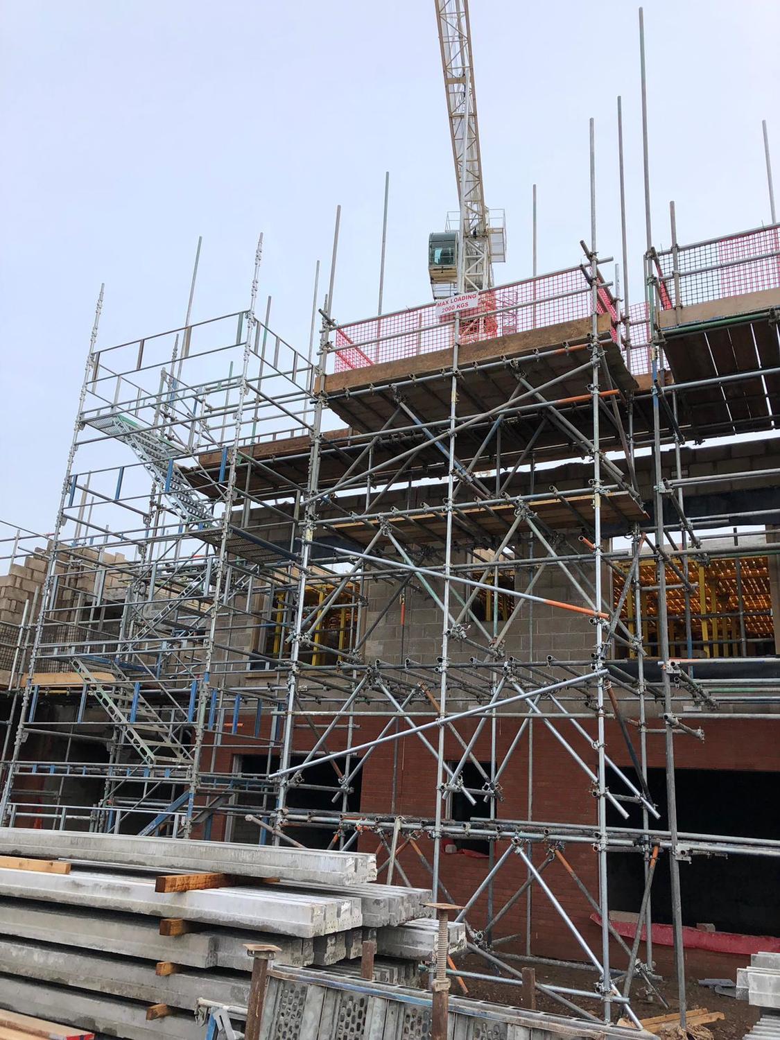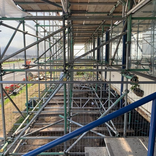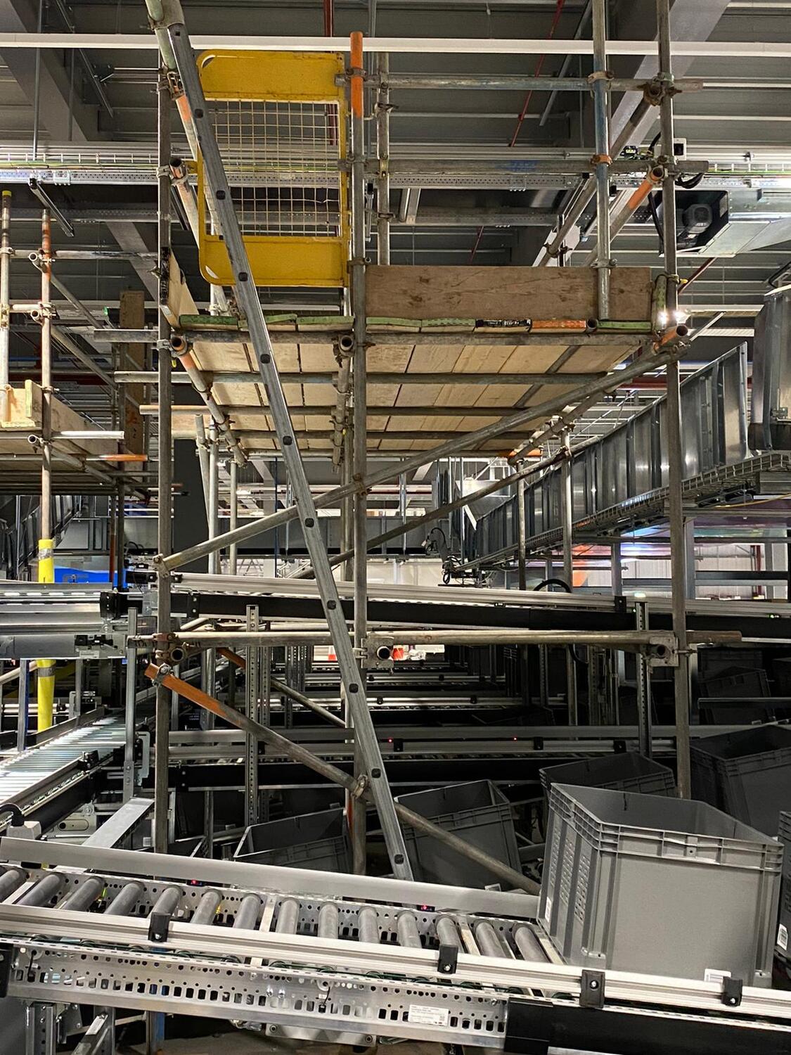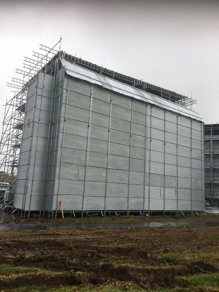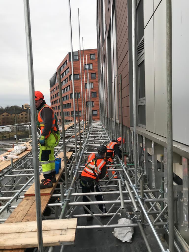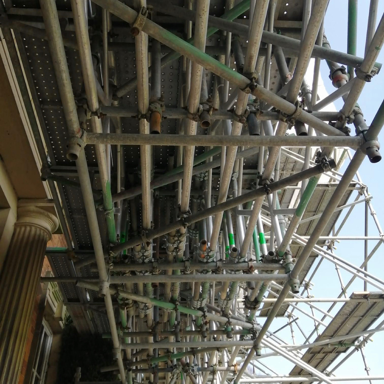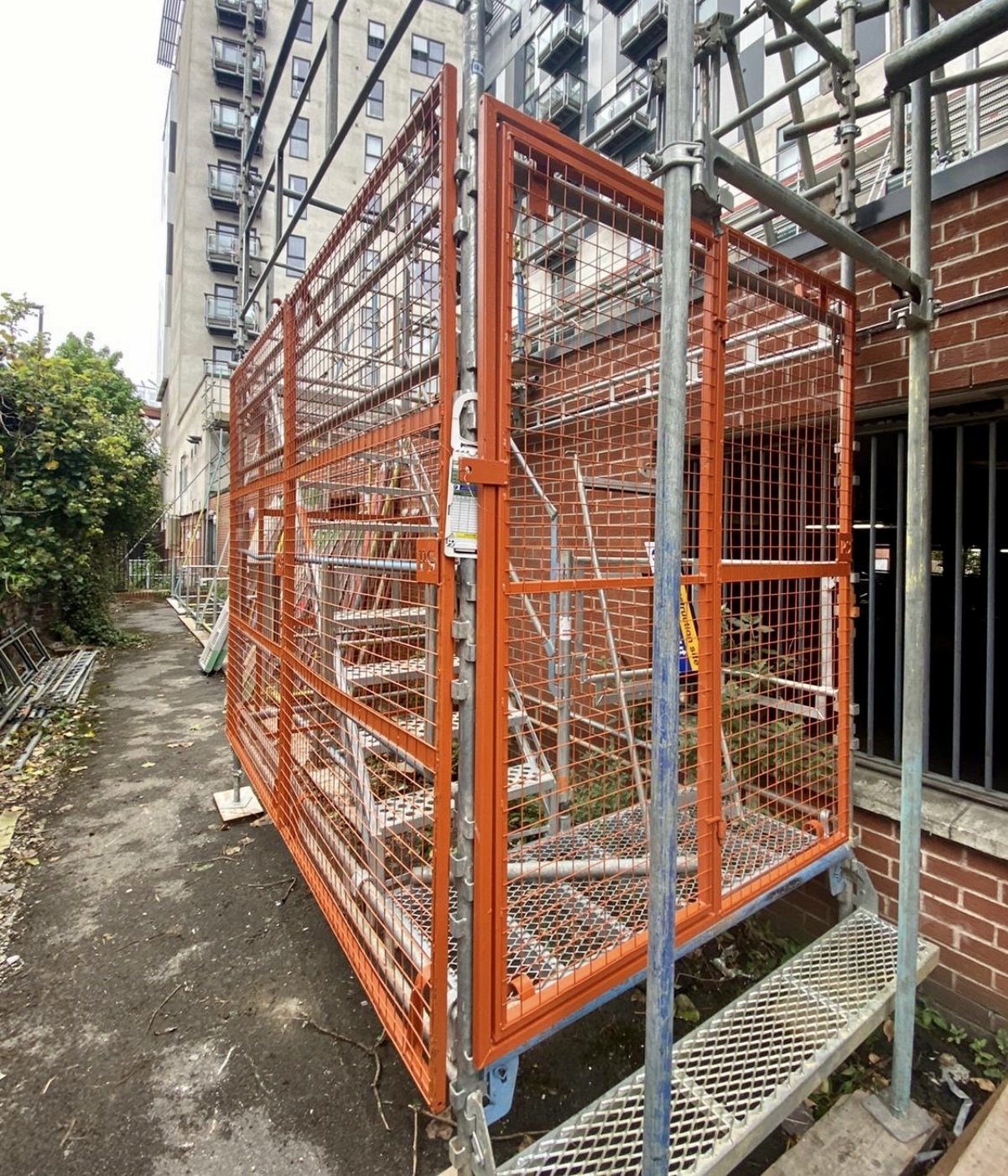 Portway Scaffolding has been tasked to provide a high level access platform to the underside of an atrium on a new prestigious head office building. The design is complicated due to the differing depths of ring beam steel, so in one area the 750mm beams are connected directly to the underside of the steel frame, in other area they are connected to scaffold tube, hung from the underside of the steel frame. The design has had to take into account the reduced capacity of the steel frame. Temporary access scaffold has been erected to the perimeter of the atrium one level below the roof with a 5 board wide cantilever, so that our scaffolders can walk the beams through and connect them to their final fixing point. Due to the reduced loadings of the ground slab, we are using a JLG x25 to act as