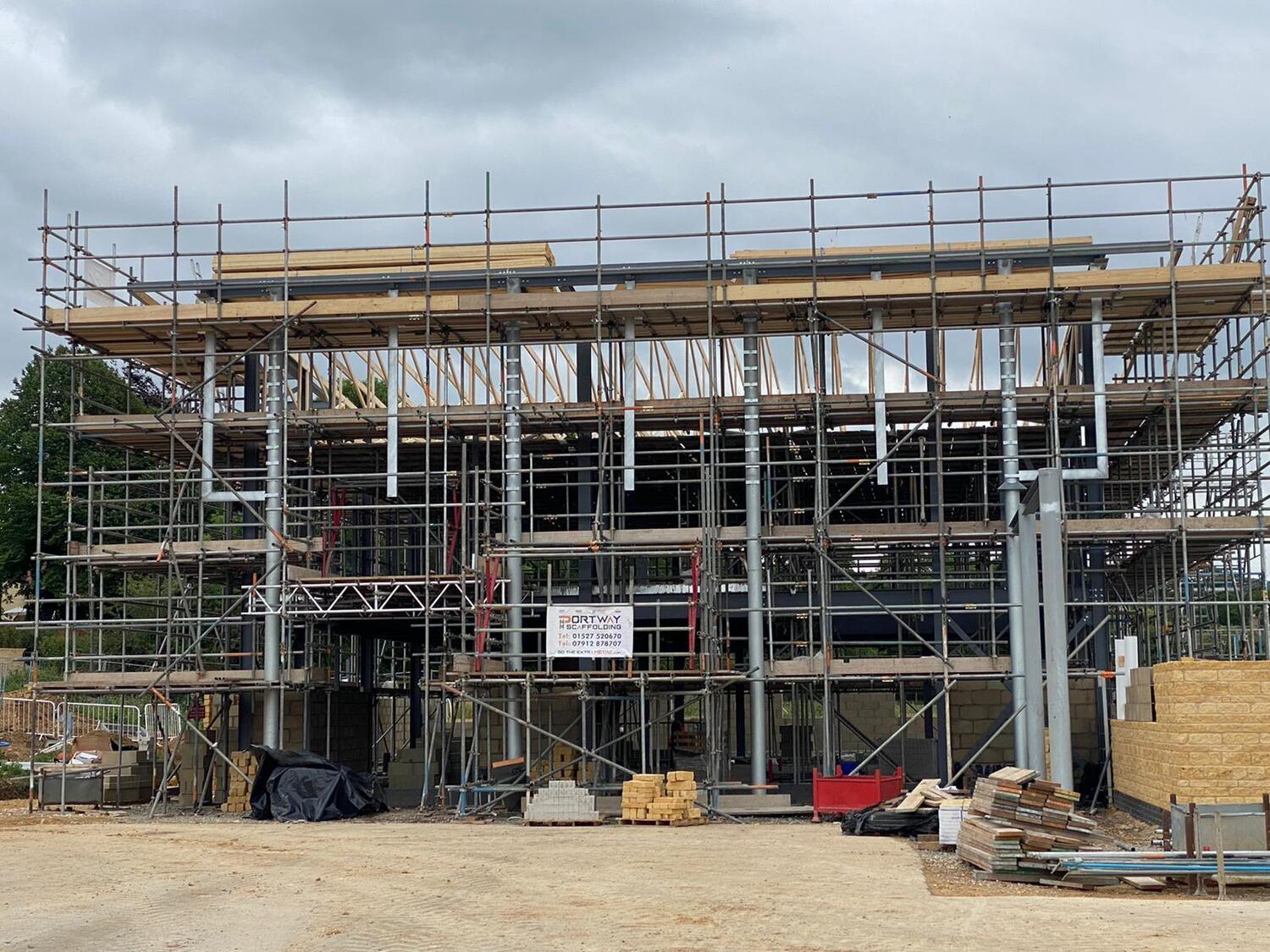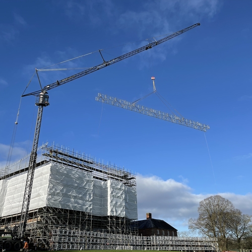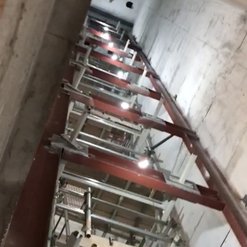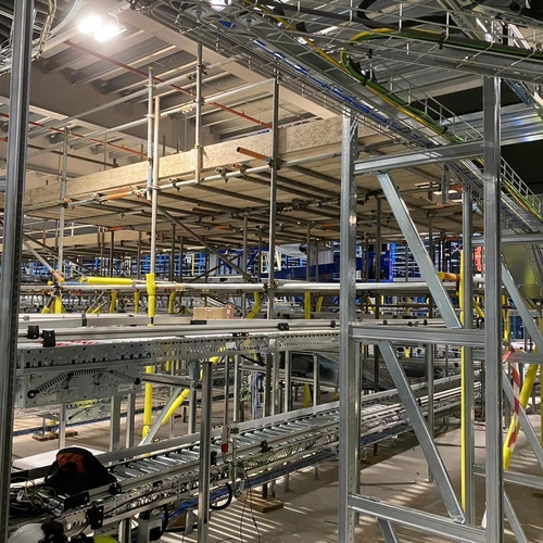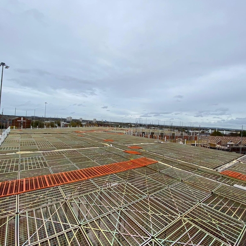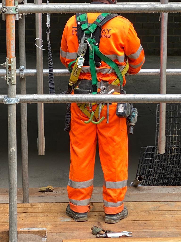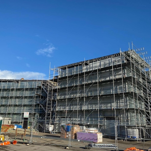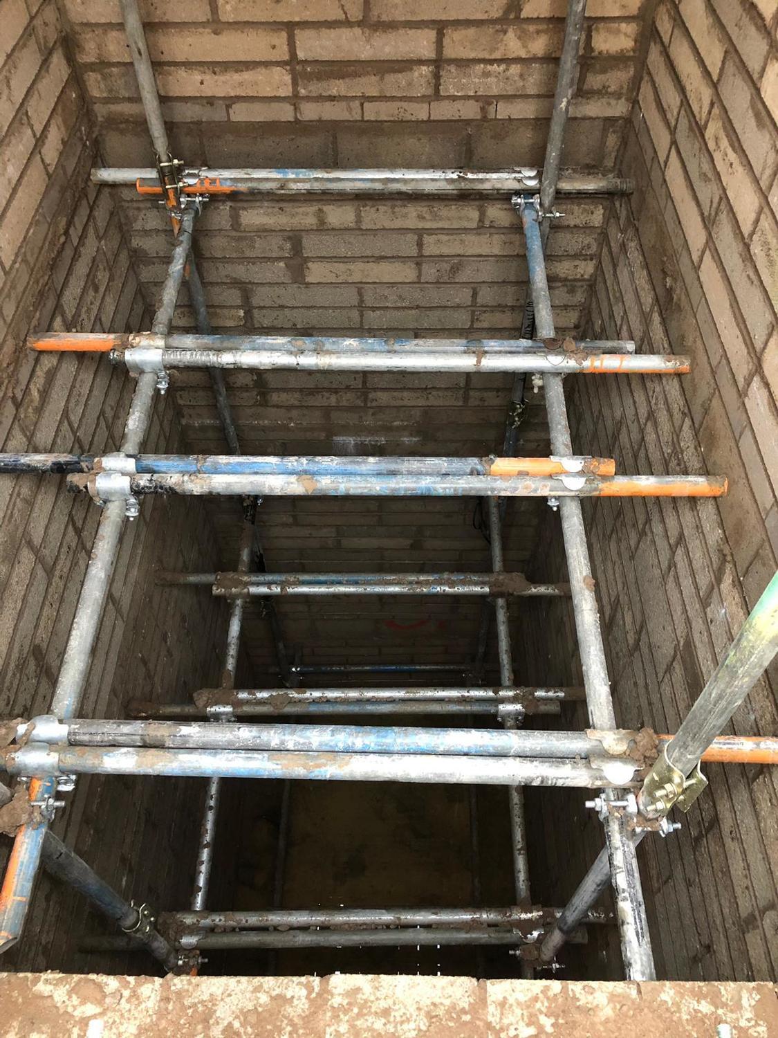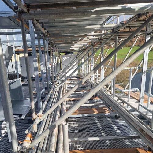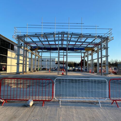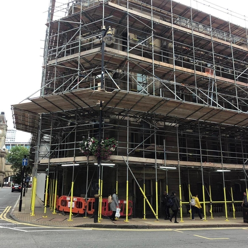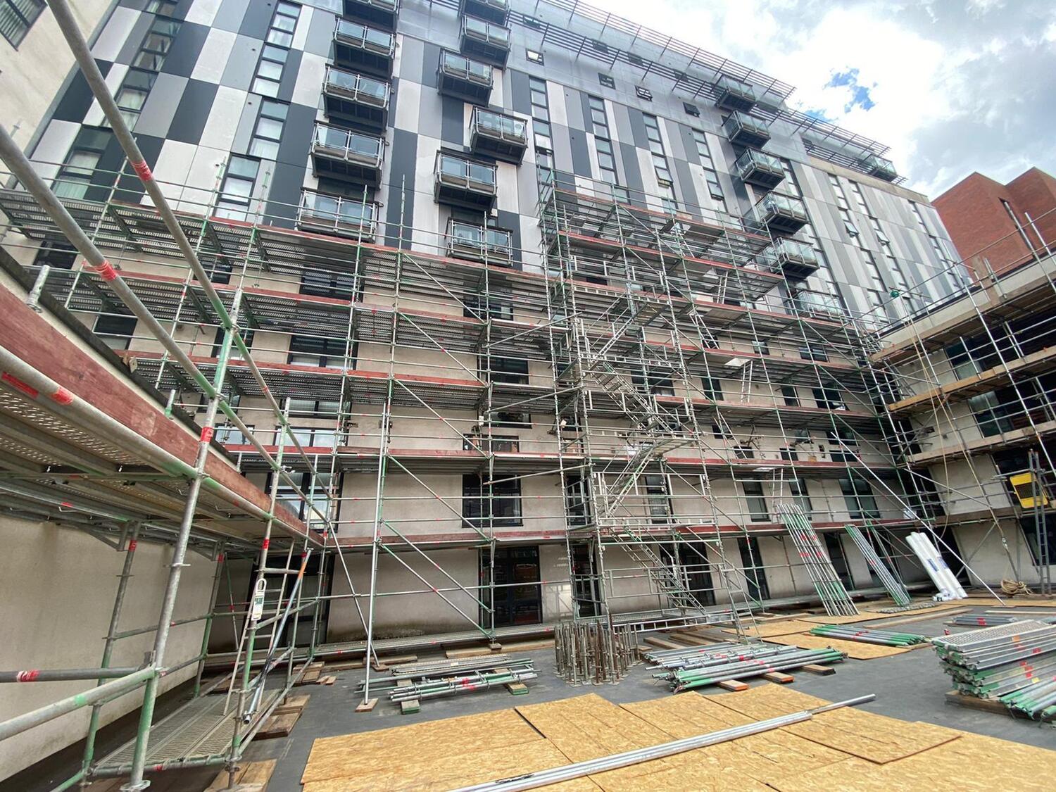 Portway Scaffolding has been tasked to provide a high level access platform to the underside of an atrium on a new prestigious head office building. The design is complicated due to the differing depths of ring beam steel, so in one area the 750mm beams are connected directly to the underside of the steel frame, in other area they are connected to scaffold tube, hung from the underside of the steel frame. The design has had to take into account the reduced capacity of the steel frame. Temporary access scaffold has been erected to the perimeter of the atrium one level below the roof with a 5 board wide cantilever, so that our scaffolders can walk the beams through and connect them to their final fixing point. Due to the reduced loadings of the ground slab, we are using a JLG x25 to act as