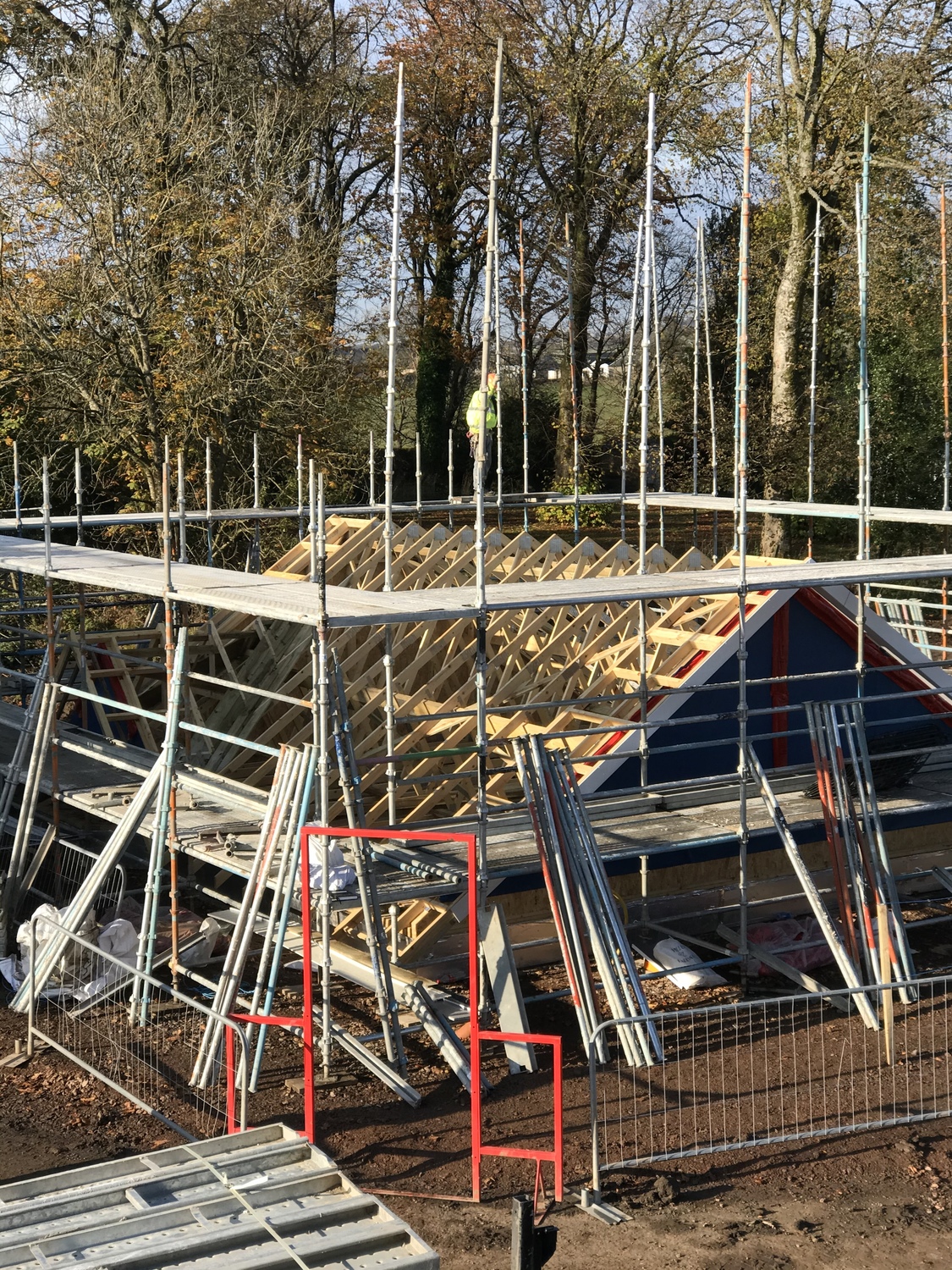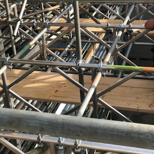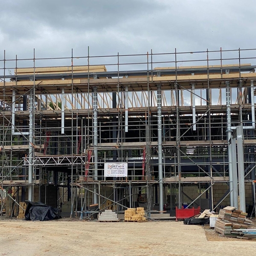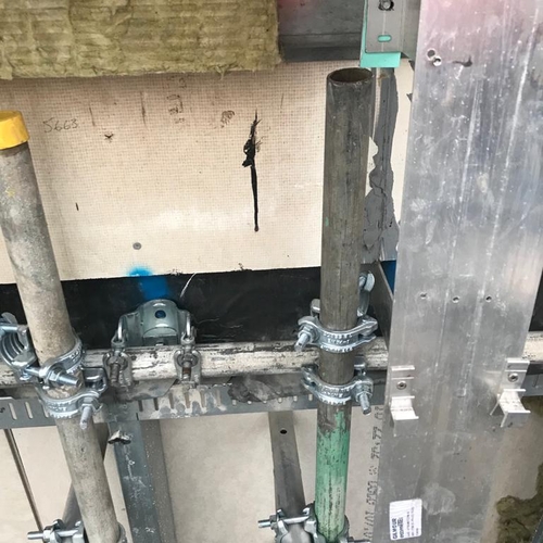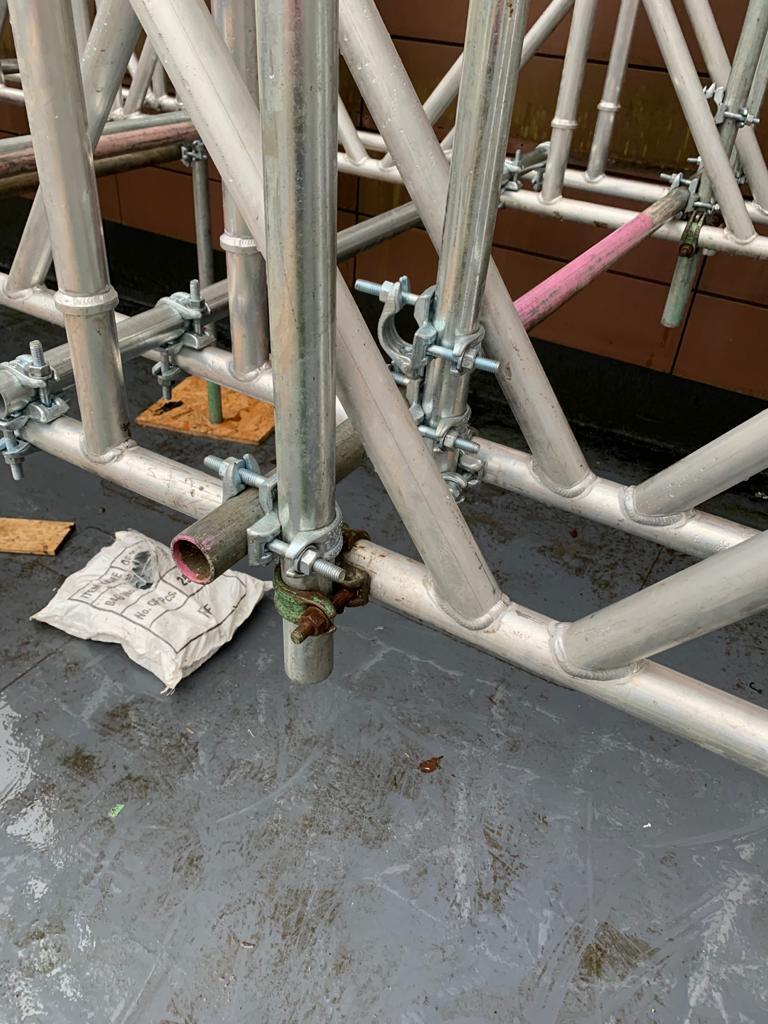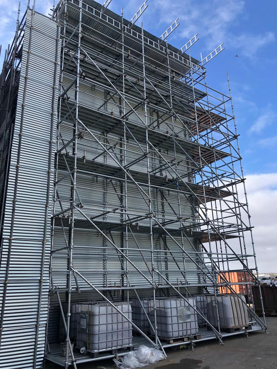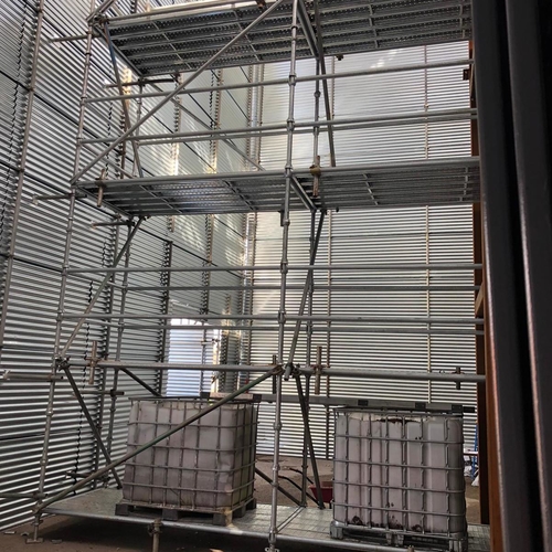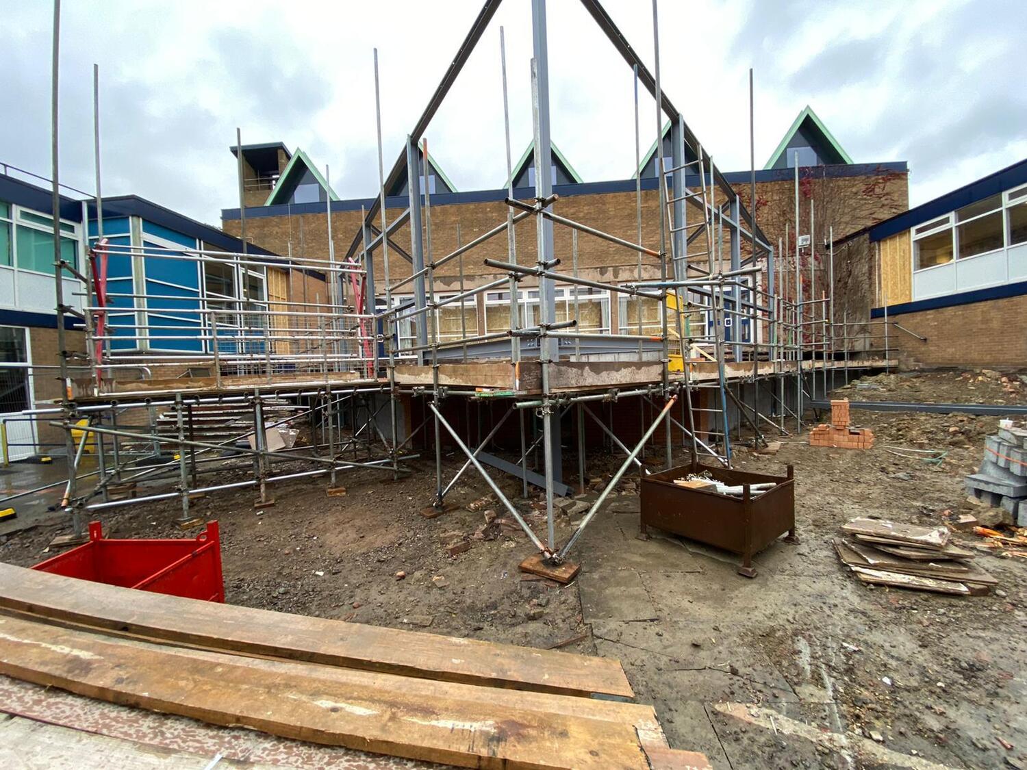 Portway Scaffolding has been tasked to provide a high level access platform to the underside of an atrium on a new prestigious head office building. The design is complicated due to the differing depths of ring beam steel, so in one area the 750mm beams are connected directly to the underside of the steel frame, in other area they are connected to scaffold tube, hung from the underside of the steel frame. The design has had to take into account the reduced capacity of the steel frame. Temporary access scaffold has been erected to the perimeter of the atrium one level below the roof with a 5 board wide cantilever, so that our scaffolders can walk the beams through and connect them to their final fixing point. Due to the reduced loadings of the ground slab, we are using a JLG x25 to act as