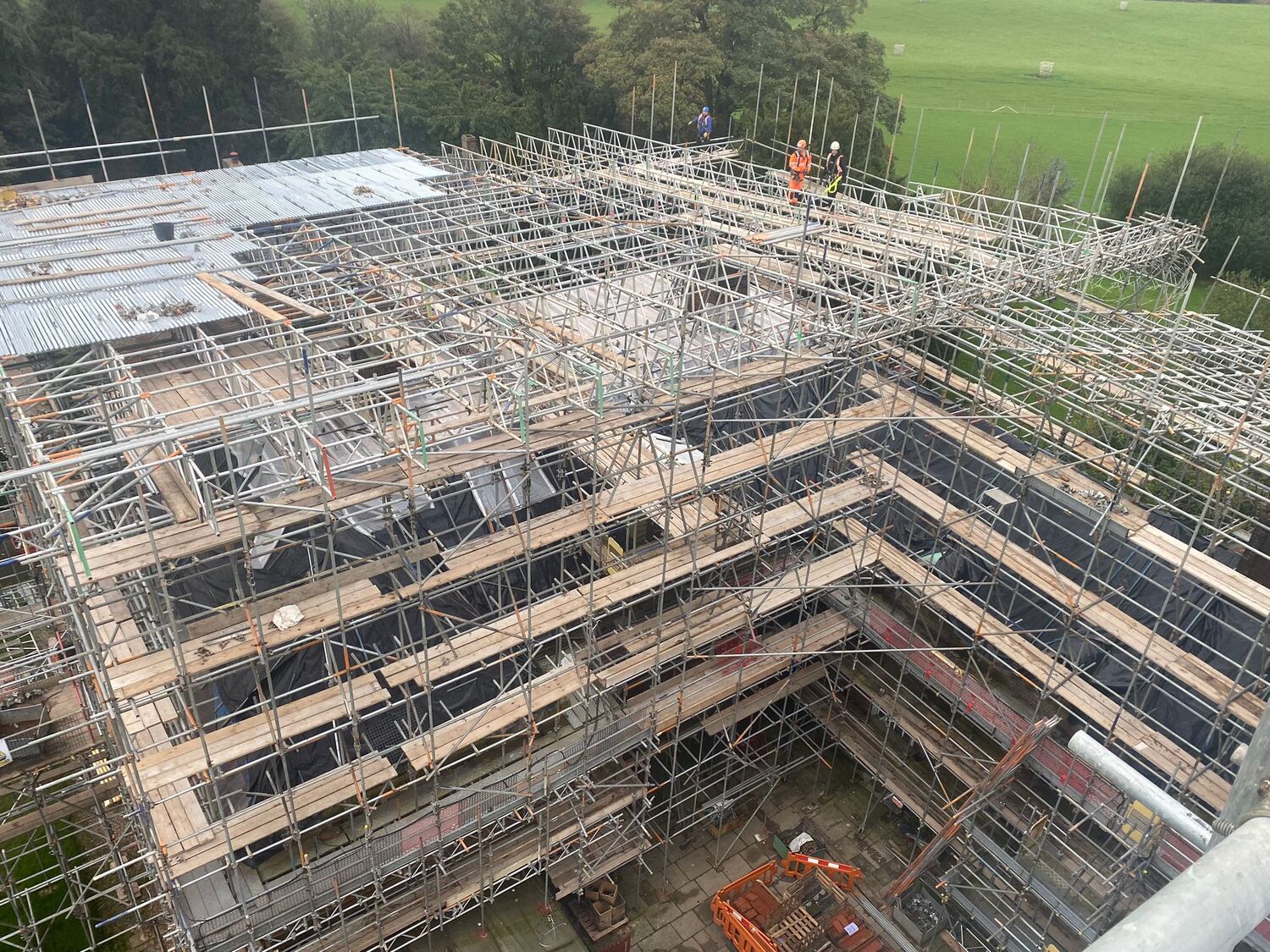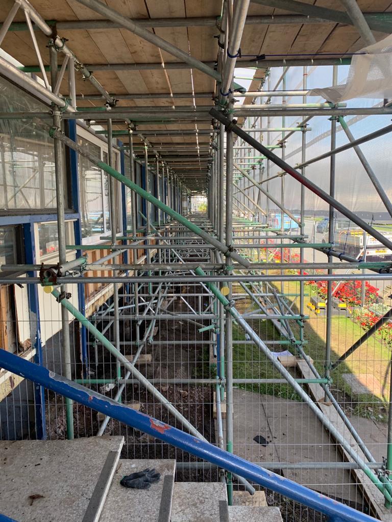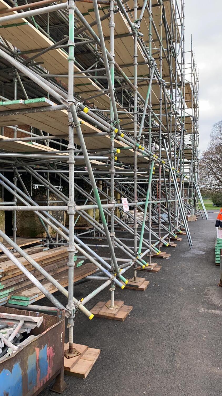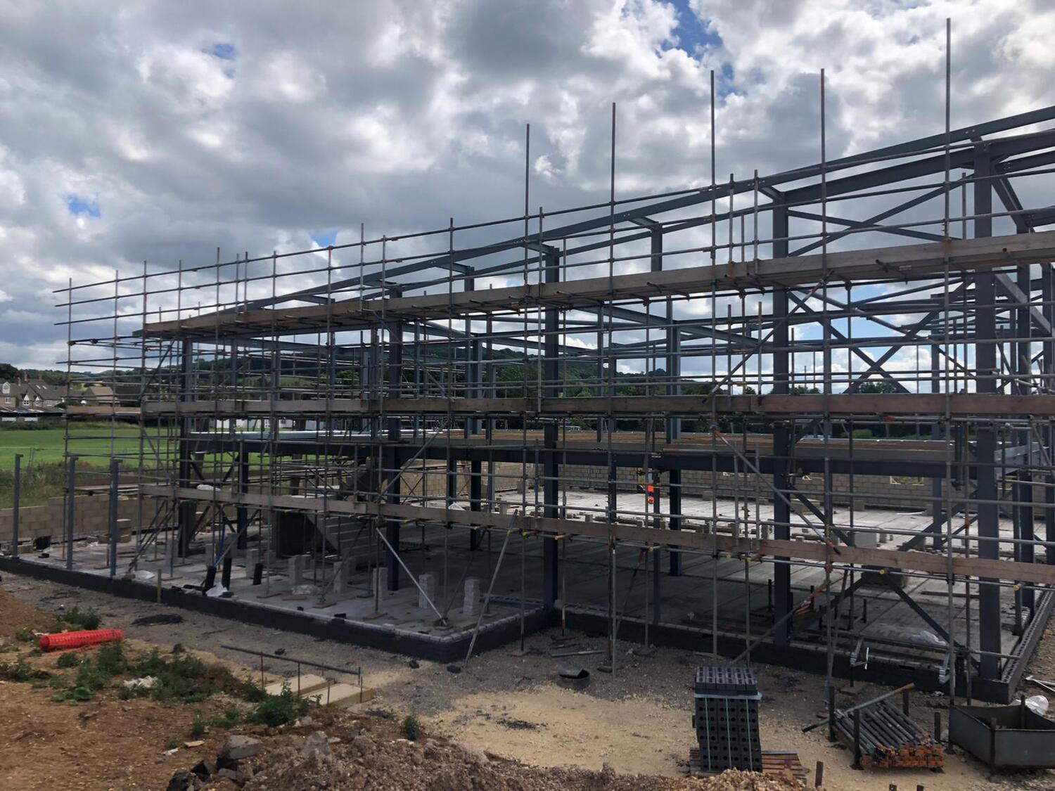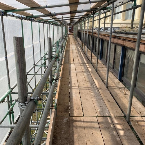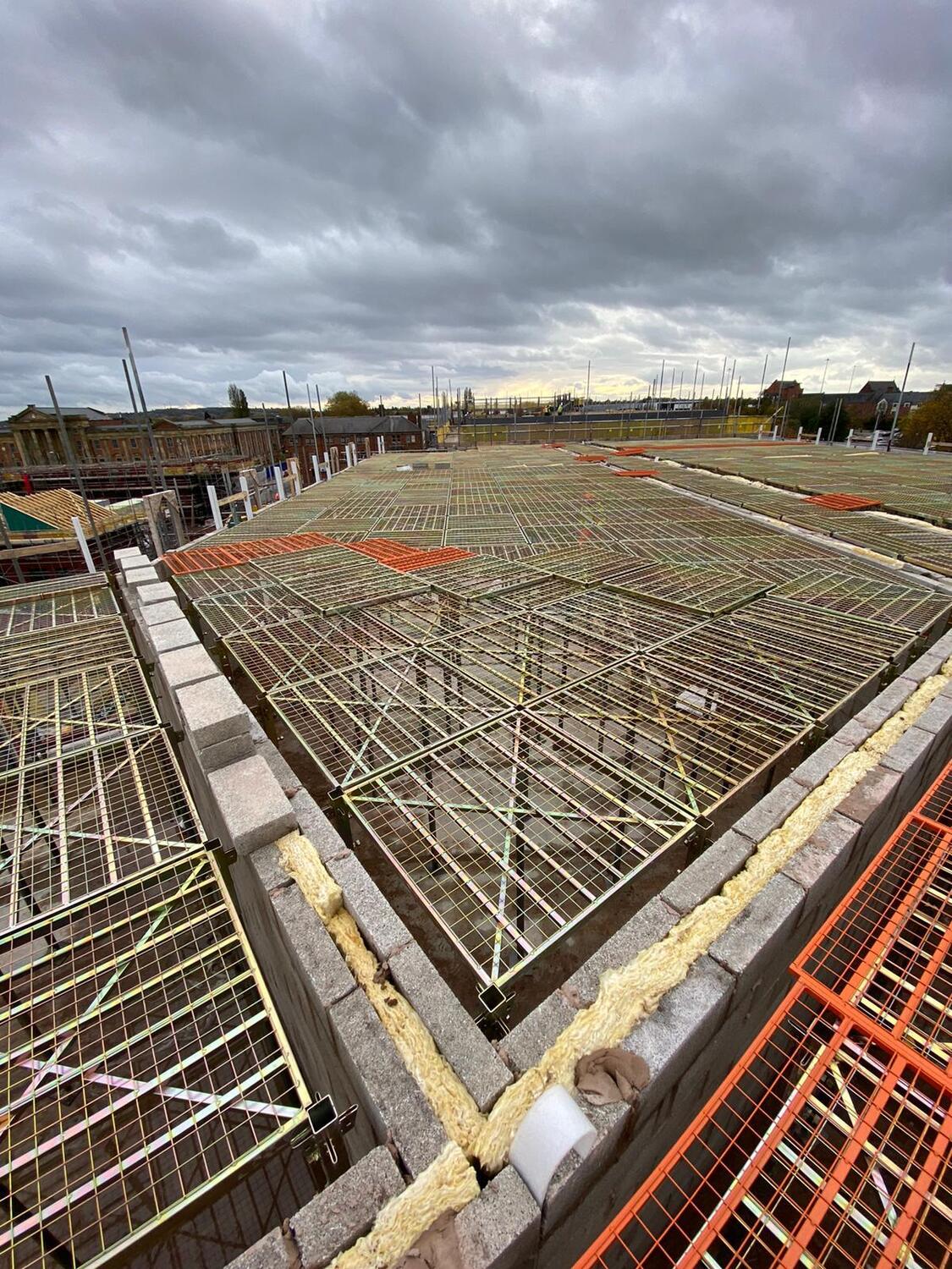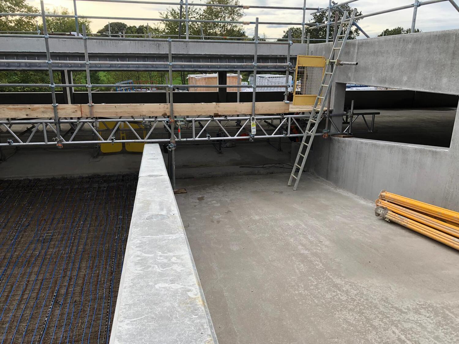 Portway Scaffolding has been tasked to provide a high level access platform to the underside of an atrium on a new prestigious head office building. The design is complicated due to the differing depths of ring beam steel, so in one area the 750mm beams are connected directly to the underside of the steel frame, in other area they are connected to scaffold tube, hung from the underside of the steel frame. The design has had to take into account the reduced capacity of the steel frame. Temporary access scaffold has been erected to the perimeter of the atrium one level below the roof with a 5 board wide cantilever, so that our scaffolders can walk the beams through and connect them to their final fixing point. Due to the reduced loadings of the ground slab, we are using a JLG x25 to act as