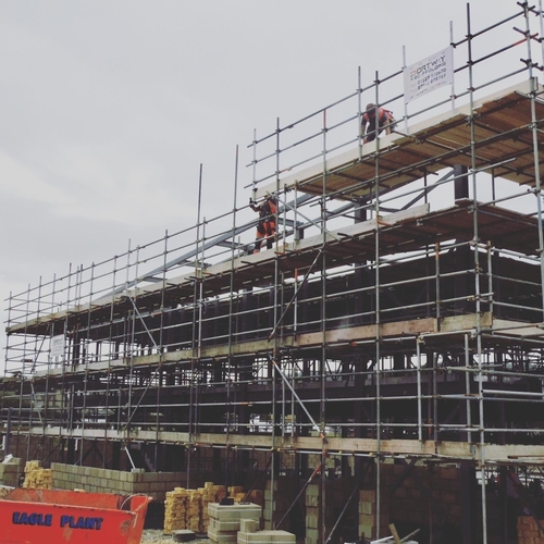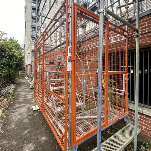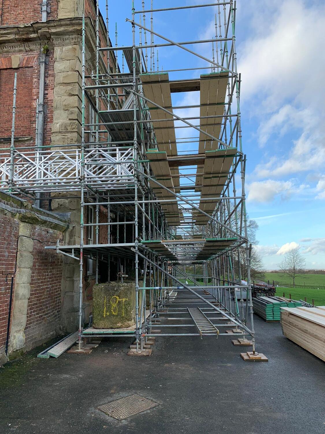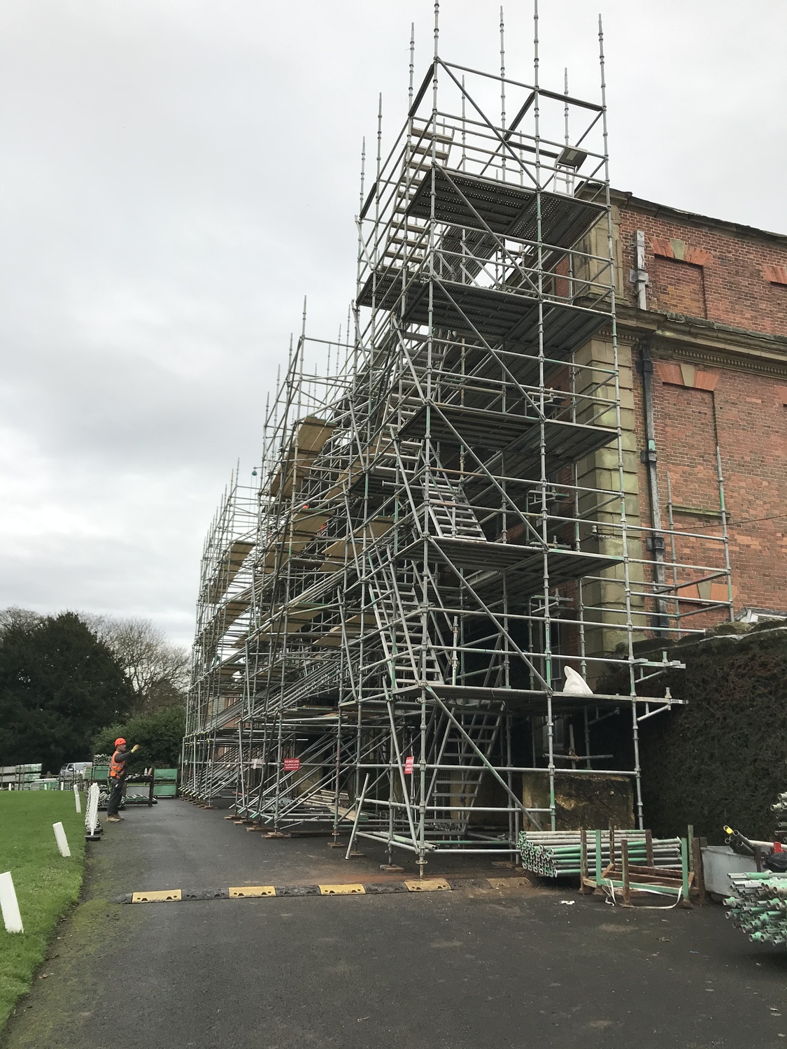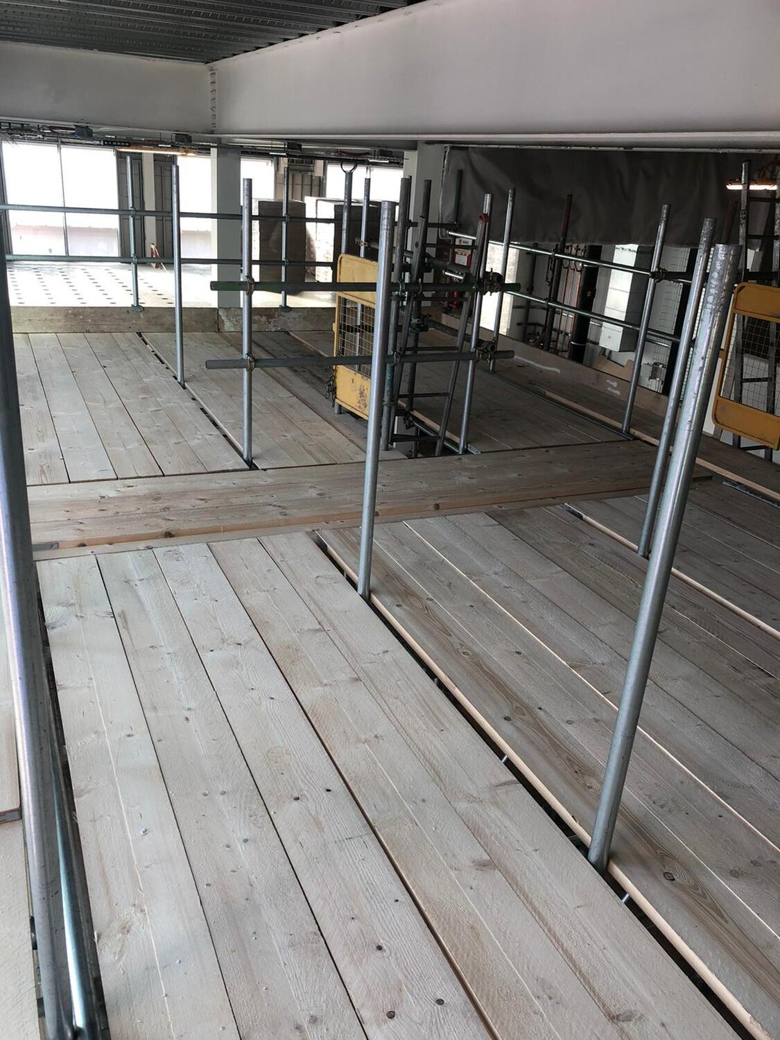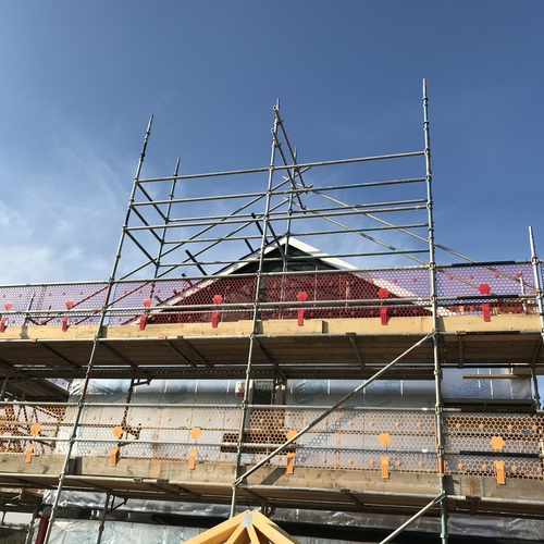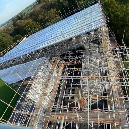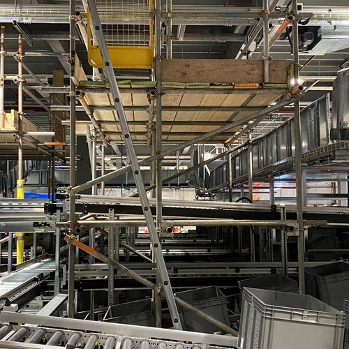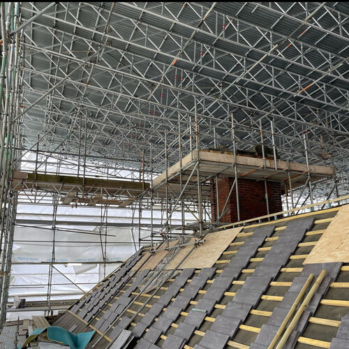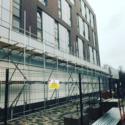 Portway Scaffolding has been tasked to provide a high level access platform to the underside of an atrium on a new prestigious head office building. The design is complicated due to the differing depths of ring beam steel, so in one area the 750mm beams are connected directly to the underside of the steel frame, in other area they are connected to scaffold tube, hung from the underside of the steel frame. The design has had to take into account the reduced capacity of the steel frame. Temporary access scaffold has been erected to the perimeter of the atrium one level below the roof with a 5 board wide cantilever, so that our scaffolders can walk the beams through and connect them to their final fixing point. Due to the reduced loadings of the ground slab, we are using a JLG x25 to act as