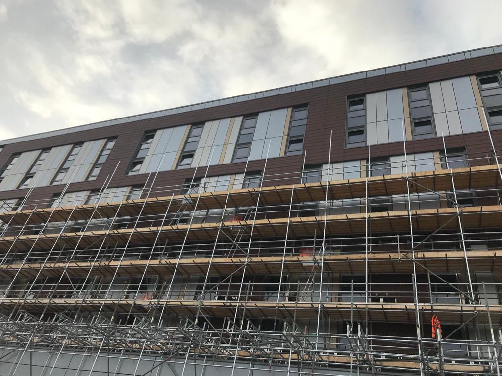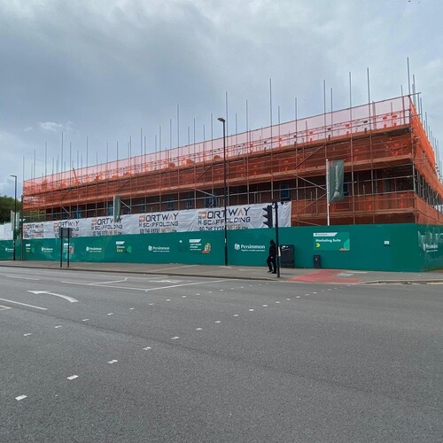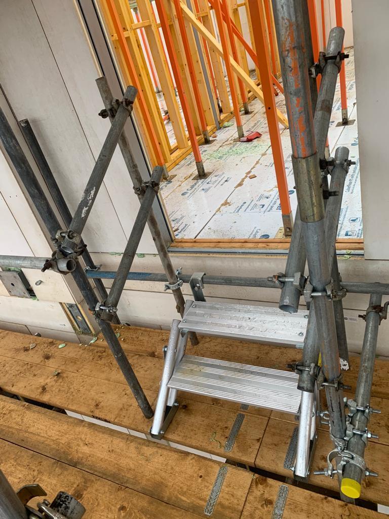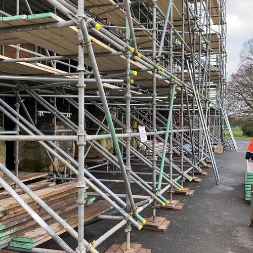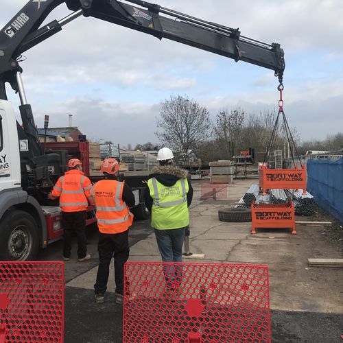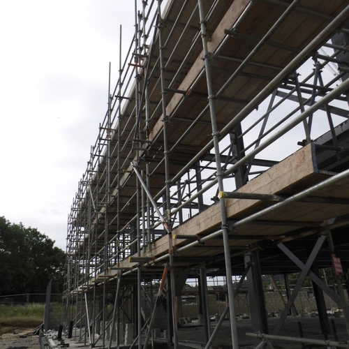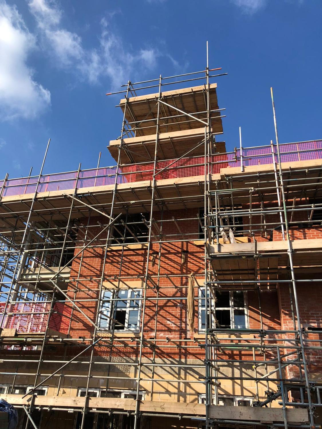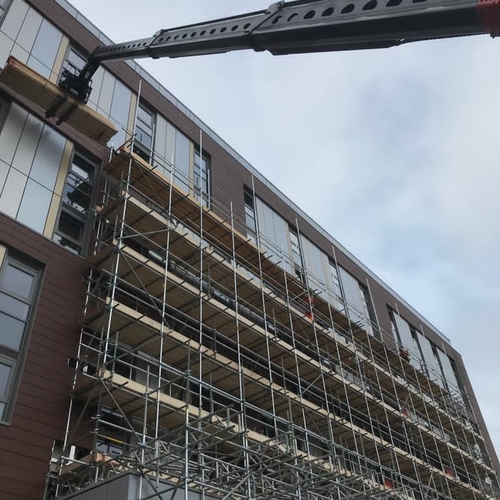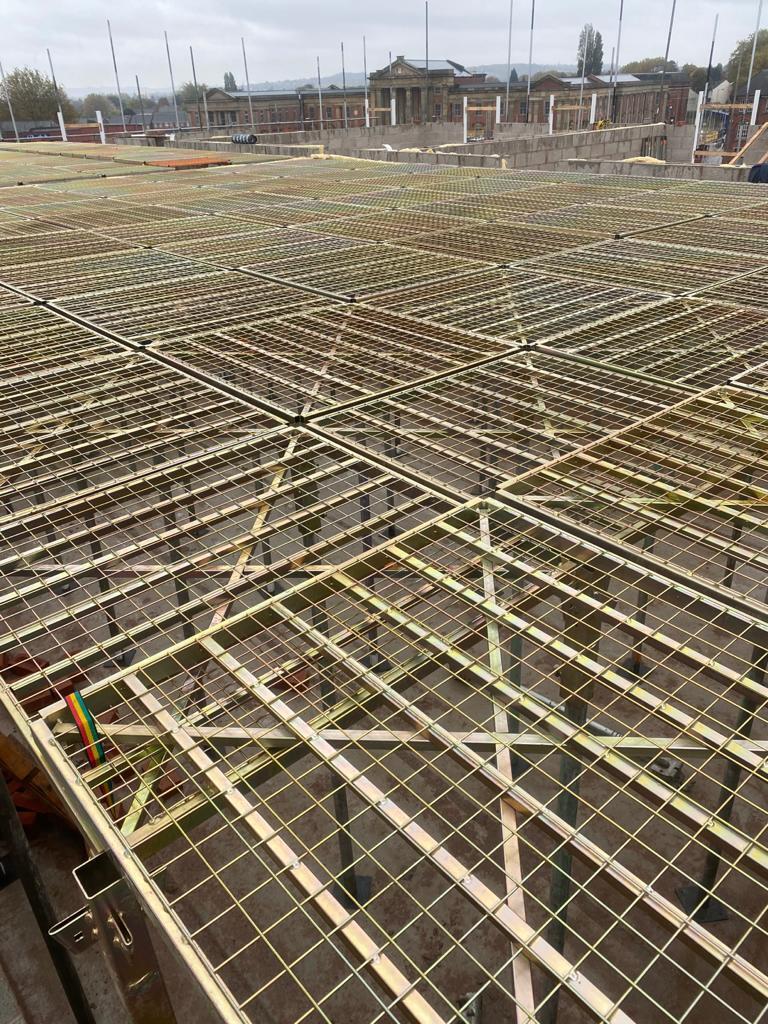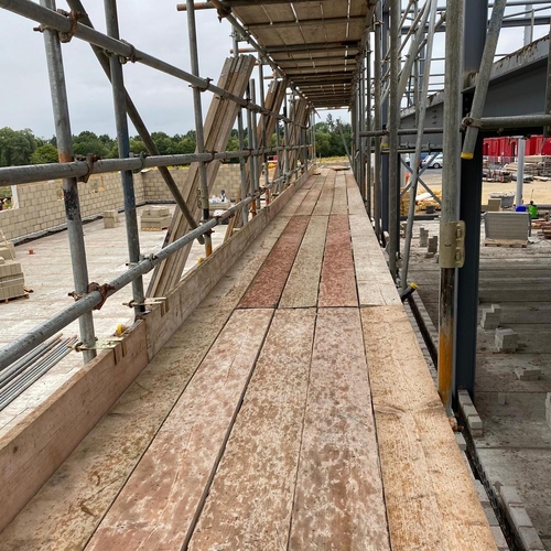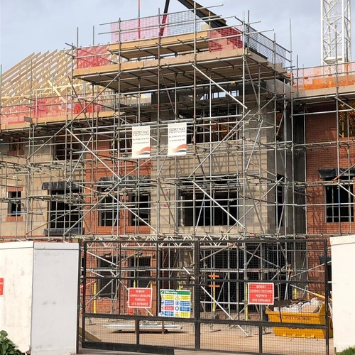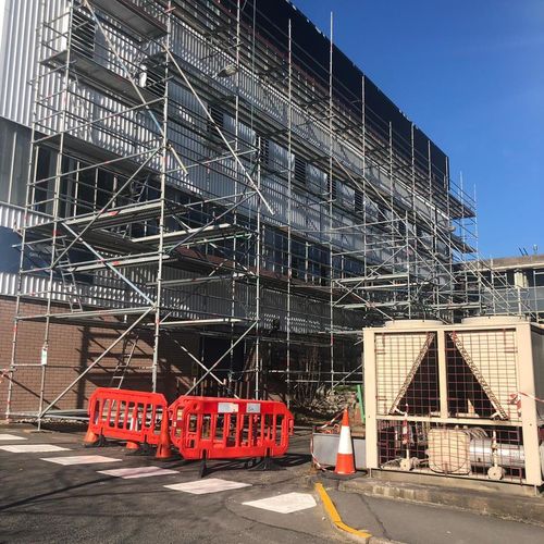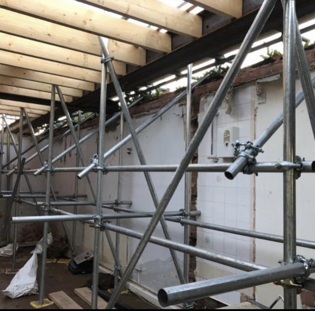 Portway Scaffolding has been tasked to provide a high level access platform to the underside of an atrium on a new prestigious head office building. The design is complicated due to the differing depths of ring beam steel, so in one area the 750mm beams are connected directly to the underside of the steel frame, in other area they are connected to scaffold tube, hung from the underside of the steel frame. The design has had to take into account the reduced capacity of the steel frame. Temporary access scaffold has been erected to the perimeter of the atrium one level below the roof with a 5 board wide cantilever, so that our scaffolders can walk the beams through and connect them to their final fixing point. Due to the reduced loadings of the ground slab, we are using a JLG x25 to act as