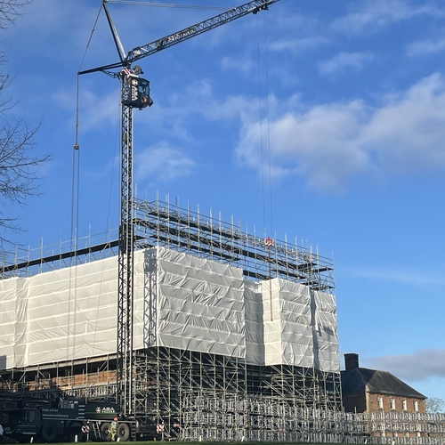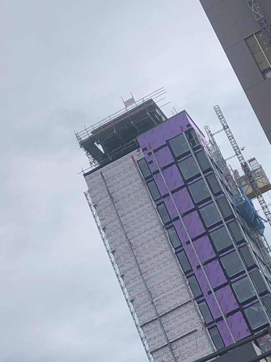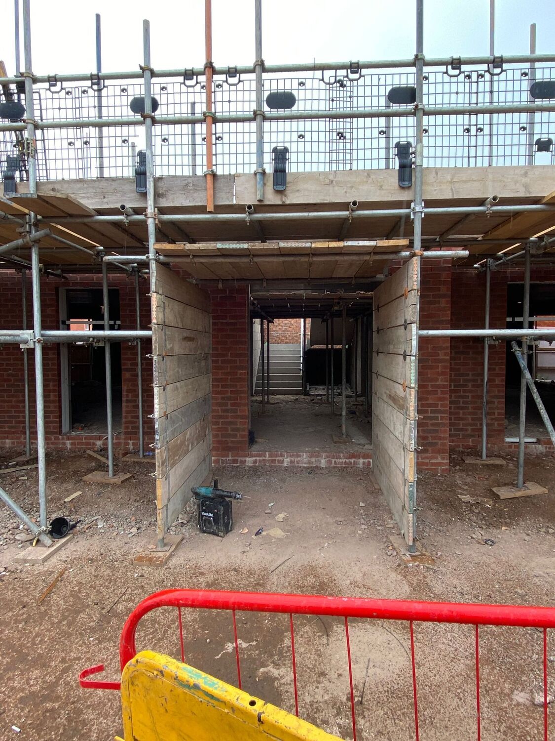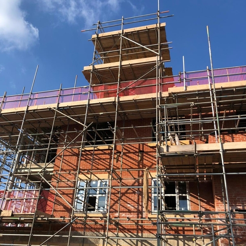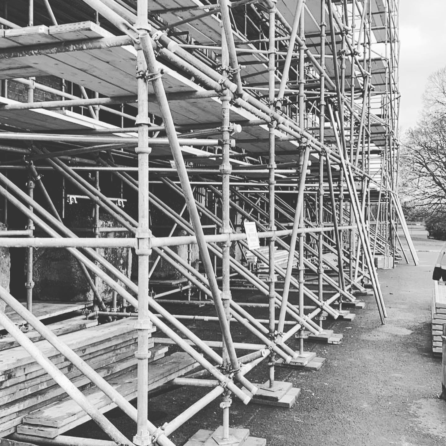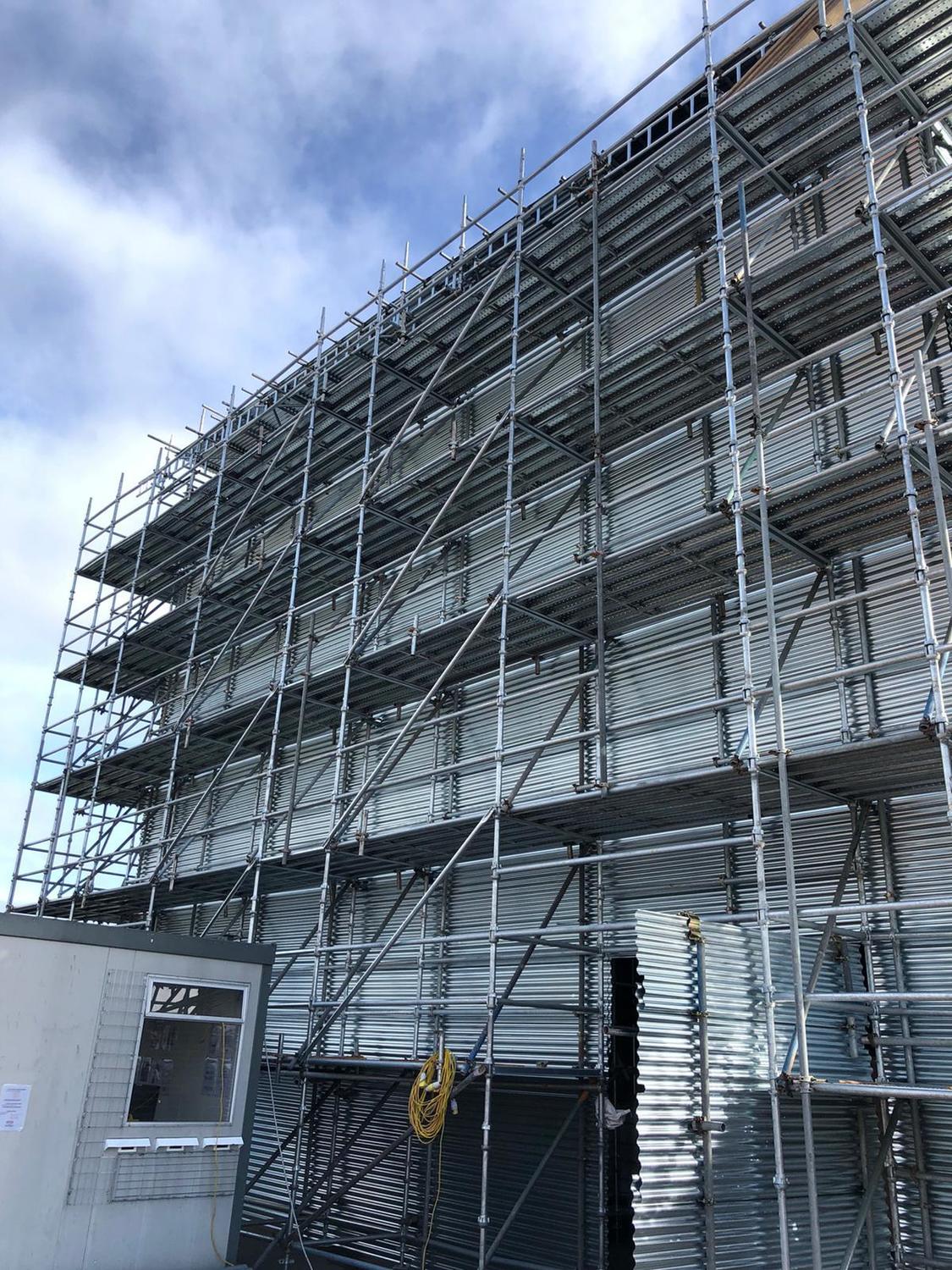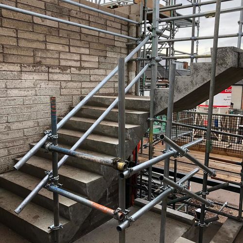 Portway Scaffolding has been tasked to provide a high level access platform to the underside of an atrium on a new prestigious head office building. The design is complicated due to the differing depths of ring beam steel, so in one area the 750mm beams are connected directly to the underside of the steel frame, in other area they are connected to scaffold tube, hung from the underside of the steel frame. The design has had to take into account the reduced capacity of the steel frame. Temporary access scaffold has been erected to the perimeter of the atrium one level below the roof with a 5 board wide cantilever, so that our scaffolders can walk the beams through and connect them to their final fixing point. Due to the reduced loadings of the ground slab, we are using a JLG x25 to act as