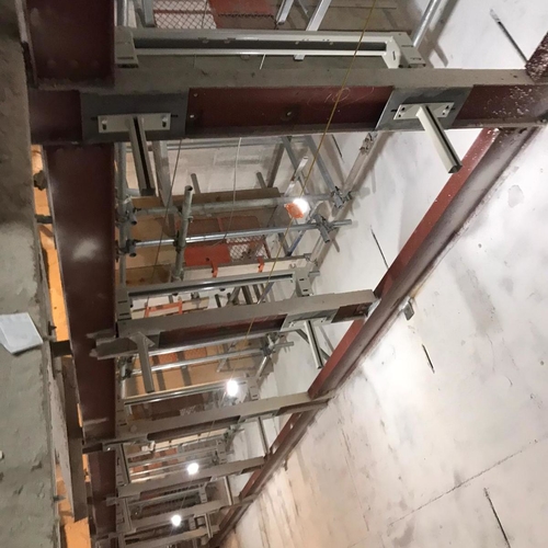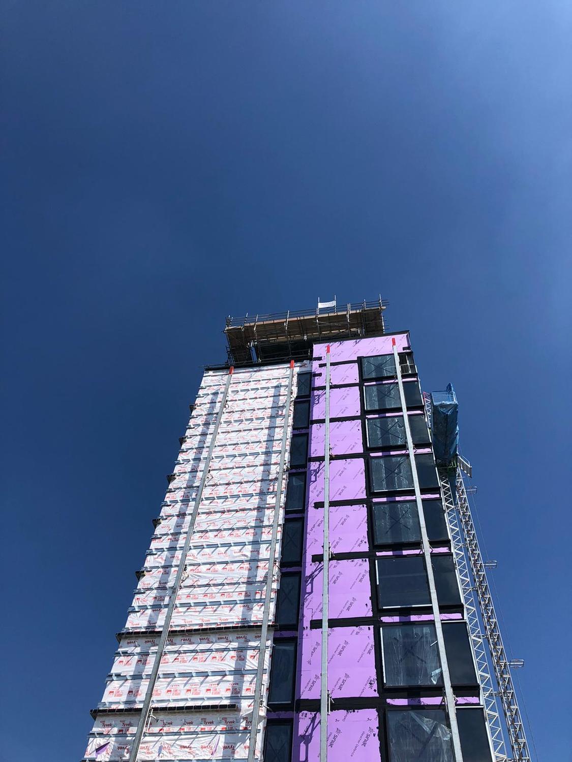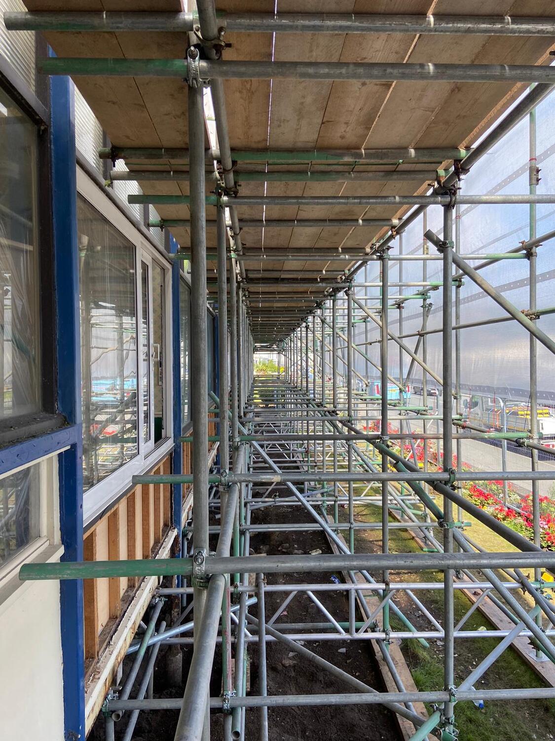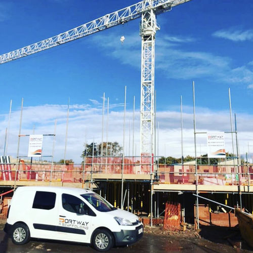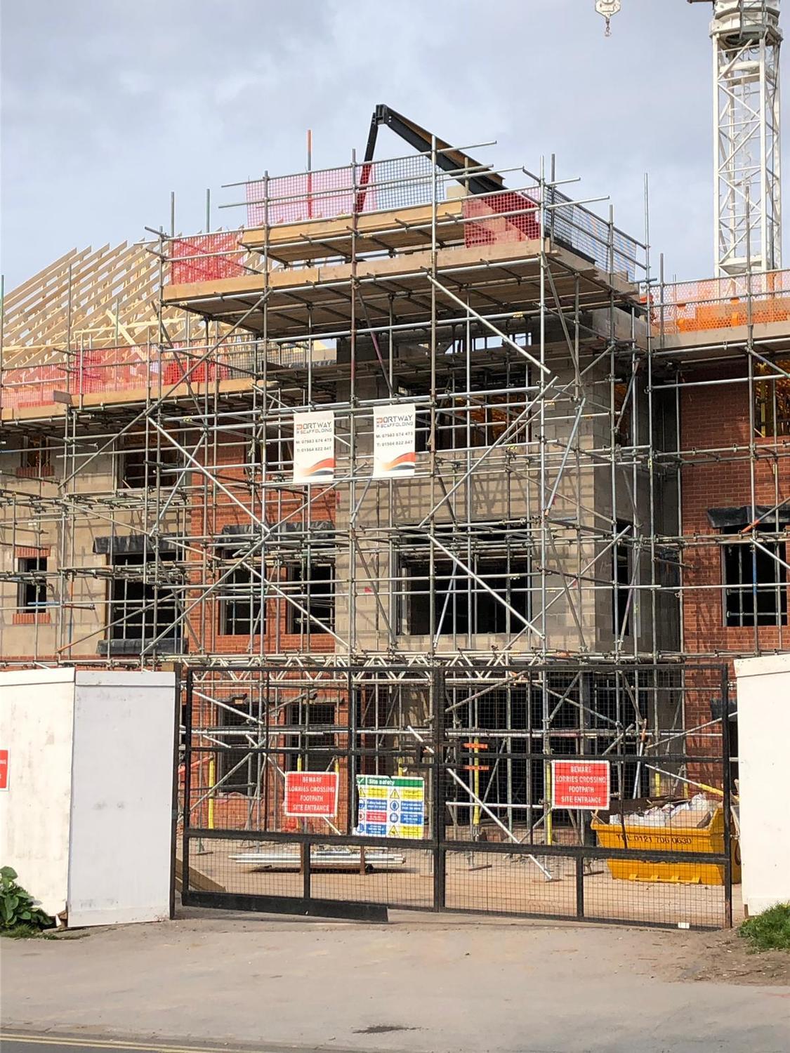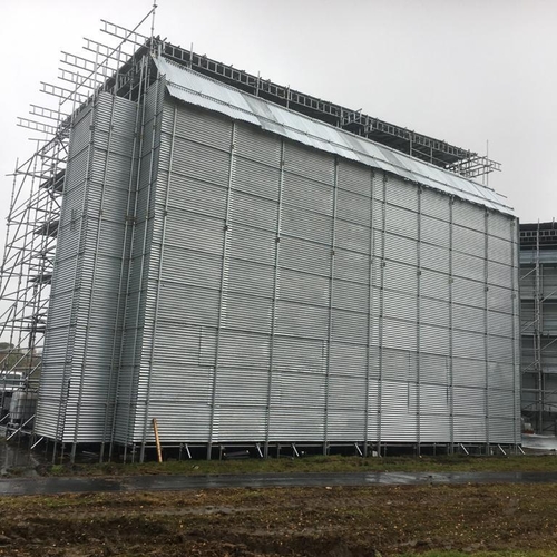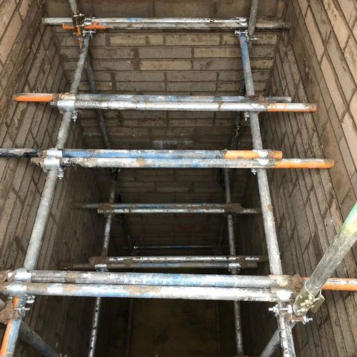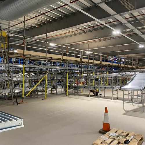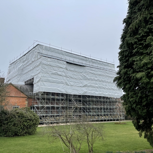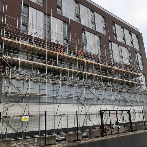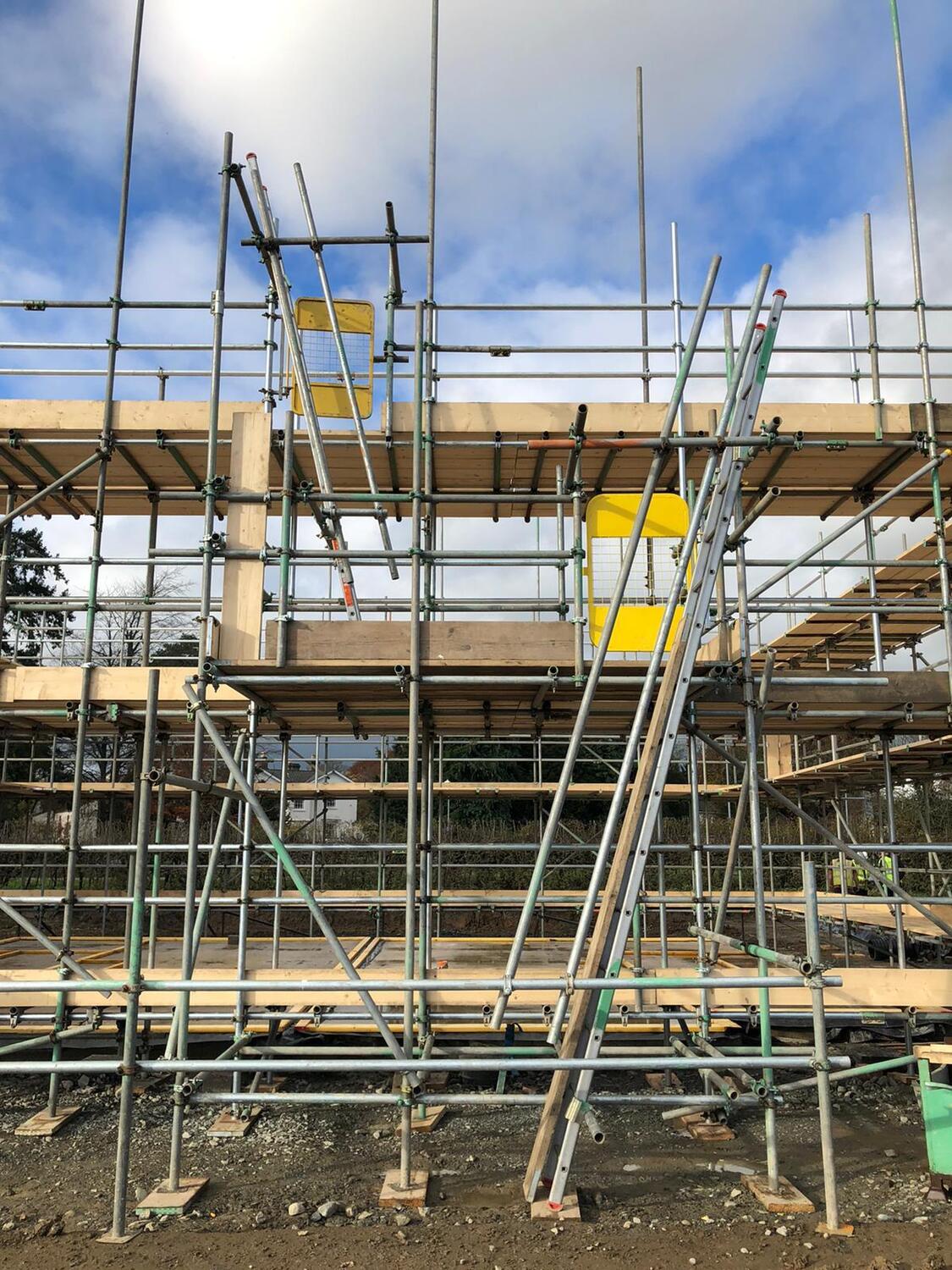 Portway Scaffolding has been tasked to provide a high level access platform to the underside of an atrium on a new prestigious head office building. The design is complicated due to the differing depths of ring beam steel, so in one area the 750mm beams are connected directly to the underside of the steel frame, in other area they are connected to scaffold tube, hung from the underside of the steel frame. The design has had to take into account the reduced capacity of the steel frame. Temporary access scaffold has been erected to the perimeter of the atrium one level below the roof with a 5 board wide cantilever, so that our scaffolders can walk the beams through and connect them to their final fixing point. Due to the reduced loadings of the ground slab, we are using a JLG x25 to act as