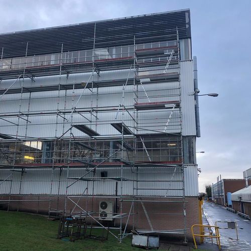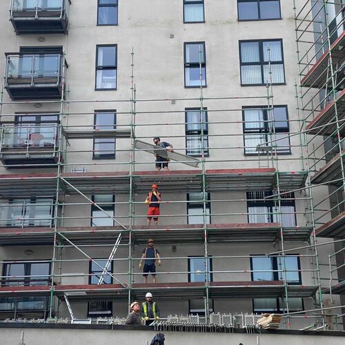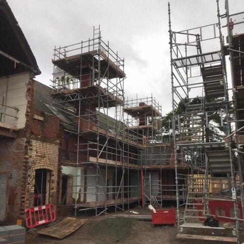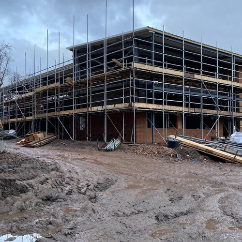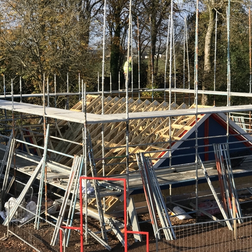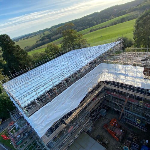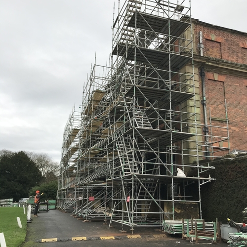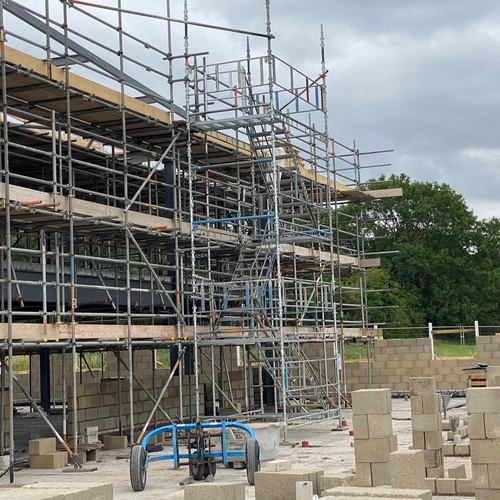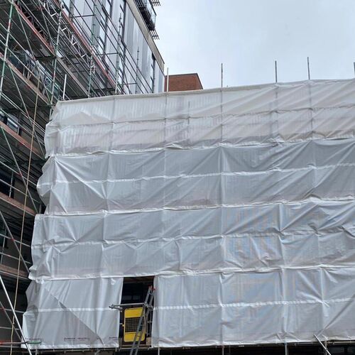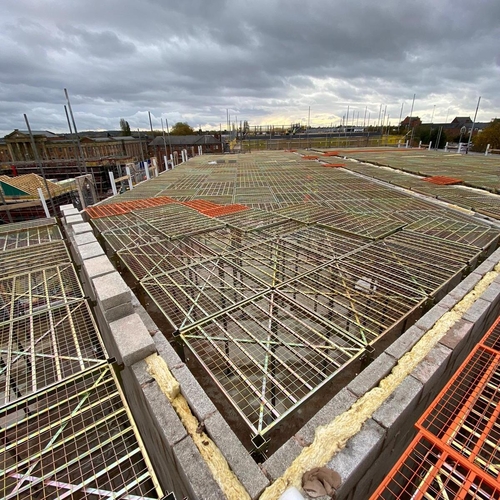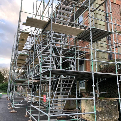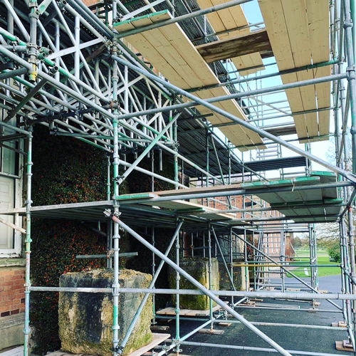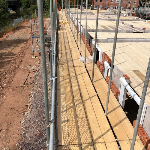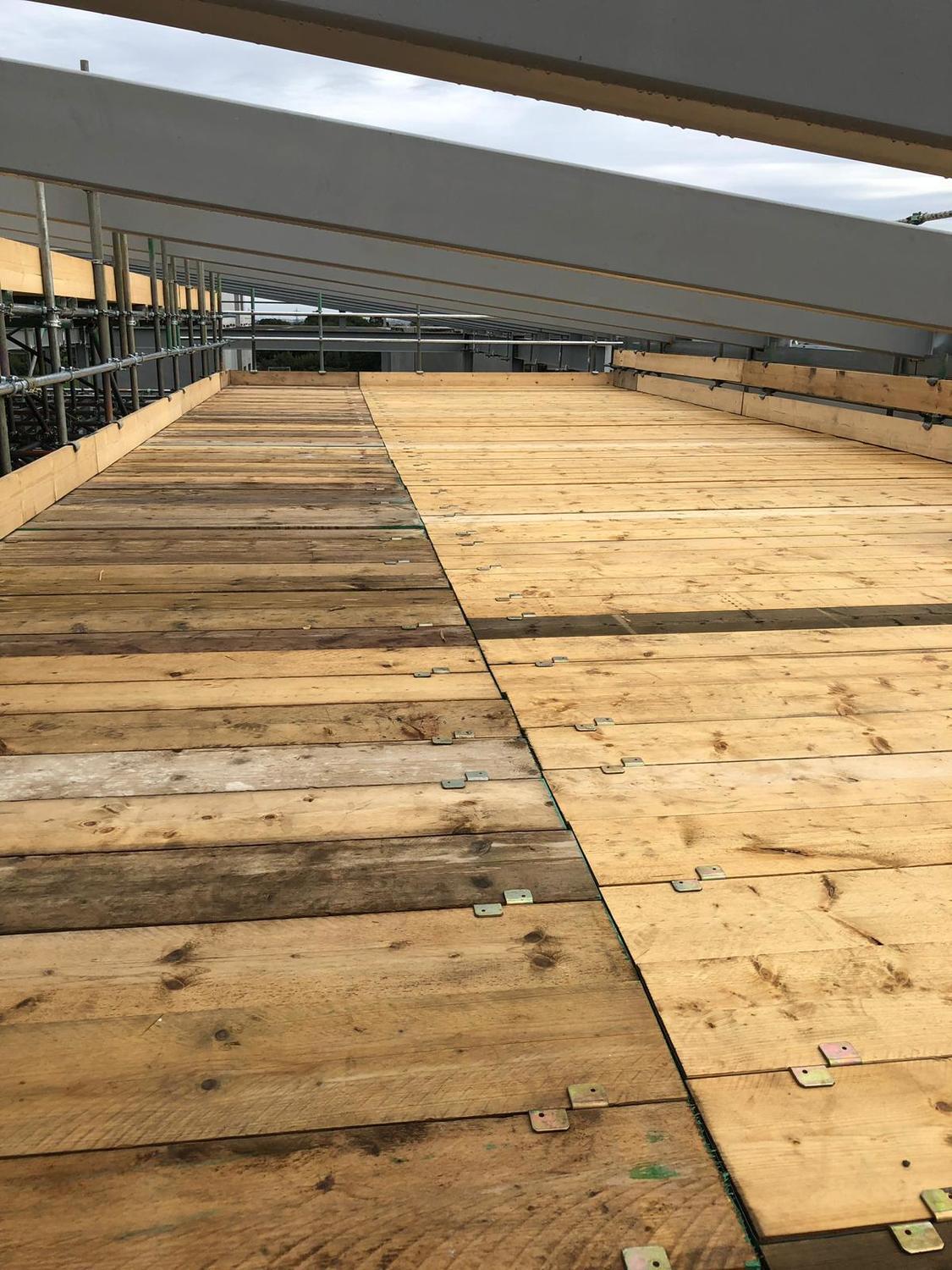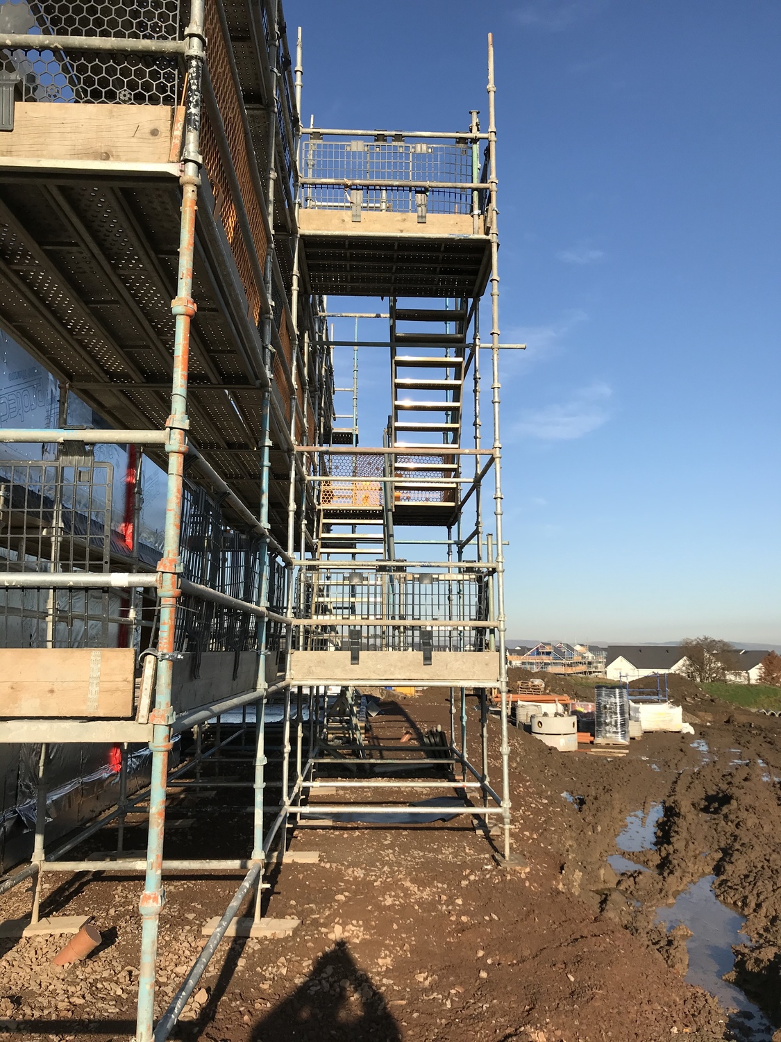 Portway Scaffolding has been tasked to provide a high level access platform to the underside of an atrium on a new prestigious head office building. The design is complicated due to the differing depths of ring beam steel, so in one area the 750mm beams are connected directly to the underside of the steel frame, in other area they are connected to scaffold tube, hung from the underside of the steel frame. The design has had to take into account the reduced capacity of the steel frame. Temporary access scaffold has been erected to the perimeter of the atrium one level below the roof with a 5 board wide cantilever, so that our scaffolders can walk the beams through and connect them to their final fixing point. Due to the reduced loadings of the ground slab, we are using a JLG x25 to act as