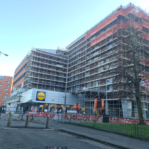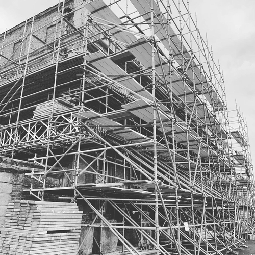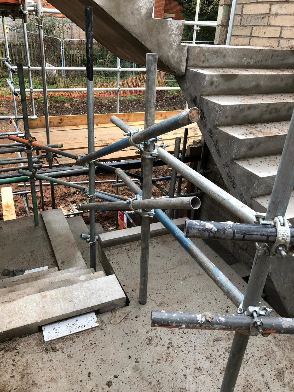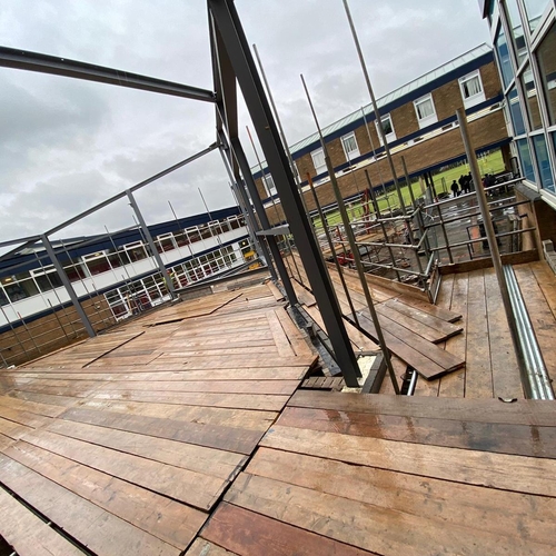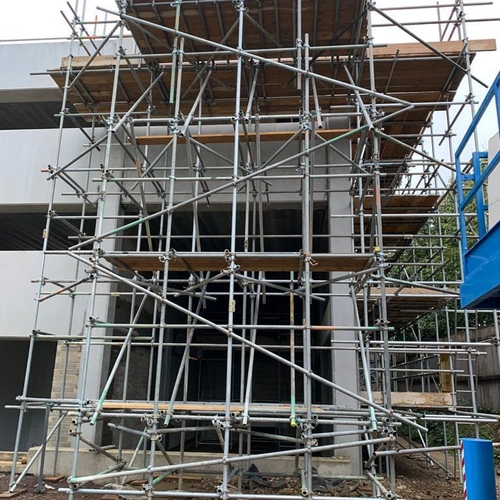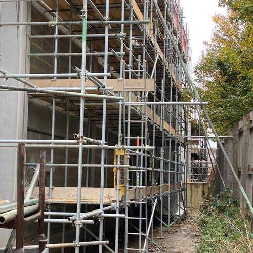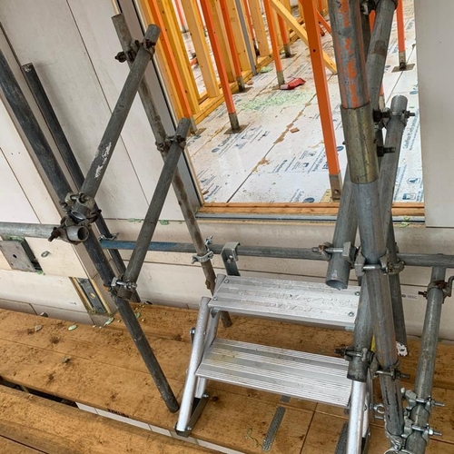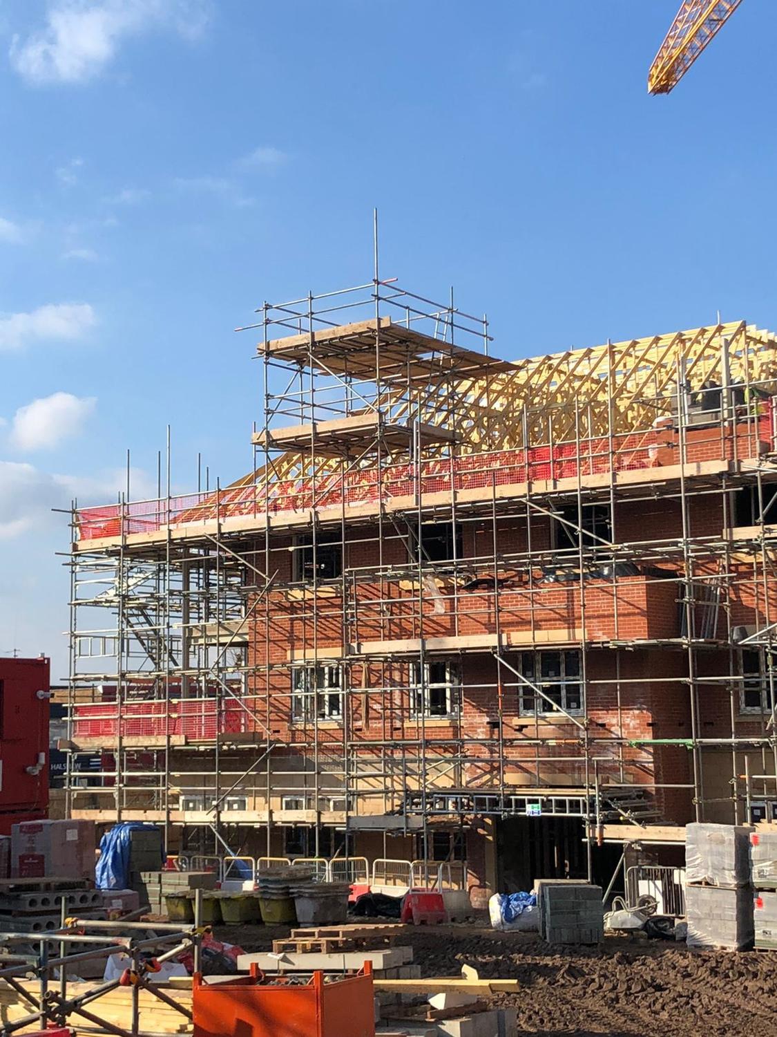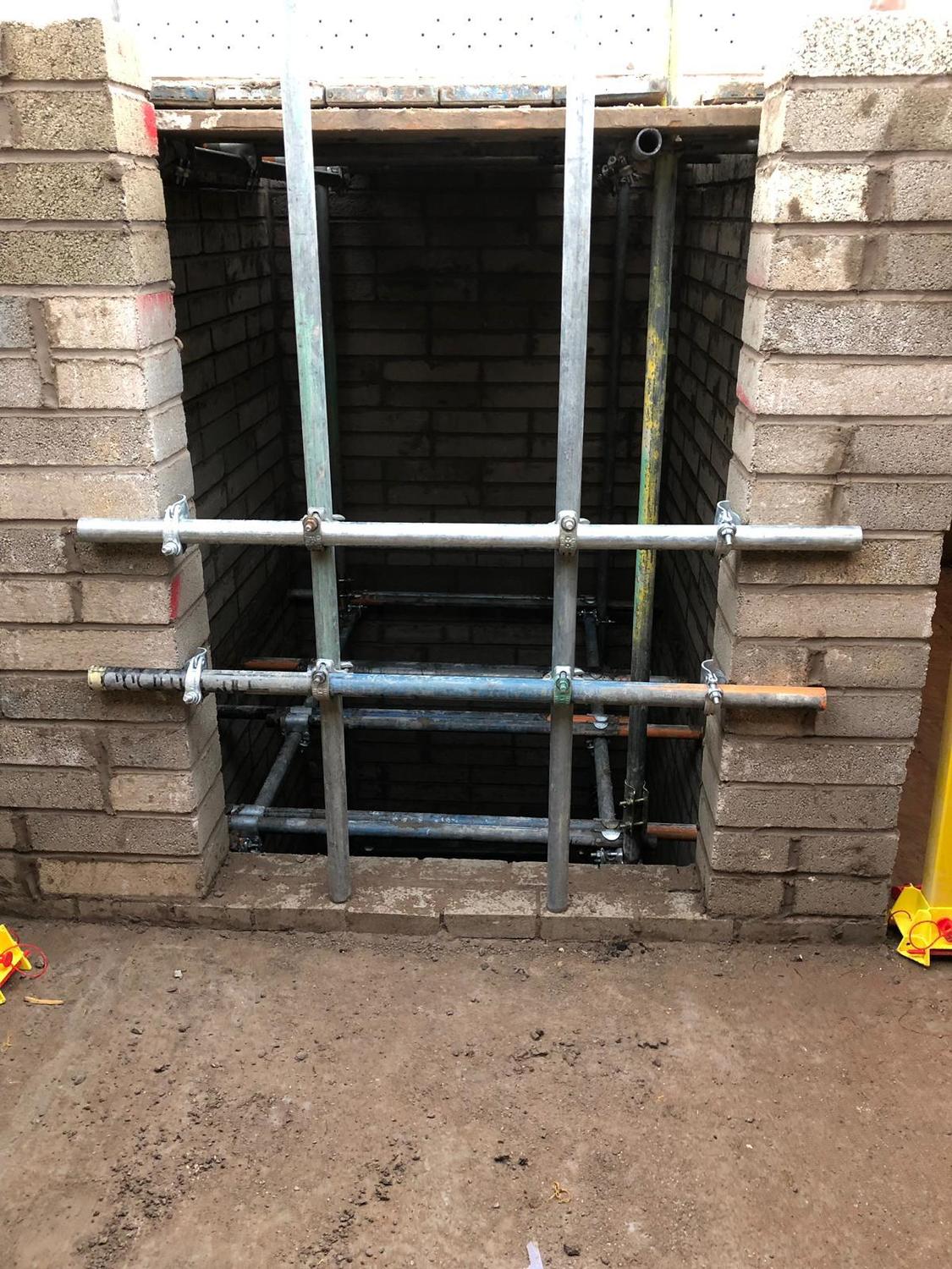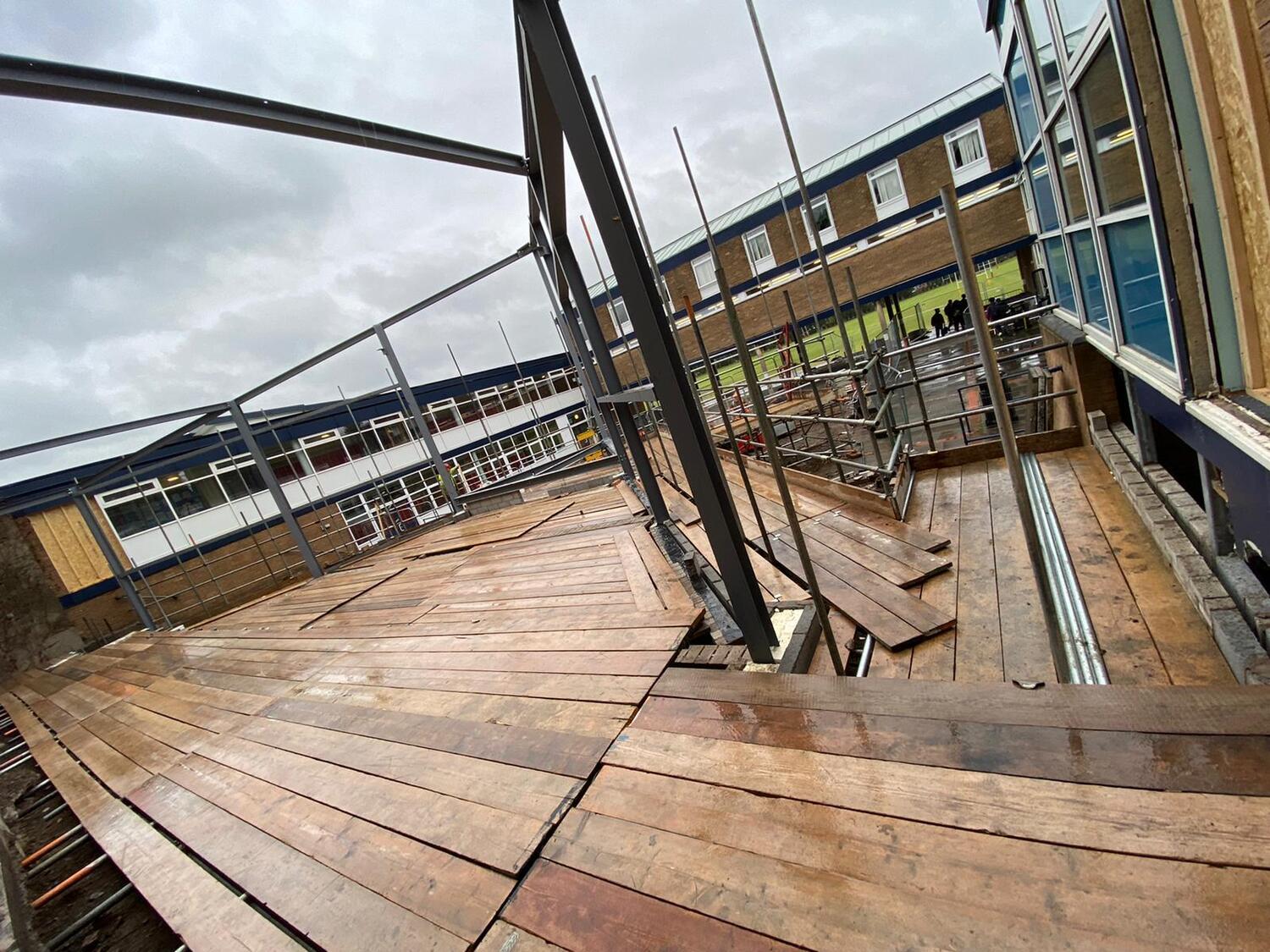 Portway Scaffolding has been tasked to provide a high level access platform to the underside of an atrium on a new prestigious head office building. The design is complicated due to the differing depths of ring beam steel, so in one area the 750mm beams are connected directly to the underside of the steel frame, in other area they are connected to scaffold tube, hung from the underside of the steel frame. The design has had to take into account the reduced capacity of the steel frame. Temporary access scaffold has been erected to the perimeter of the atrium one level below the roof with a 5 board wide cantilever, so that our scaffolders can walk the beams through and connect them to their final fixing point. Due to the reduced loadings of the ground slab, we are using a JLG x25 to act as