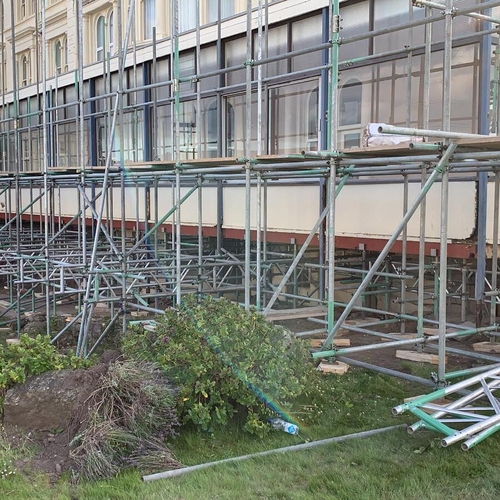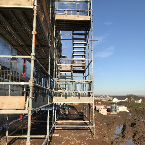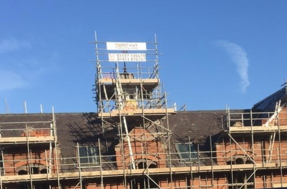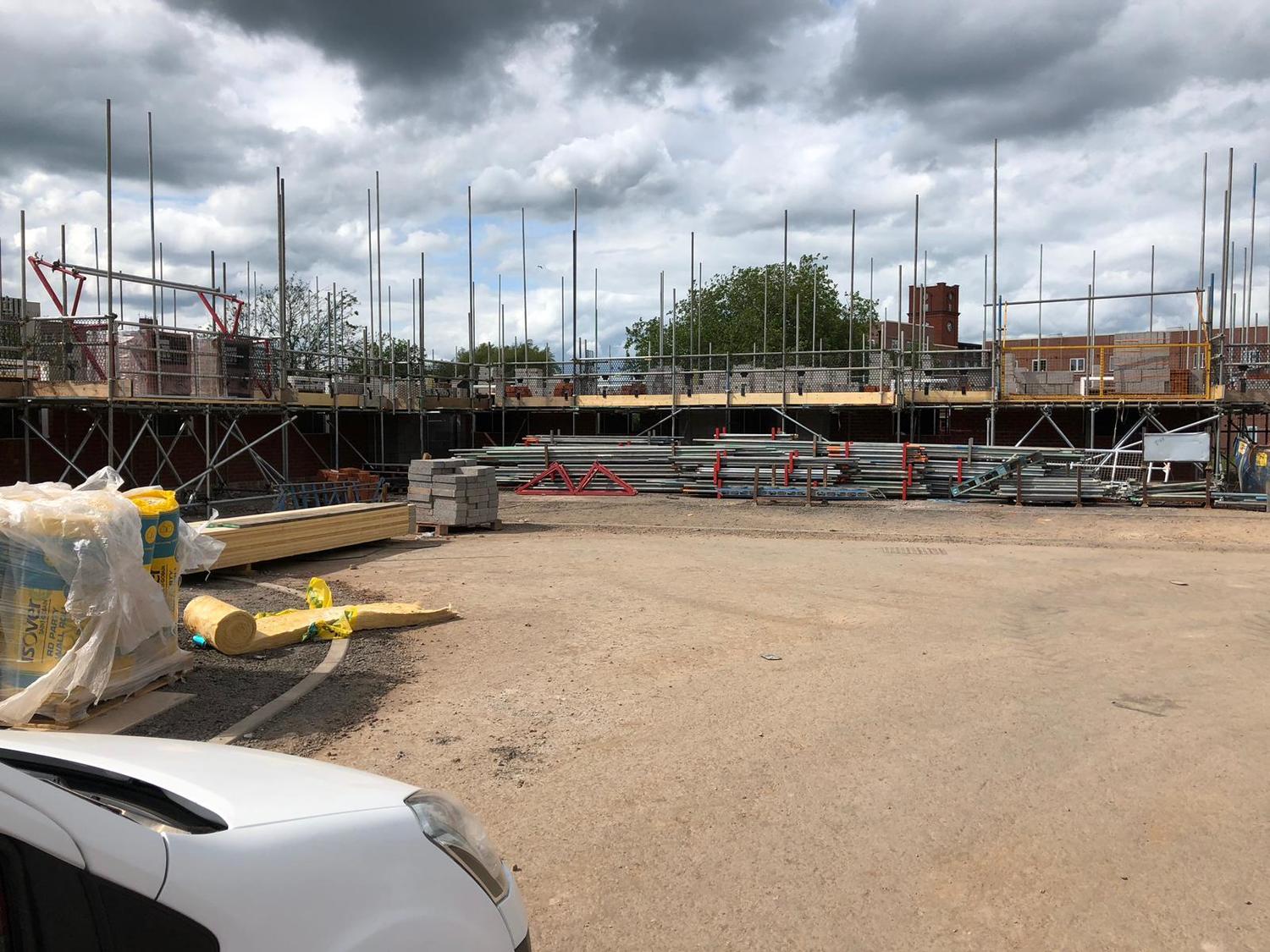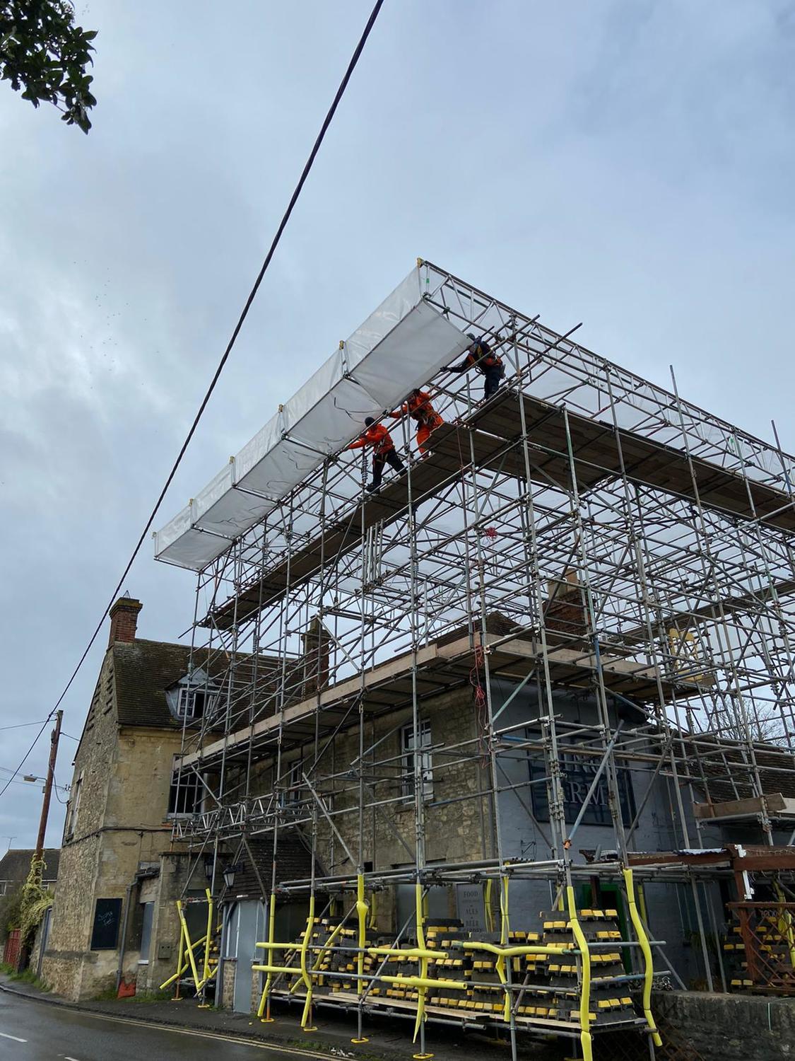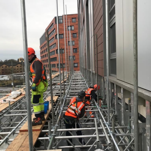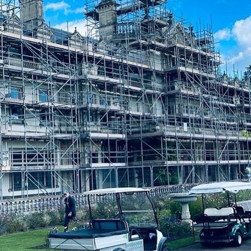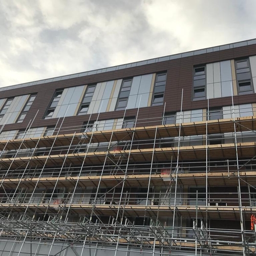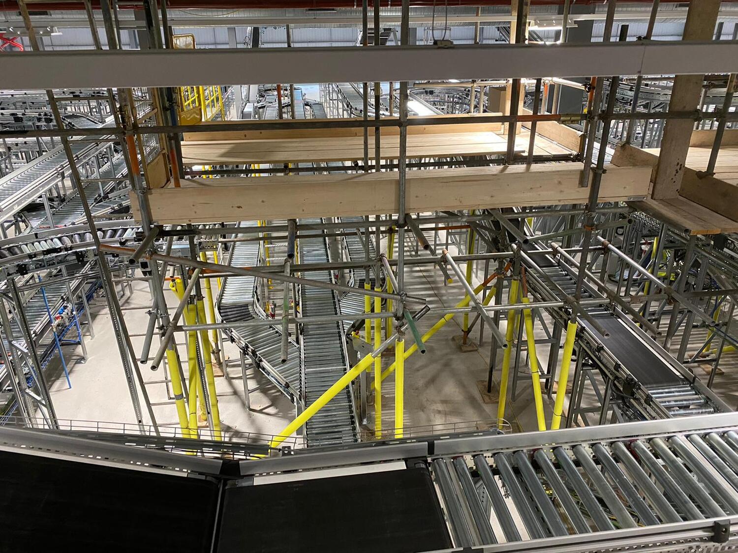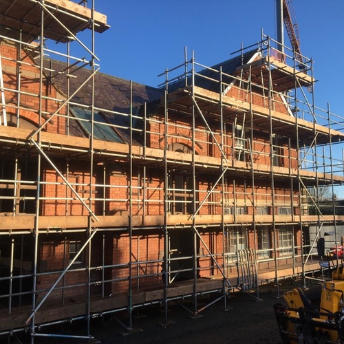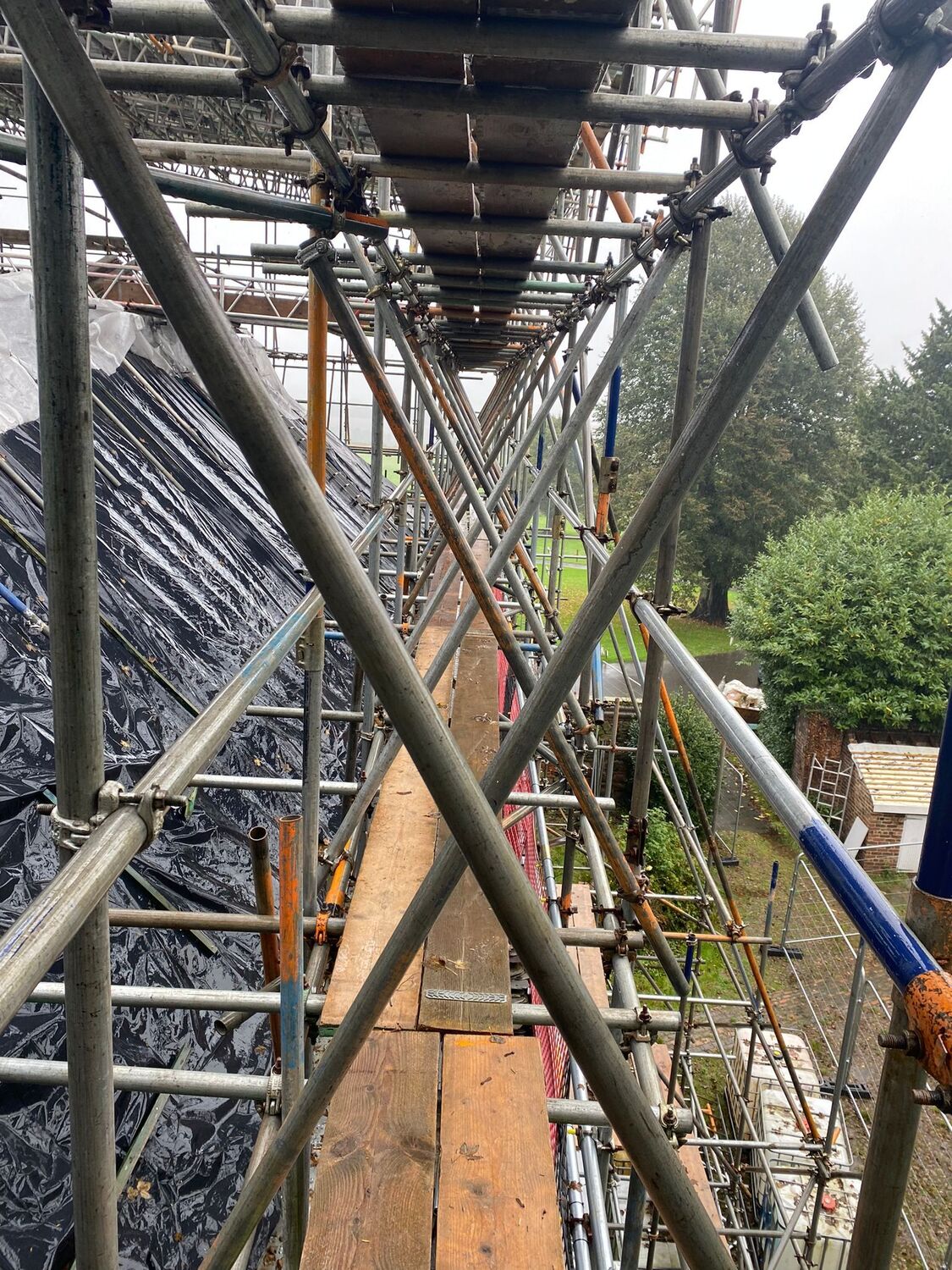 Portway Scaffolding has been tasked to provide a high level access platform to the underside of an atrium on a new prestigious head office building. The design is complicated due to the differing depths of ring beam steel, so in one area the 750mm beams are connected directly to the underside of the steel frame, in other area they are connected to scaffold tube, hung from the underside of the steel frame. The design has had to take into account the reduced capacity of the steel frame. Temporary access scaffold has been erected to the perimeter of the atrium one level below the roof with a 5 board wide cantilever, so that our scaffolders can walk the beams through and connect them to their final fixing point. Due to the reduced loadings of the ground slab, we are using a JLG x25 to act as