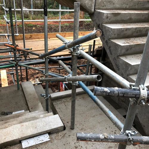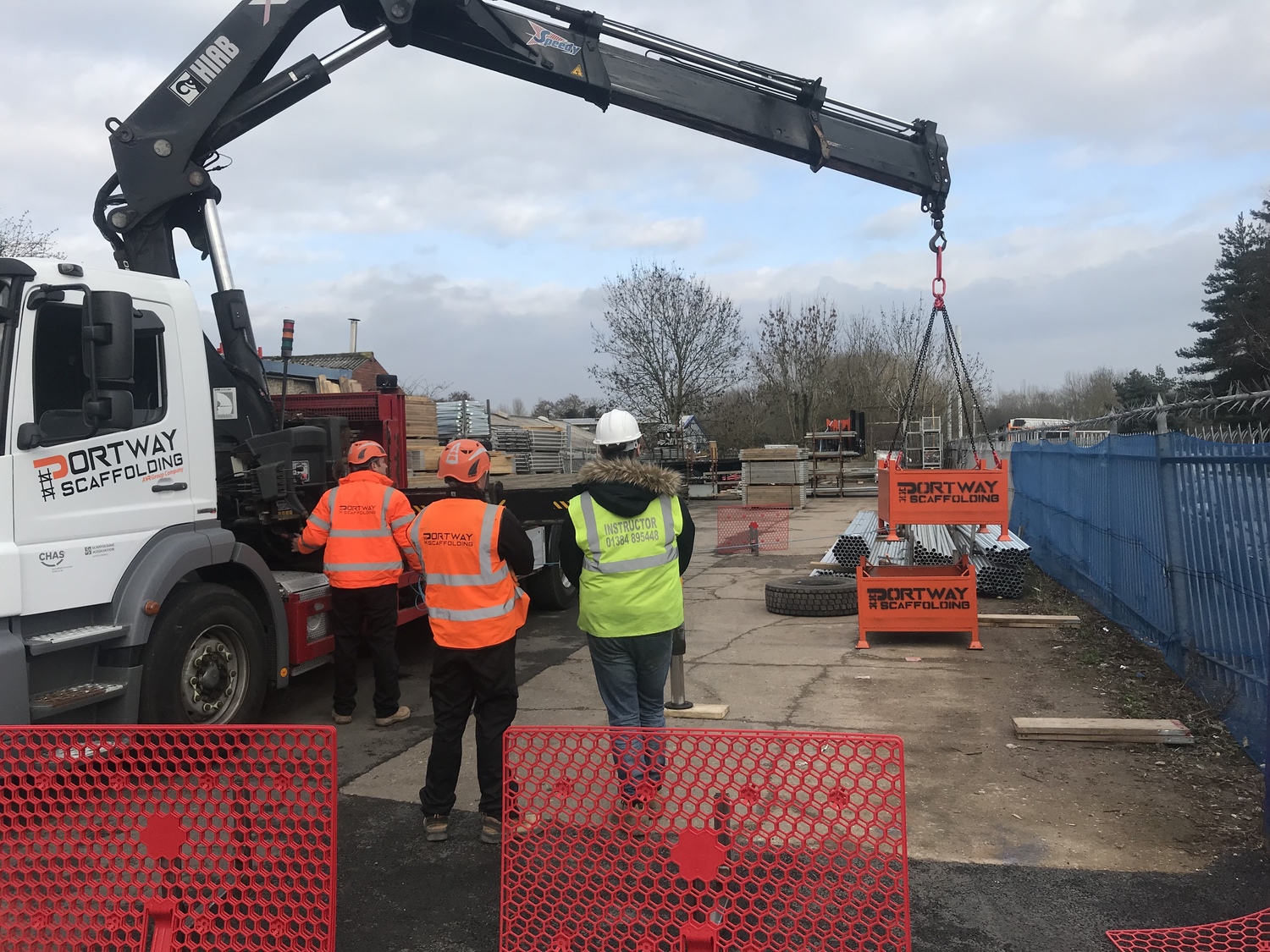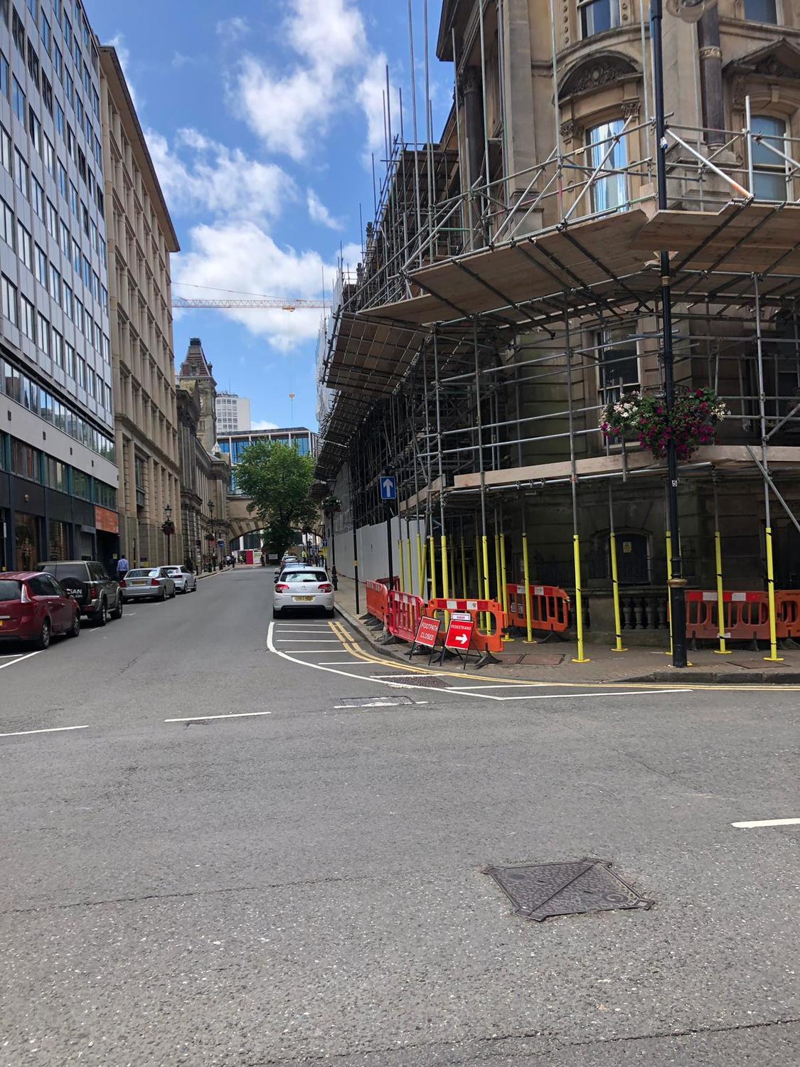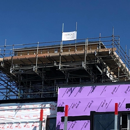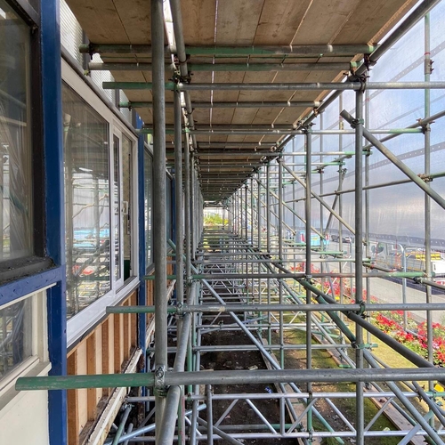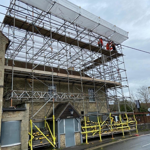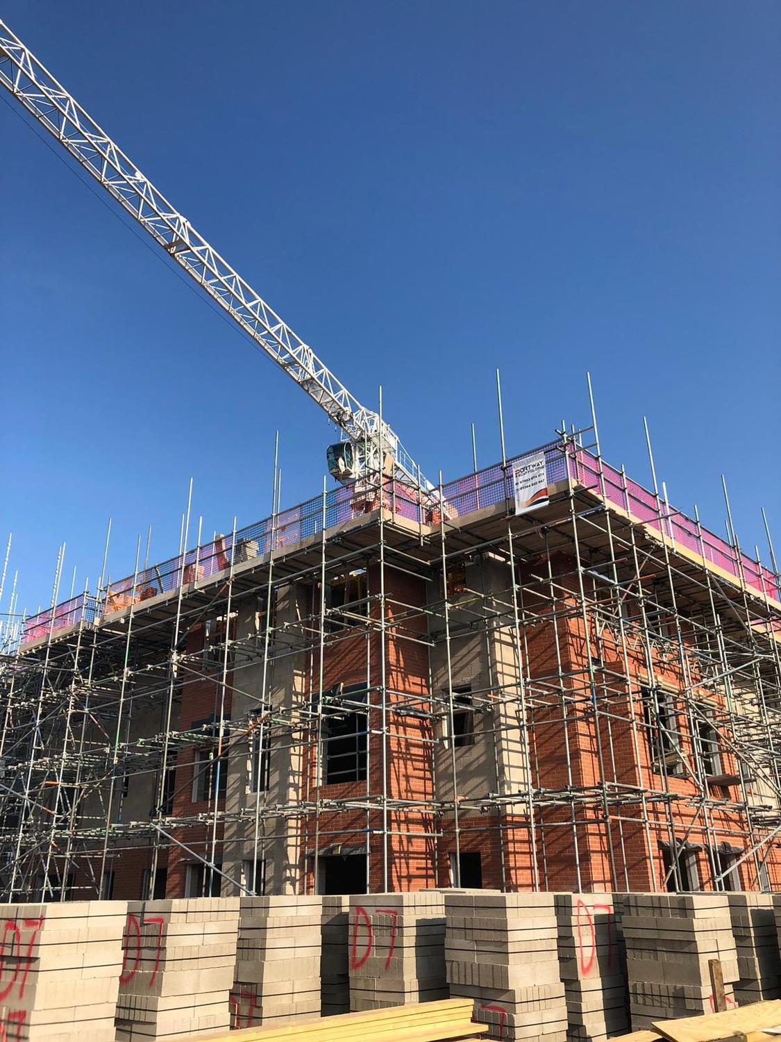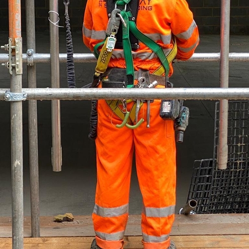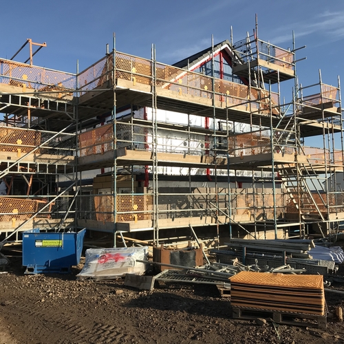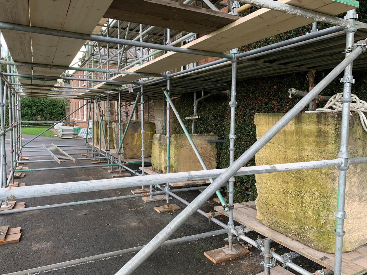 Portway Scaffolding has been tasked to provide a high level access platform to the underside of an atrium on a new prestigious head office building. The design is complicated due to the differing depths of ring beam steel, so in one area the 750mm beams are connected directly to the underside of the steel frame, in other area they are connected to scaffold tube, hung from the underside of the steel frame. The design has had to take into account the reduced capacity of the steel frame. Temporary access scaffold has been erected to the perimeter of the atrium one level below the roof with a 5 board wide cantilever, so that our scaffolders can walk the beams through and connect them to their final fixing point. Due to the reduced loadings of the ground slab, we are using a JLG x25 to act as