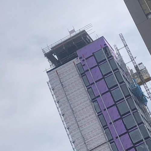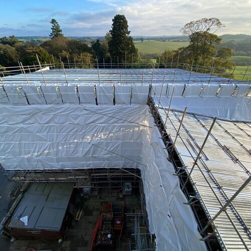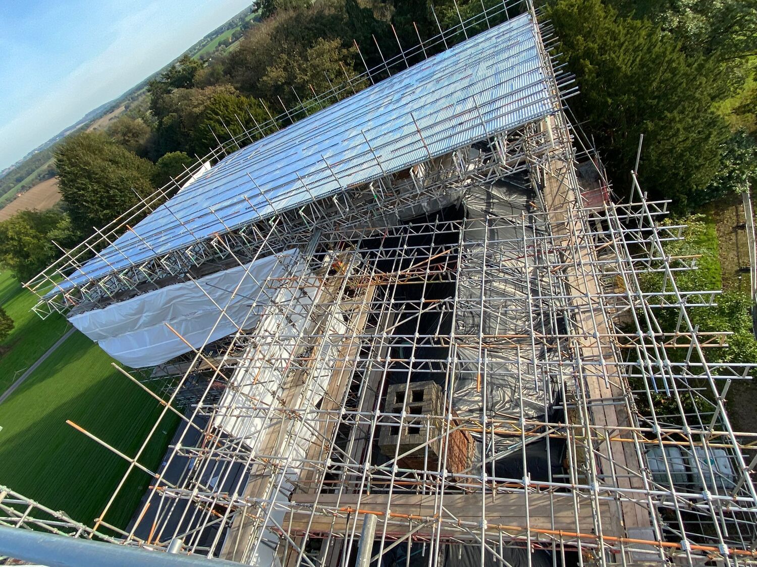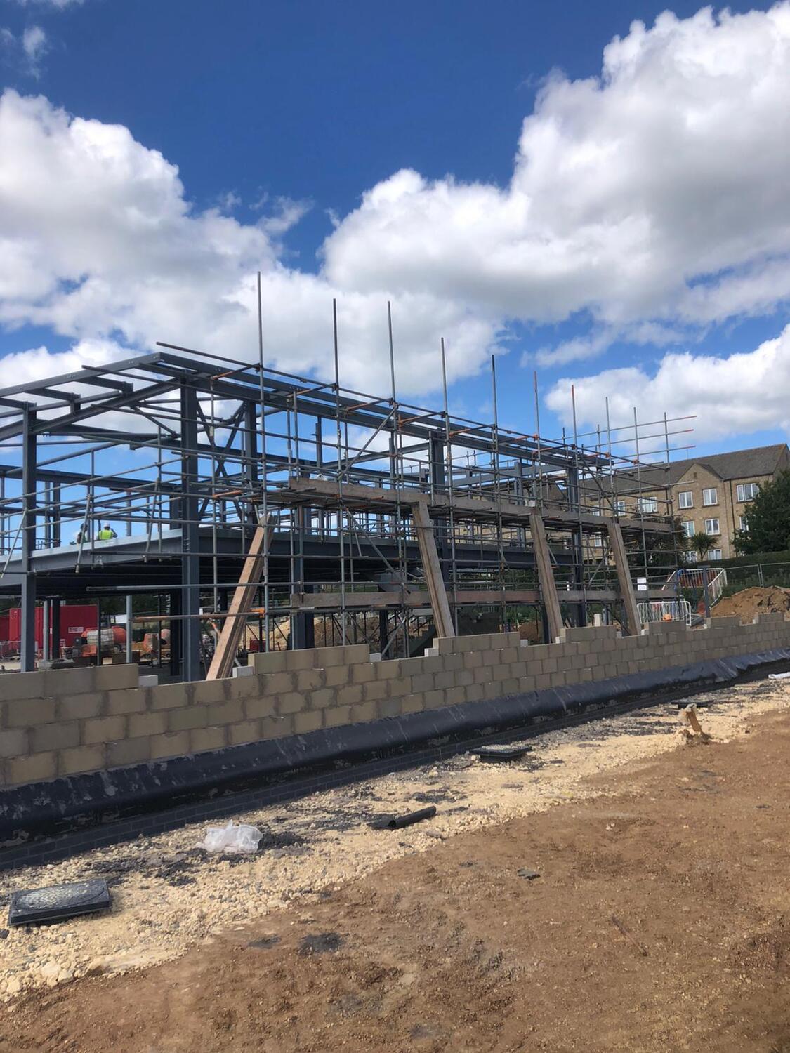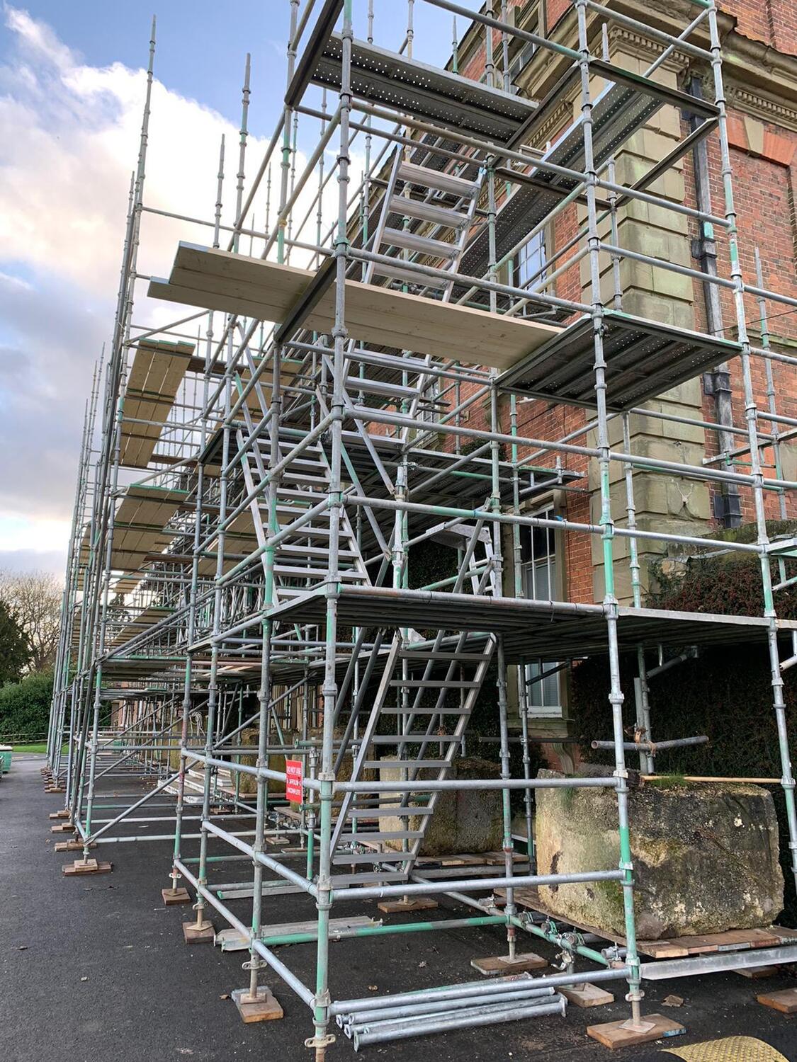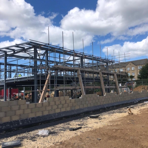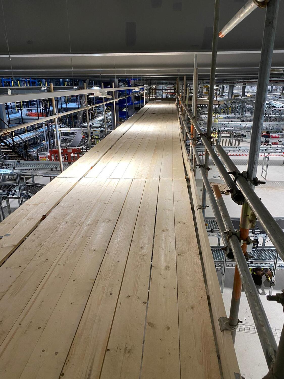 Portway Scaffolding has been tasked to provide a high level access platform to the underside of an atrium on a new prestigious head office building. The design is complicated due to the differing depths of ring beam steel, so in one area the 750mm beams are connected directly to the underside of the steel frame, in other area they are connected to scaffold tube, hung from the underside of the steel frame. The design has had to take into account the reduced capacity of the steel frame. Temporary access scaffold has been erected to the perimeter of the atrium one level below the roof with a 5 board wide cantilever, so that our scaffolders can walk the beams through and connect them to their final fixing point. Due to the reduced loadings of the ground slab, we are using a JLG x25 to act as