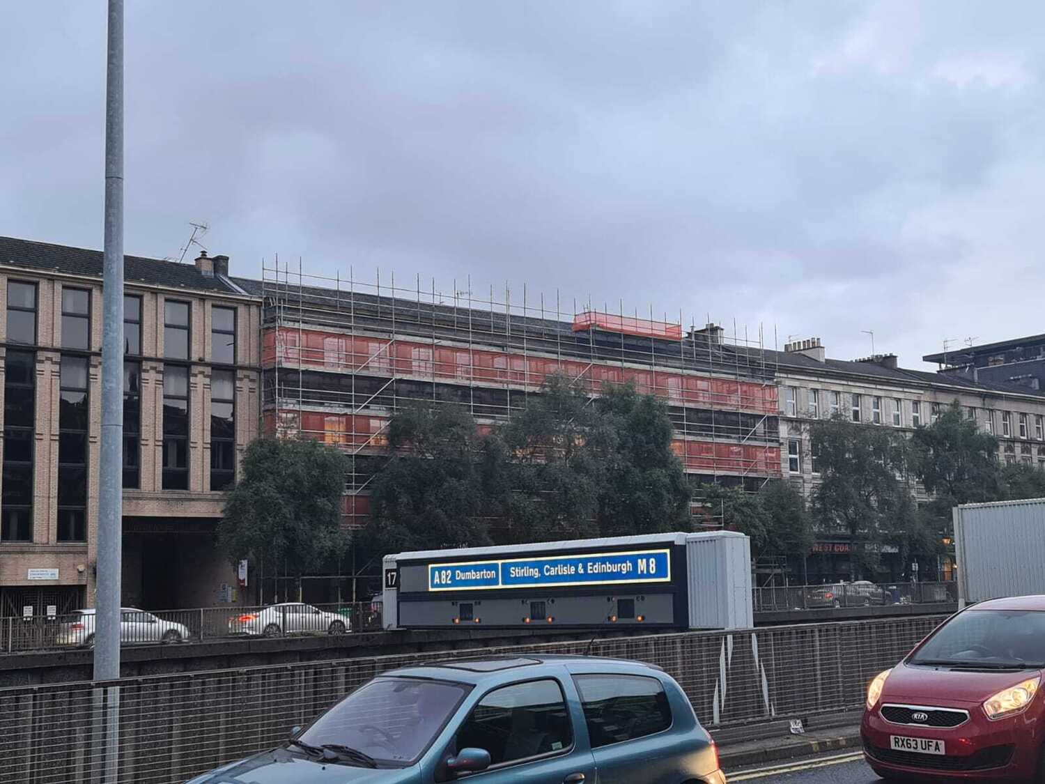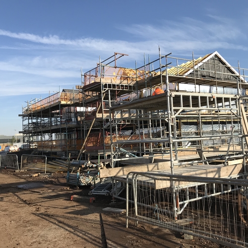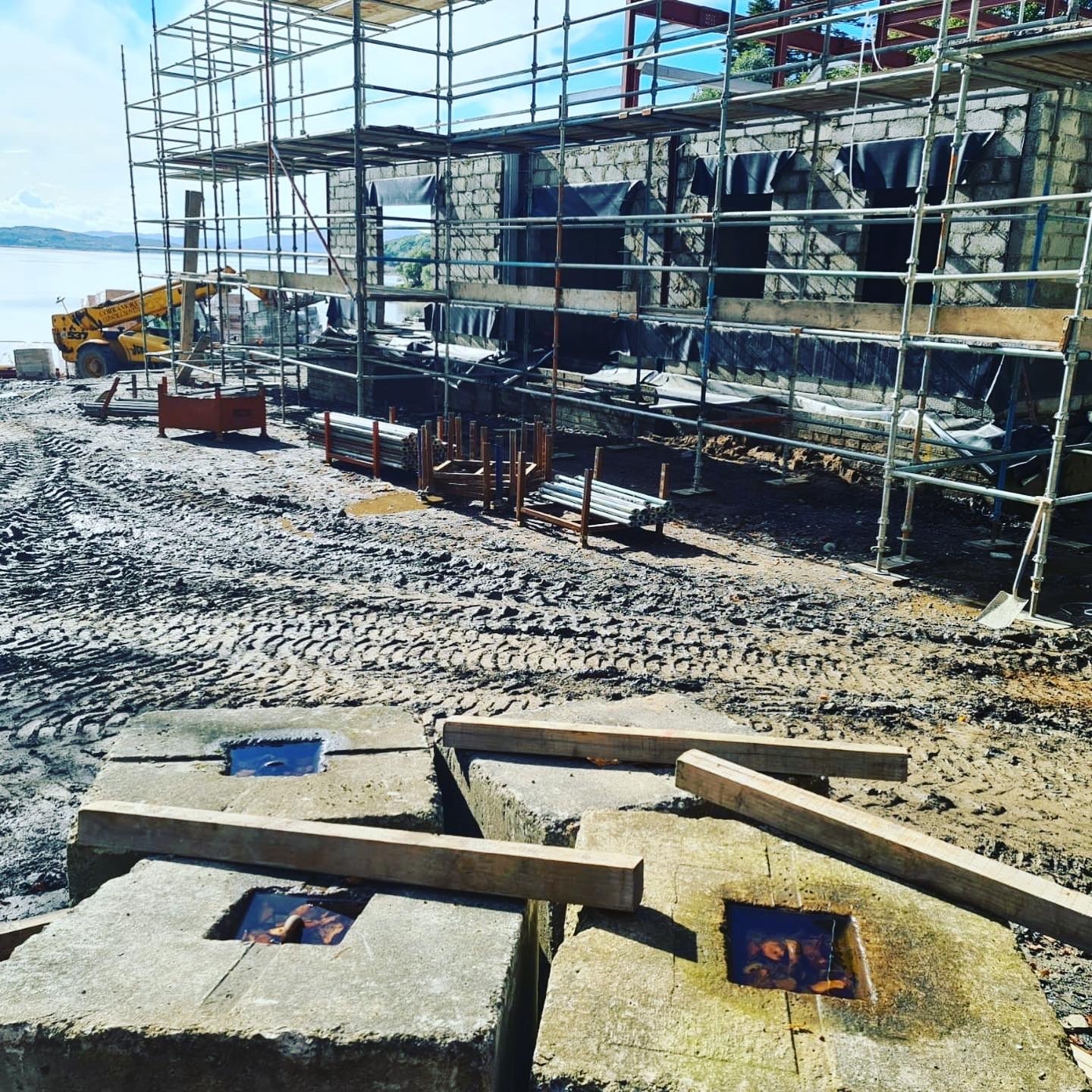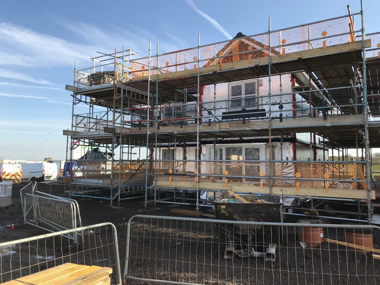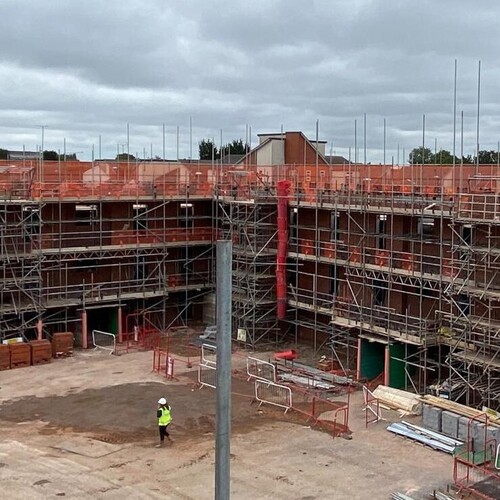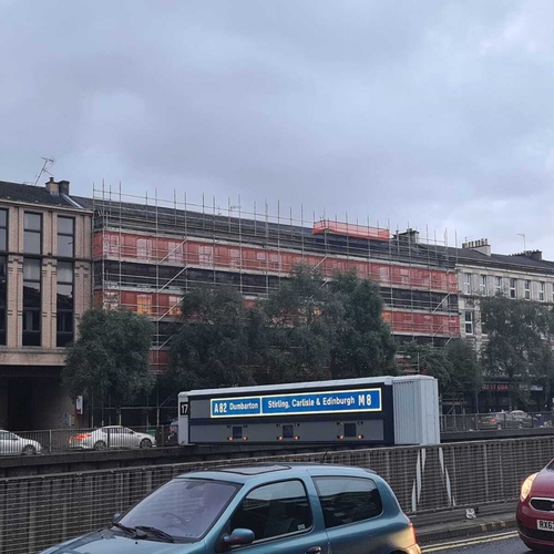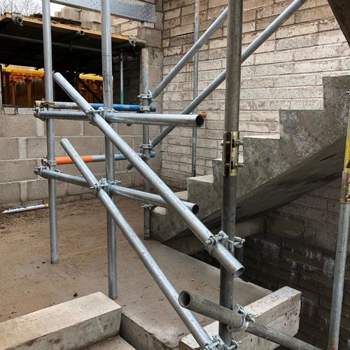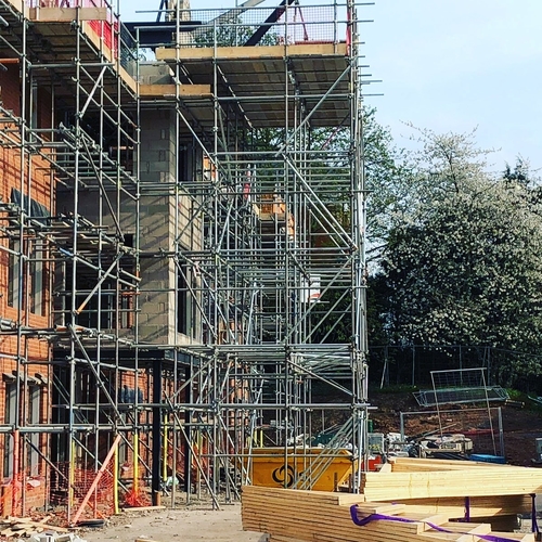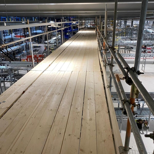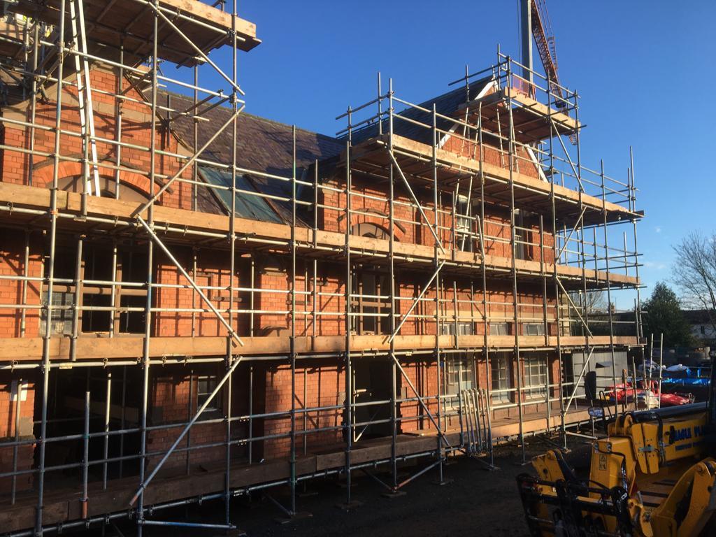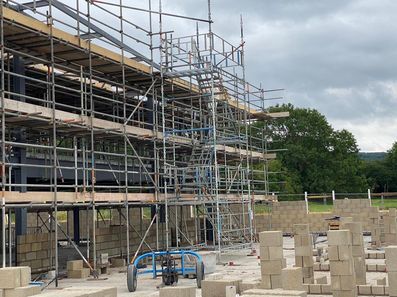 Portway Scaffolding has been tasked to provide a high level access platform to the underside of an atrium on a new prestigious head office building. The design is complicated due to the differing depths of ring beam steel, so in one area the 750mm beams are connected directly to the underside of the steel frame, in other area they are connected to scaffold tube, hung from the underside of the steel frame. The design has had to take into account the reduced capacity of the steel frame. Temporary access scaffold has been erected to the perimeter of the atrium one level below the roof with a 5 board wide cantilever, so that our scaffolders can walk the beams through and connect them to their final fixing point. Due to the reduced loadings of the ground slab, we are using a JLG x25 to act as