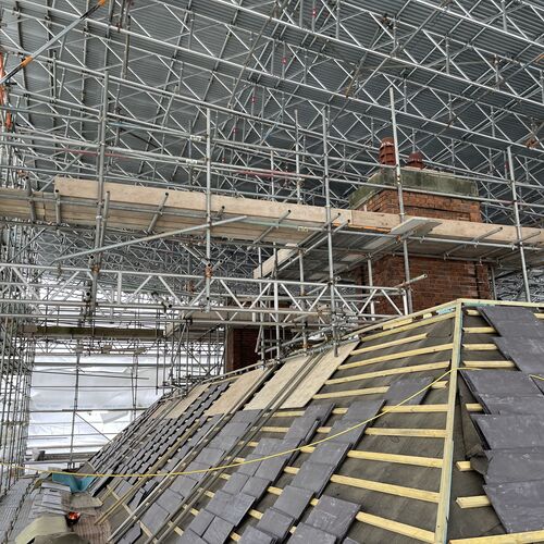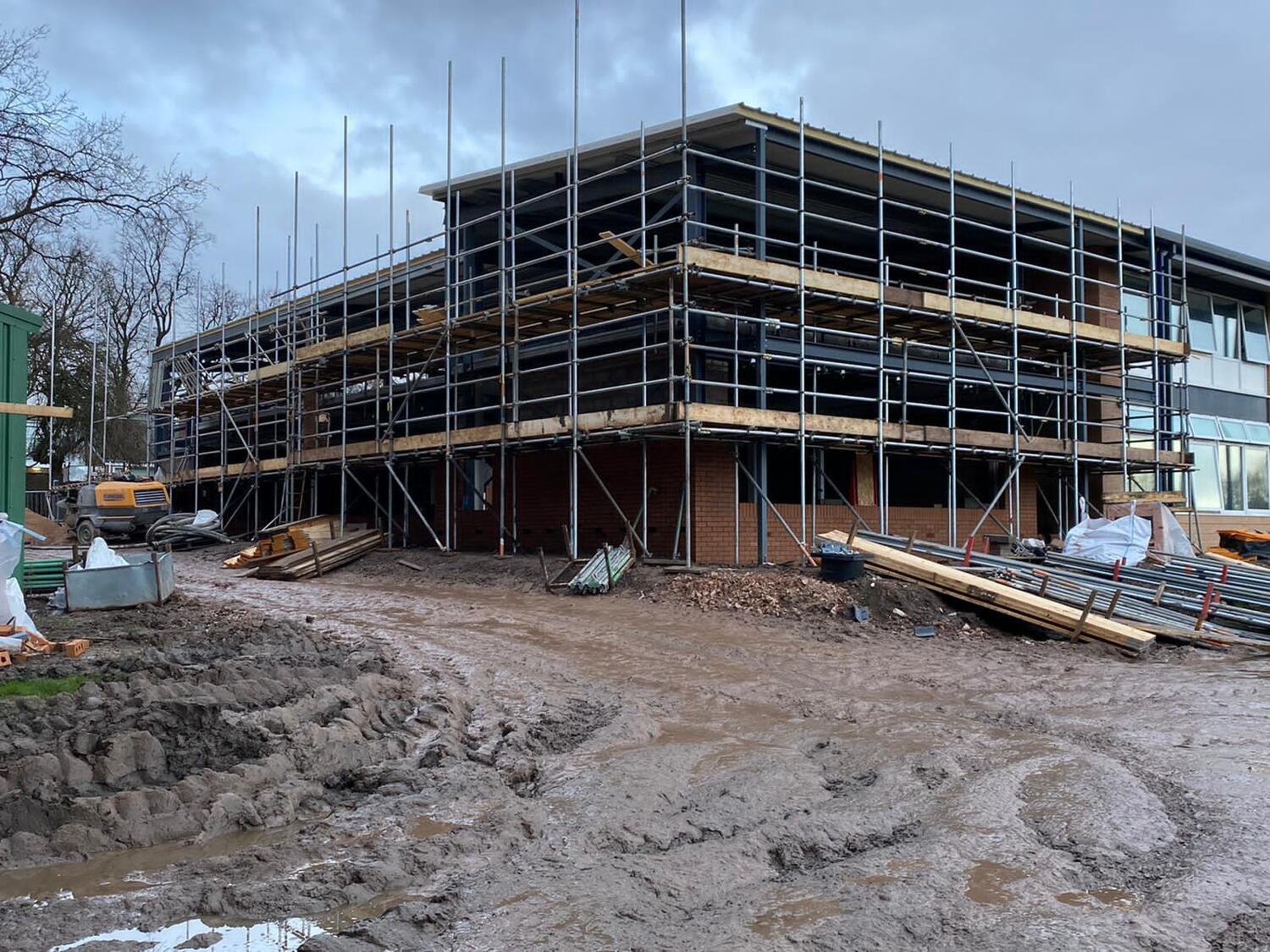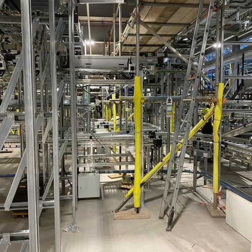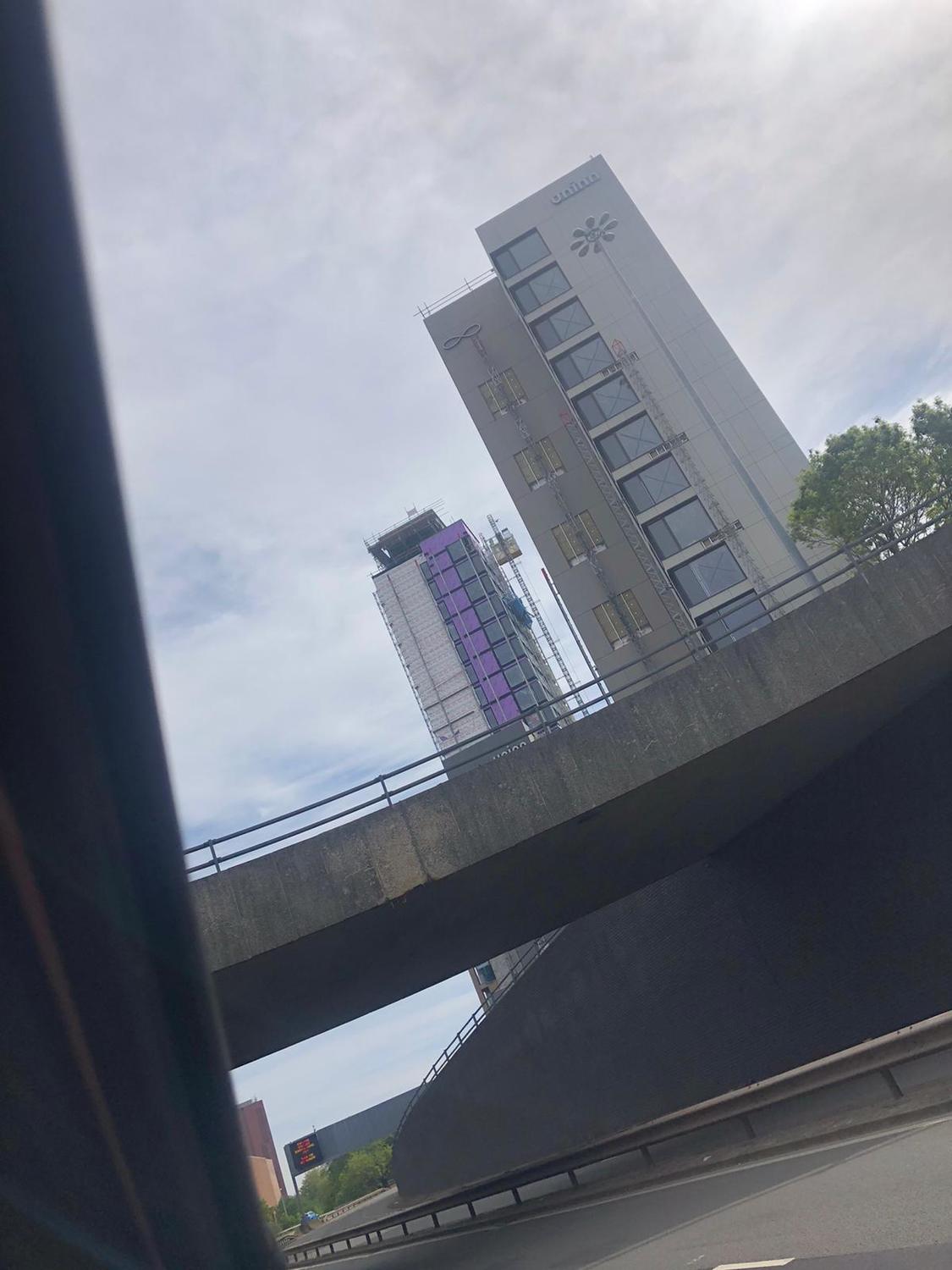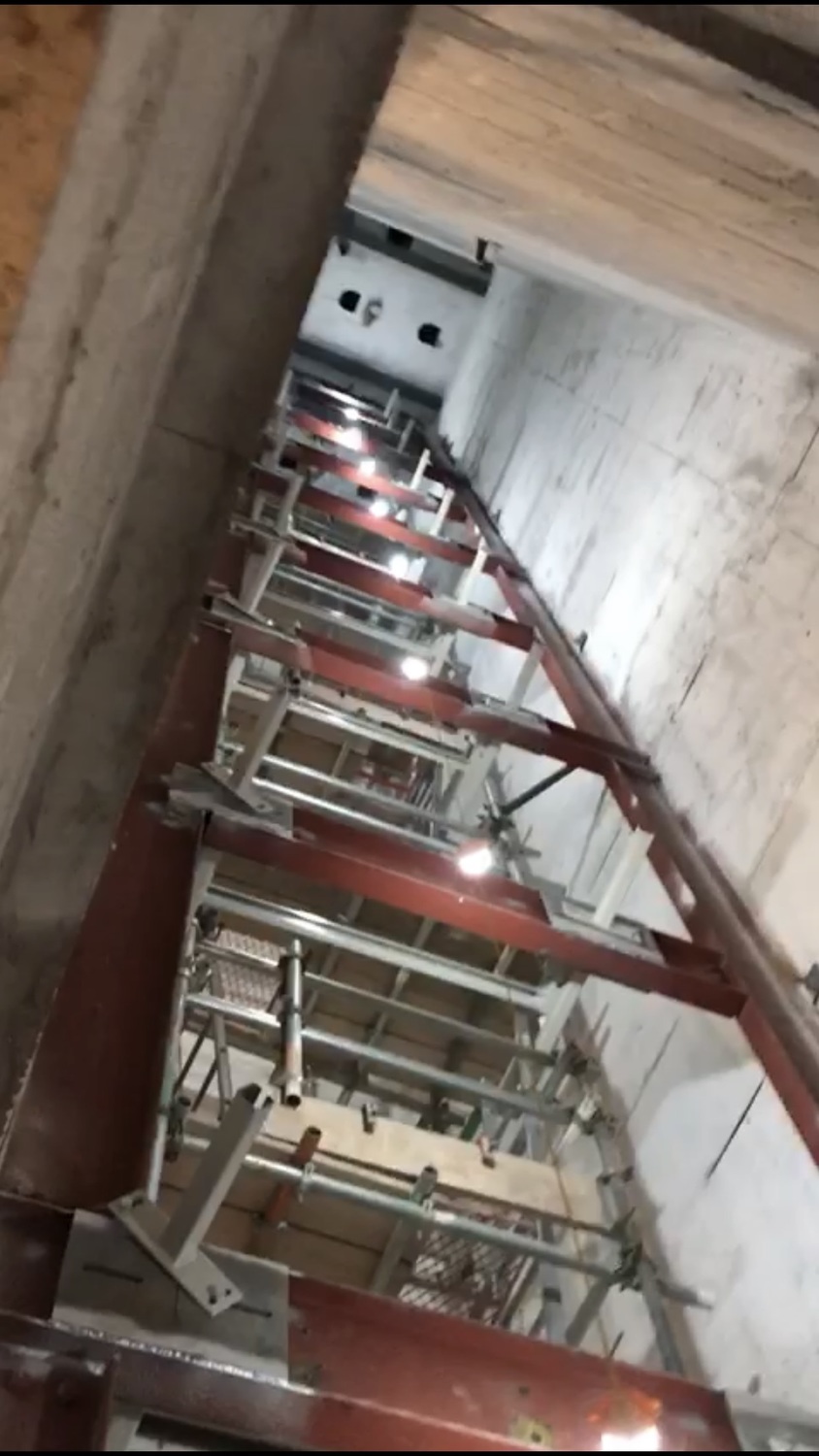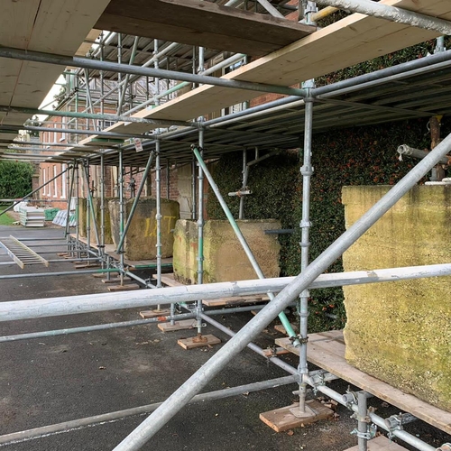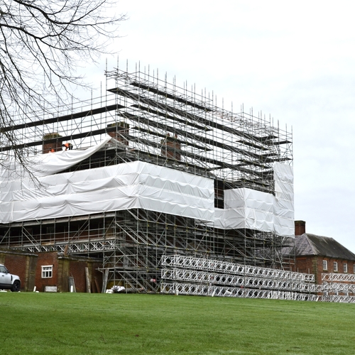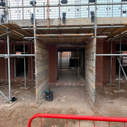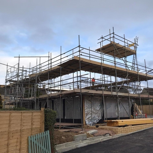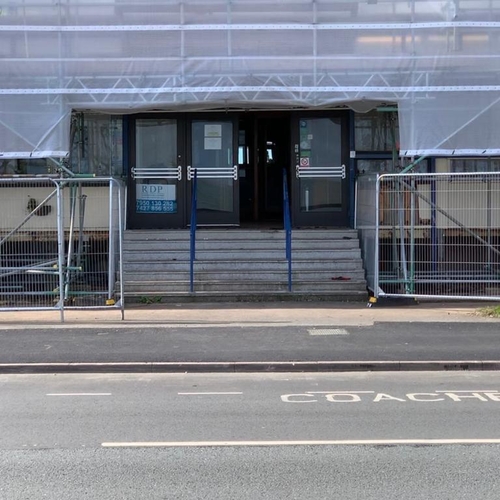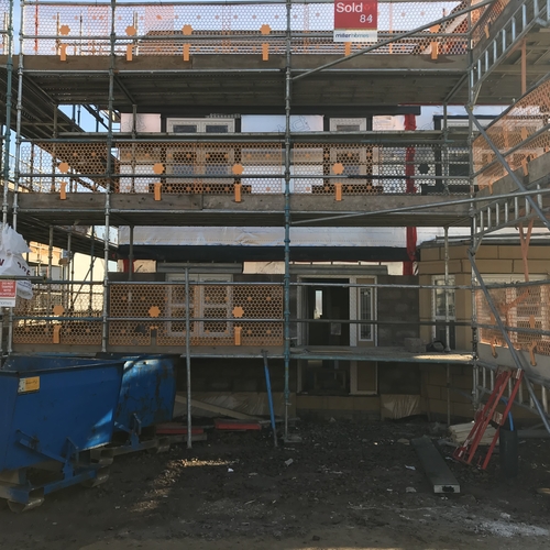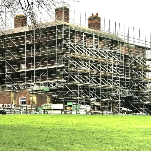 Portway Scaffolding has been tasked to provide a high level access platform to the underside of an atrium on a new prestigious head office building. The design is complicated due to the differing depths of ring beam steel, so in one area the 750mm beams are connected directly to the underside of the steel frame, in other area they are connected to scaffold tube, hung from the underside of the steel frame. The design has had to take into account the reduced capacity of the steel frame. Temporary access scaffold has been erected to the perimeter of the atrium one level below the roof with a 5 board wide cantilever, so that our scaffolders can walk the beams through and connect them to their final fixing point. Due to the reduced loadings of the ground slab, we are using a JLG x25 to act as