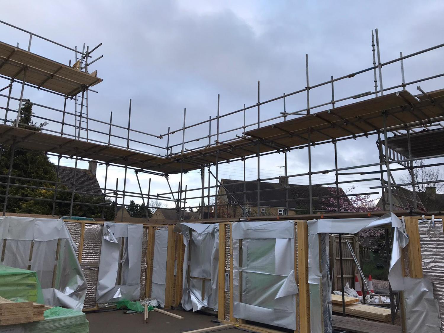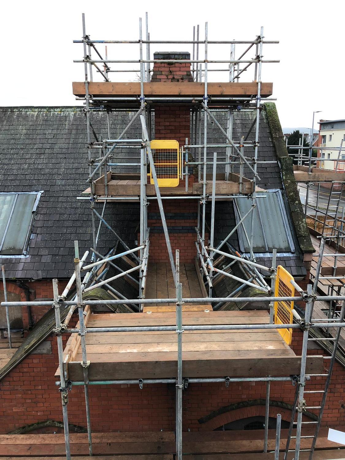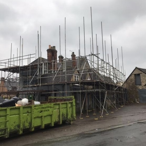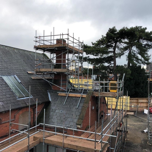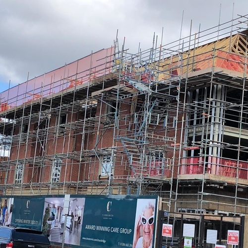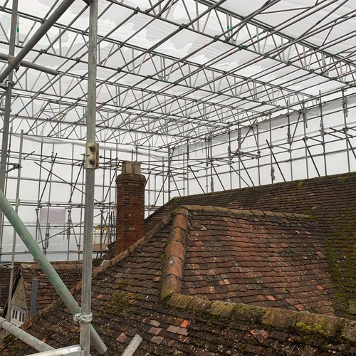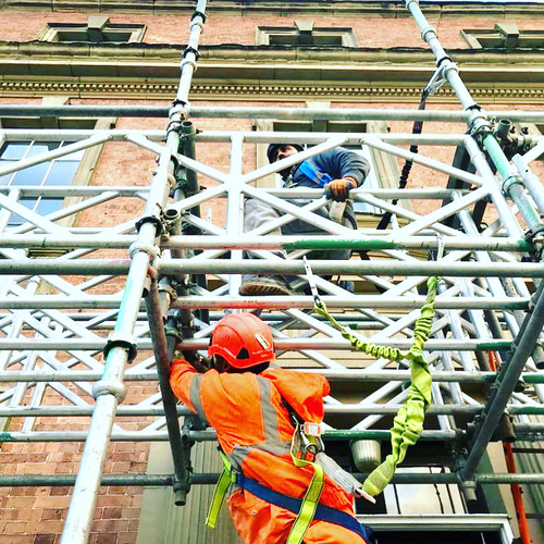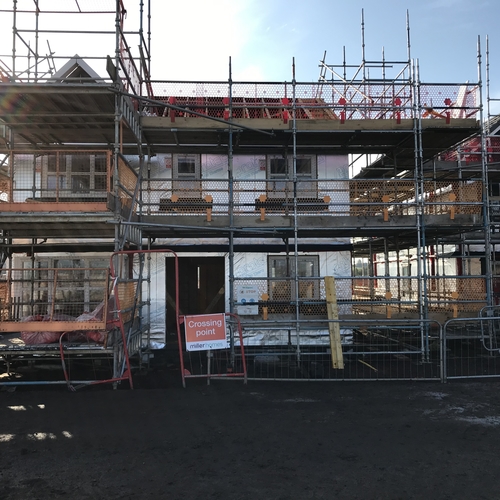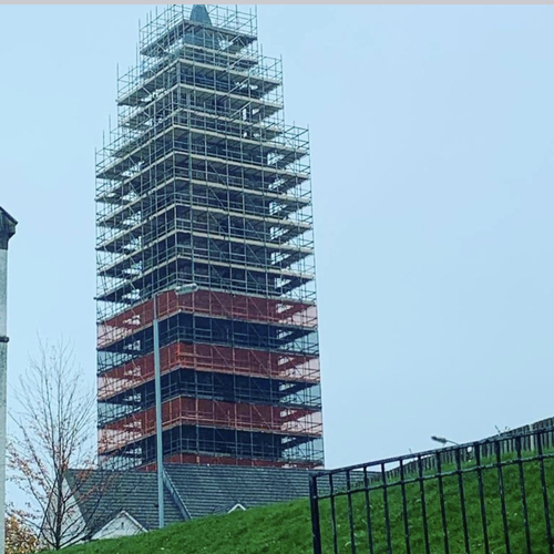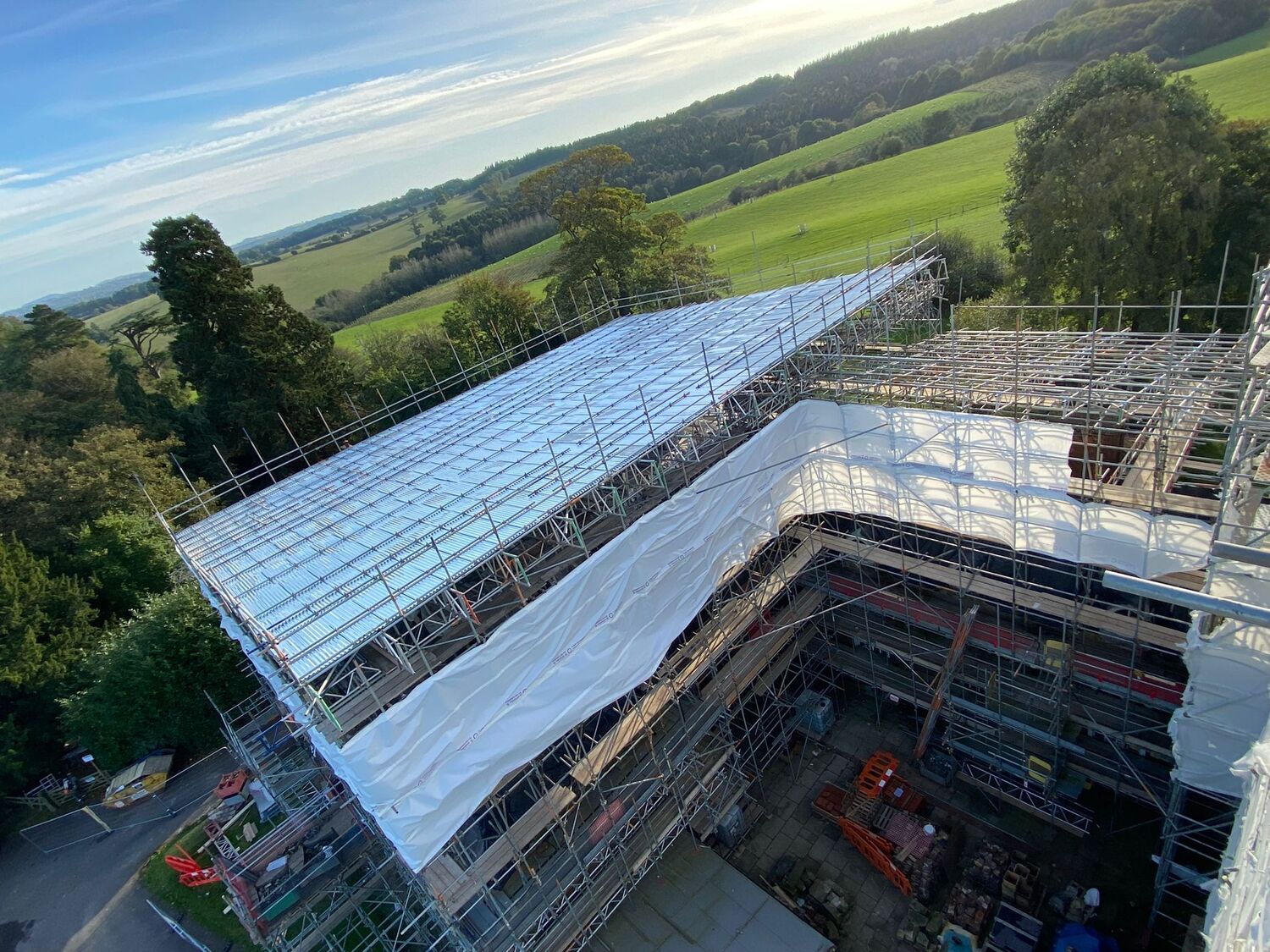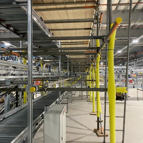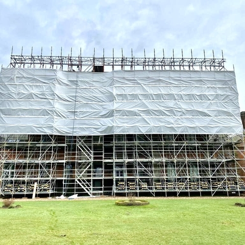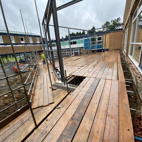 Portway Scaffolding has been tasked to provide a high level access platform to the underside of an atrium on a new prestigious head office building. The design is complicated due to the differing depths of ring beam steel, so in one area the 750mm beams are connected directly to the underside of the steel frame, in other area they are connected to scaffold tube, hung from the underside of the steel frame. The design has had to take into account the reduced capacity of the steel frame. Temporary access scaffold has been erected to the perimeter of the atrium one level below the roof with a 5 board wide cantilever, so that our scaffolders can walk the beams through and connect them to their final fixing point. Due to the reduced loadings of the ground slab, we are using a JLG x25 to act as