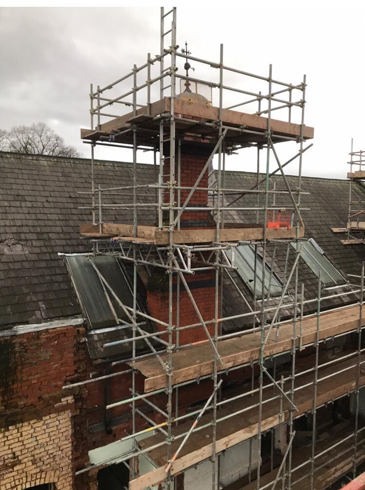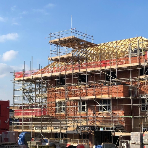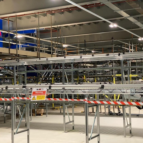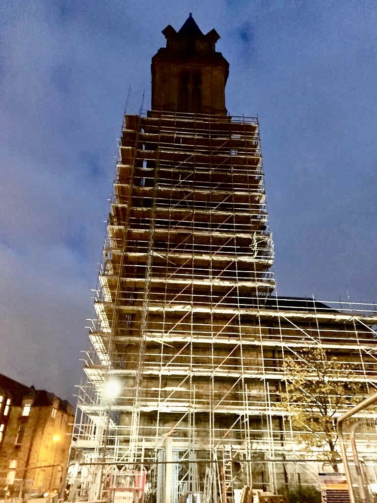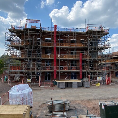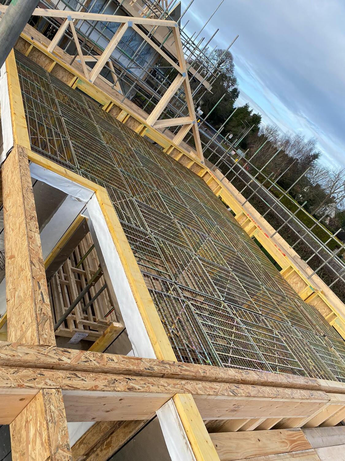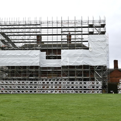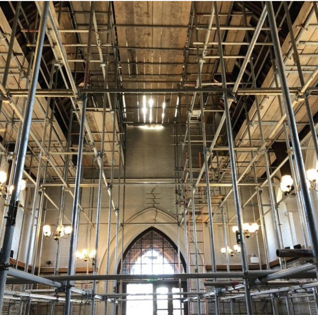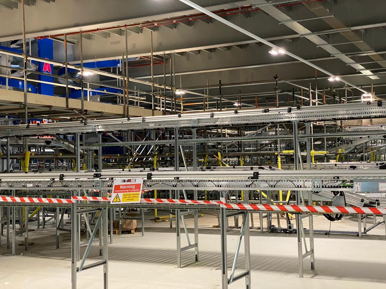 Portway Scaffolding has been tasked to provide a high level access platform to the underside of an atrium on a new prestigious head office building. The design is complicated due to the differing depths of ring beam steel, so in one area the 750mm beams are connected directly to the underside of the steel frame, in other area they are connected to scaffold tube, hung from the underside of the steel frame. The design has had to take into account the reduced capacity of the steel frame. Temporary access scaffold has been erected to the perimeter of the atrium one level below the roof with a 5 board wide cantilever, so that our scaffolders can walk the beams through and connect them to their final fixing point. Due to the reduced loadings of the ground slab, we are using a JLG x25 to act as
