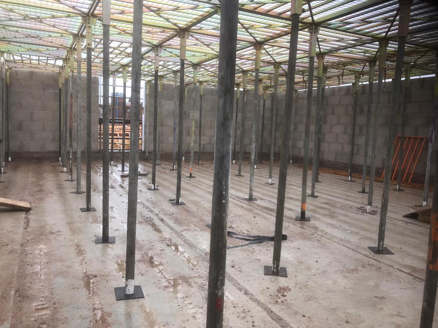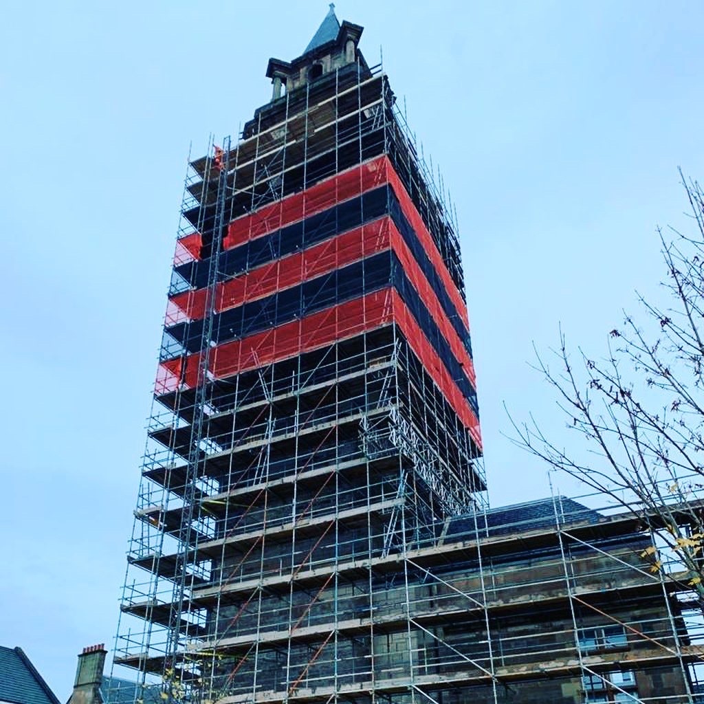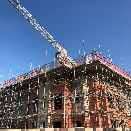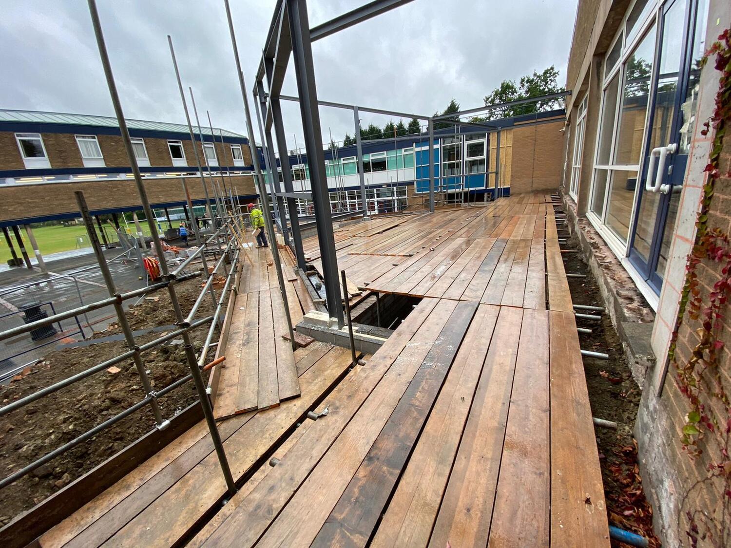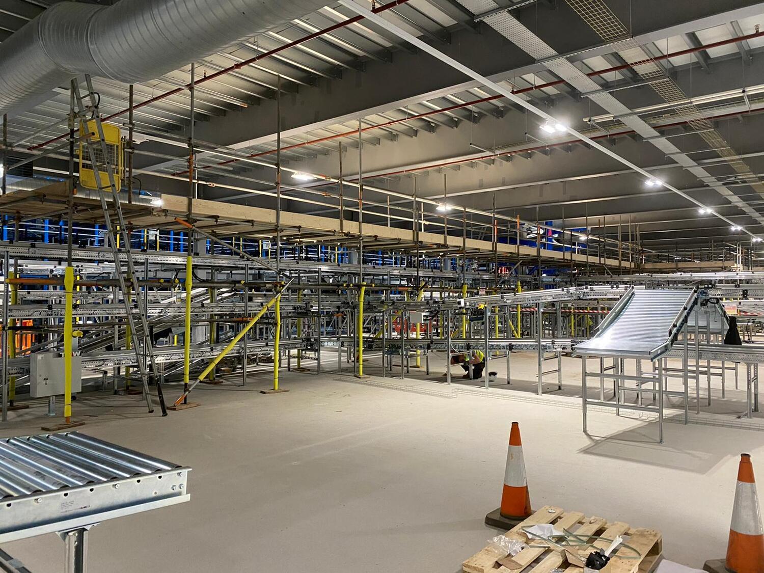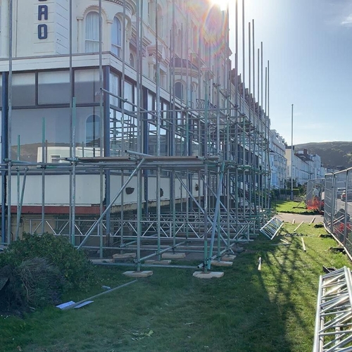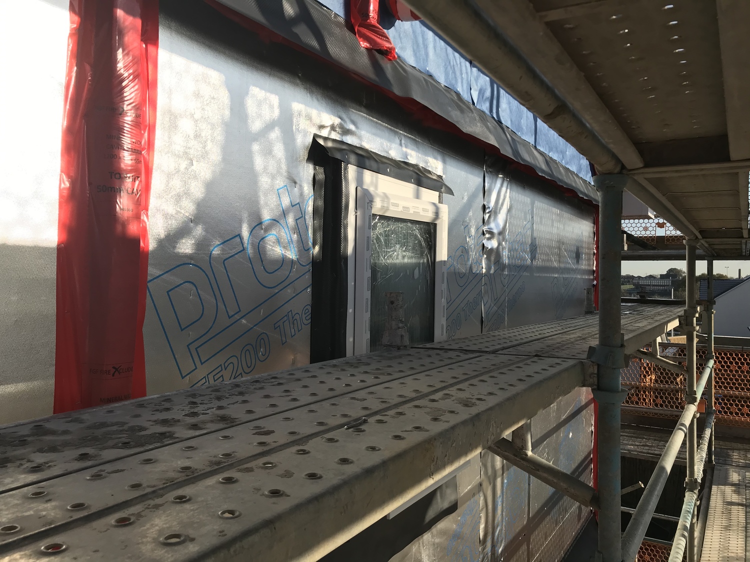 Portway Scaffolding has been tasked to provide a high level access platform to the underside of an atrium on a new prestigious head office building. The design is complicated due to the differing depths of ring beam steel, so in one area the 750mm beams are connected directly to the underside of the steel frame, in other area they are connected to scaffold tube, hung from the underside of the steel frame. The design has had to take into account the reduced capacity of the steel frame. Temporary access scaffold has been erected to the perimeter of the atrium one level below the roof with a 5 board wide cantilever, so that our scaffolders can walk the beams through and connect them to their final fixing point. Due to the reduced loadings of the ground slab, we are using a JLG x25 to act as