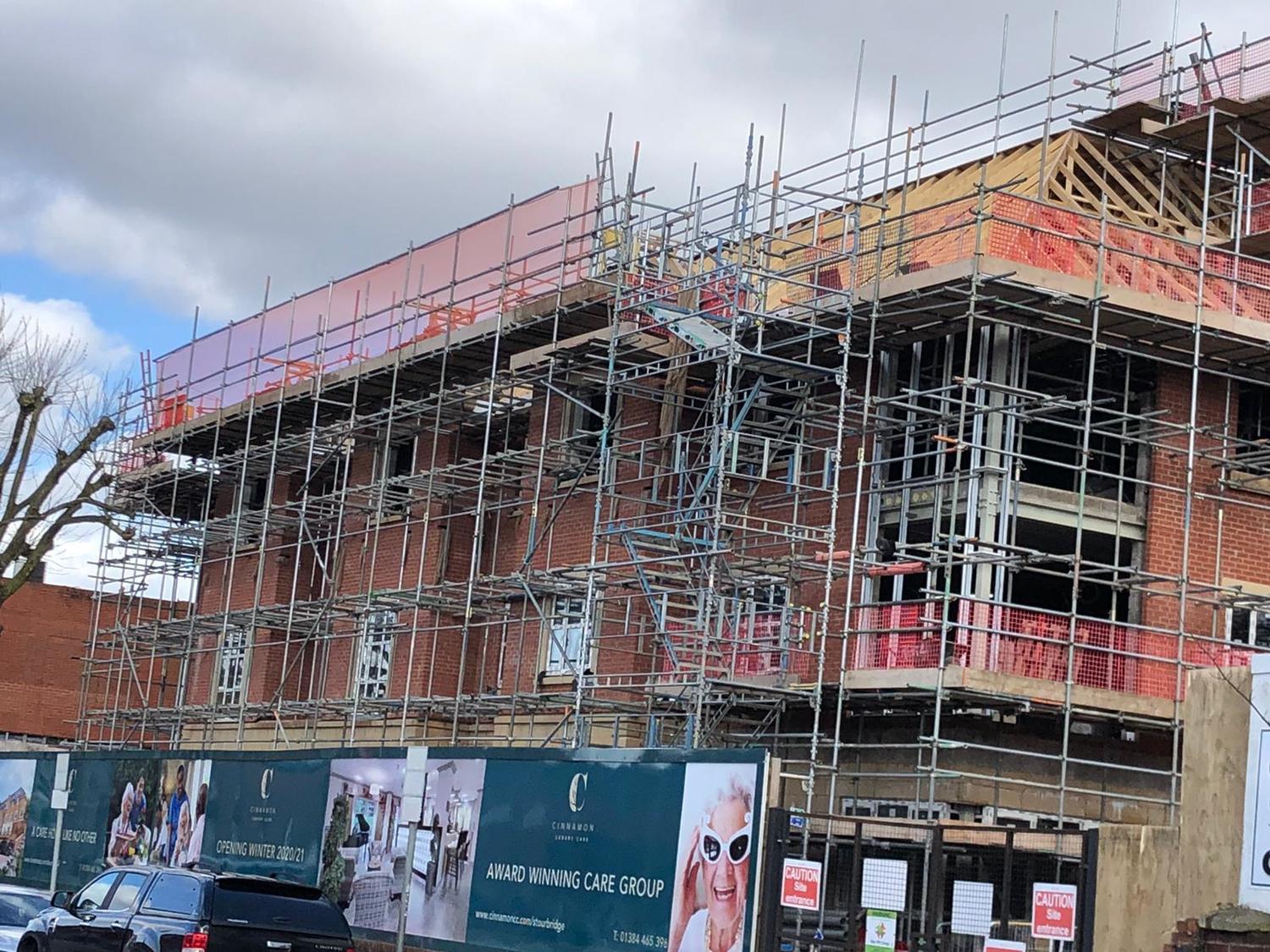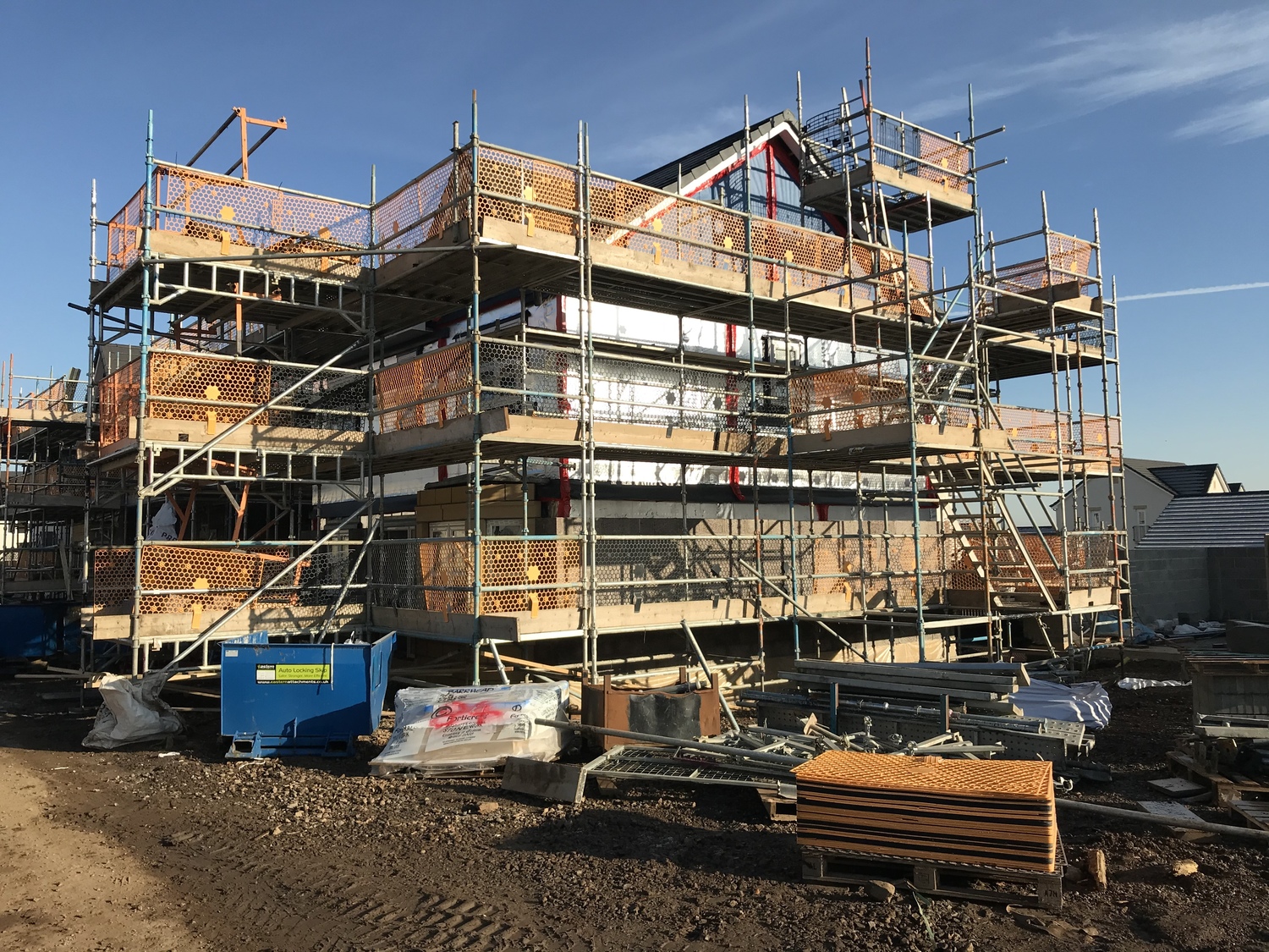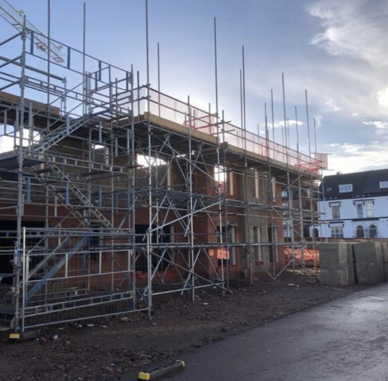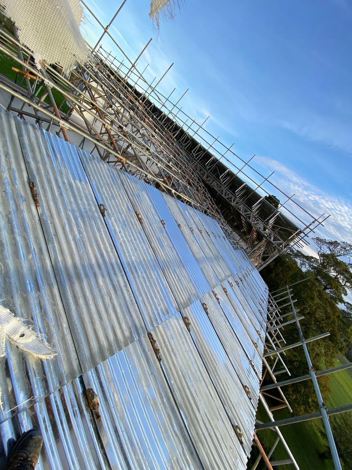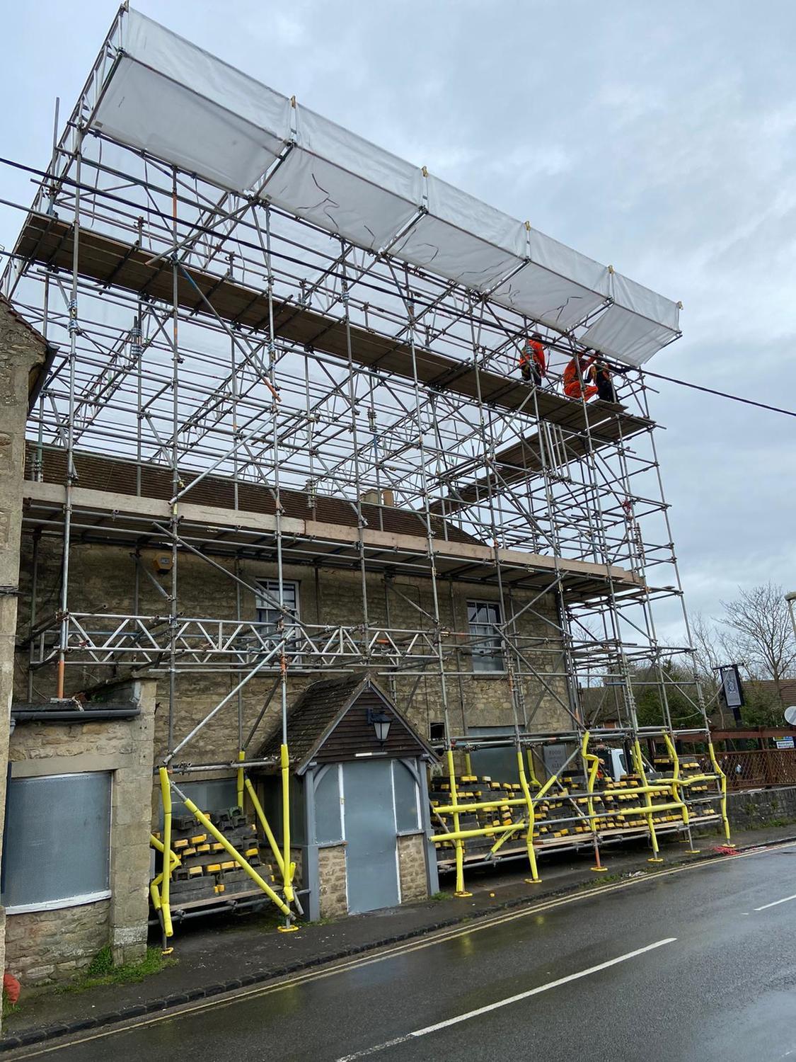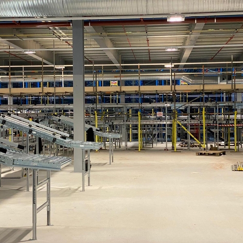 Portway Scaffolding has been tasked to provide a high level access platform to the underside of an atrium on a new prestigious head office building. The design is complicated due to the differing depths of ring beam steel, so in one area the 750mm beams are connected directly to the underside of the steel frame, in other area they are connected to scaffold tube, hung from the underside of the steel frame. The design has had to take into account the reduced capacity of the steel frame. Temporary access scaffold has been erected to the perimeter of the atrium one level below the roof with a 5 board wide cantilever, so that our scaffolders can walk the beams through and connect them to their final fixing point. Due to the reduced loadings of the ground slab, we are using a JLG x25 to act as