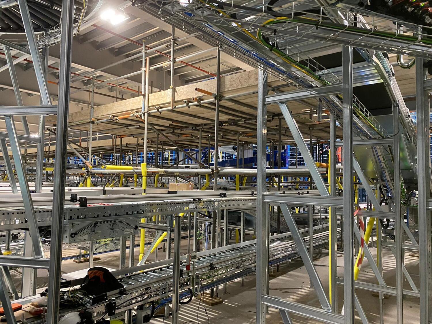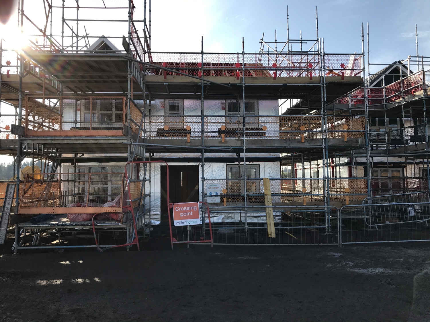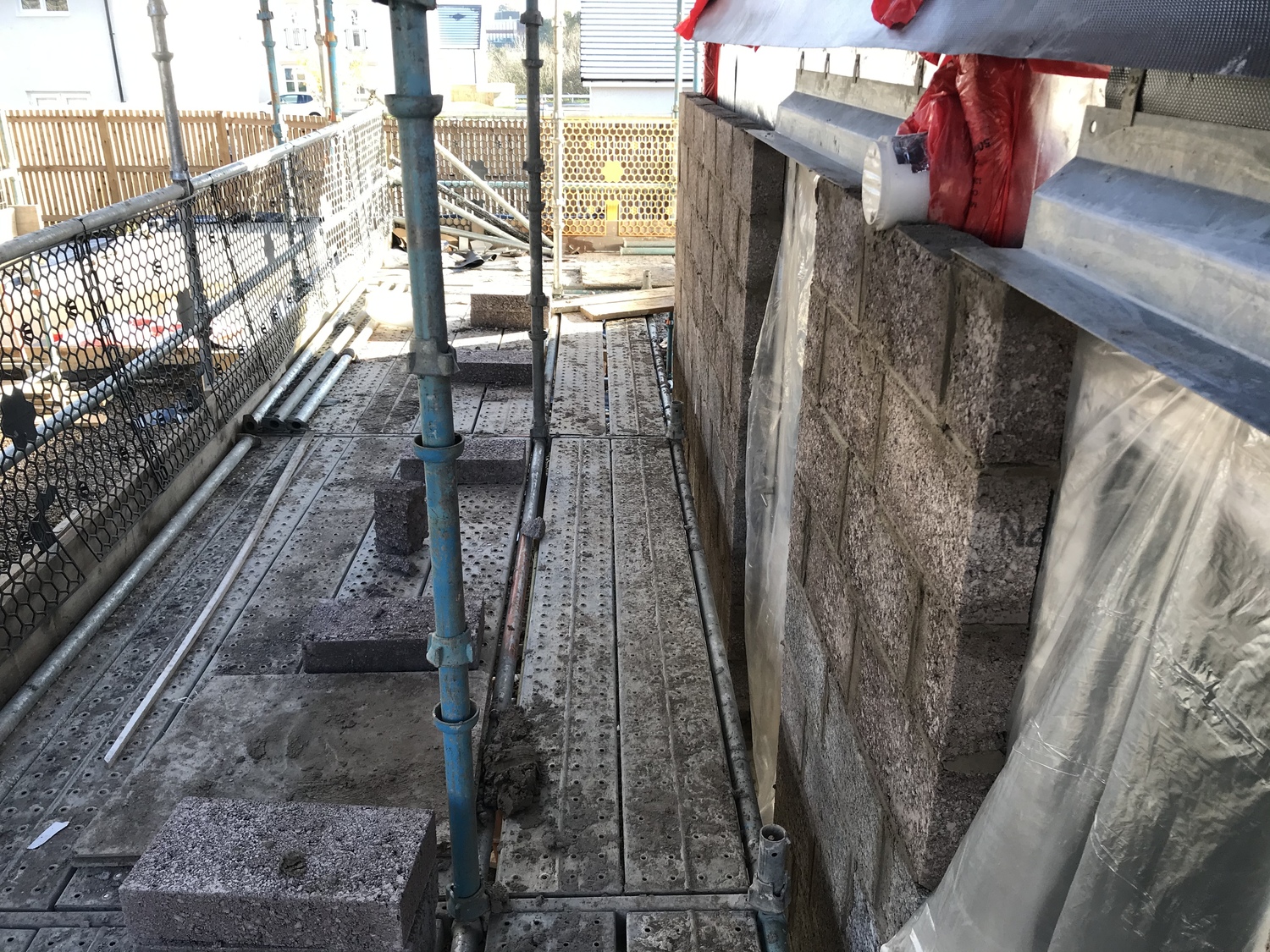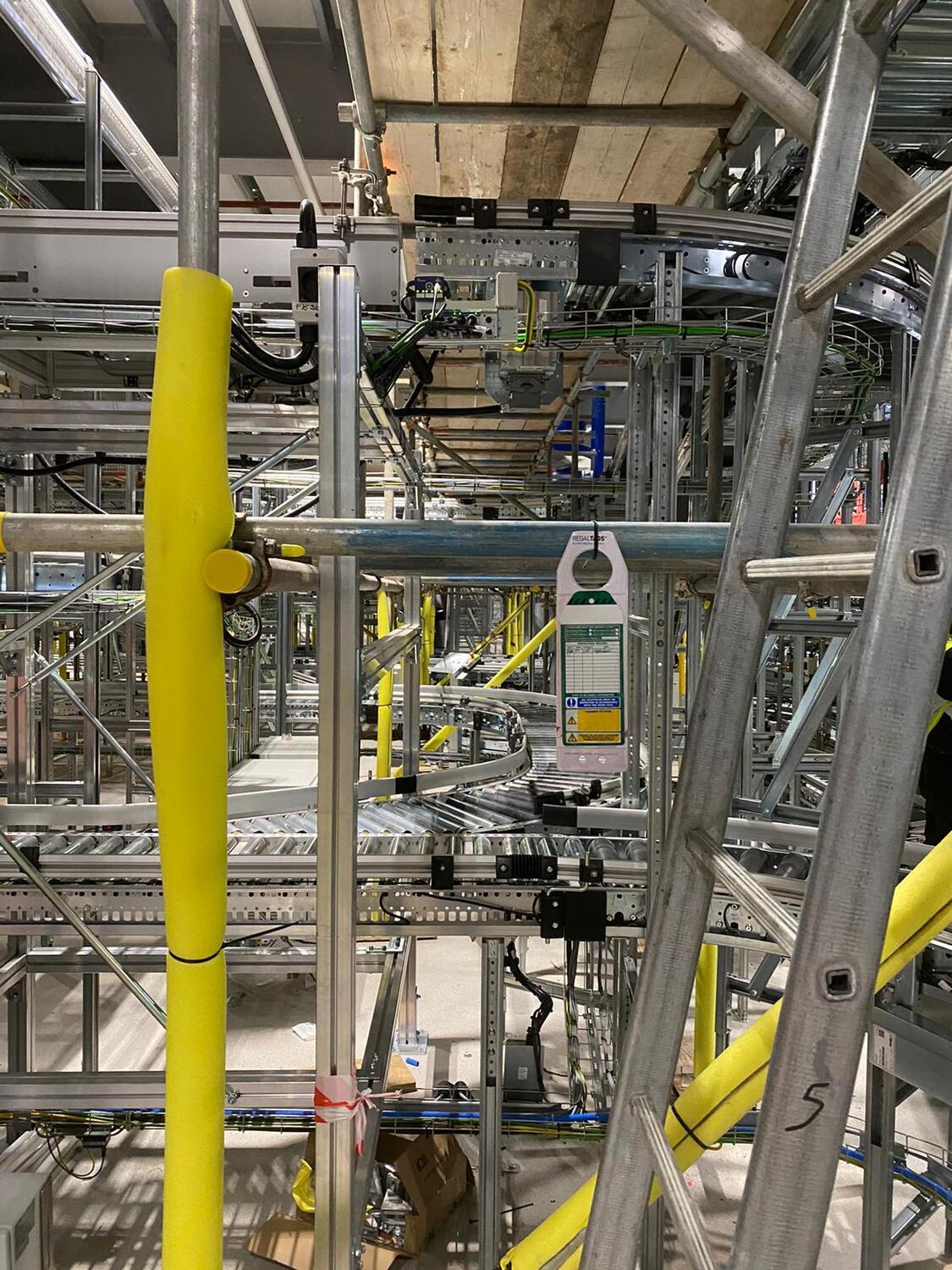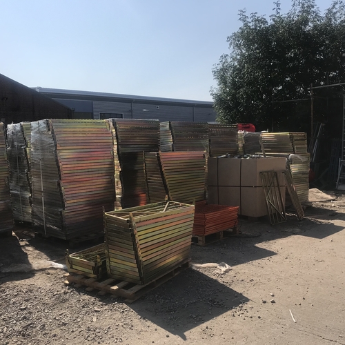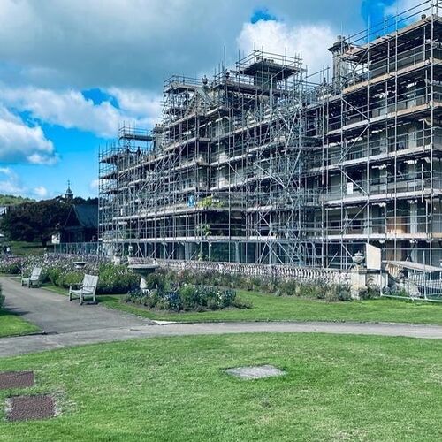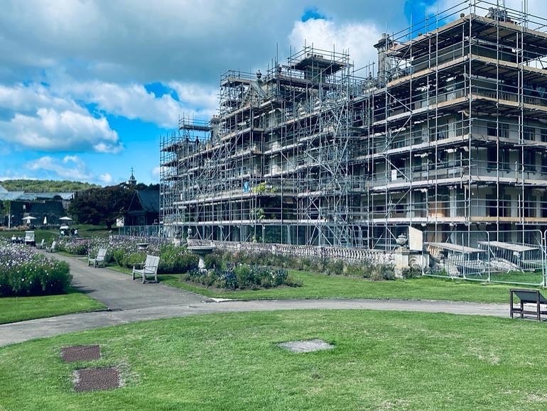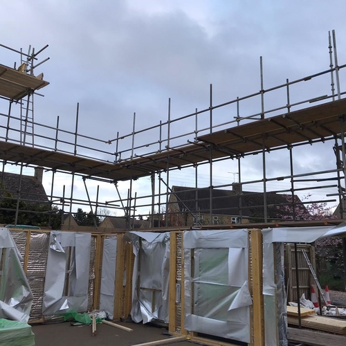 Portway Scaffolding has been tasked to provide a high level access platform to the underside of an atrium on a new prestigious head office building. The design is complicated due to the differing depths of ring beam steel, so in one area the 750mm beams are connected directly to the underside of the steel frame, in other area they are connected to scaffold tube, hung from the underside of the steel frame. The design has had to take into account the reduced capacity of the steel frame. Temporary access scaffold has been erected to the perimeter of the atrium one level below the roof with a 5 board wide cantilever, so that our scaffolders can walk the beams through and connect them to their final fixing point. Due to the reduced loadings of the ground slab, we are using a JLG x25 to act as