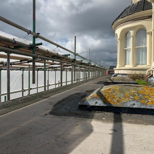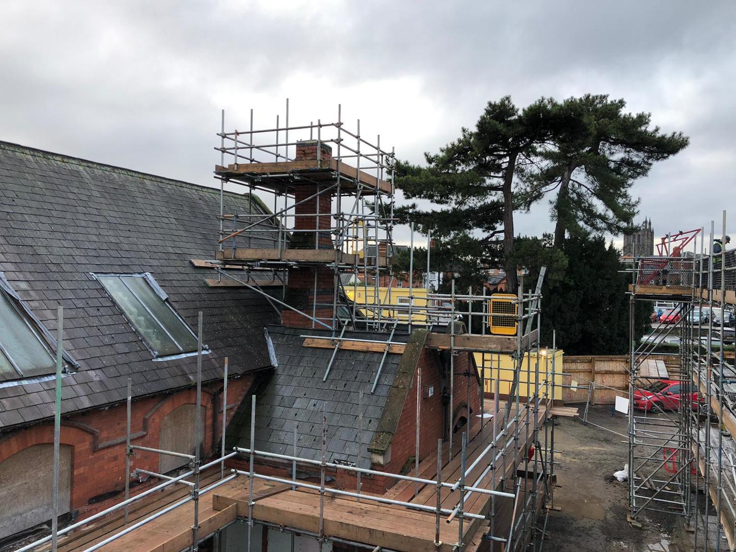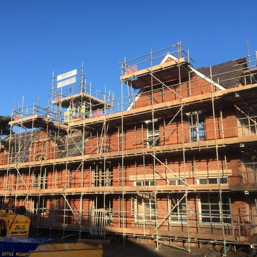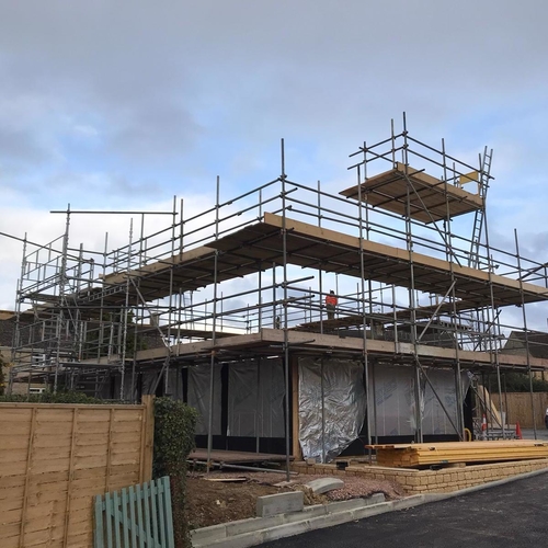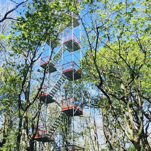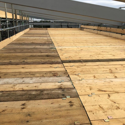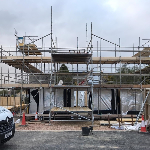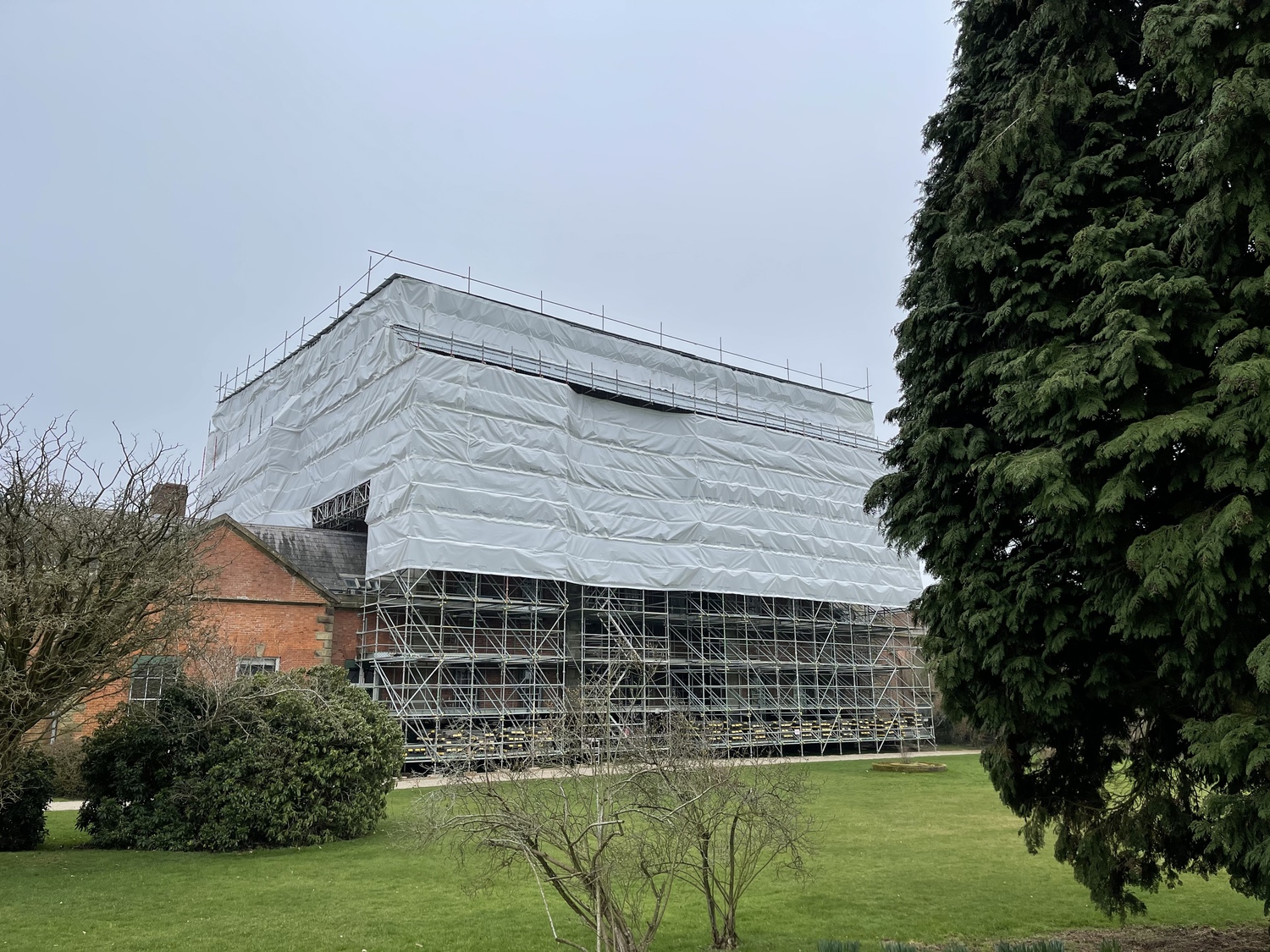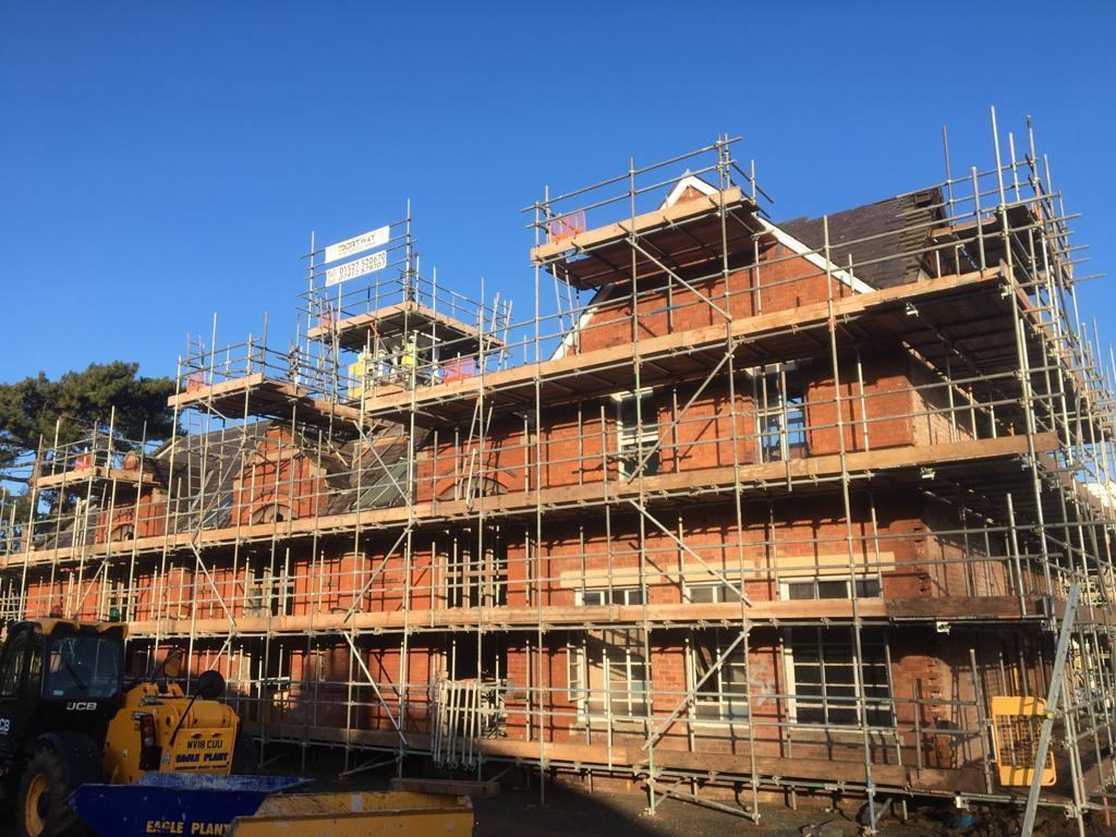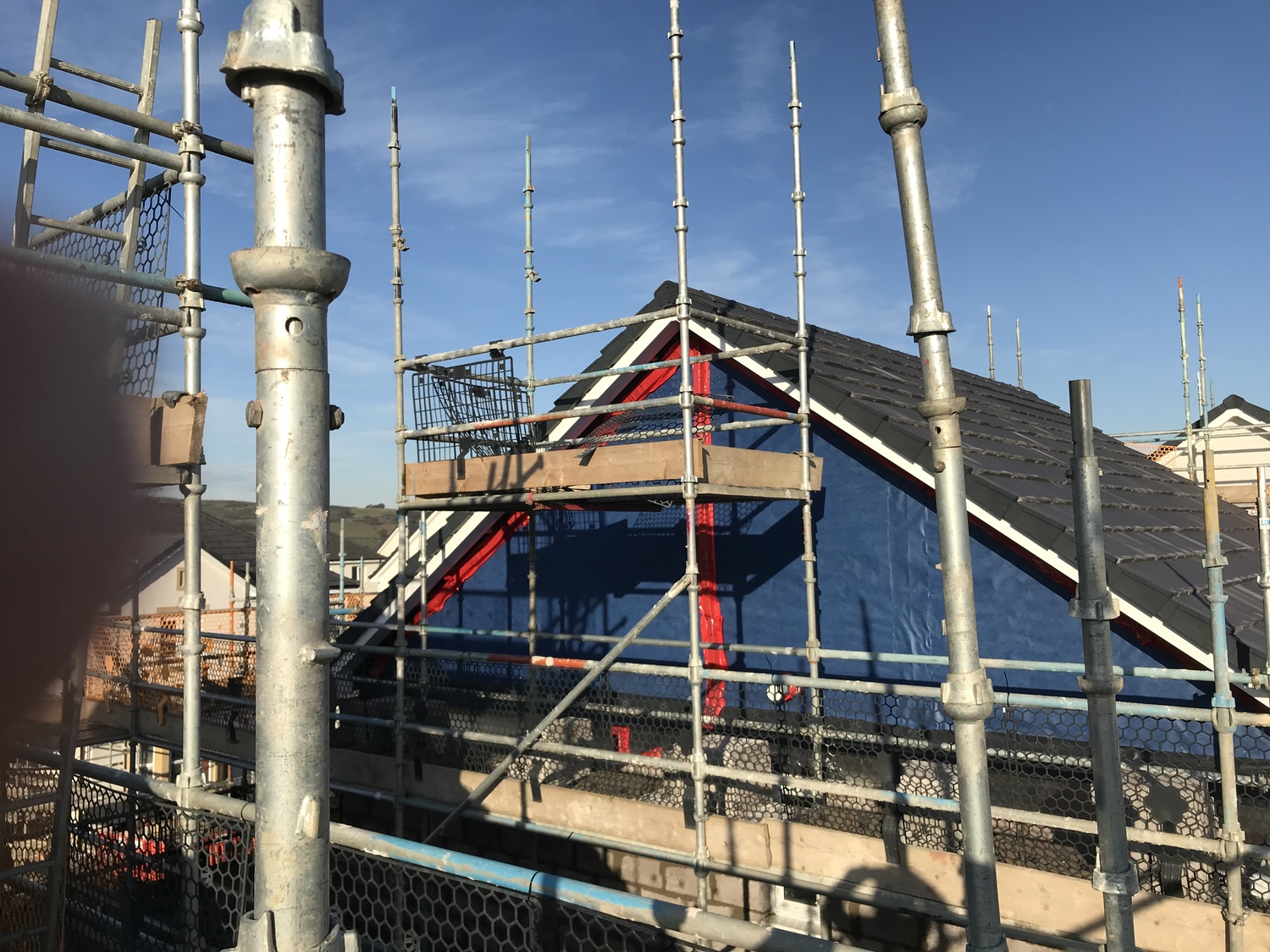 Portway Scaffolding has been tasked to provide a high level access platform to the underside of an atrium on a new prestigious head office building. The design is complicated due to the differing depths of ring beam steel, so in one area the 750mm beams are connected directly to the underside of the steel frame, in other area they are connected to scaffold tube, hung from the underside of the steel frame. The design has had to take into account the reduced capacity of the steel frame. Temporary access scaffold has been erected to the perimeter of the atrium one level below the roof with a 5 board wide cantilever, so that our scaffolders can walk the beams through and connect them to their final fixing point. Due to the reduced loadings of the ground slab, we are using a JLG x25 to act as