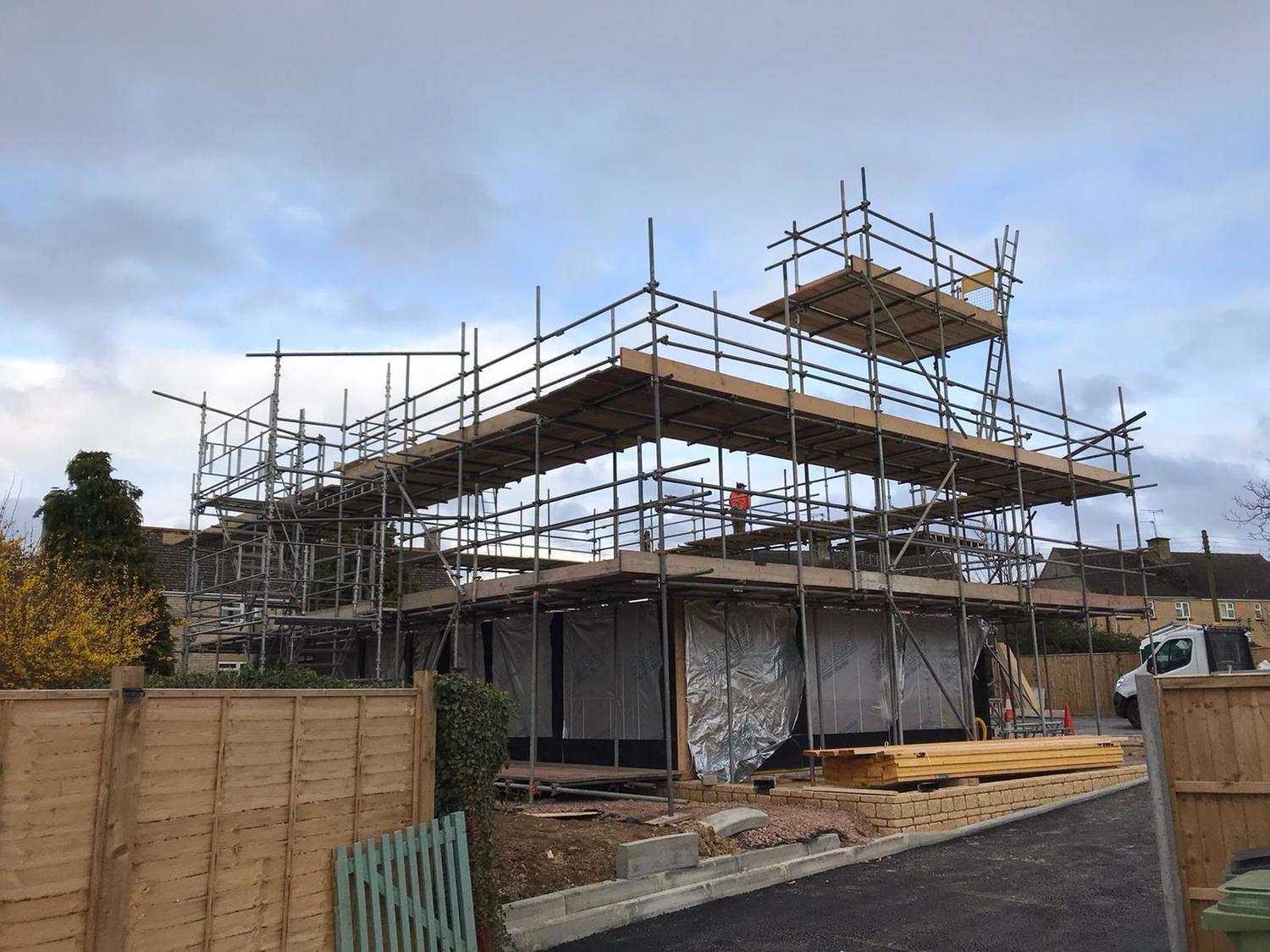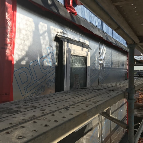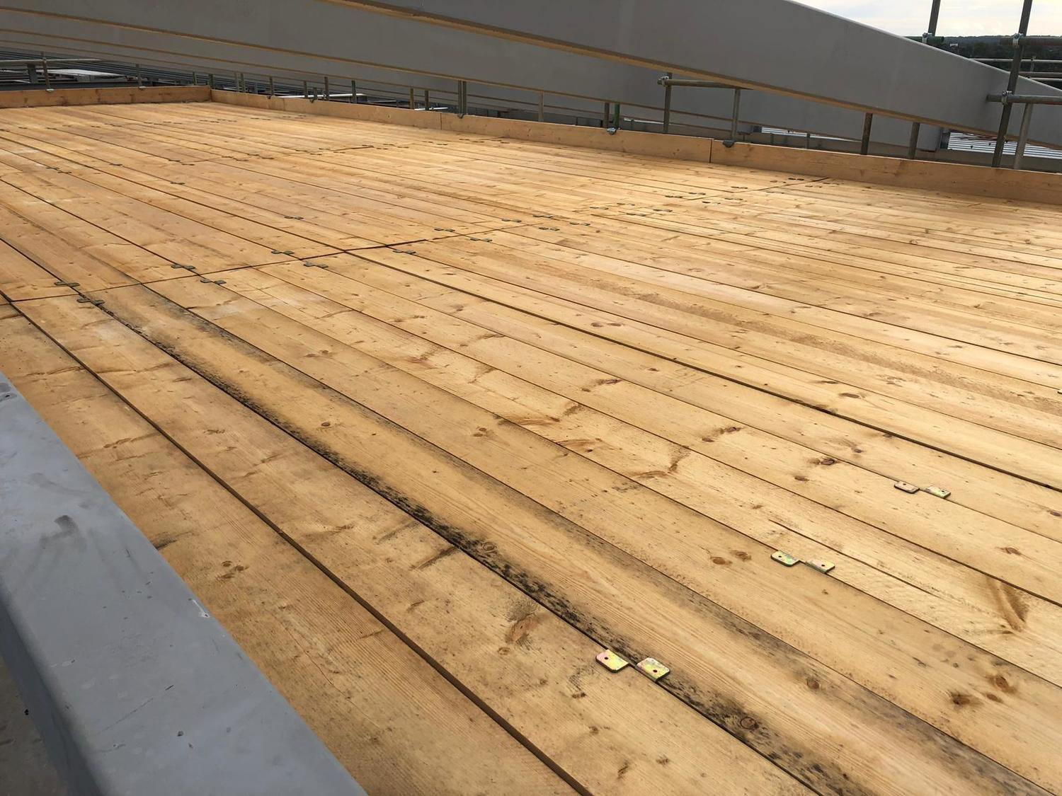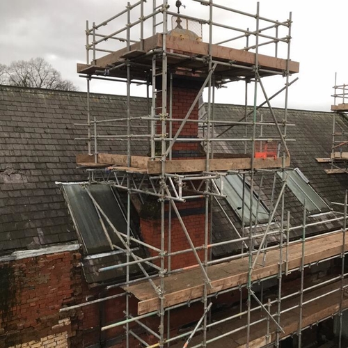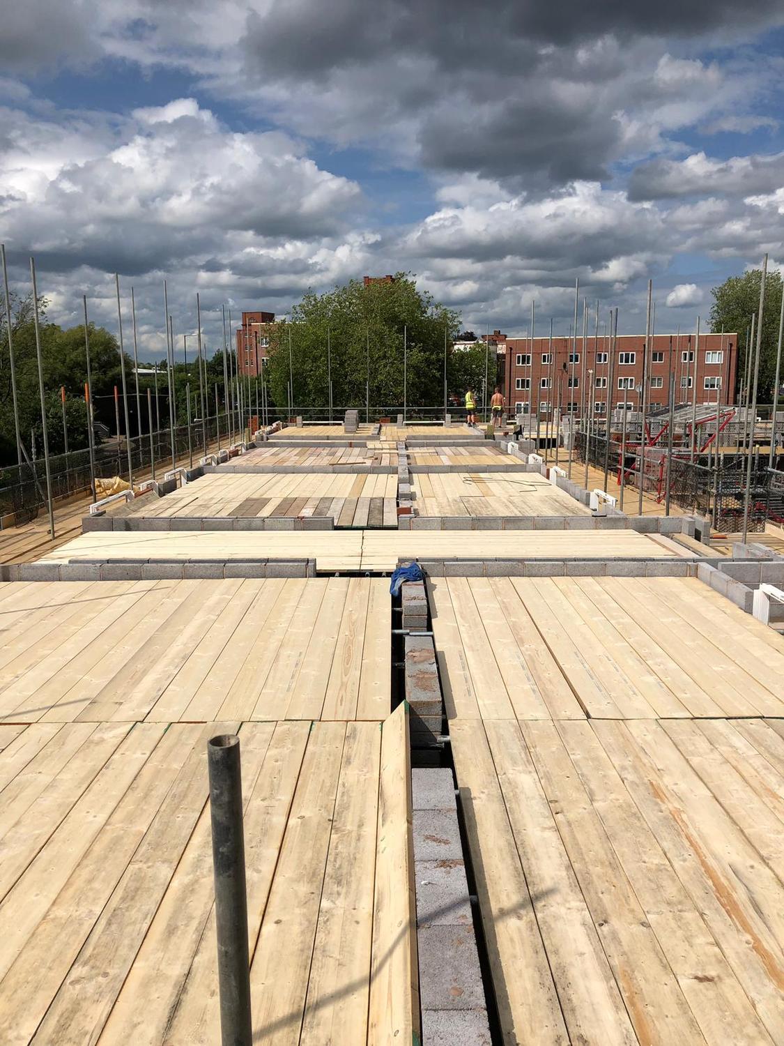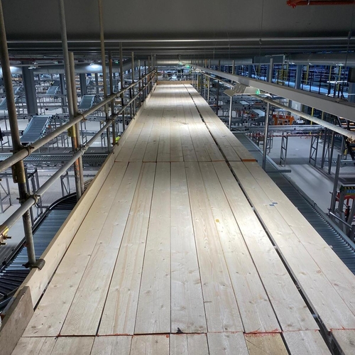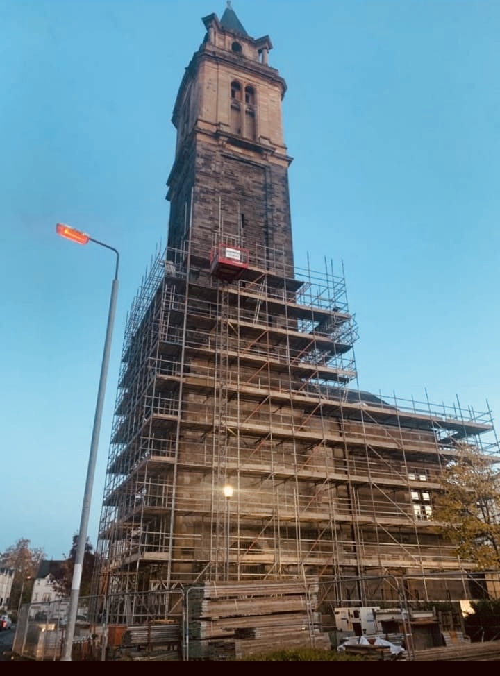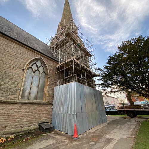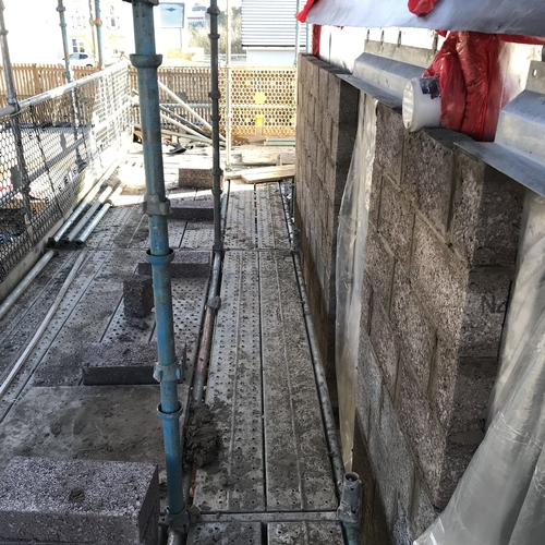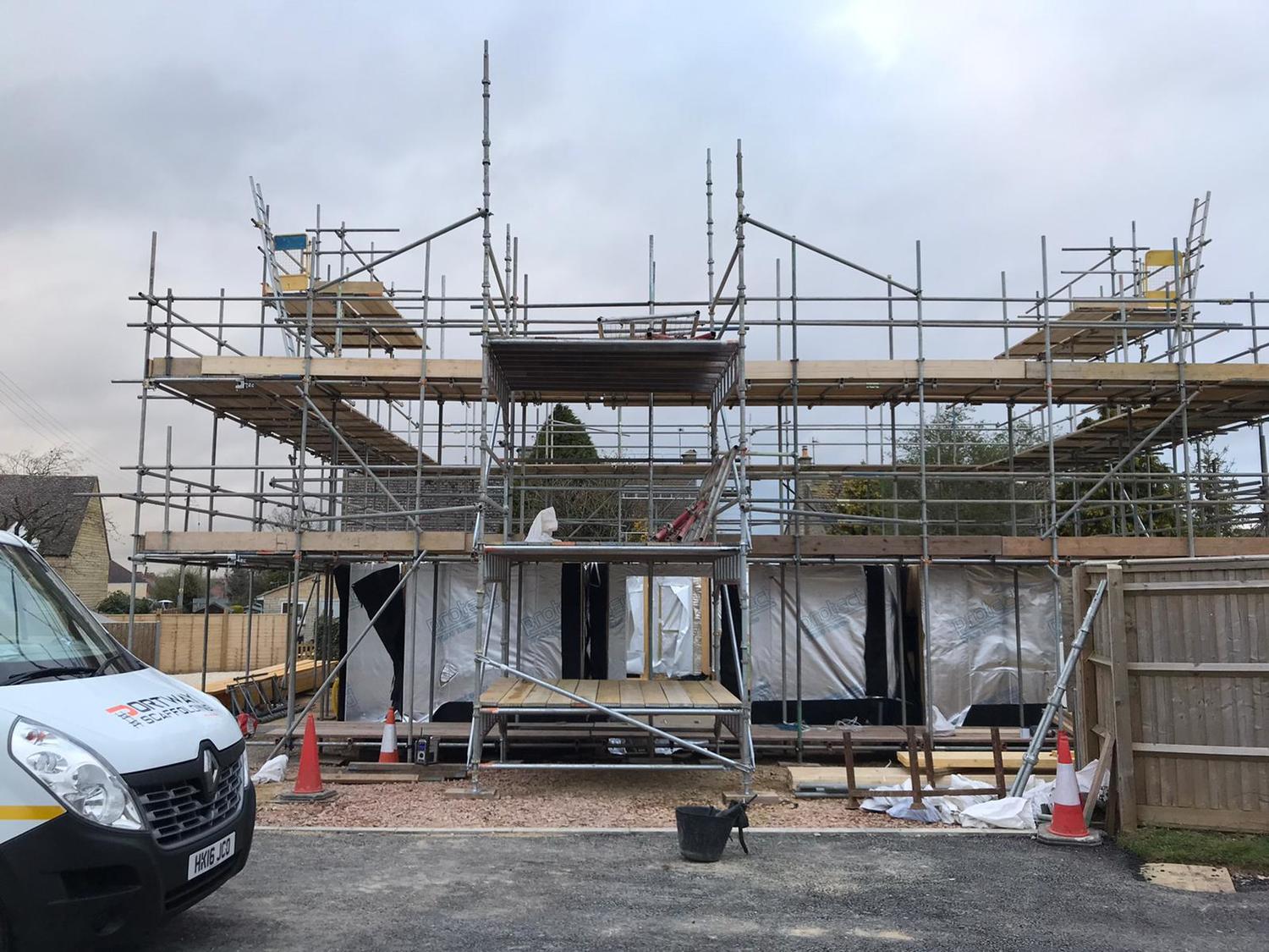 Portway Scaffolding has been tasked to provide a high level access platform to the underside of an atrium on a new prestigious head office building. The design is complicated due to the differing depths of ring beam steel, so in one area the 750mm beams are connected directly to the underside of the steel frame, in other area they are connected to scaffold tube, hung from the underside of the steel frame. The design has had to take into account the reduced capacity of the steel frame. Temporary access scaffold has been erected to the perimeter of the atrium one level below the roof with a 5 board wide cantilever, so that our scaffolders can walk the beams through and connect them to their final fixing point. Due to the reduced loadings of the ground slab, we are using a JLG x25 to act as