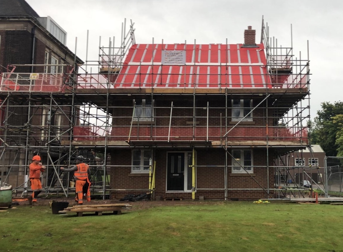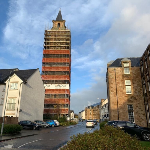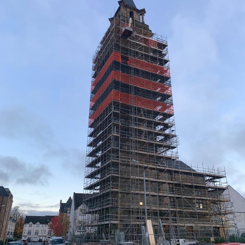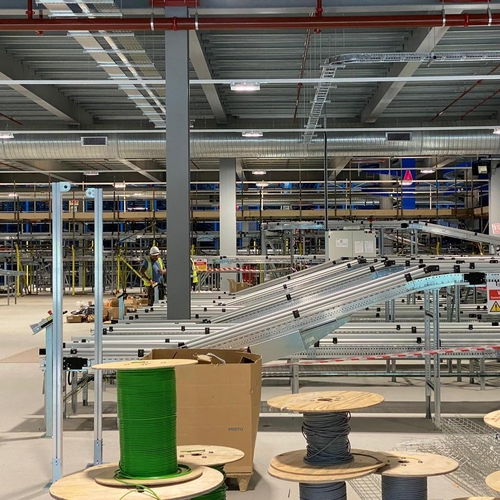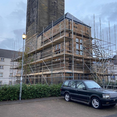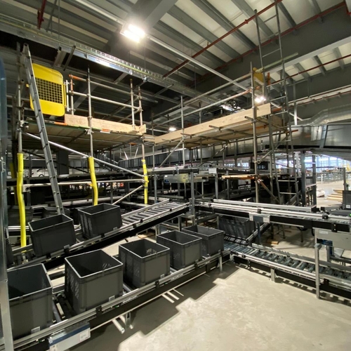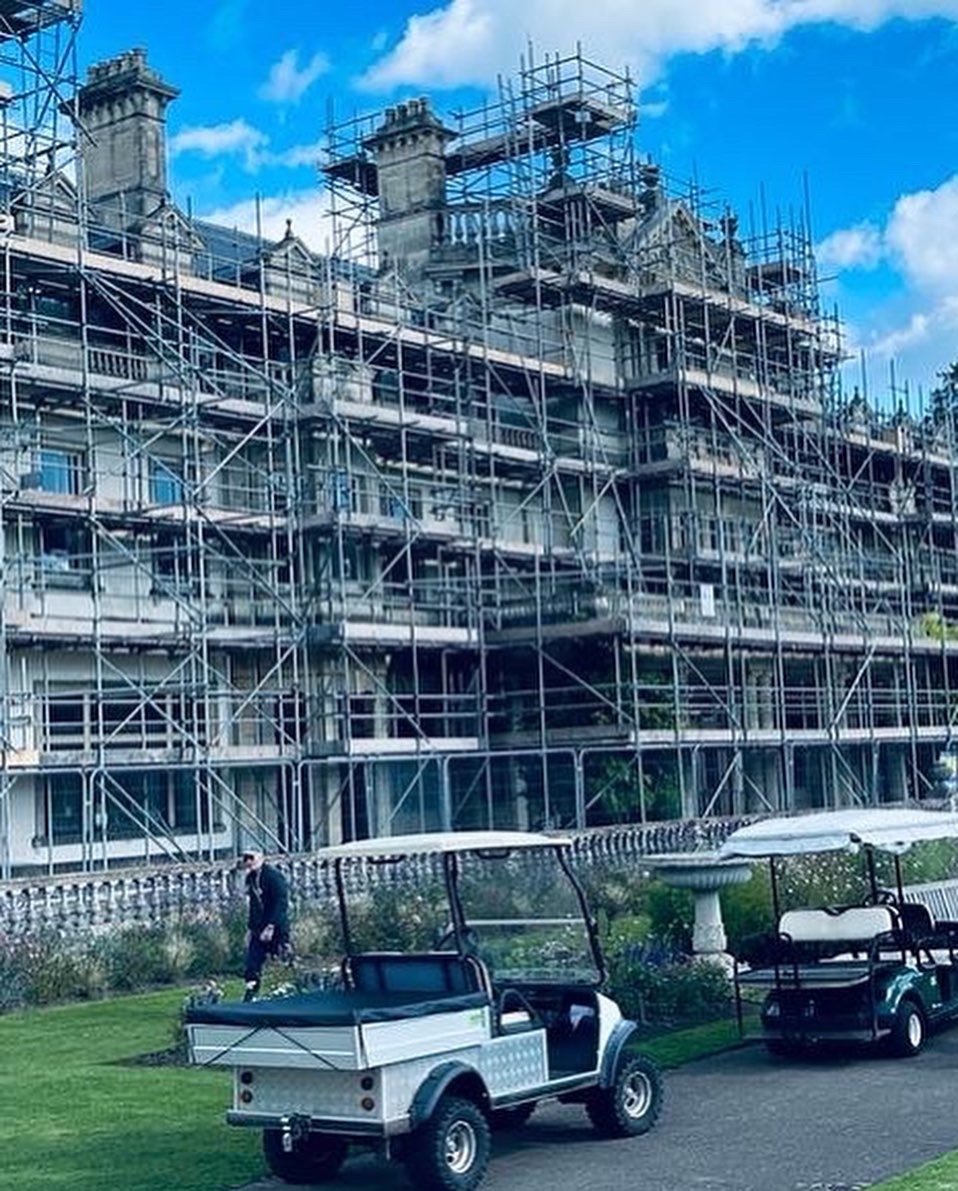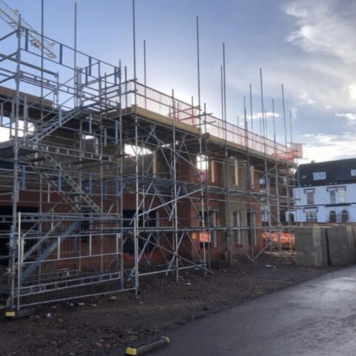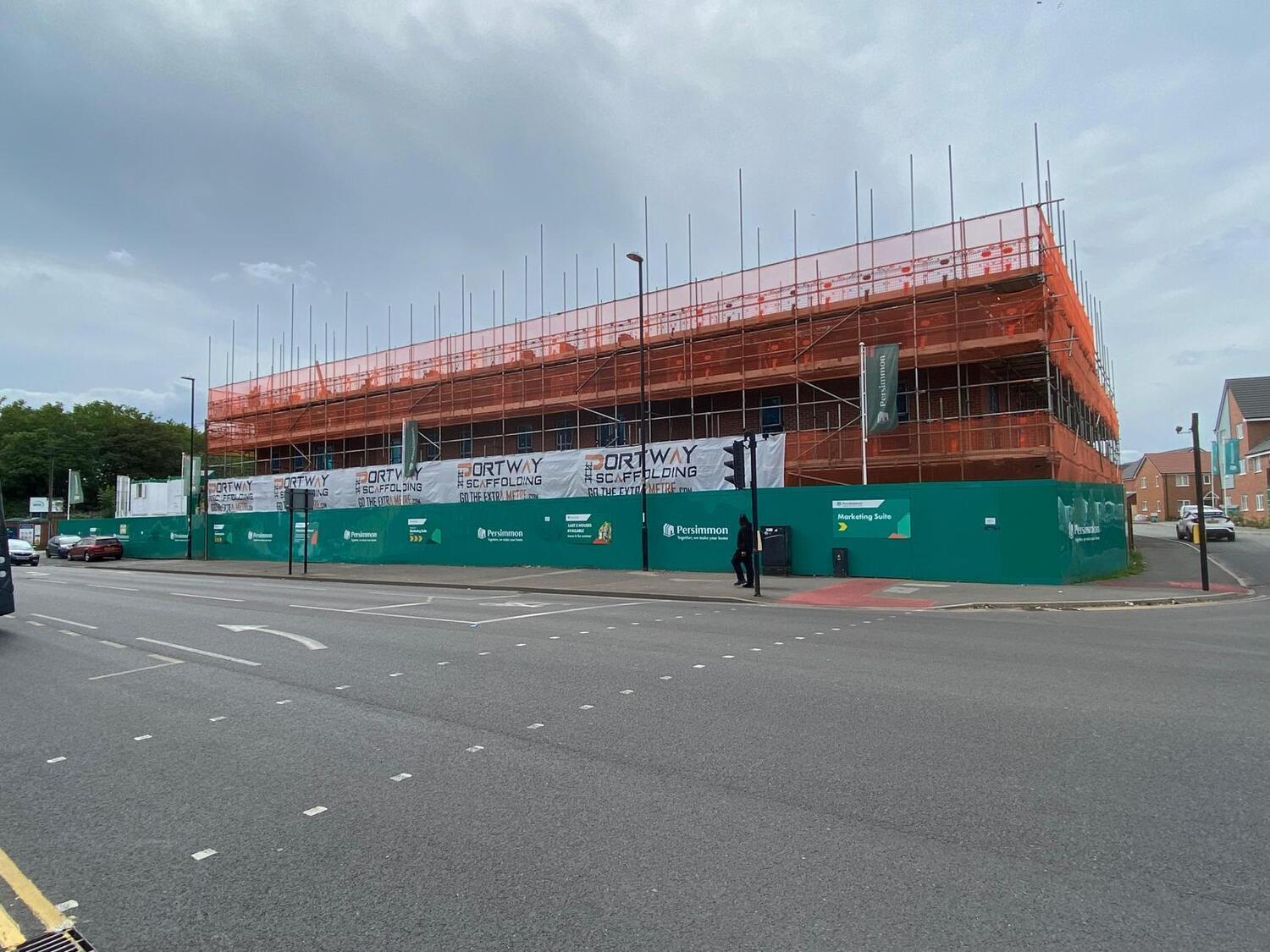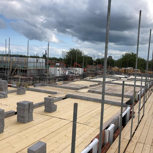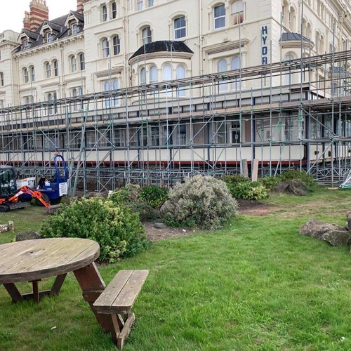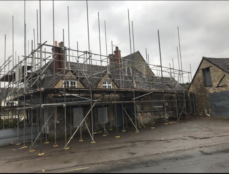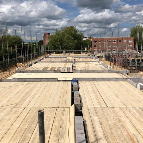 Portway Scaffolding has been tasked to provide a high level access platform to the underside of an atrium on a new prestigious head office building. The design is complicated due to the differing depths of ring beam steel, so in one area the 750mm beams are connected directly to the underside of the steel frame, in other area they are connected to scaffold tube, hung from the underside of the steel frame. The design has had to take into account the reduced capacity of the steel frame. Temporary access scaffold has been erected to the perimeter of the atrium one level below the roof with a 5 board wide cantilever, so that our scaffolders can walk the beams through and connect them to their final fixing point. Due to the reduced loadings of the ground slab, we are using a JLG x25 to act as