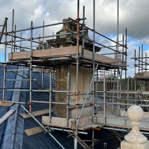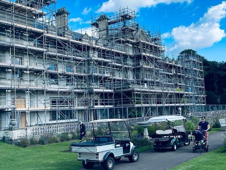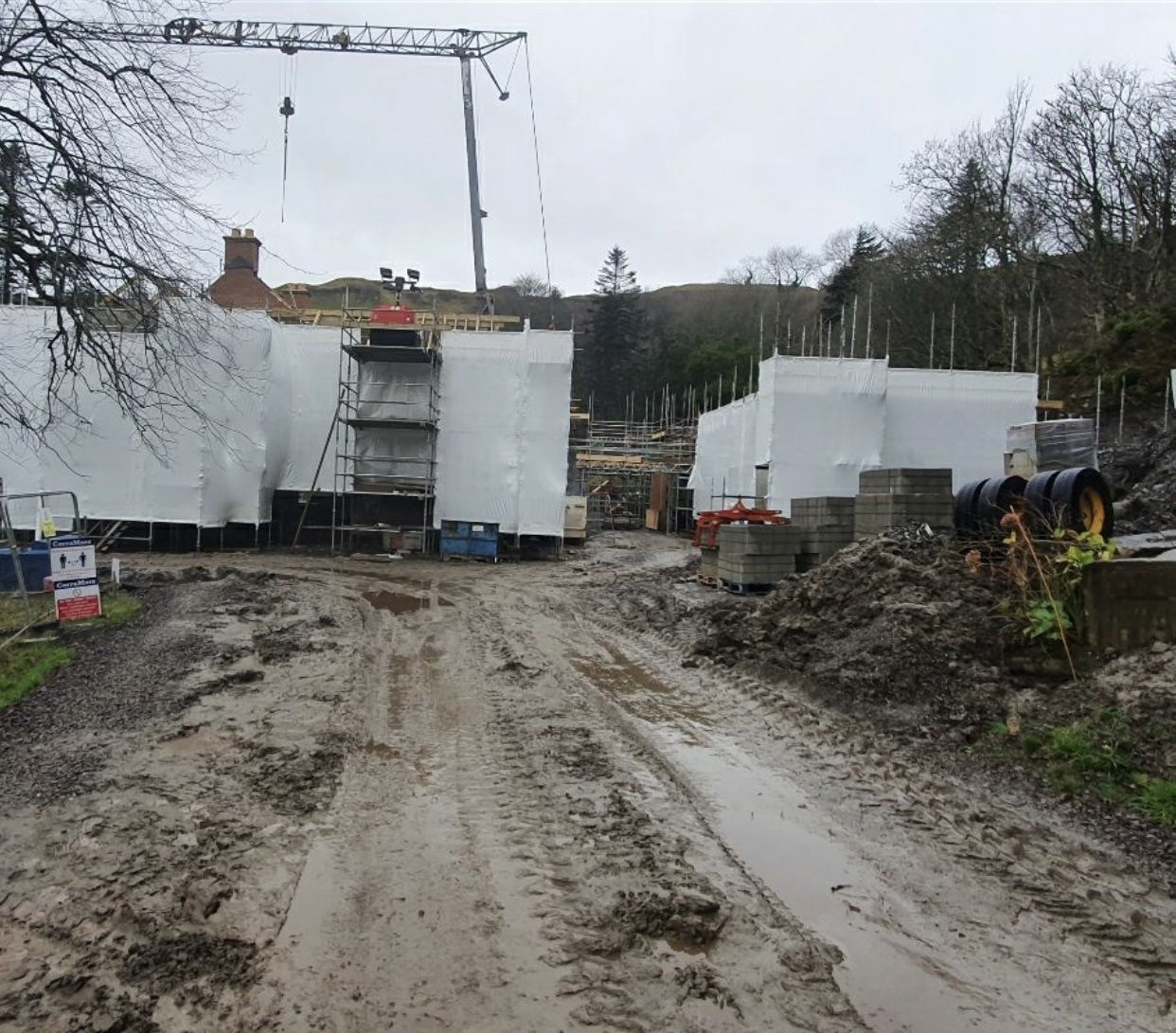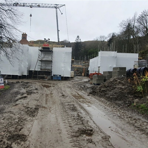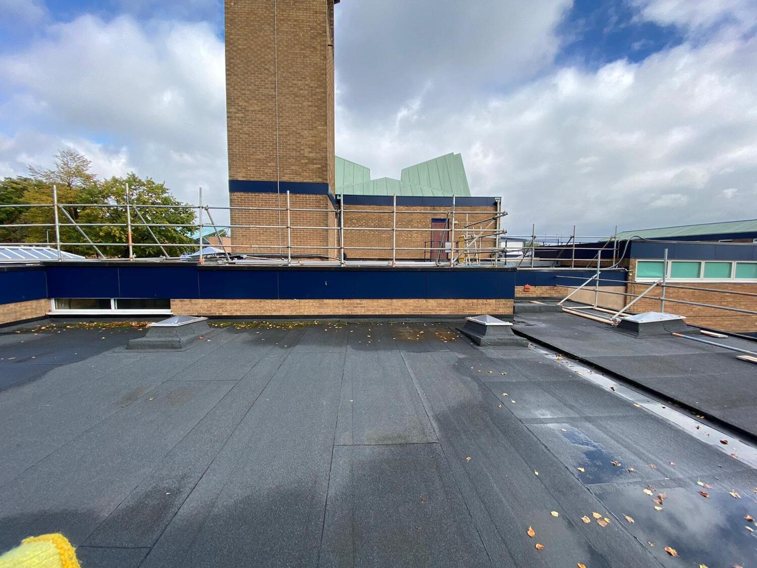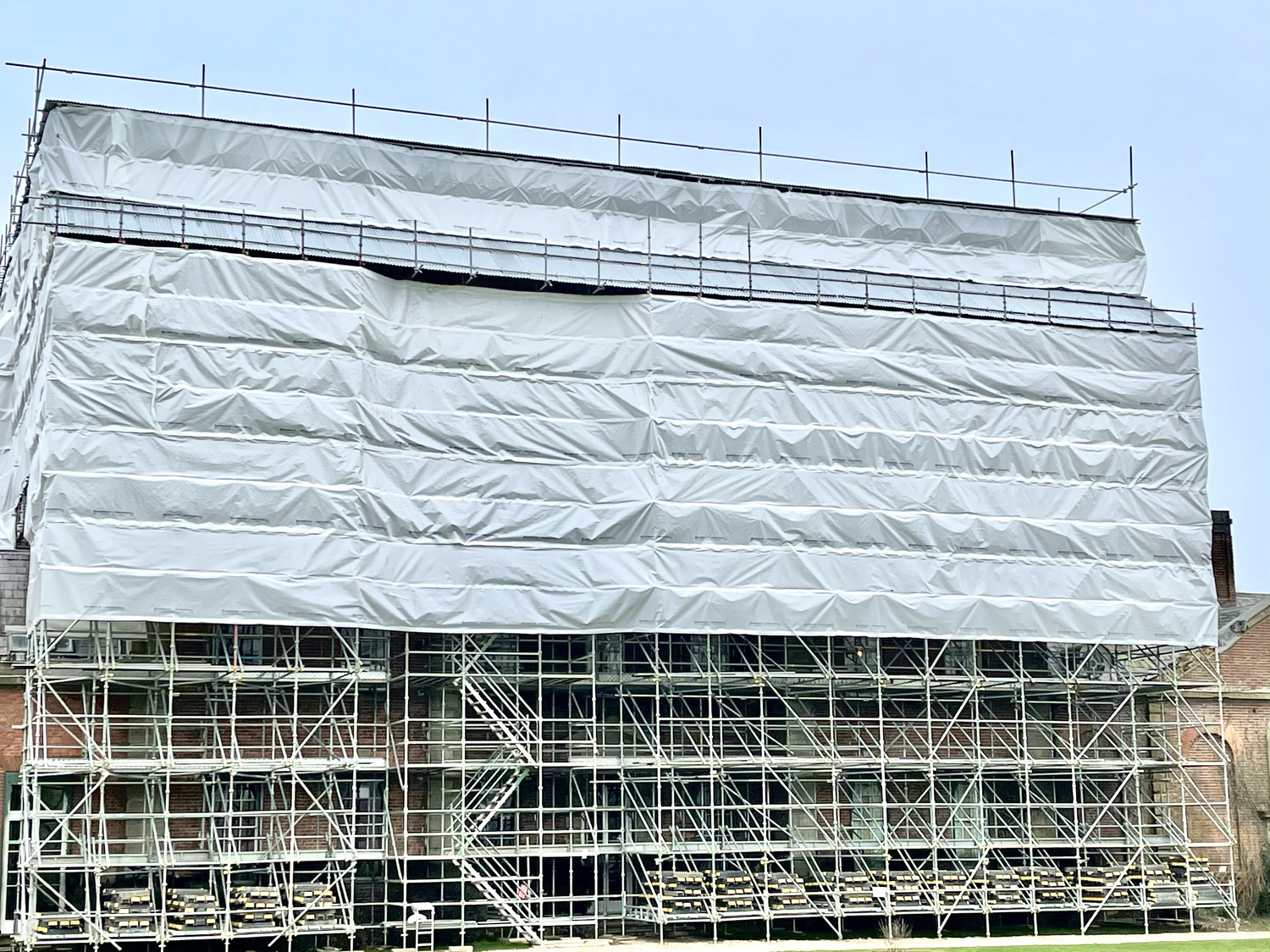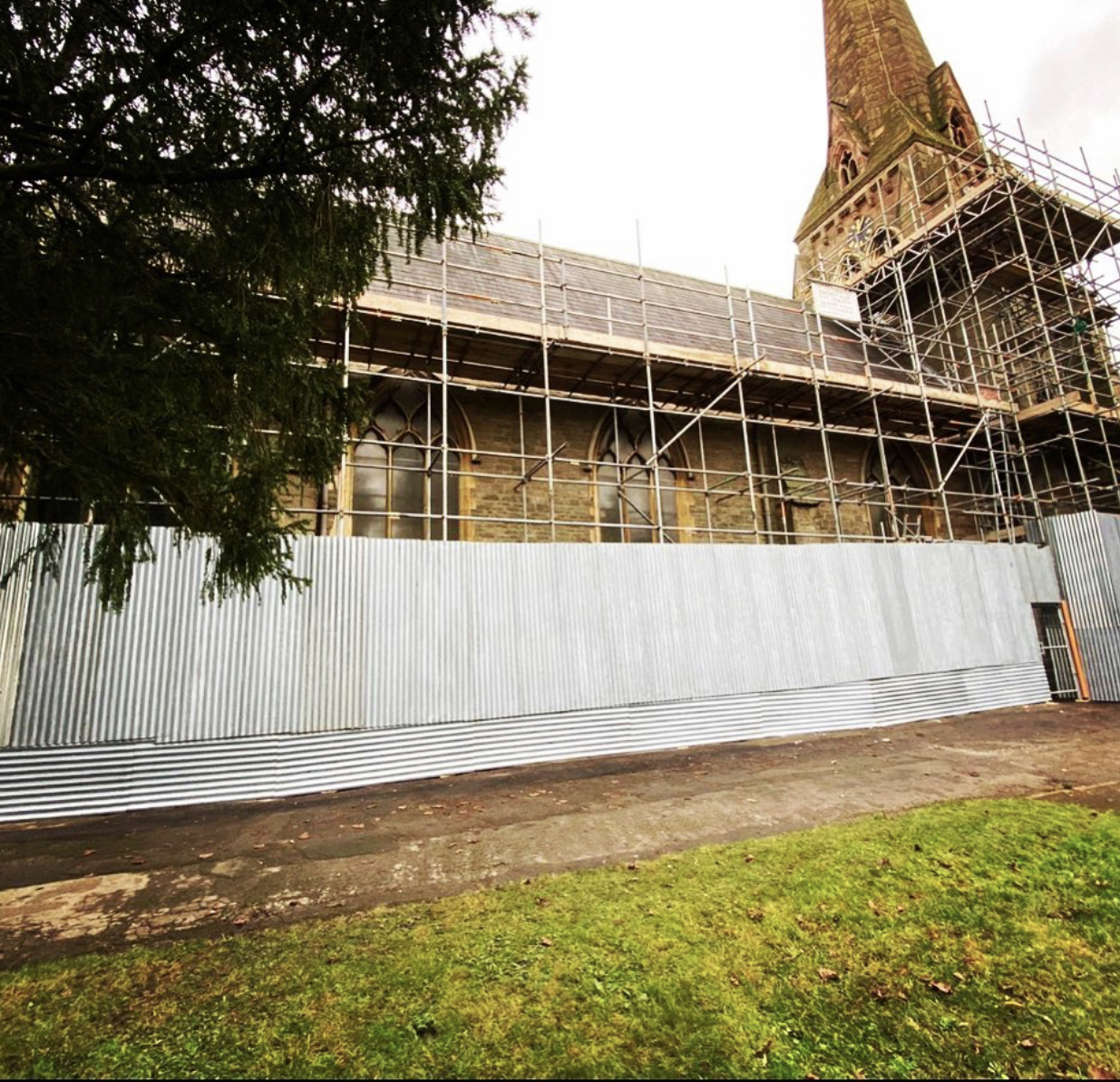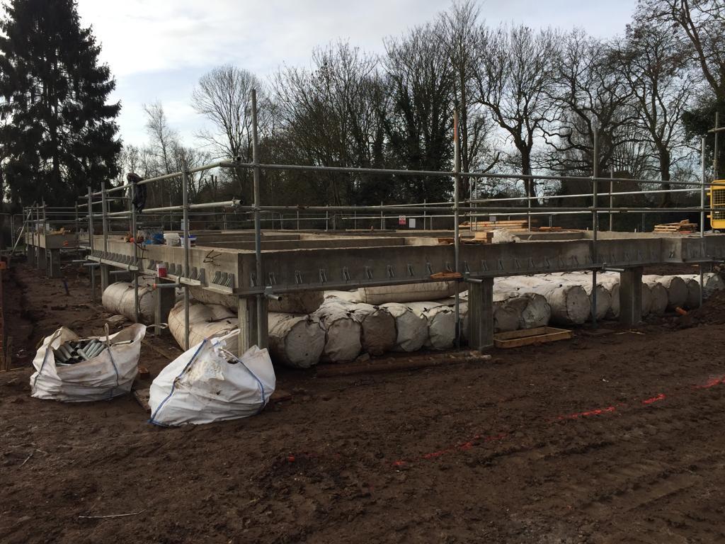 Portway Scaffolding has been tasked to provide a high level access platform to the underside of an atrium on a new prestigious head office building. The design is complicated due to the differing depths of ring beam steel, so in one area the 750mm beams are connected directly to the underside of the steel frame, in other area they are connected to scaffold tube, hung from the underside of the steel frame. The design has had to take into account the reduced capacity of the steel frame. Temporary access scaffold has been erected to the perimeter of the atrium one level below the roof with a 5 board wide cantilever, so that our scaffolders can walk the beams through and connect them to their final fixing point. Due to the reduced loadings of the ground slab, we are using a JLG x25 to act as