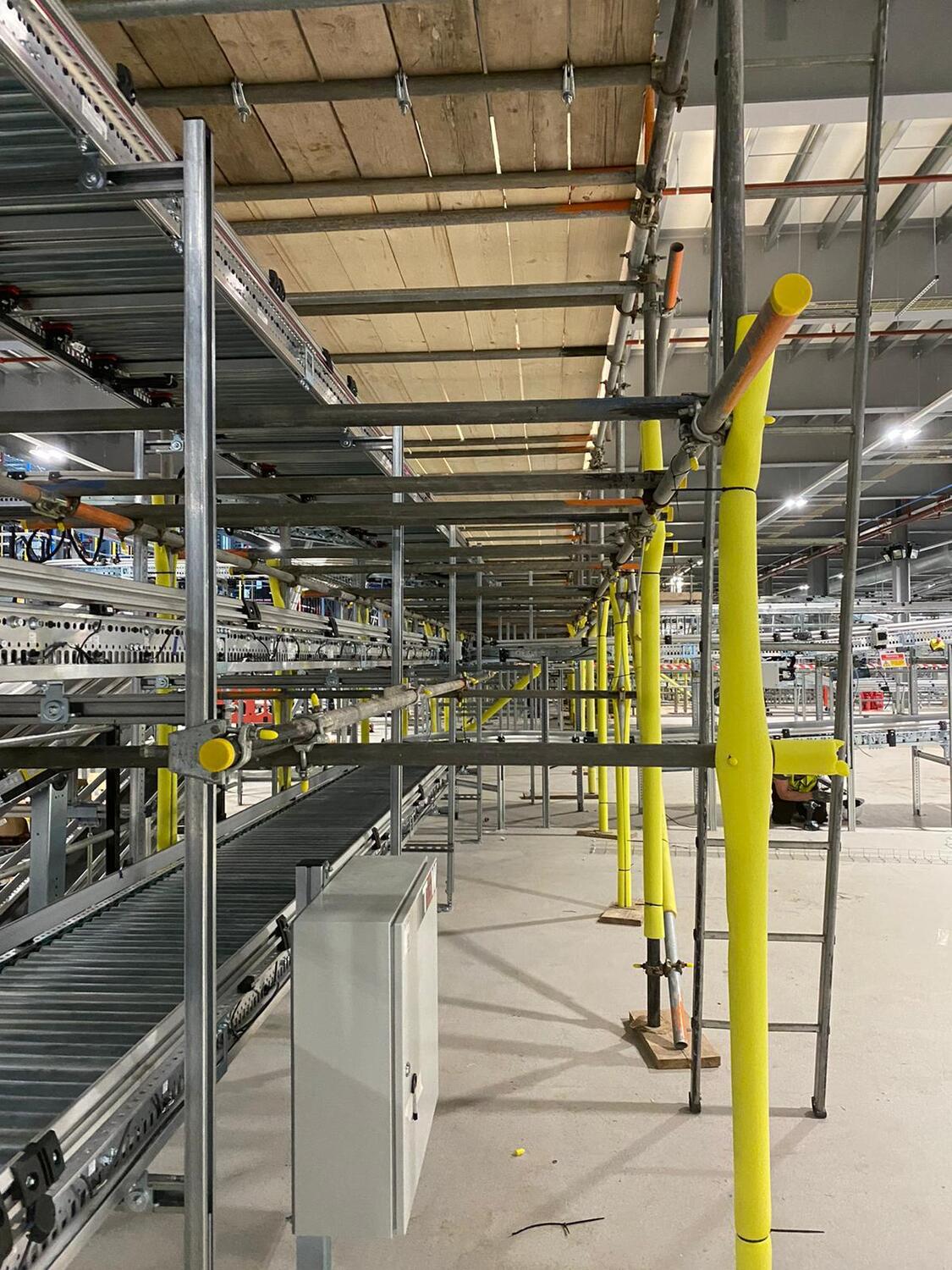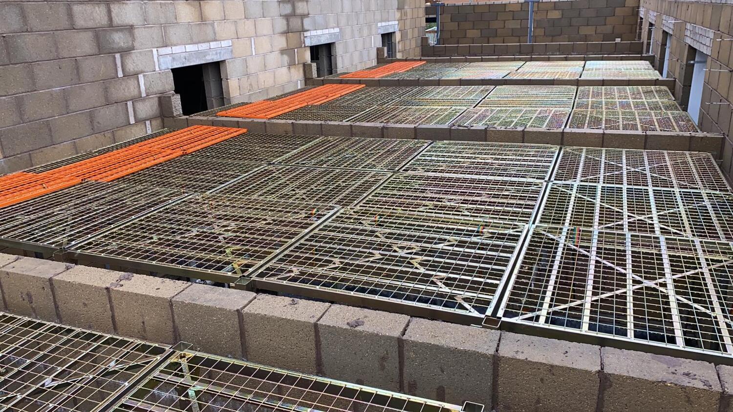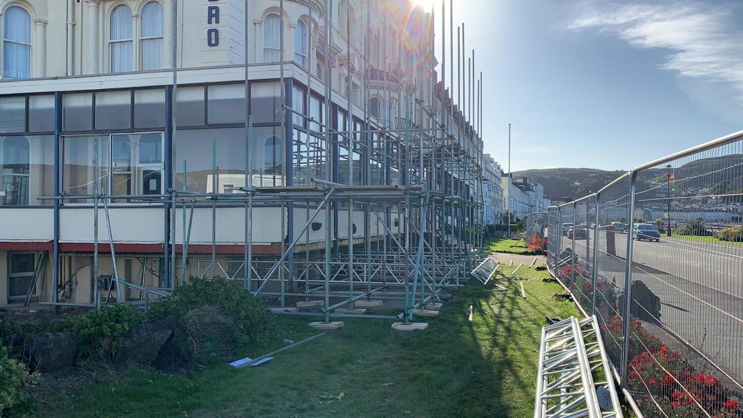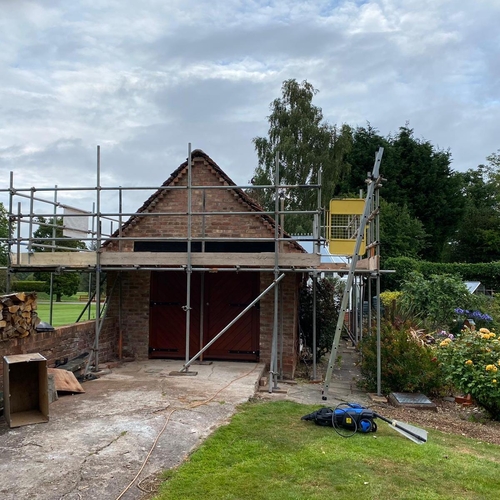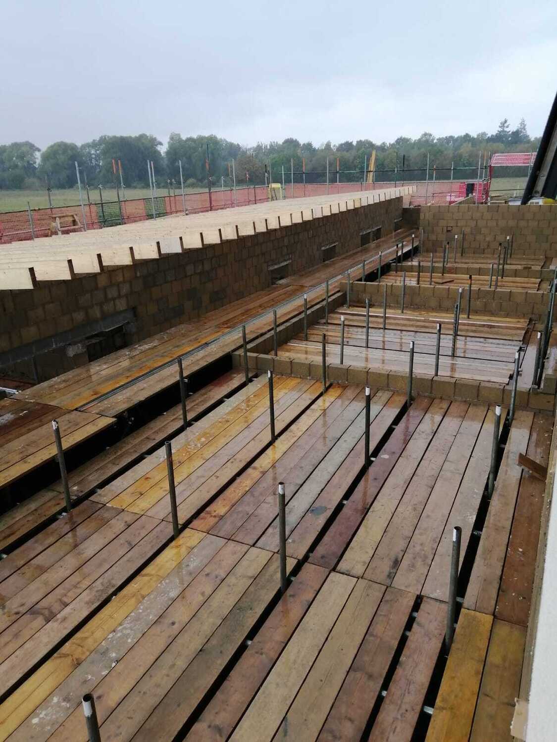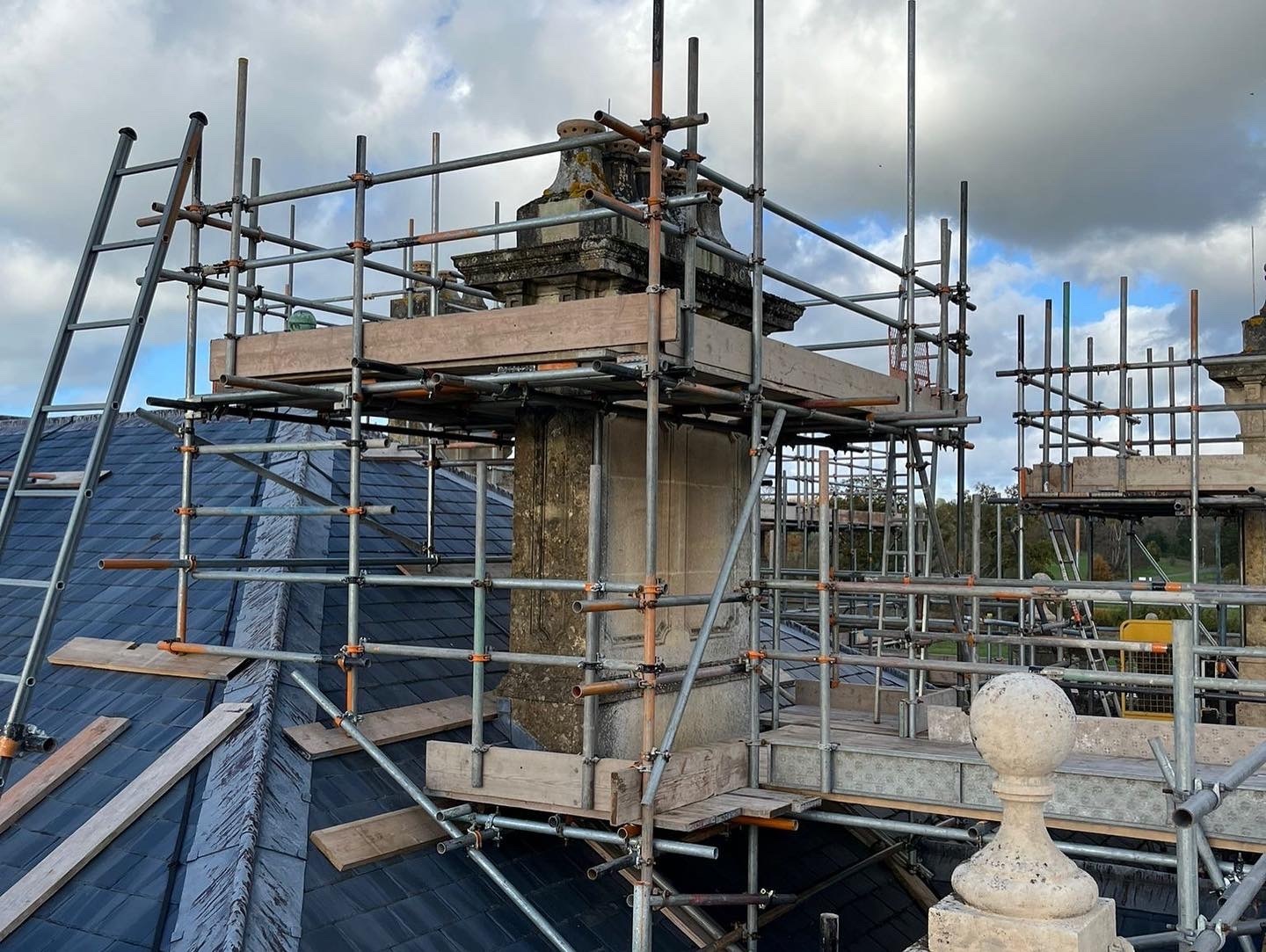 Portway Scaffolding has been tasked to provide a high level access platform to the underside of an atrium on a new prestigious head office building. The design is complicated due to the differing depths of ring beam steel, so in one area the 750mm beams are connected directly to the underside of the steel frame, in other area they are connected to scaffold tube, hung from the underside of the steel frame. The design has had to take into account the reduced capacity of the steel frame. Temporary access scaffold has been erected to the perimeter of the atrium one level below the roof with a 5 board wide cantilever, so that our scaffolders can walk the beams through and connect them to their final fixing point. Due to the reduced loadings of the ground slab, we are using a JLG x25 to act as