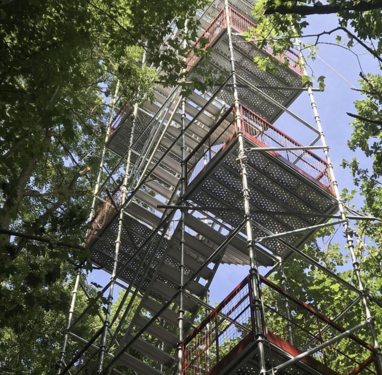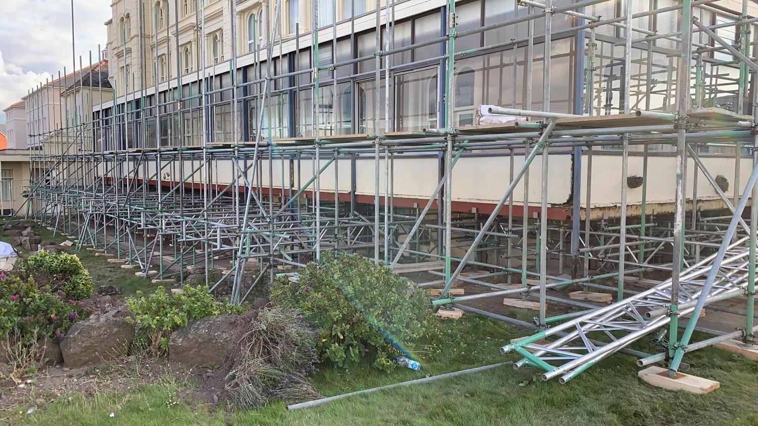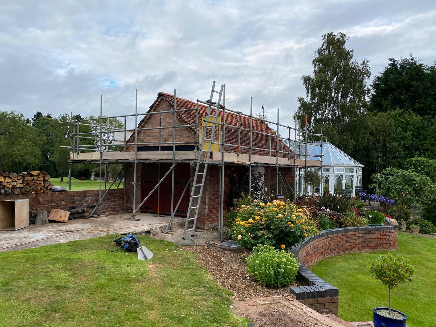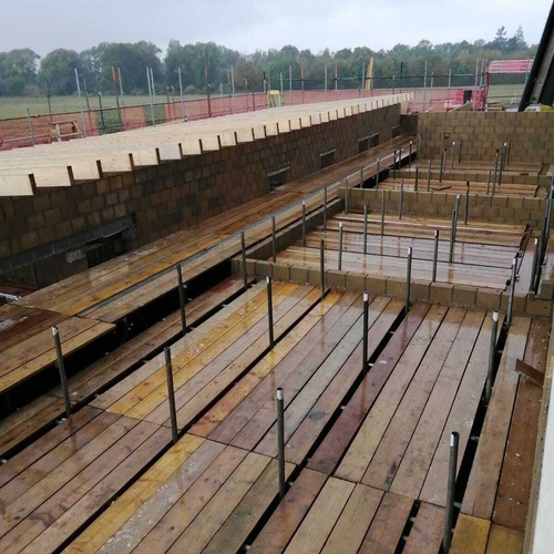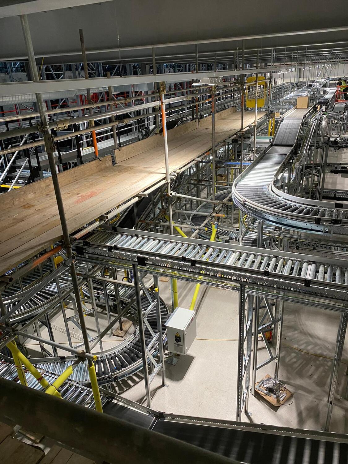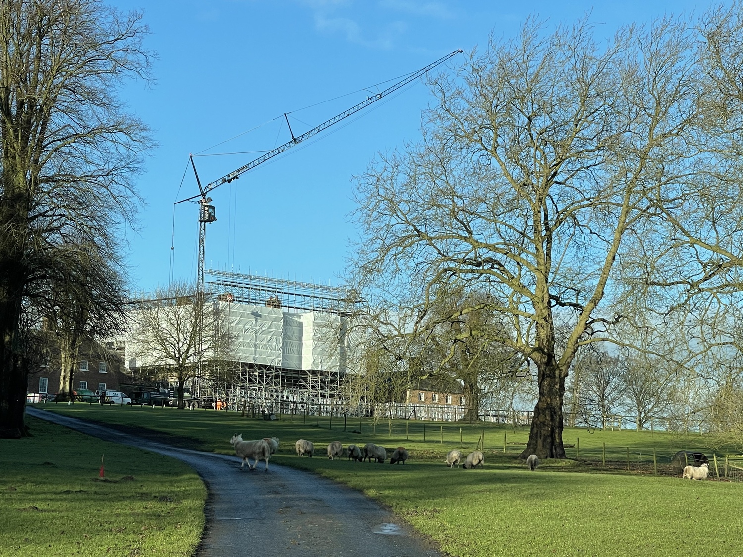 Portway Scaffolding has been tasked to provide a high level access platform to the underside of an atrium on a new prestigious head office building. The design is complicated due to the differing depths of ring beam steel, so in one area the 750mm beams are connected directly to the underside of the steel frame, in other area they are connected to scaffold tube, hung from the underside of the steel frame. The design has had to take into account the reduced capacity of the steel frame. Temporary access scaffold has been erected to the perimeter of the atrium one level below the roof with a 5 board wide cantilever, so that our scaffolders can walk the beams through and connect them to their final fixing point. Due to the reduced loadings of the ground slab, we are using a JLG x25 to act as